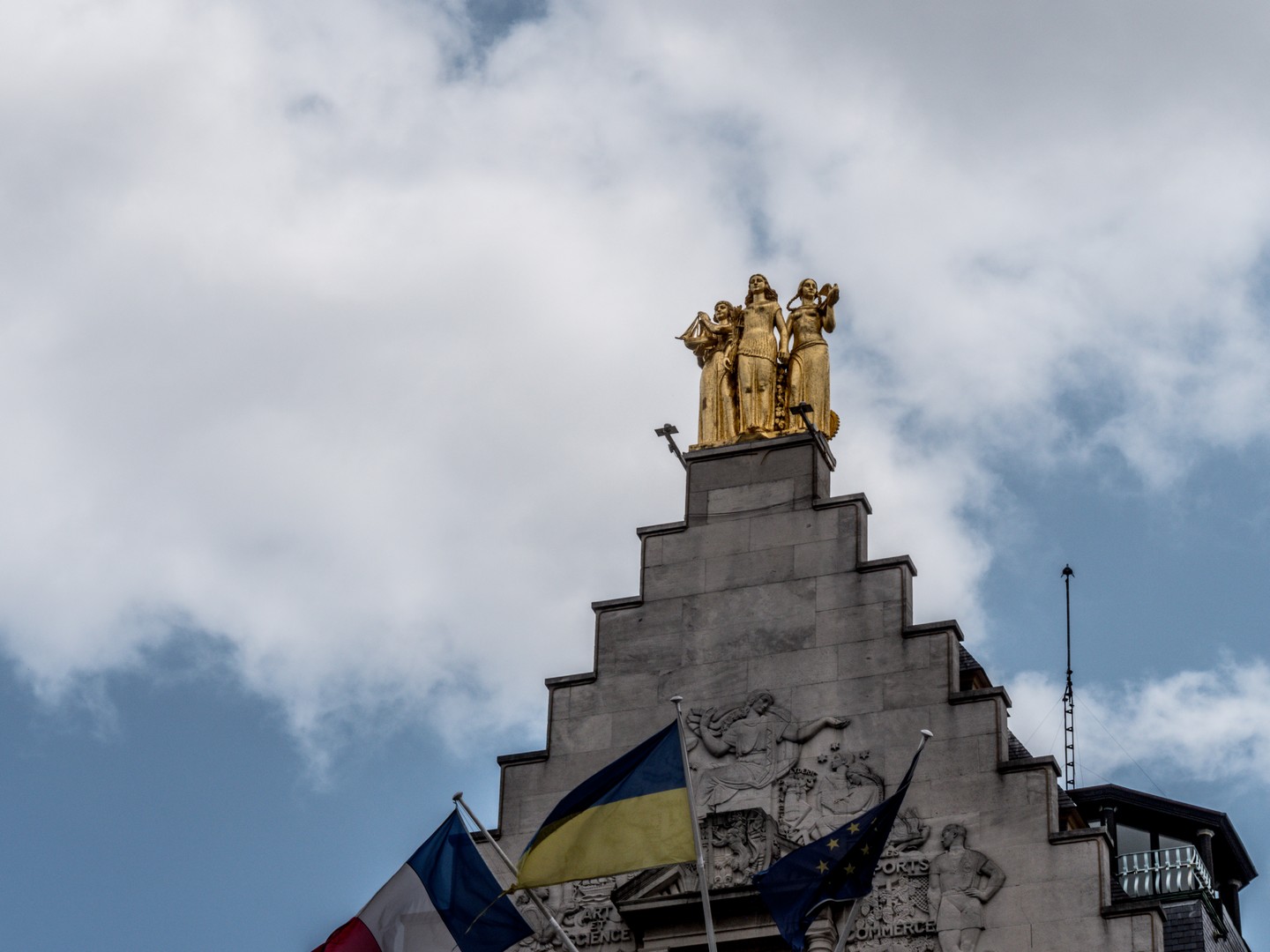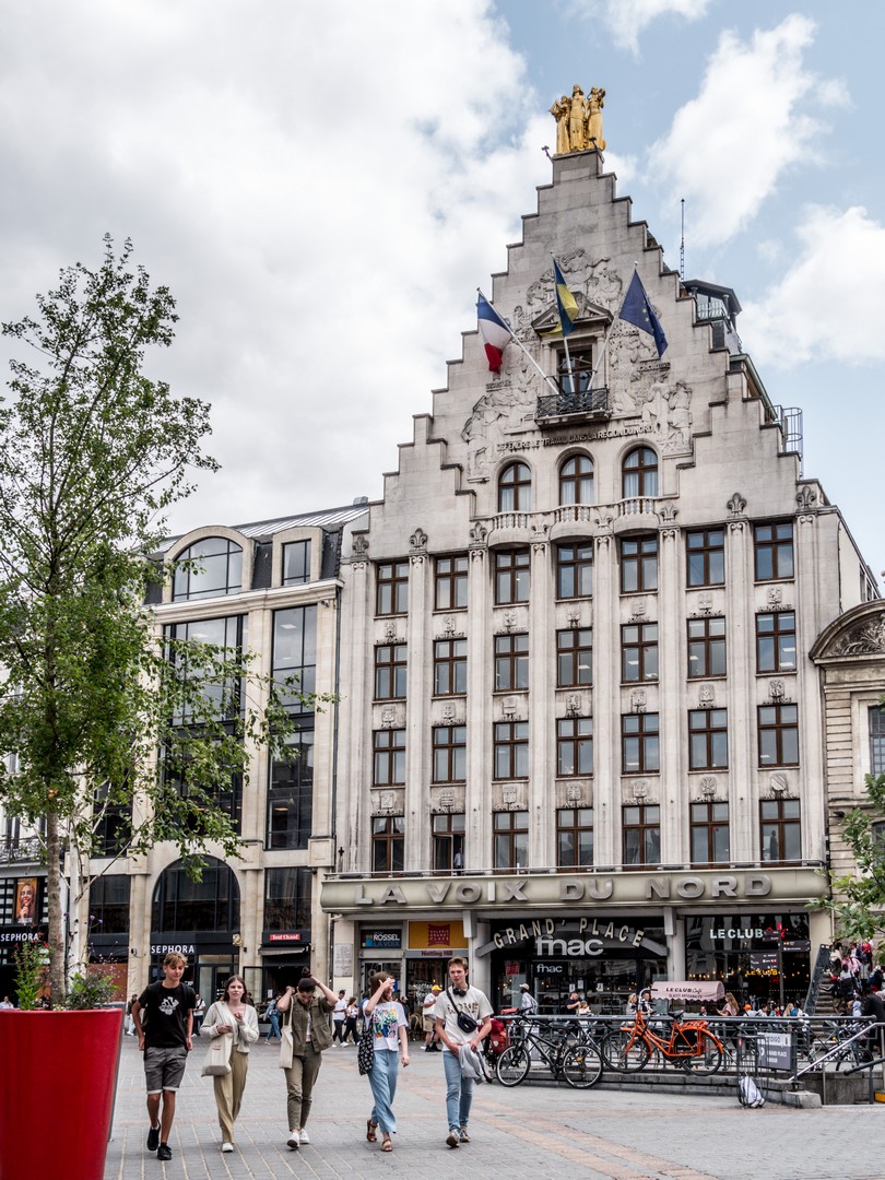 Juste à sa gauche, autre édifice célèbre : les bureaux de la Voix du Nord. Cette maison à pignon à redents combine architecture typiquement flamande et Art déco. Au sommet du pignon, se tiennent 3 Grâces dorées symbolisant les 3 régions historiques du Nord-Pas-de-Calais : Les Flandres, l’Artois et le Hainaut. Au départ, cette maison fut construite dans les années 1930 pour le Grand Echo du Nord, journal qui collaborera avec l’occupant allemand pendant la Deuxième Guerre Mondiale, la publication, ses locaux et installations seront reprises par le Voix du Nord, journal issue d’un réseau de résistance.