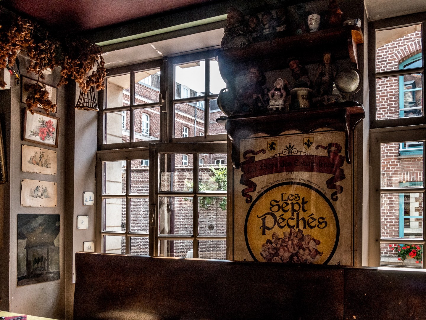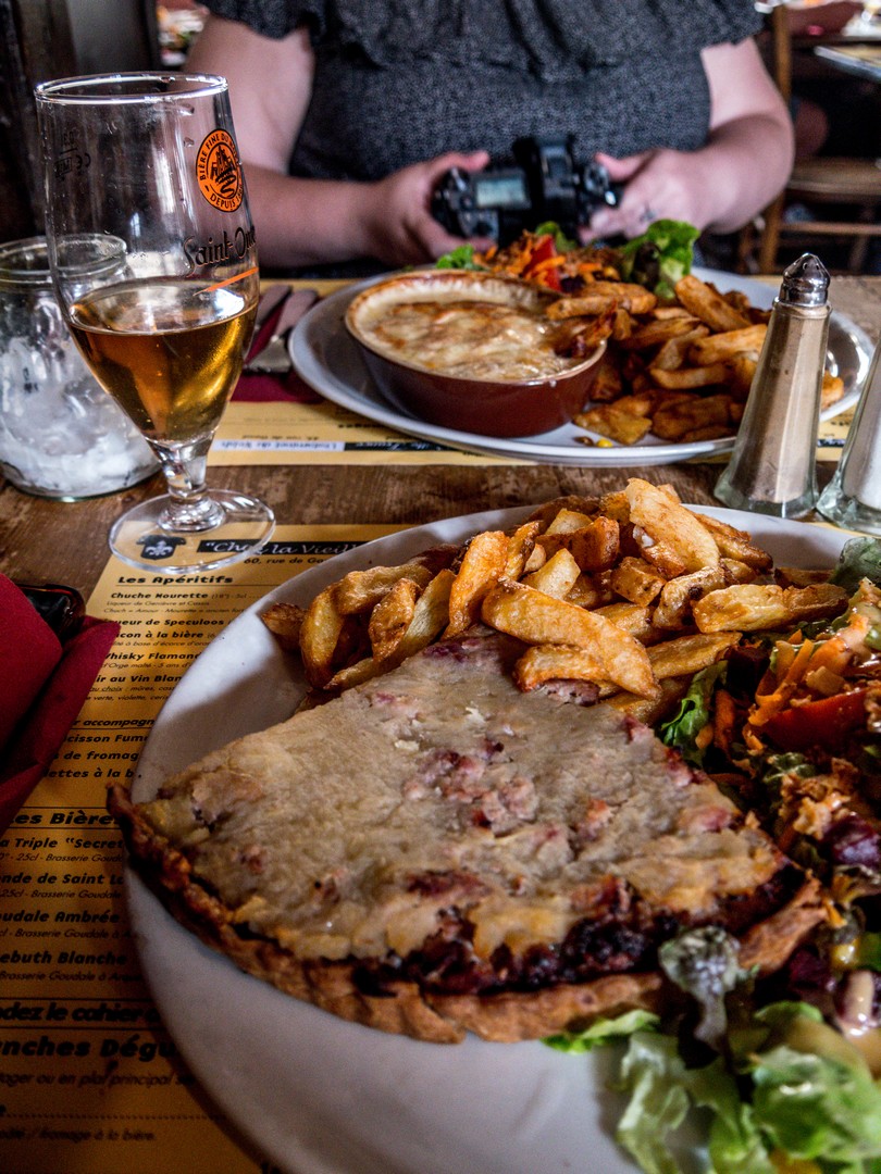 En plein dans un coin charmant du Vieux Lille, le restaurant joue sur le traditionnel (et franchement, plus que çà, tu meurs). De quoi parle t’on ? D’un intérieur en briques et meublé de bois, style estaminet, Du houblon séché pend aux poutres et des plaques d’émail recouvrent les murs. Sur la carte, les bons plats bien riches du Nord : welsh, frites et fricadelles, potjevleesch, croquettes au maroilles, etc… De mon côté, j’ai opté ce qui me semblait le plus léger un « cœur des Flandres », une tarte salée au hachis de porc, aux pommes et aux oignons (OK, dis comme çà…). Sauf que j’ai vu arriver un quart de tarte avec frites et salade. Ben oui, on est généreux dans le Nord ! Je n’ai pu manger que la moitié de ce très bon cœur qui naviguait entre le sucré et le salé, sans trop toucher aux frites, ni à la salade.