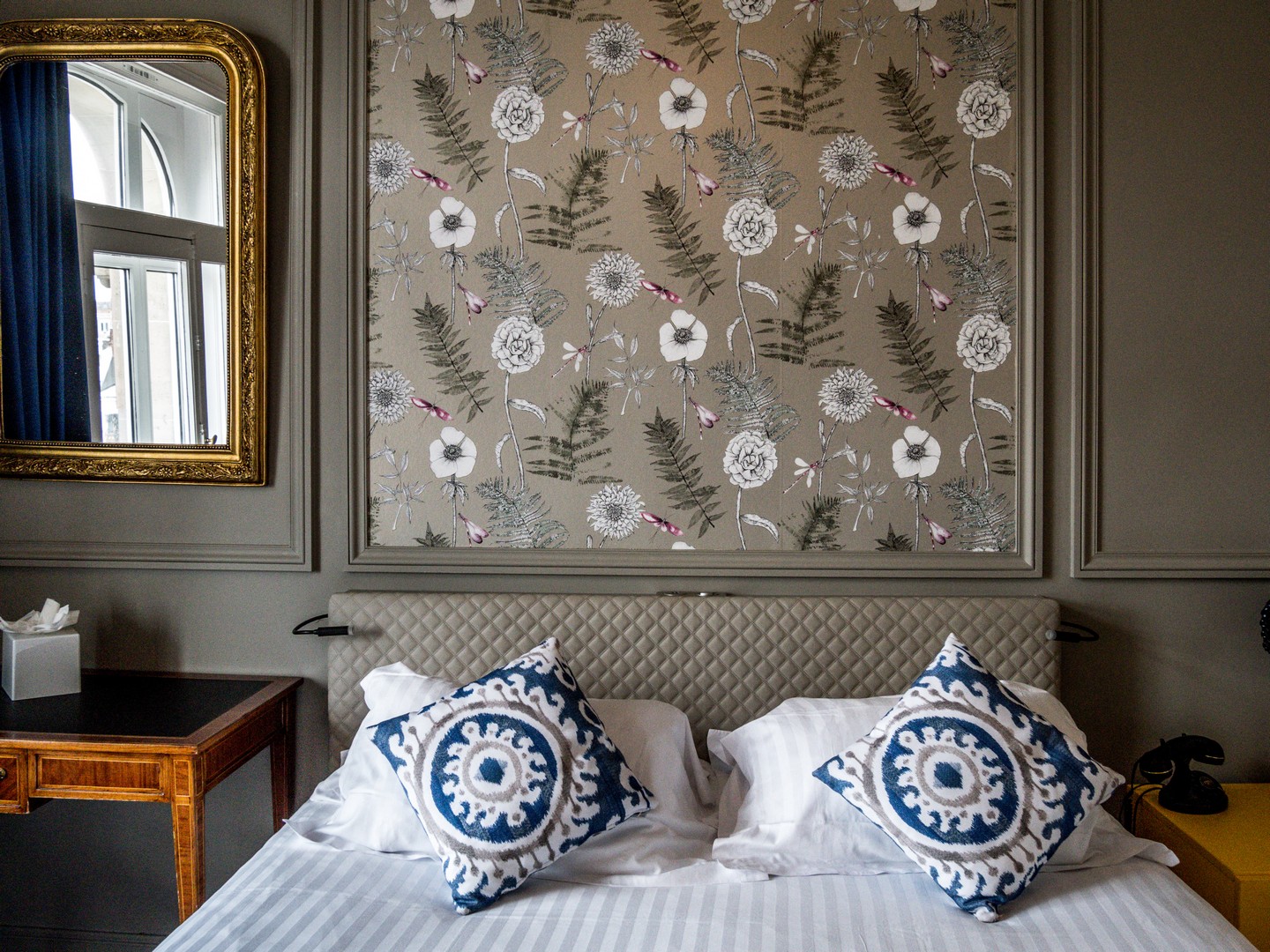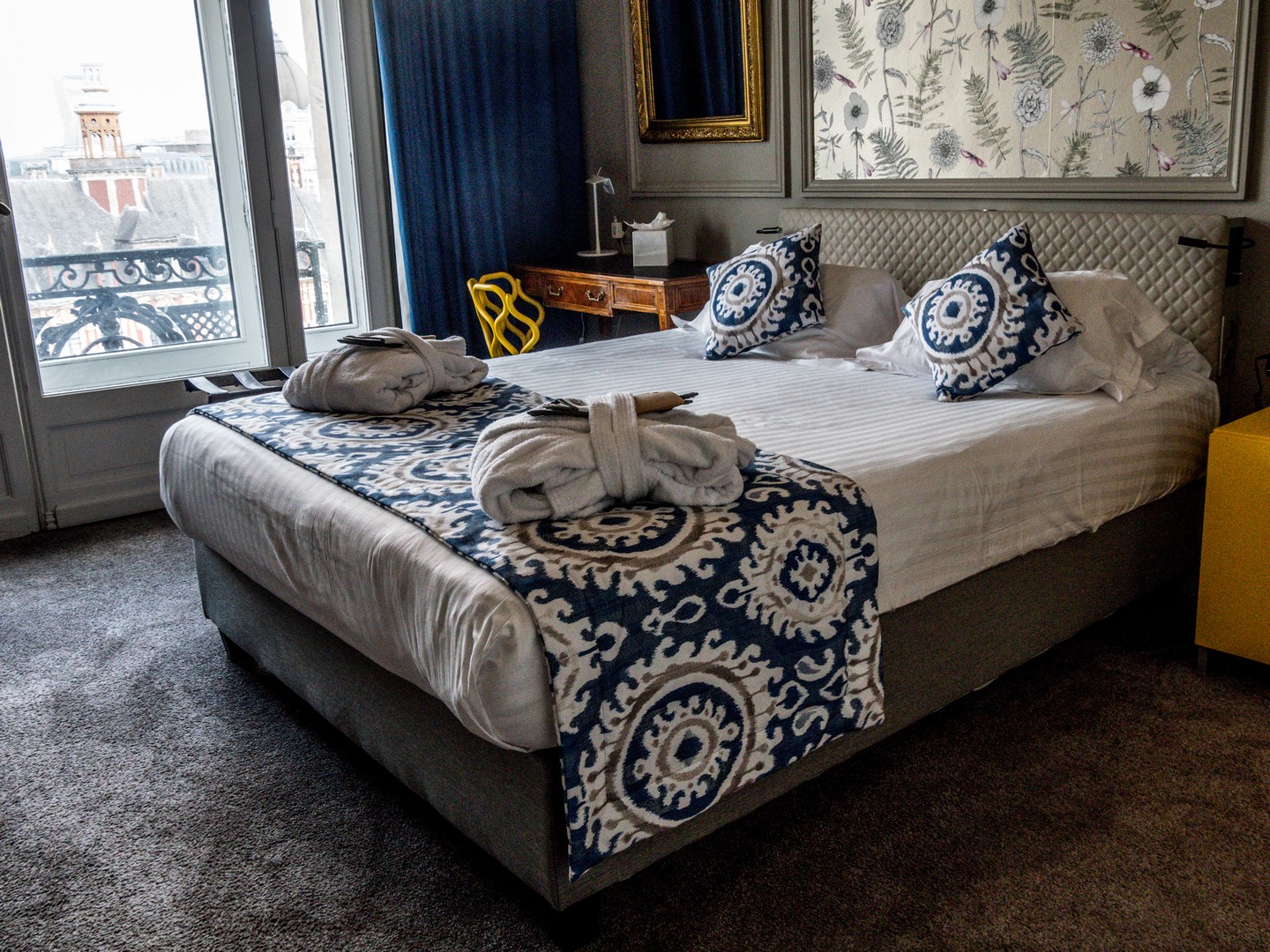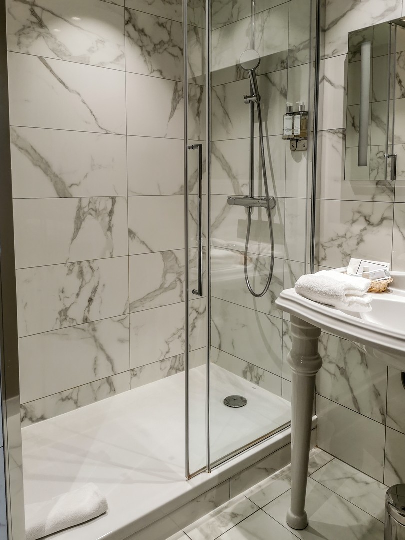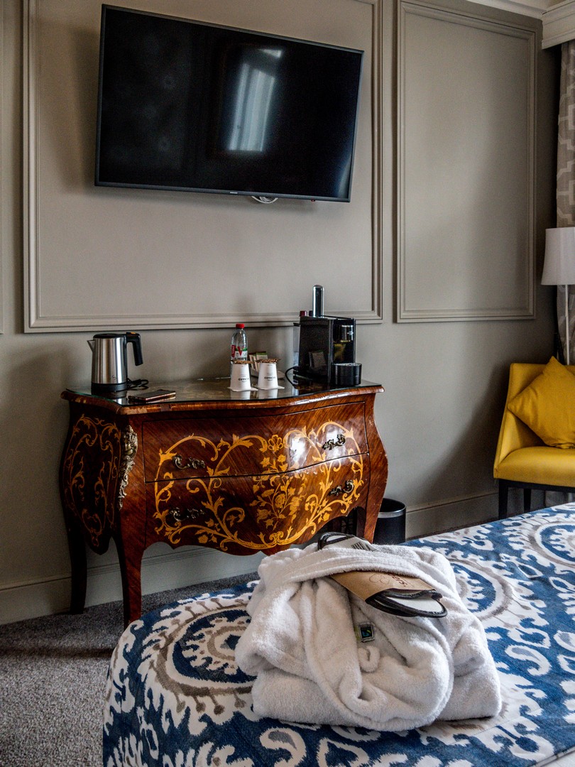 Les chambres avec vue sont vraiment spacieuses et mêlent des meubles anciens à des meubles contemporains et colorés. Pour bien commencer la journée ou faire une pause, une machine à café est à disposition dans toutes les chambres. Les deux points forts de la chambre, et là, on voit qu’on a affaire à un hôtel sérieux, c’est la literie et l’insonorisation. Le lit était top, du matelas au coussin quant au vitrage, alors qu’on est face à une place animée, on n’entend quasi rien une fois les fenêtres fermées. C’est génial ! Par contre, on entend (un peu) les grincements du parquet de la chambre du dessus. 😉