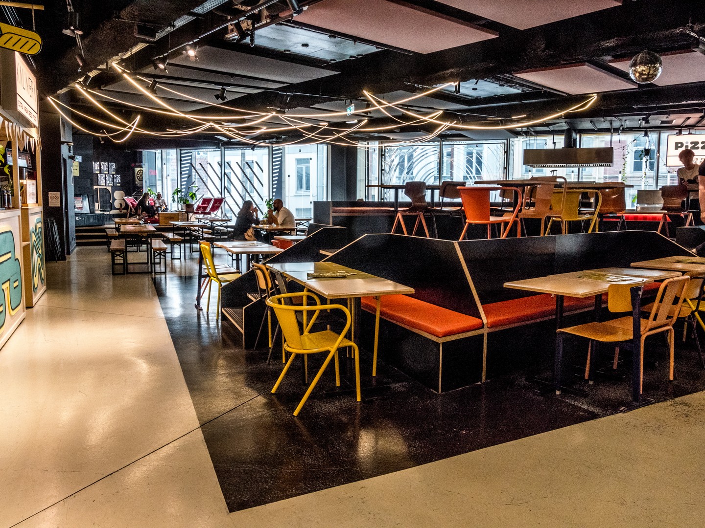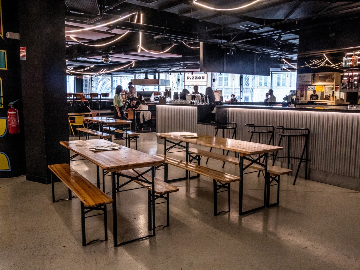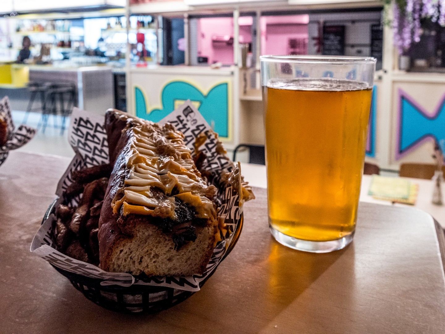 C’est le food-court du centre-ville. Une grande façade en verre annonce que nous sommes arrivées sur les mieux. Agencé sur deux étages, pas moins de 10 enseignes proposent une cuisine street-food mais avec des ingrédients locaux, en plus d’un bar et d’un coffee-shop. Nous faisons le tour de tous les stands (pizzas, kebab, asiatique) avant de nous décider pour Bierbuik, l’enseigne du chef Florent Ladeyn. Sa proposition de mitraillette (une baguette remplie de frites et de viande avec de la sauce) nous intriguait. La mitraillette, on connaît bien en Belgique. Tout.e Belge en a mangé au moins une alors, on avait vraiment eu envie d’essayer la version nordiste et là…c’est la déception ! La baguette, taillée en parallélépipède rectangle, entourait une maigre portion de volaille. On avait toutes les deux choisi le « spicy kip » qui n’était pas « spicy » du tout. Emma en avait même moins que moi. Quant aux frites, elles étaient bonnes mais plutôt molles. La tenancière du stand nous a demandé notre avis et nous lui avons franchement répondu. On espère que le message sera remonté au chef ! La prochaine fois, j’essaierai le kebab (élu le meilleur de Lille).