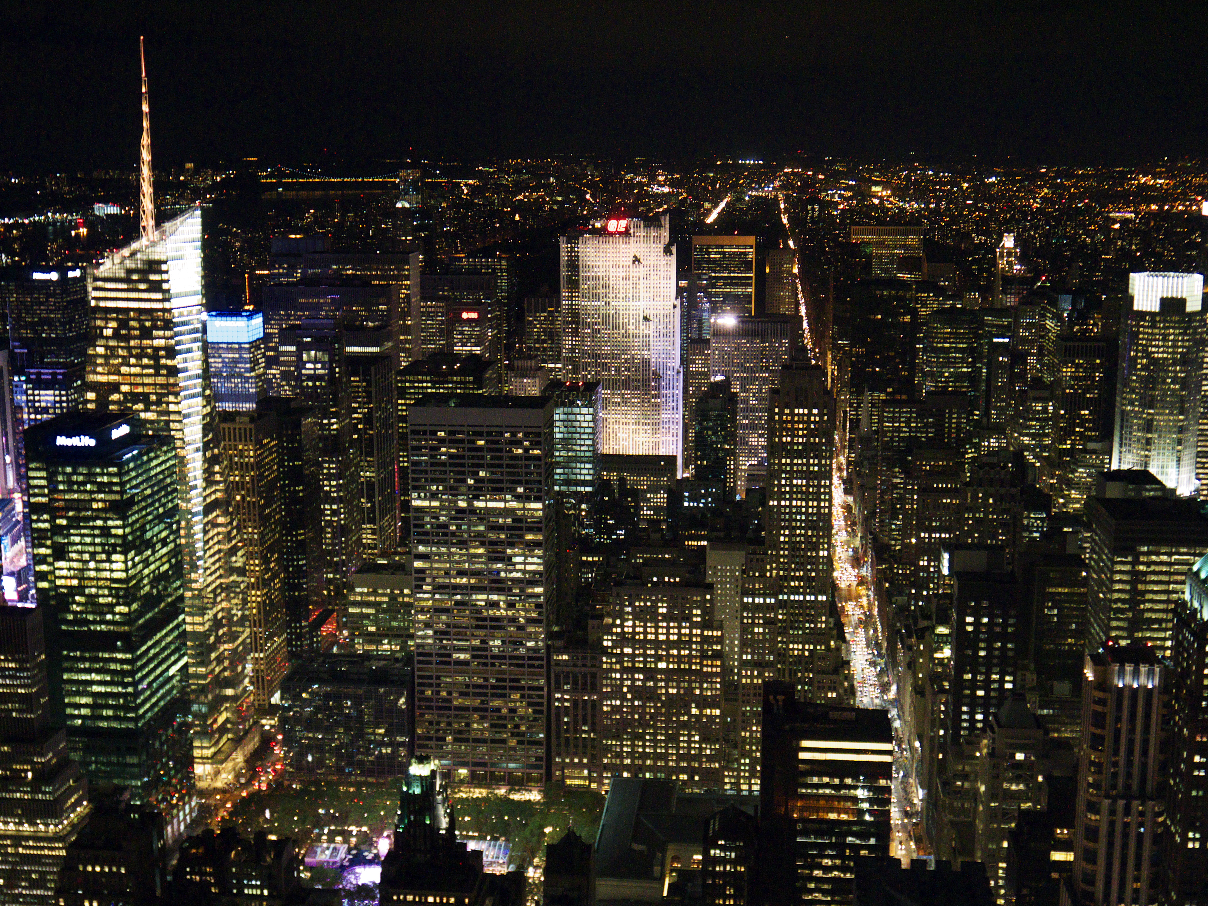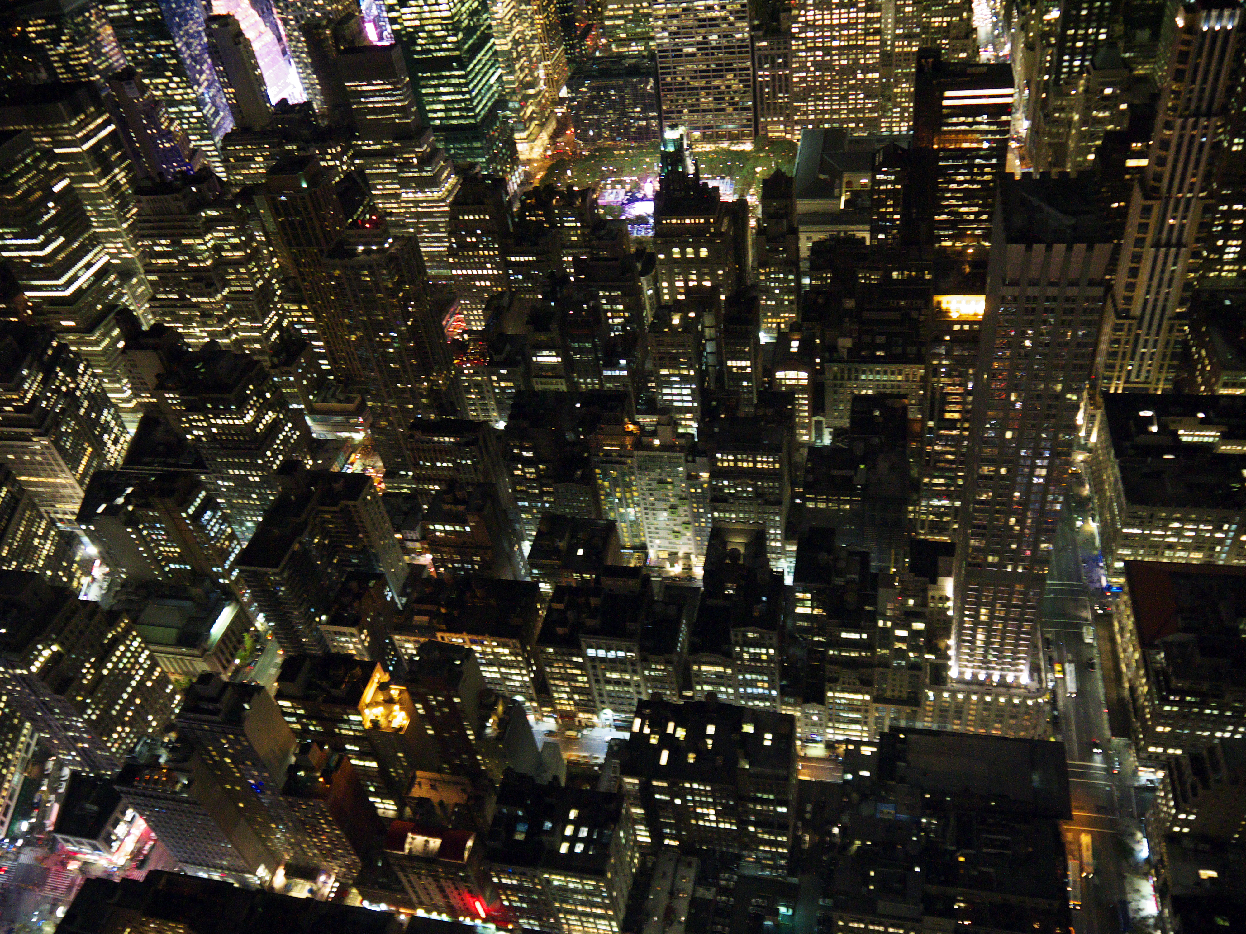 L’Empire State Building… chef d’œuvre de l’Art Nouveau et le gratte-ciel préféré de King Kong. Depuis que les Tours jumelles n’existent plus, c’est à nouveau au sommet de son 86e étage que l’on vient nombreux admirer une des plus belles vues sur Manhattan. Et quel monde se presse aux guichets. Pour gérer tout çà, il faut une organisation quasi militaire avec des gardiens postés tous les 5 mètres qui donnent des ordres (et pas question de traîner) mais une fois là-haut, quel spectacle! Sur un fond d’encre, des centaines de milliers de lumières. New York est à nos pieds et plongée dans la nuit, elle ressemble à une gigantesque case de bande dessinée et jeune et noir… Contempler les canyons d’ombres et de lumières est vertigineux… La ville a l’air monstrueuse mais là-haut, plus de bruits de taxis, de la foule. des hommes sandwiches… Tout est calme! C’est un monstre au dos chamarré qui se repose. Je me sens un peu comme Batman, contemplant Gotham en attendant que le crime se produise. Sauf que je suis entourée de touristes qui attendent de trouver une petite place pour prendre une photo.