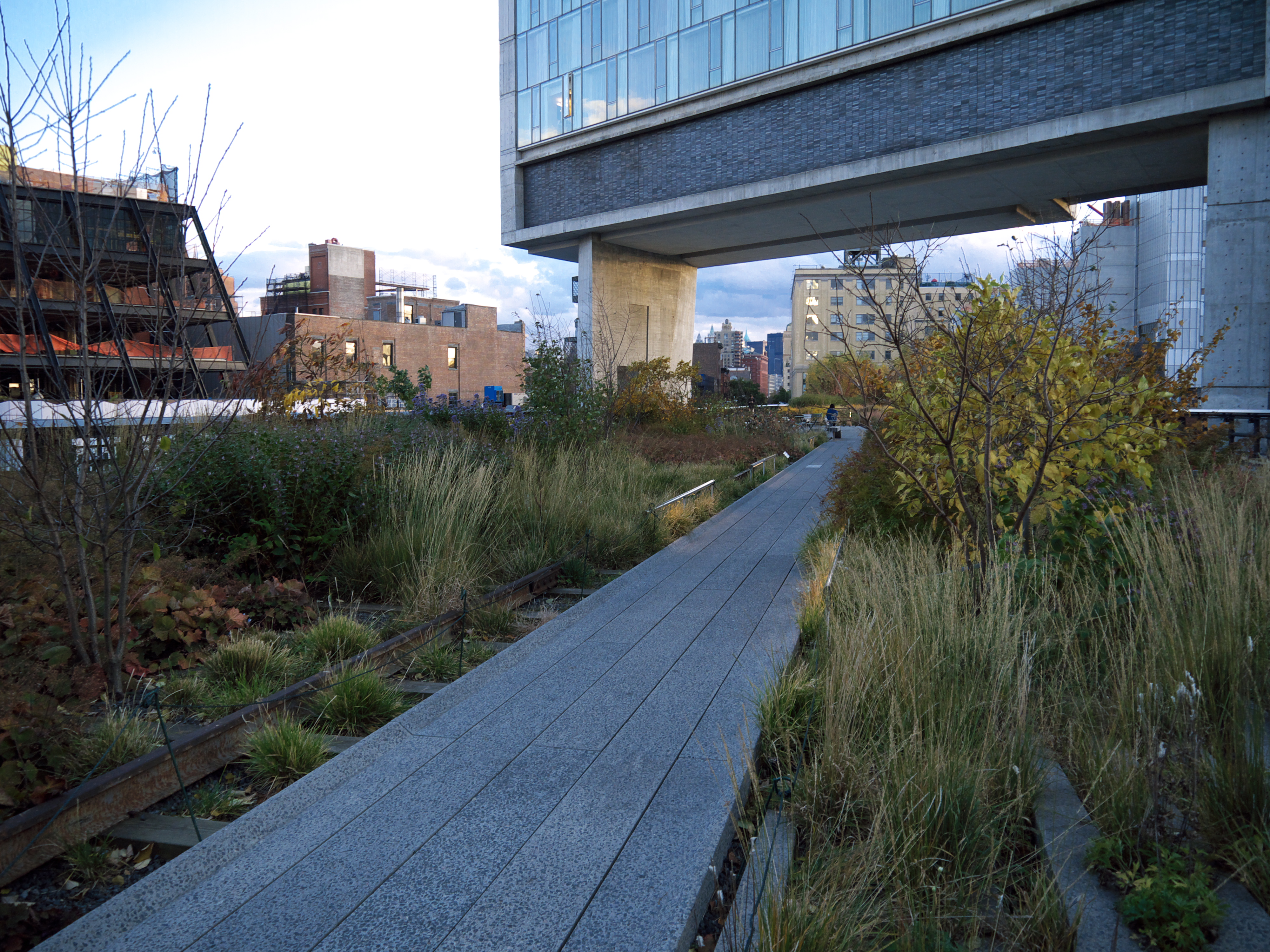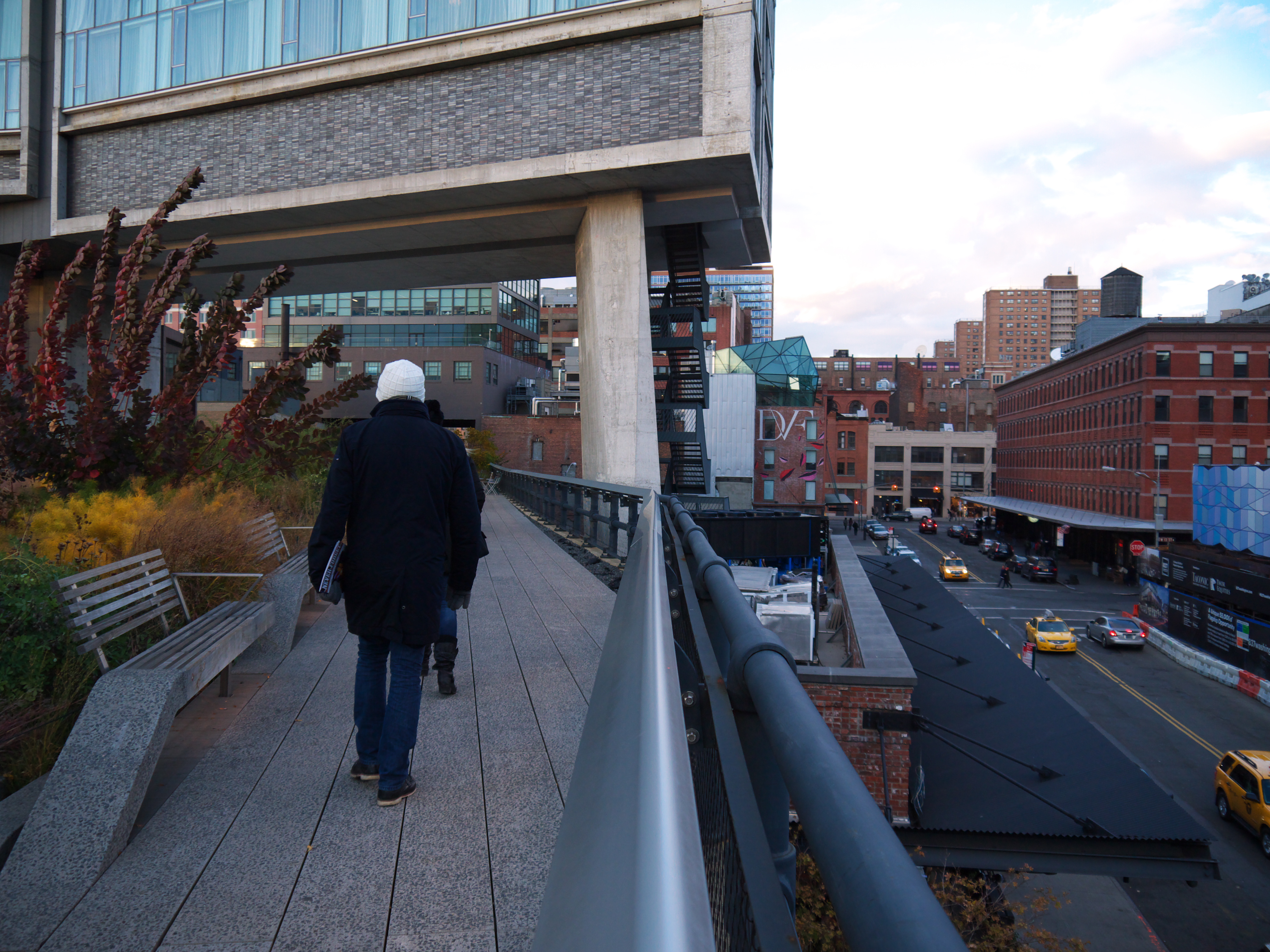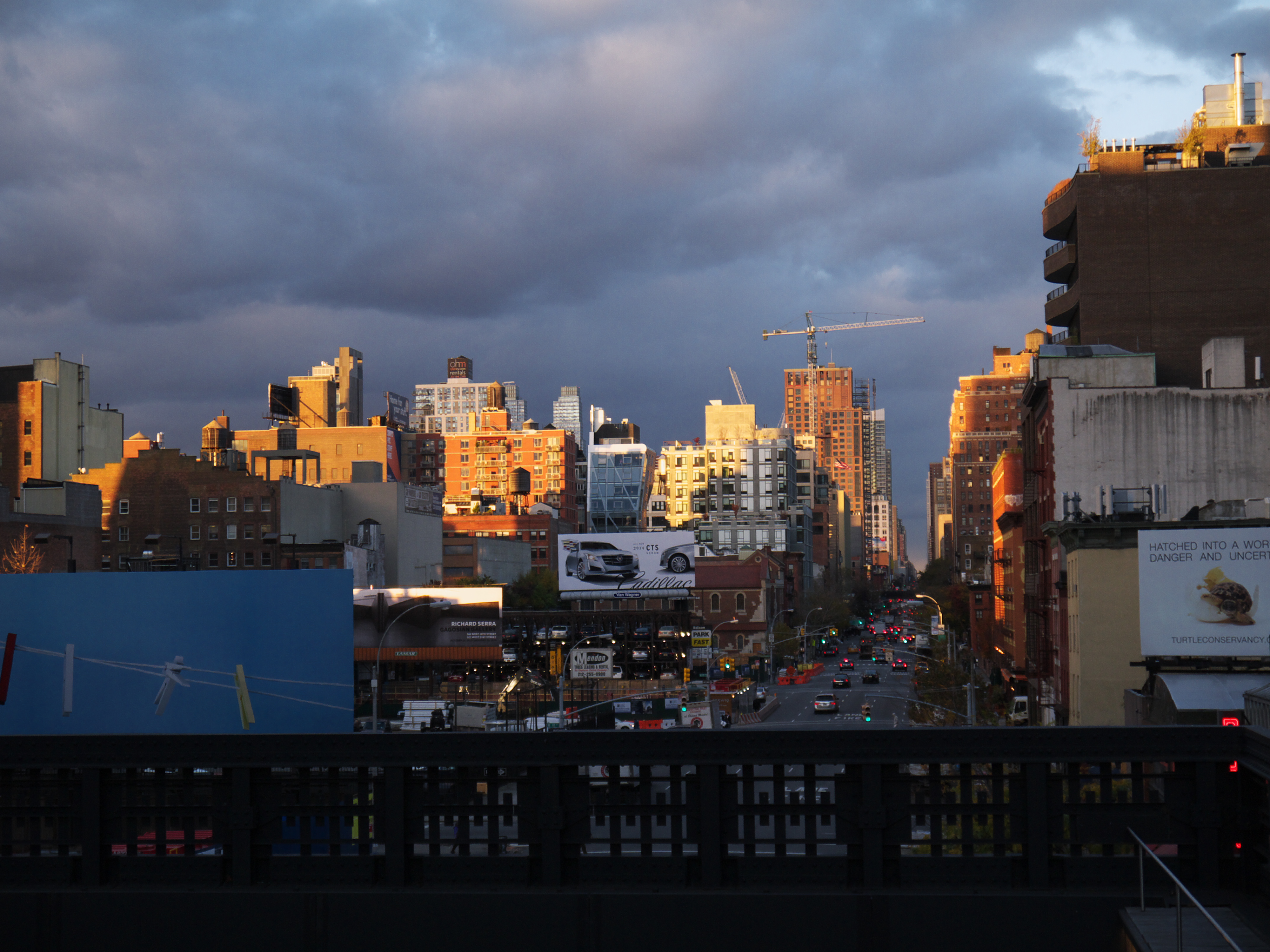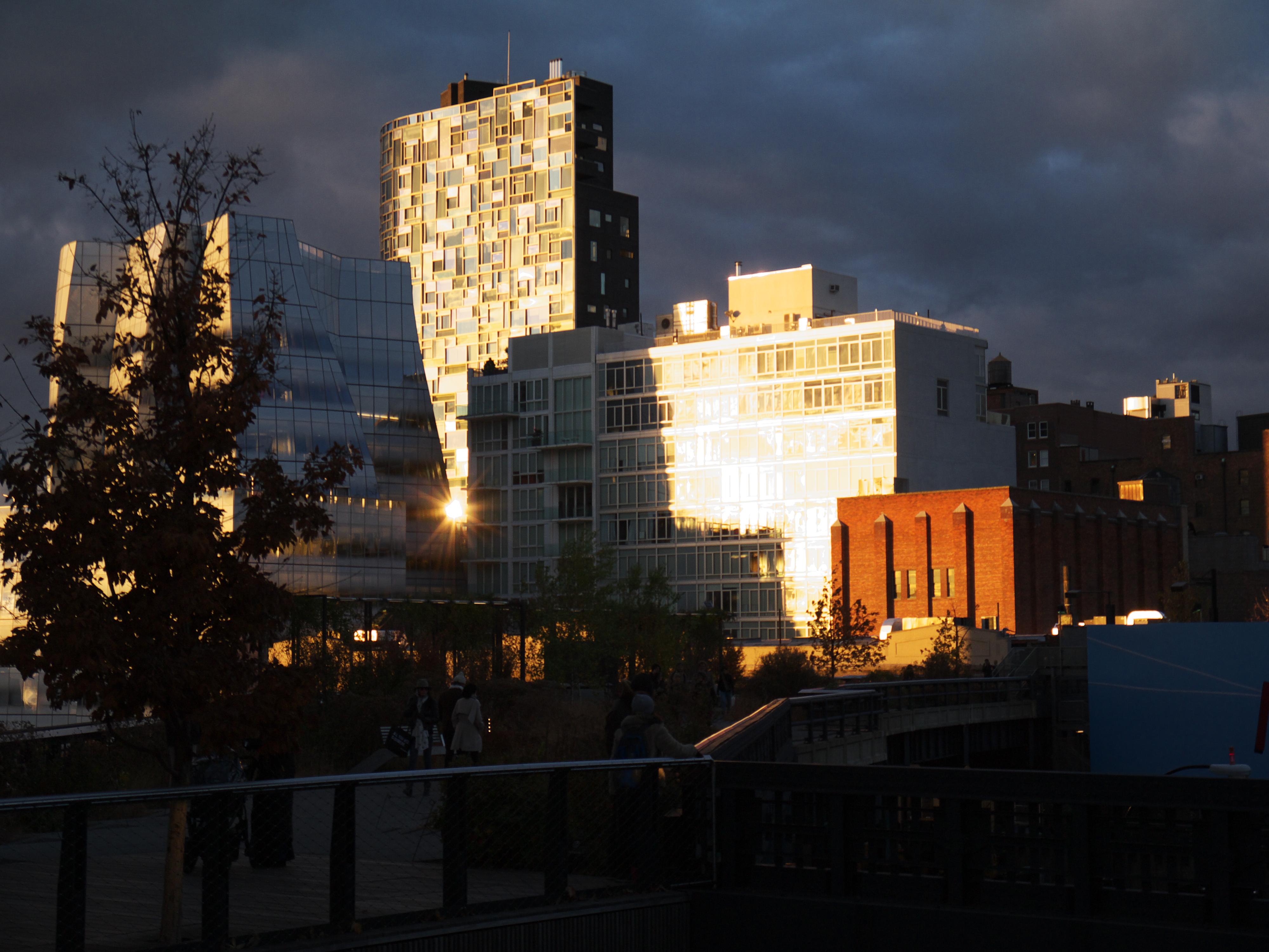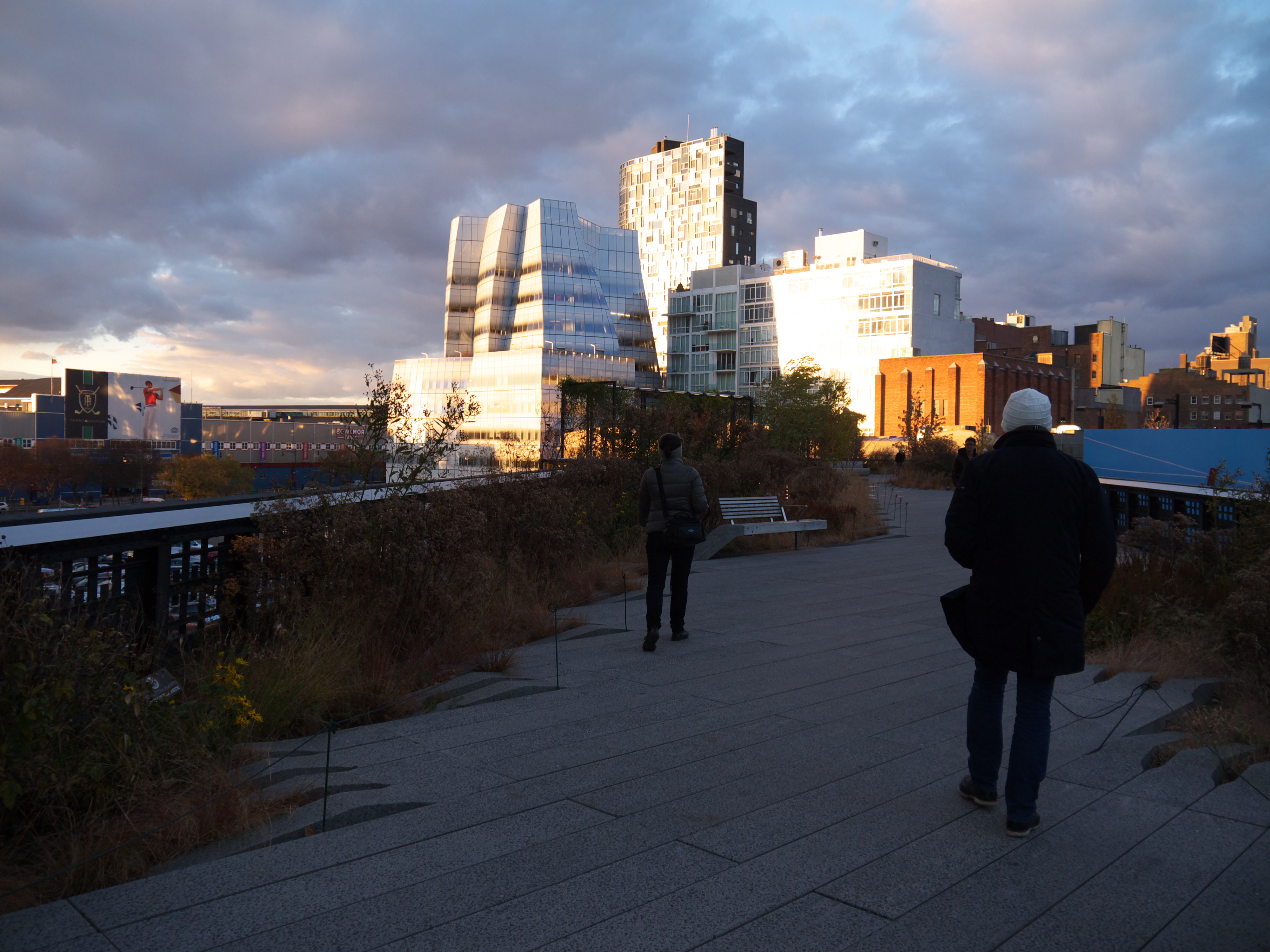 Nous remontons vers le nord et Chelsea… le spectacle urbain reste un peu le même. mais la proximité de l’Hudson et de la voie ferrée y font que les buildings y sont un peu plus grands. On y trouve aussi d’anciennes usines et hangars. Les anciennes maisons ouvrières y côtoient de grands complexes d’appartements. Un mélange de restaurants ethniques, de bars, de prestigieux noms de la mode et de galeries d’art complète le tableau. On s’attarderait bien un peu plus pour découvrir cette mosaïque mais le soleil se couche TRÈS tôt en cette saison (vers 16h30) et le but de cette promenade doit être vu avant que la nuit ne tombe car la frontière entre Chelsea et le Meatpacking District, c’est le point d’entrée de la High Line, une ancienne voie ferrée aérienne transformée en parc suspendu sous l’impulsion d’un groupe de riverains. On y grimpe grâce a des escaliers en fer et tout à coup, nous voilà transportés dans un autre monde! Enfin, nous pouvons contempler les immeubles de New York sur un pied un plus égal, puisque nous sommes un peu plus à leurs niveaux. On y circule à travers les sumacs (rouges sangs en automne), herbes folles et les buissons et les dernières fleurs. Tous choisis pour rappeler le côté « sauvage » du rail qui, laissé à l’abandon pendant plusieurs décennies, était devenu une véritable petite jungle. Et c’est superbe! Cette petite veine verte qui surplombe la circulation et qui parfois, traverse même un bâtiment, est devenue un des joyaux de New York. Tant et si bien qu’il y a des « embouteillages » de promeneurs pendant l’été. En ce frisquet jour de novembre, pas de problème! Nous nous promenons jusqu’à ce que le soleil ne disparaisse, mais pas avant de nous être régalé des couleurs de l’automne, de la lumière qui se reflété sur les gratte-ciel et l’eau de l’Hudson. Un vrai moment d’apesanteur… Et la High Line sera encore plus belle! La dernière phase est en cours et les plans sont plus que prometteurs.