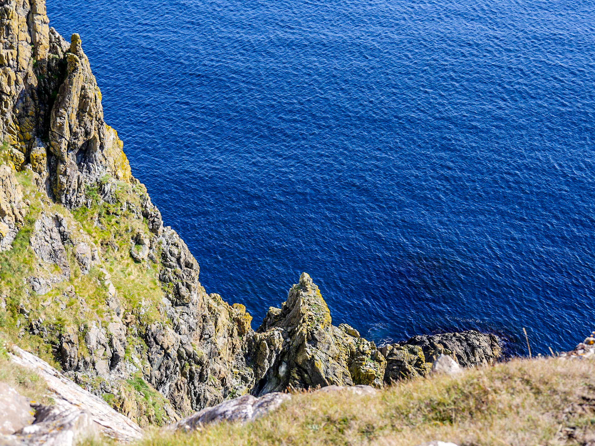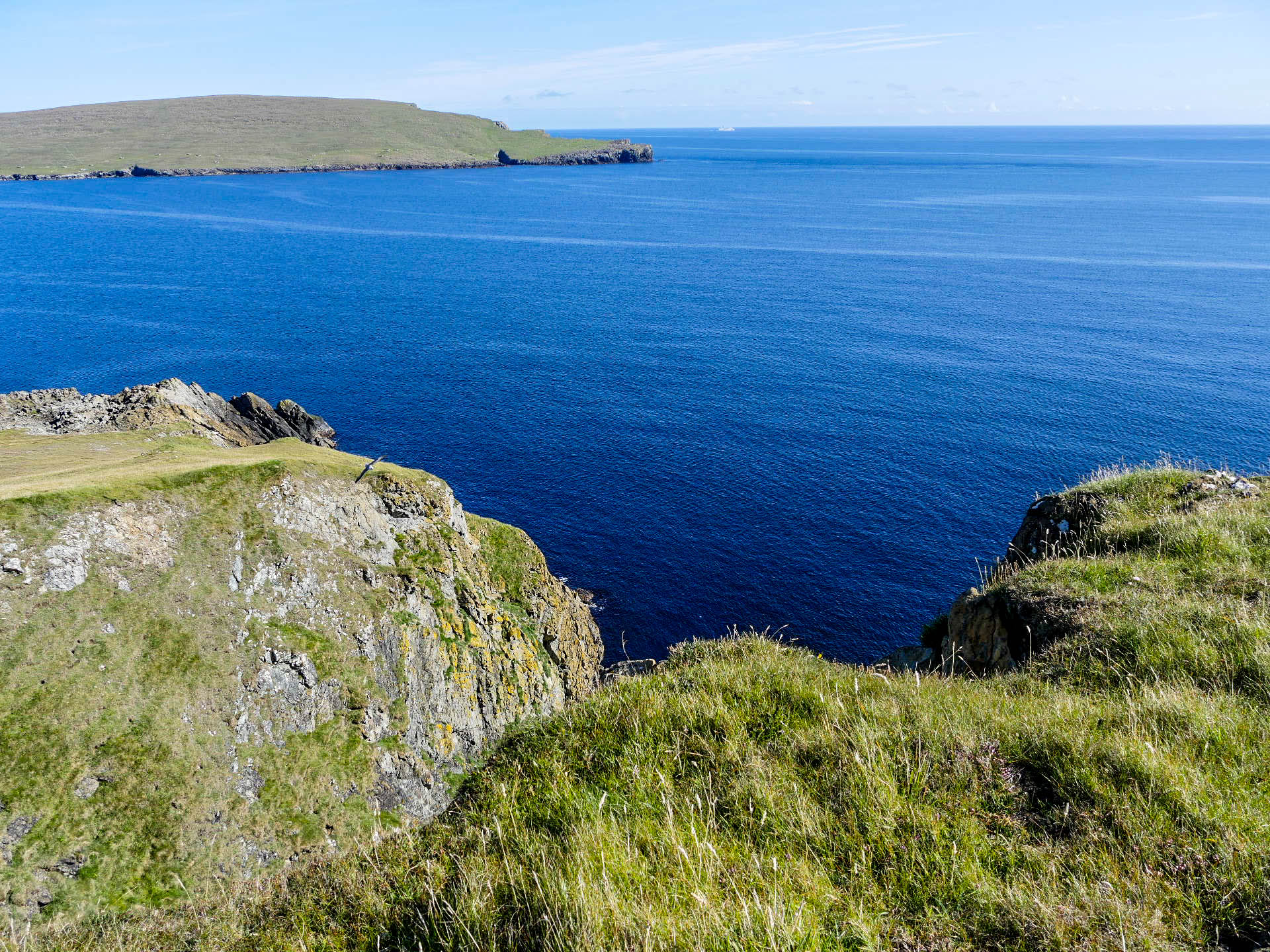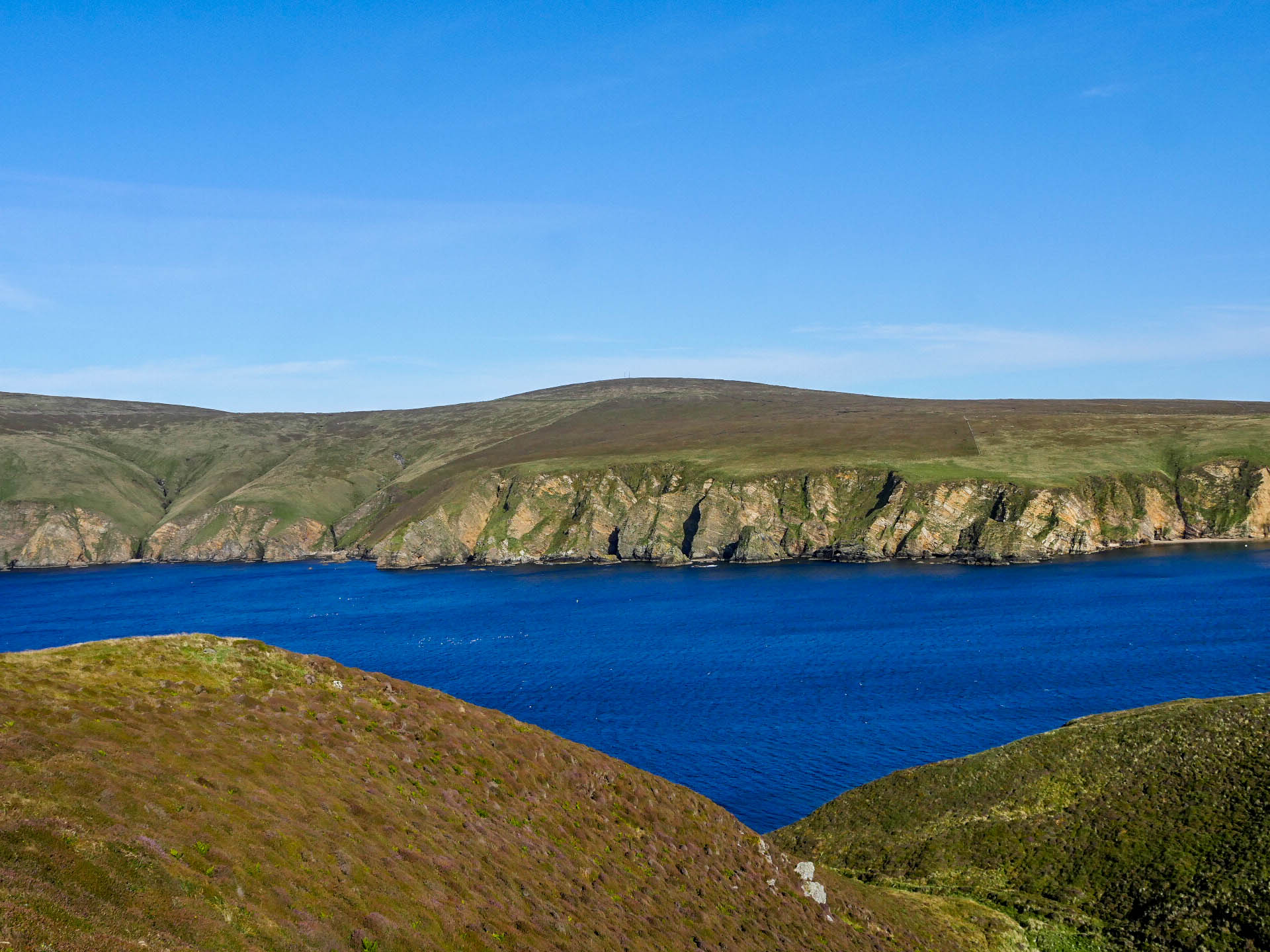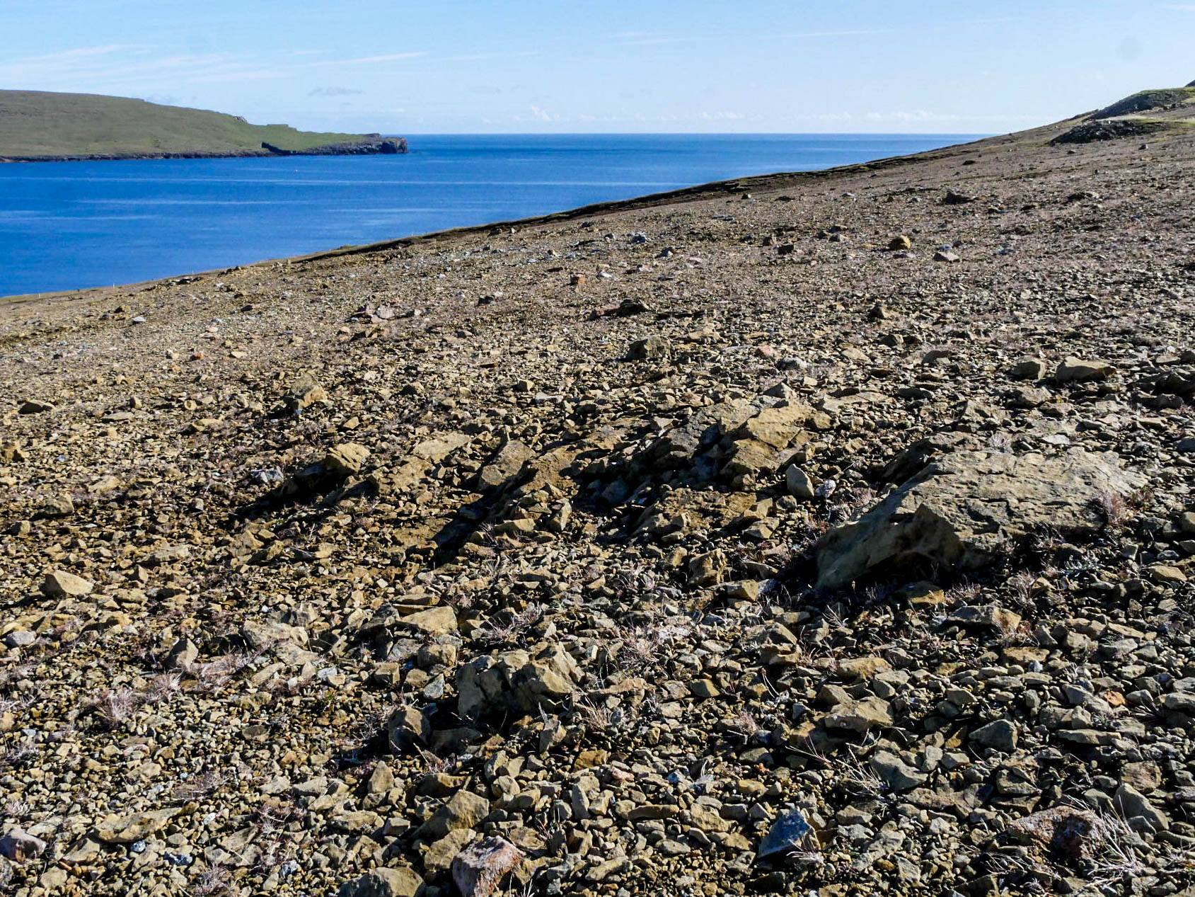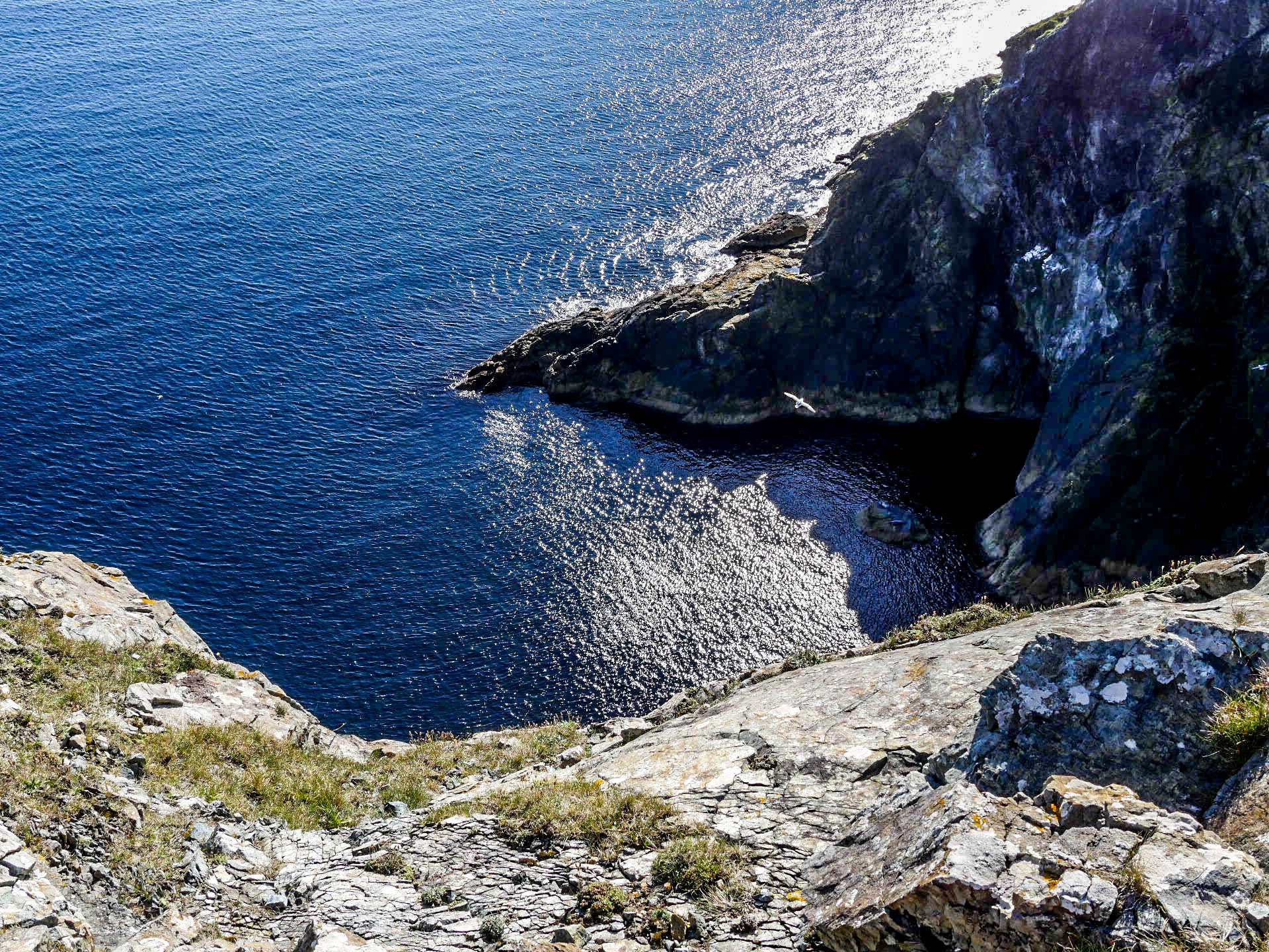 Nous laissons derrière nous la route principale pour nous lancer sur le sentier du Keen of Hamar Nature Preserve. On ne savait pas trop à quoi s’attendre. A première vue, la randonnée semblait sympa mais sans plus. Keen of Hamar a des particularités géologiques qui la rende unique aux Shetland, à la fois du point de vue du paysage que du point de vue de la flore. Il y pousse des plantes qu’on ne trouve pas ailleurs dans les îles, ni même ailleurs au Royaume-Uni (pas vraiment de chance pour nous, la fin de l’été était là, donc plus vraiment de fleurs). La montée vers la falaise se fait dans un paysage presque lunaire fait de débris serpentins. On dirait que les pierres coulent directement du haut de la falaise, comme si une rivière les avait charriées. Par contre, une fois arrivée en haut, c’est le grand spectacle : nous avons une vue superbe sur Balta Sound. Et en cette fin de matinée, les couleurs claquent : le bleu marine intense de la Mer du Nord, le blanc de la roche qui affleure, 36 nuances de vert, une série de falaises qui plongent dans l’eau… On ne s’attendait pas à ça.