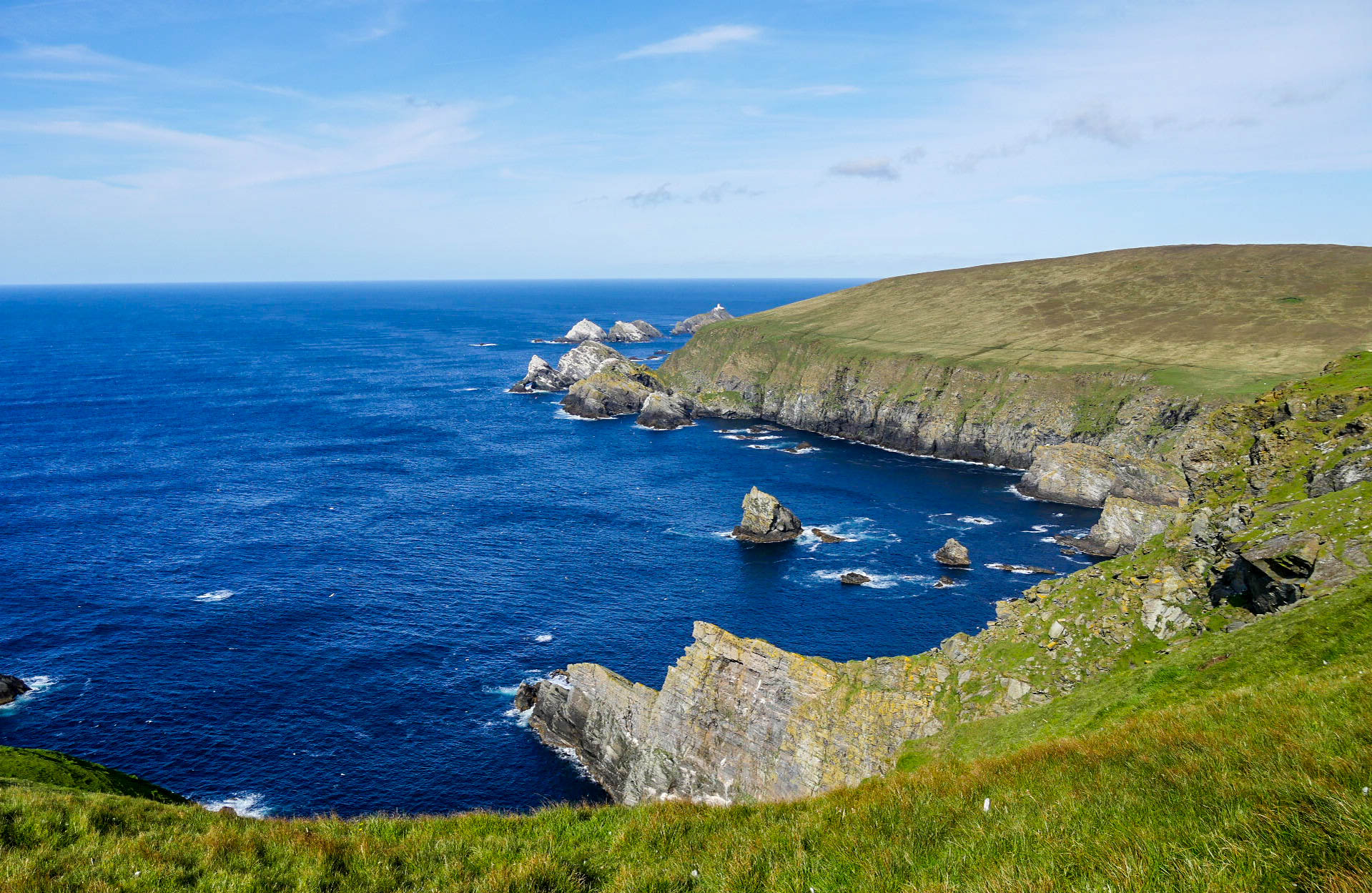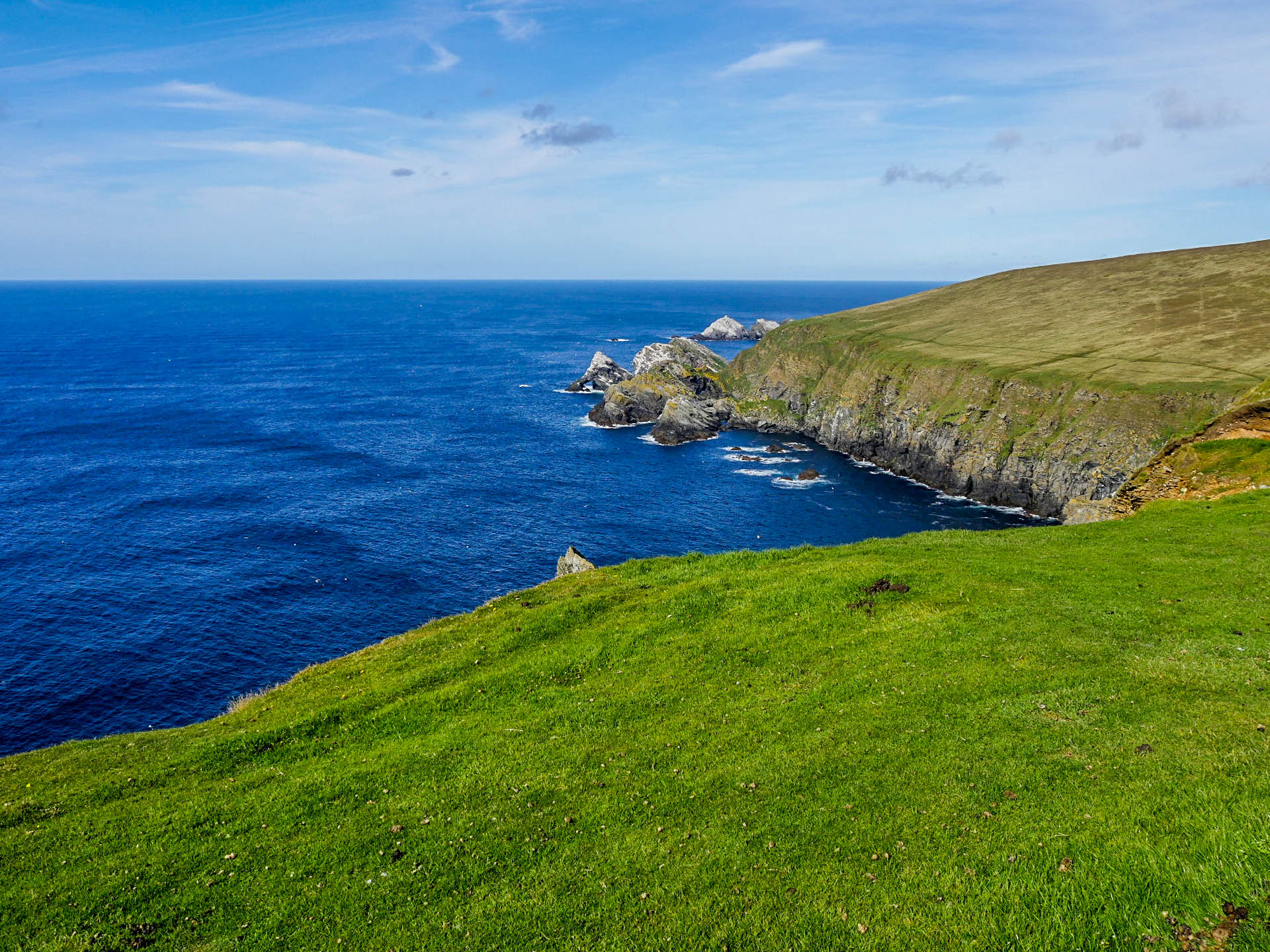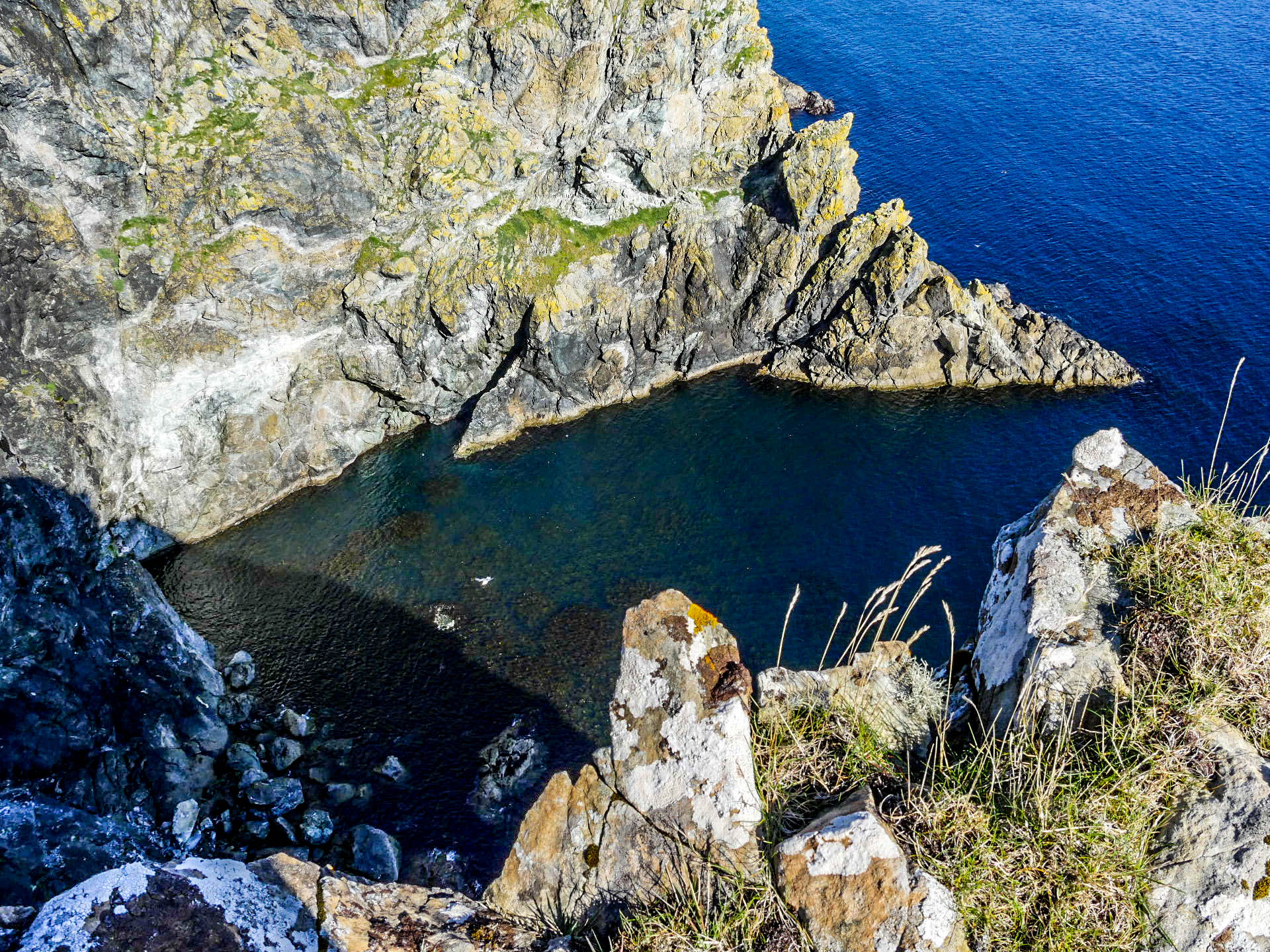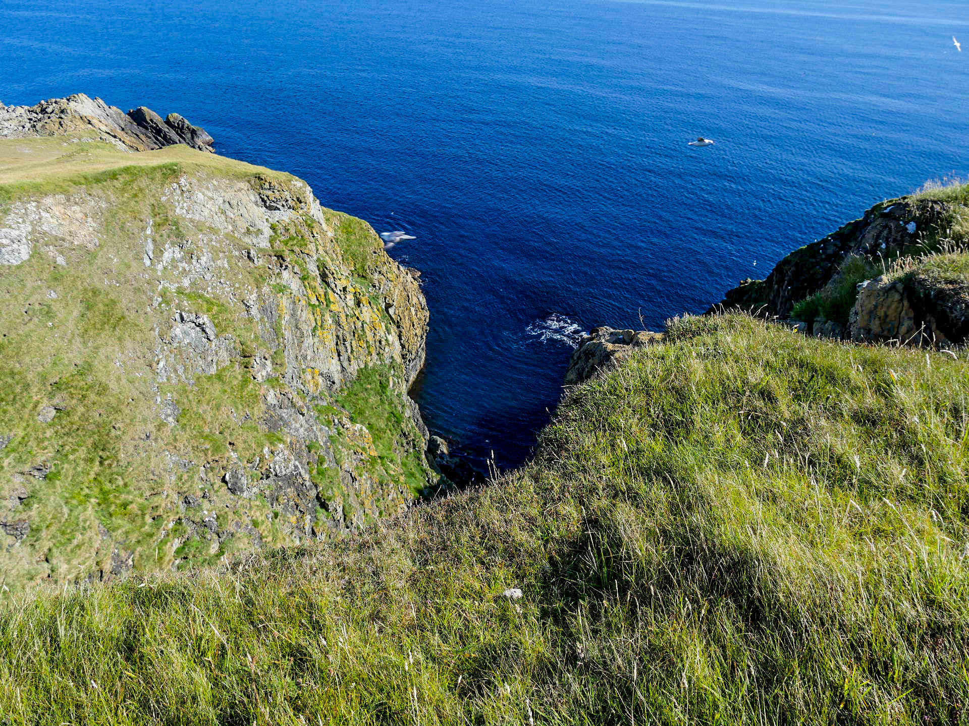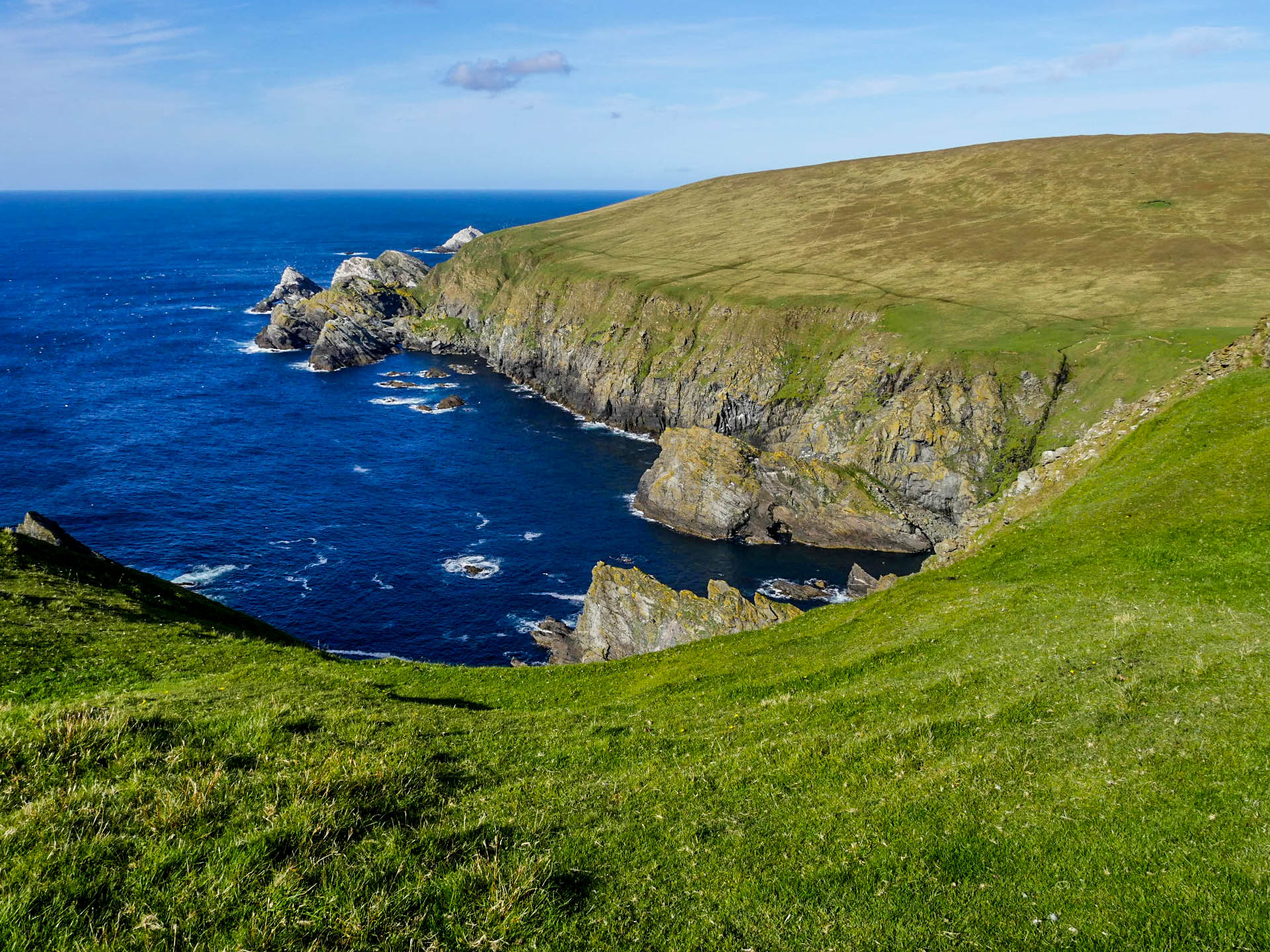 Nous laissons derrière nous la route principale pour nous lancer sur le sentier du Keen of Hamar Nature Preserve. On ne savait pas trop à quoi s’attendre. A première vue, la randonnée semblait sympa mais sans plus. Keen of Hamar a des particularités géologiques qui la rende unique aux Shetland, à la fois du point de vue du paysage que du point de vue de la flore. Il y pousse des plantes qu’on ne trouve pas ailleurs dans les îles, ni même ailleurs au Royaume-Uni (pas vraiment de chance pour nous, la fin de l’été était là, donc plus vraiment de fleurs). La montée vers la falaise se fait dans un paysage presque lunaire fait de débris serpentins. On dirait que les pierres coulent directement du haut de la falaise, comme si une rivière les avait charriées. Par contre, une fois arrivée en haut, c’est le grand spectacle : nous avons une vue superbe sur Balta Sound. Et en cette fin de matinée, les couleurs claquent : le bleu marine intense de la Mer du Nord, le blanc de la roche qui affleure, 36 nuances de vert, une série de falaises qui plongent dans l’eau… On ne s’attendait pas à ça.