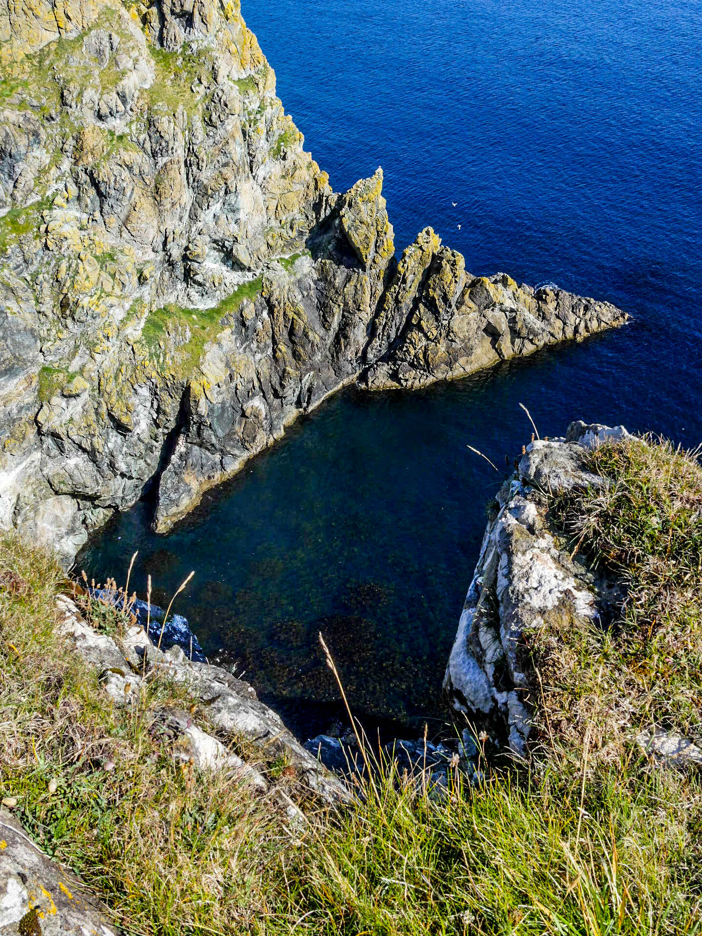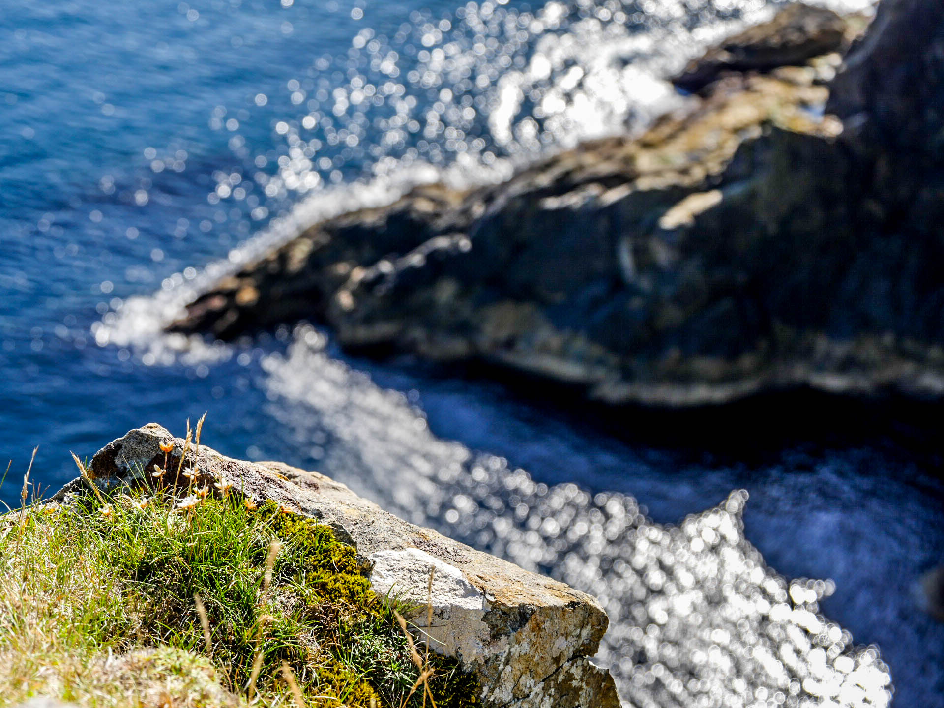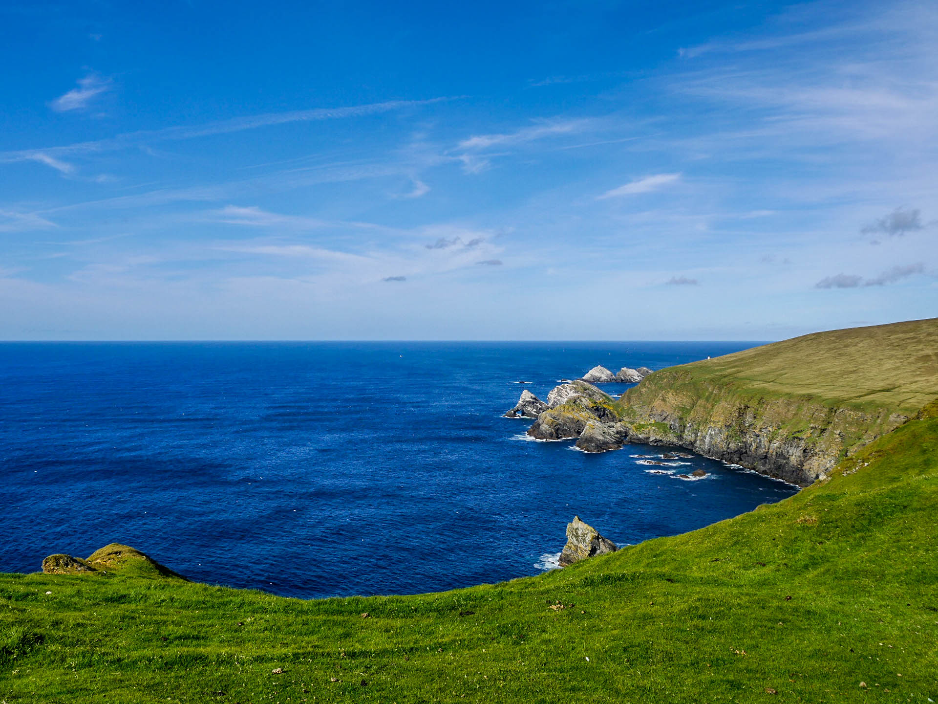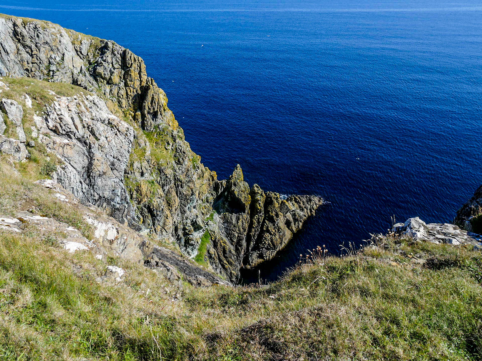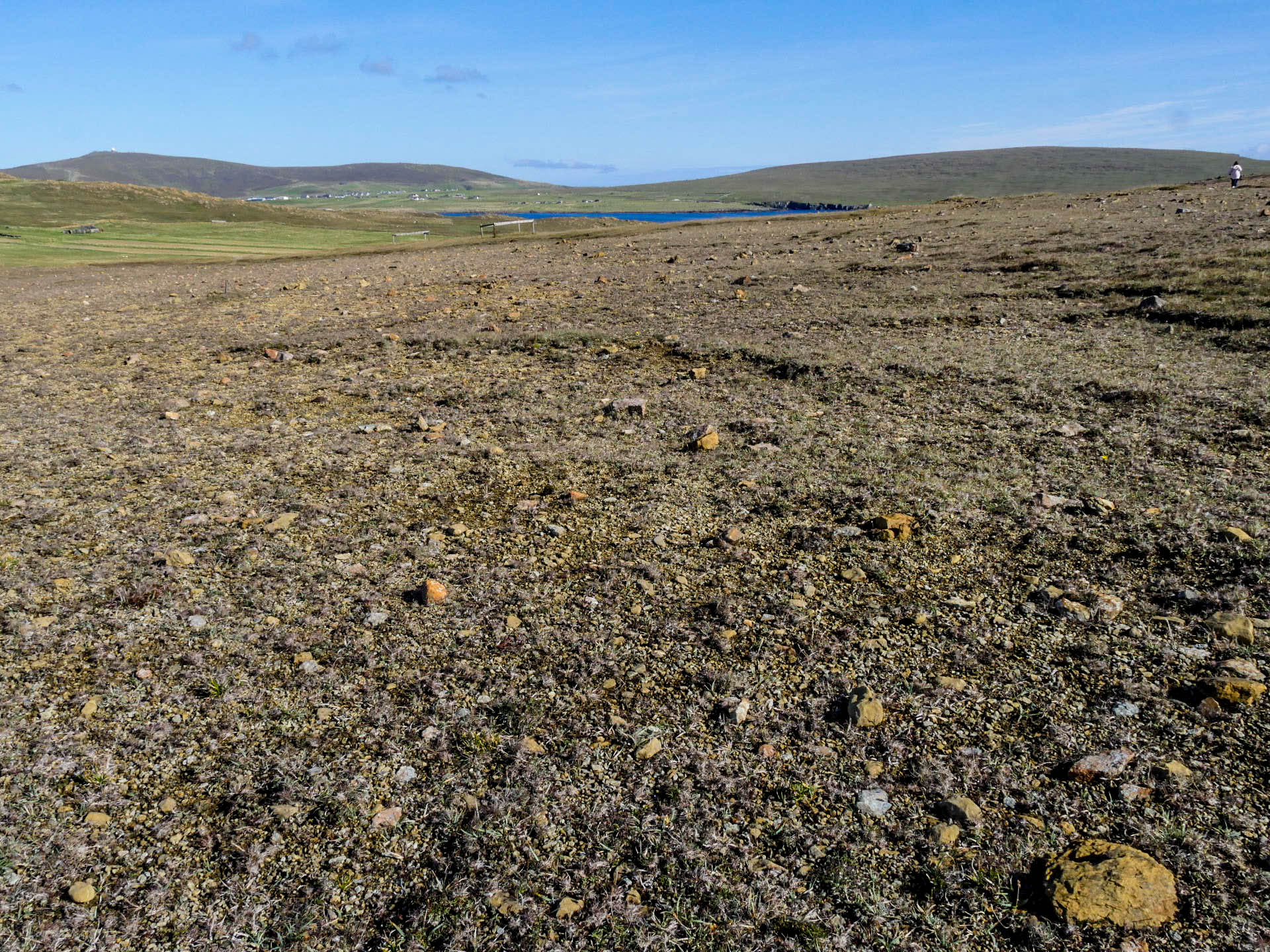 Nous laissons derrière nous la route principale pour nous lancer sur le sentier du Keen of Hamar Nature Preserve. On ne savait pas trop à quoi s’attendre. A première vue, la randonnée semblait sympa mais sans plus. Keen of Hamar a des particularités géologiques qui la rende unique aux Shetland, à la fois du point de vue du paysage que du point de vue de la flore. Il y pousse des plantes qu’on ne trouve pas ailleurs dans les îles, ni même ailleurs au Royaume-Uni (pas vraiment de chance pour nous, la fin de l’été était là, donc plus vraiment de fleurs). La montée vers la falaise se fait dans un paysage presque lunaire fait de débris serpentins. On dirait que les pierres coulent directement du haut de la falaise, comme si une rivière les avait charriées. Par contre, une fois arrivée en haut, c’est le grand spectacle : nous avons une vue superbe sur Balta Sound. Et en cette fin de matinée, les couleurs claquent : le bleu marine intense de la Mer du Nord, le blanc de la roche qui affleure, 36 nuances de vert, une série de falaises qui plongent dans l’eau… On ne s’attendait pas à ça.