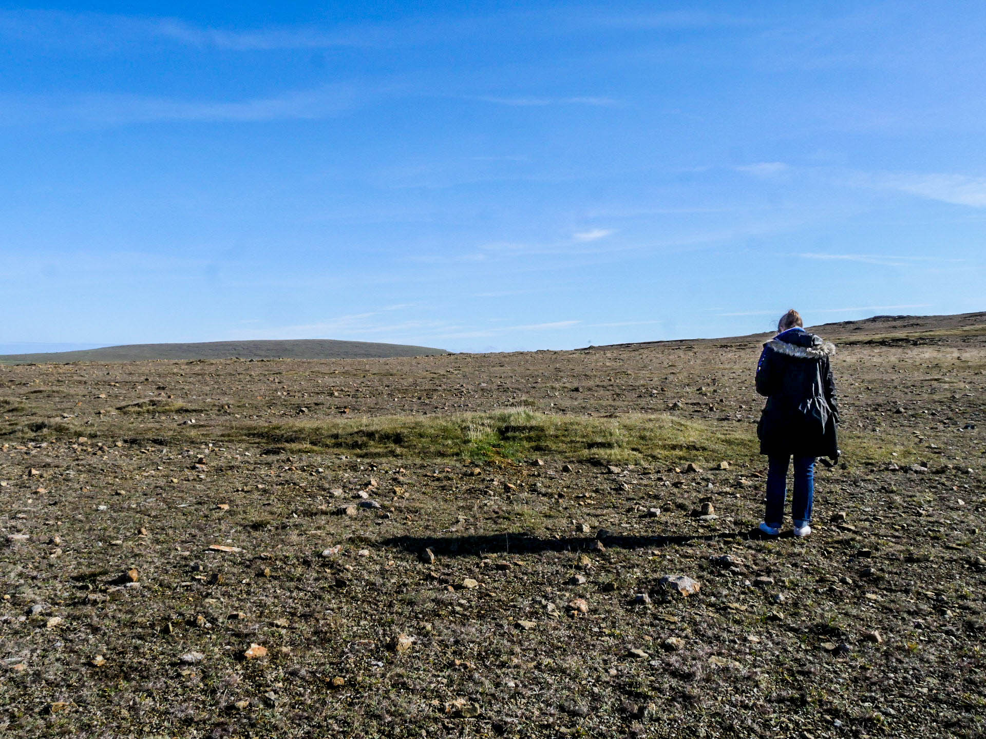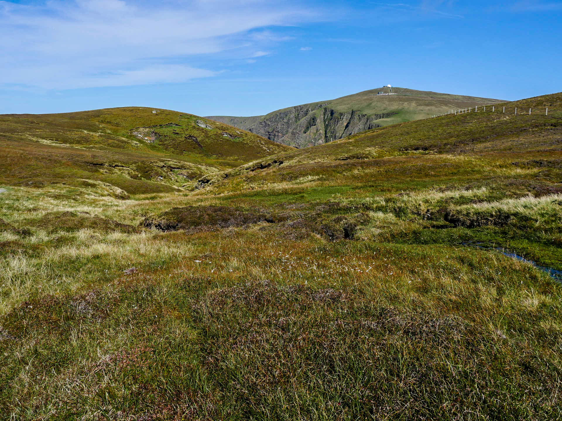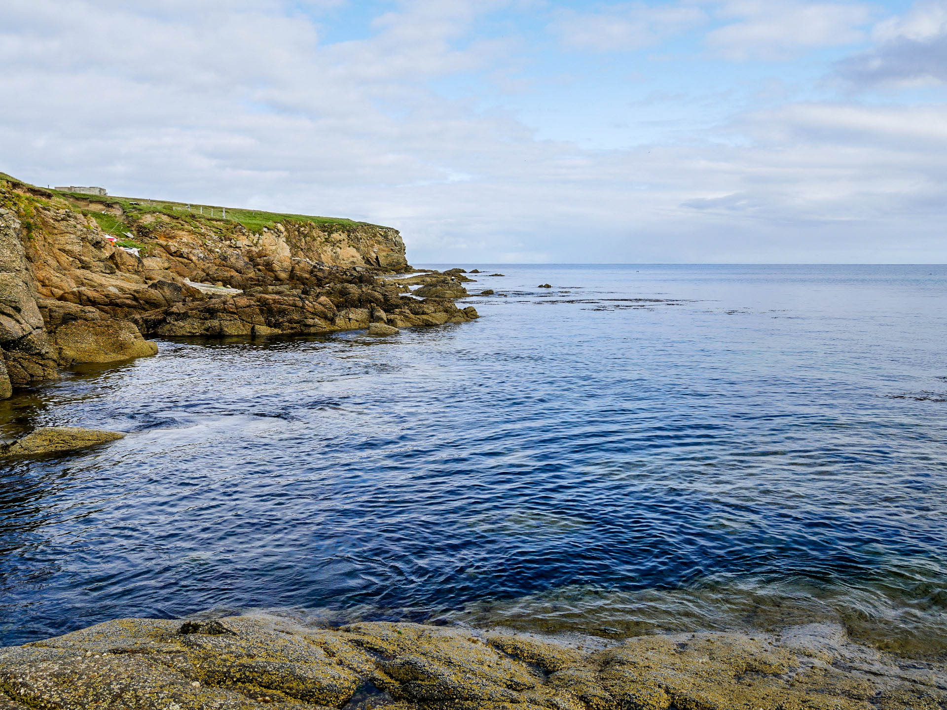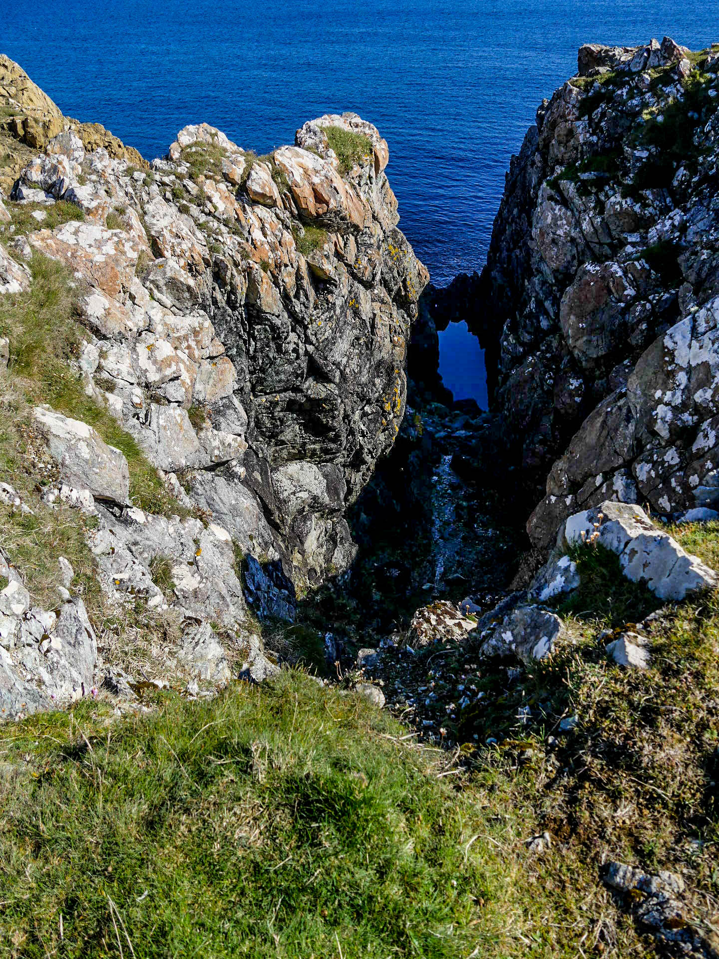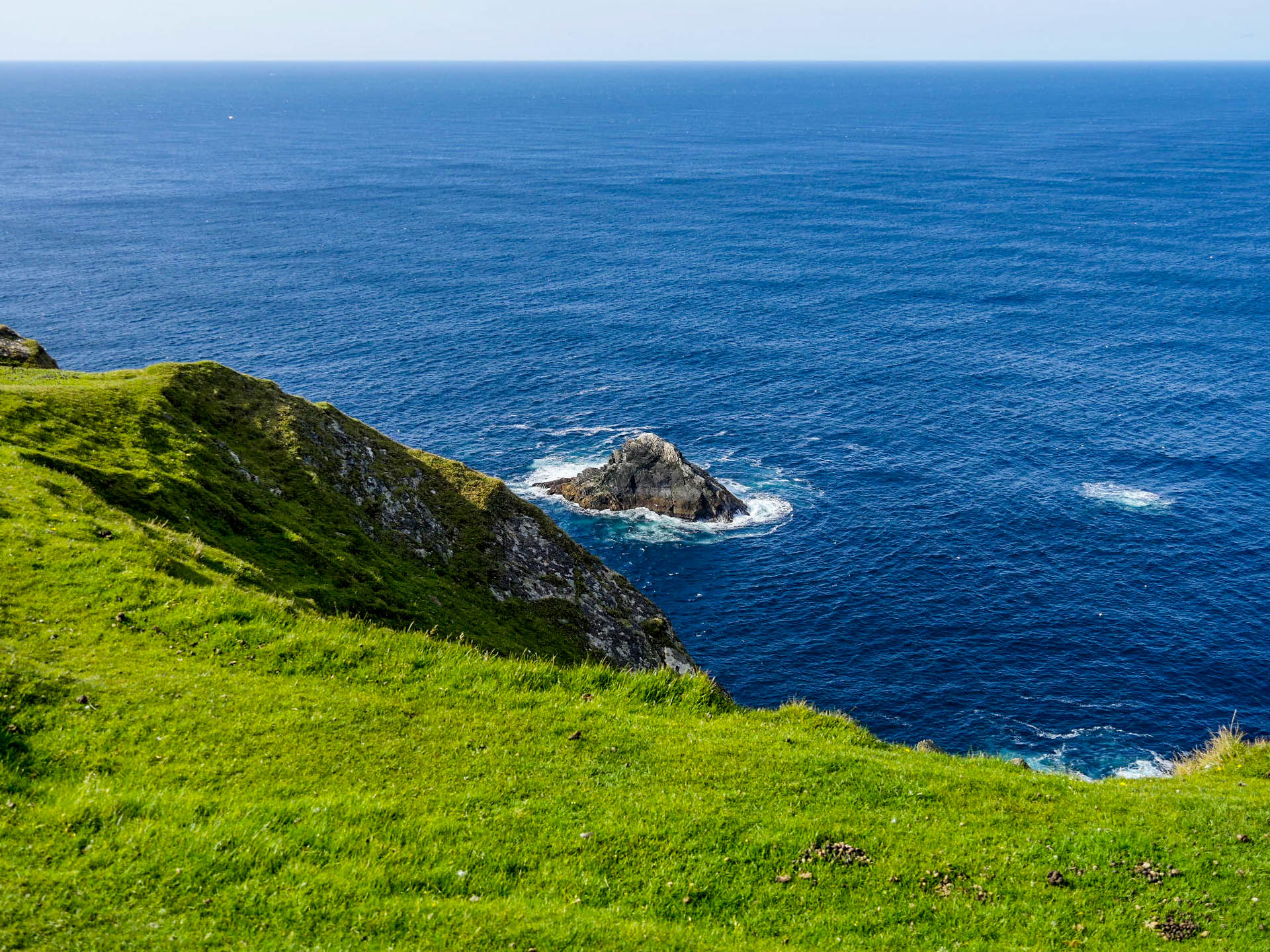 Nous laissons derrière nous la route principale pour nous lancer sur le sentier du Keen of Hamar Nature Preserve. On ne savait pas trop à quoi s’attendre. A première vue, la randonnée semblait sympa mais sans plus. Keen of Hamar a des particularités géologiques qui la rende unique aux Shetland, à la fois du point de vue du paysage que du point de vue de la flore. Il y pousse des plantes qu’on ne trouve pas ailleurs dans les îles, ni même ailleurs au Royaume-Uni (pas vraiment de chance pour nous, la fin de l’été était là, donc plus vraiment de fleurs). La montée vers la falaise se fait dans un paysage presque lunaire fait de débris serpentins. On dirait que les pierres coulent directement du haut de la falaise, comme si une rivière les avait charriées. Par contre, une fois arrivée en haut, c’est le grand spectacle : nous avons une vue superbe sur Balta Sound. Et en cette fin de matinée, les couleurs claquent : le bleu marine intense de la Mer du Nord, le blanc de la roche qui affleure, 36 nuances de vert, une série de falaises qui plongent dans l’eau… On ne s’attendait pas à ça.