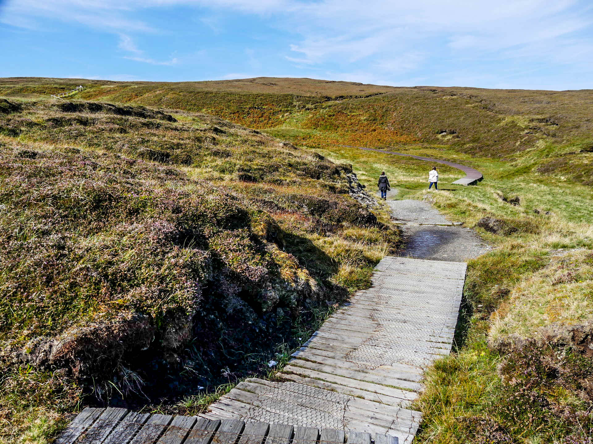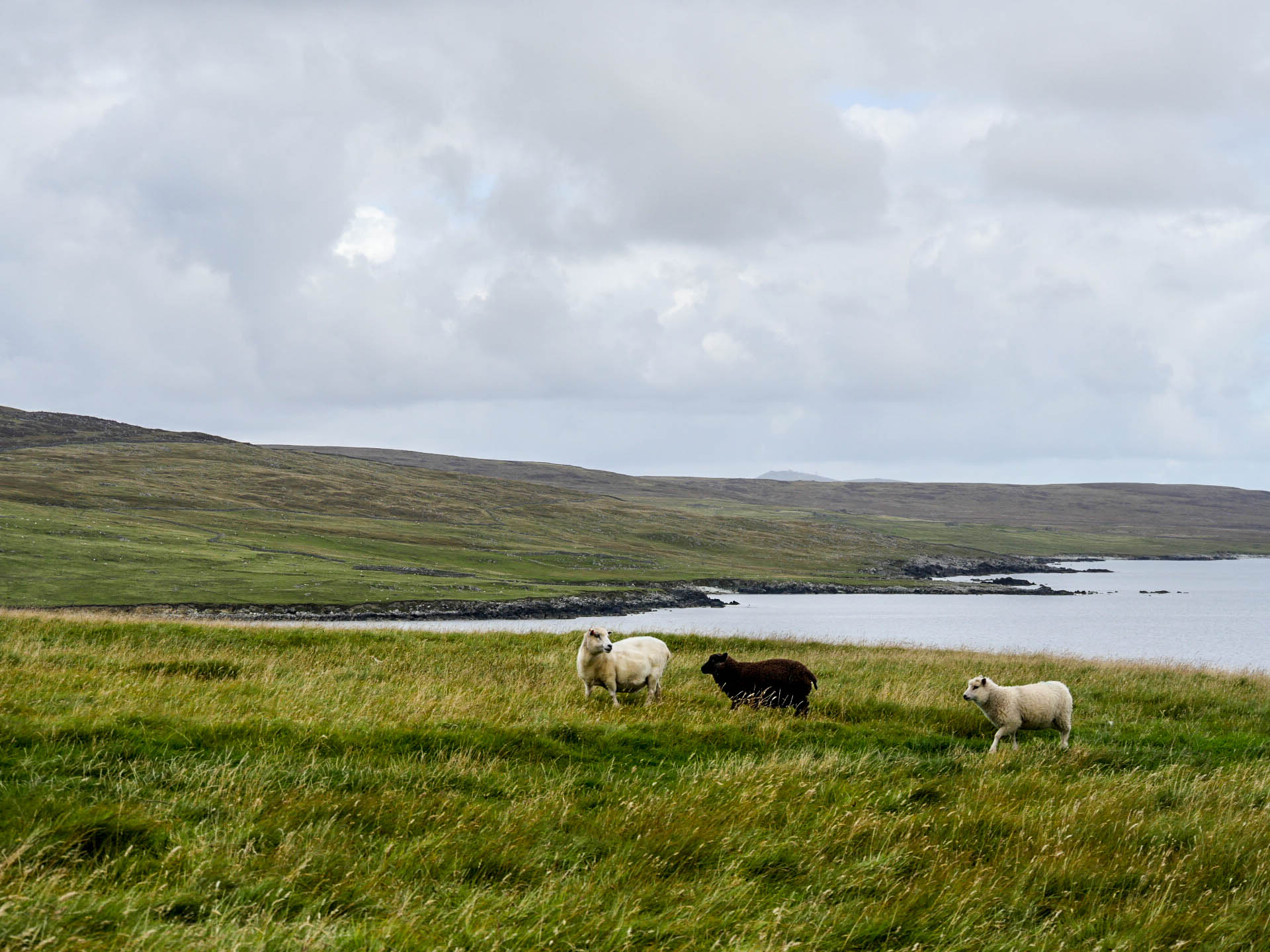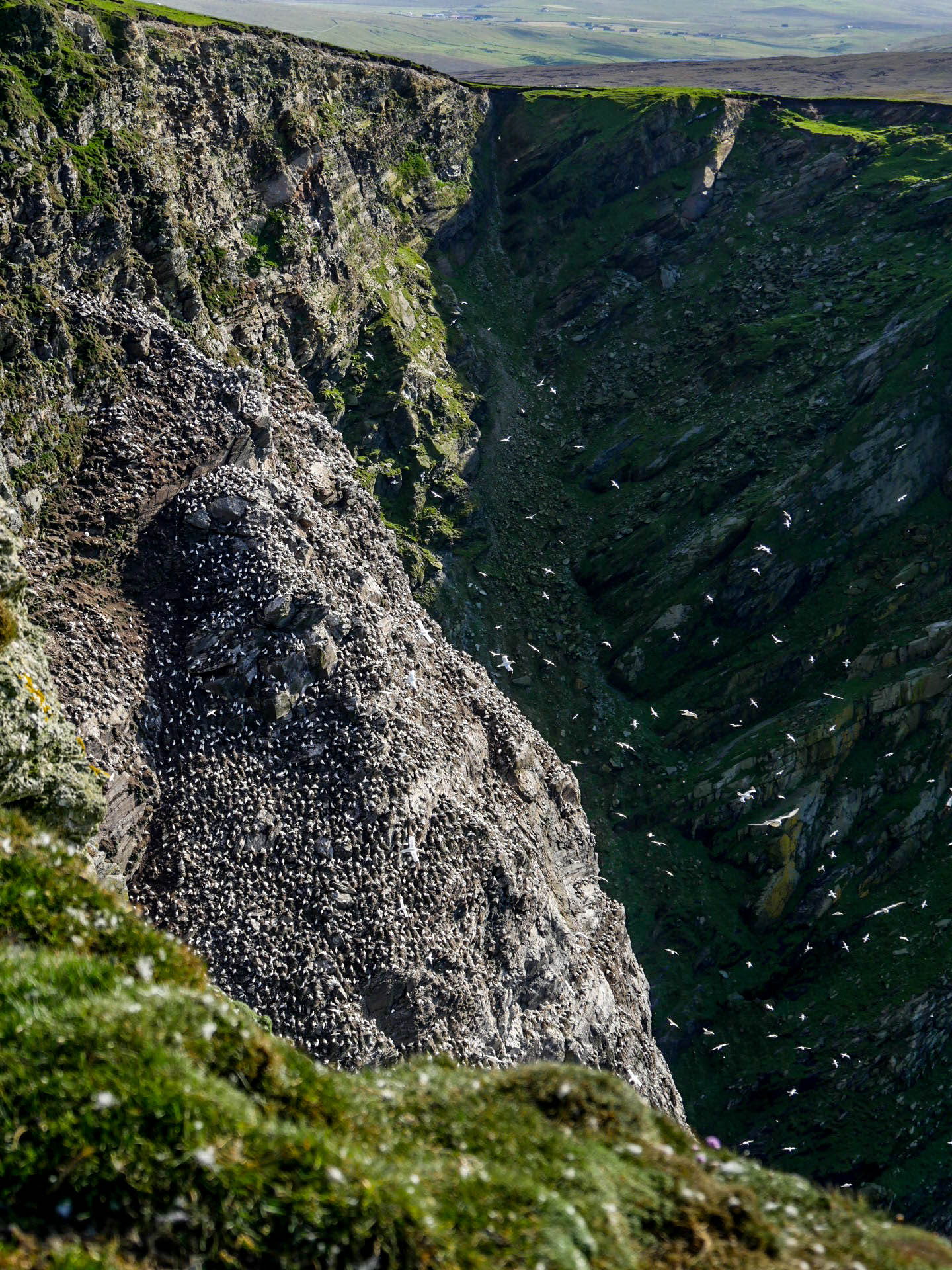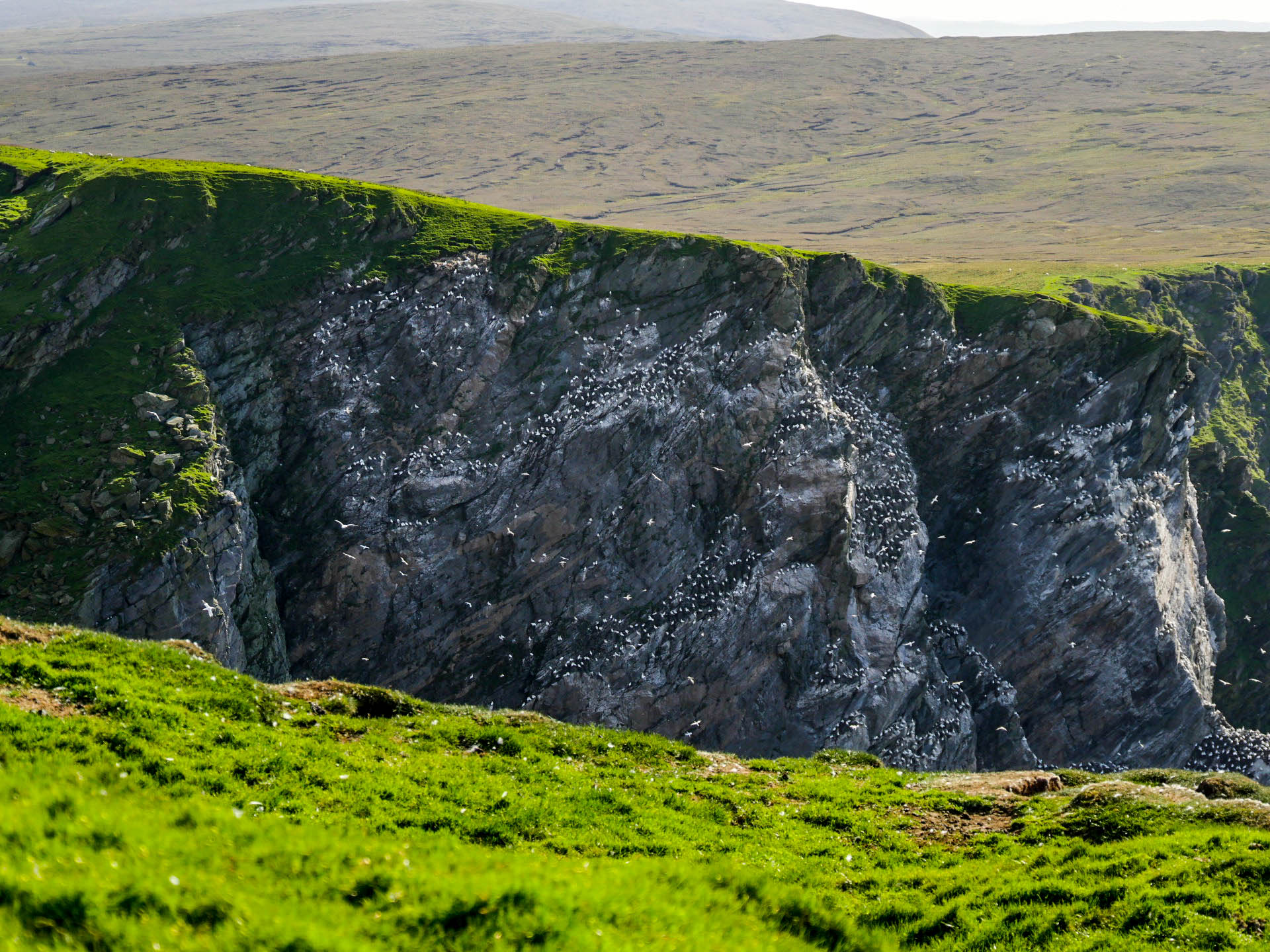 Hermaness National Nature Preserve est située tout au nord de Unst, ce coin isolé des Shetland est le paradis des oiseaux et une des plus belles randonnées (facile) des îles. On peut facilement y passer toute une après-midi. Hermaness étant une zone protégée, un sentier en caillebotis a été installé et il est absolument interdit de s’en éloigner puisque c’est une zone de ponte et de nidification pour les oiseaux. On suit donc le sentier qui monte inexorablement et on découvre le paysage. En tout cas, on a le temps de le découvrir car ce sentier prend une petite heure à parcourir. Attention, vers le sommet, vous croiserez des grands labbes. Ces grands oiseaux bruns sont du genre pas très sympathique et surveillent depuis le ciel les environs. Ils n’hésiteront pas à vous attaquer s’ils sentent que vous représentez une menace éventuelle. Autant être prévenu.e, Lectrice, Lecteur ! Enfin, après avoir bien grimpé, nous voilà sur un grand plateau vert où, surprise, paissent les moutons. Des moutons qui doivent avoir une des plus belles vues des Shetland. Trop #posey pour vos photos, ils se prêteront sans problèmes à toutes les prises de vue, du moment que vous restiez à une distance respectable. Outre les labbes, en été, vous trouverez les fameux macareux moines, des fulmars, des guillemots mais surtout, surtout, une énorme colonie de fous de Bassan. Ces grands oiseaux blancs à tête jaune et aux yeux bleus cerclés de noir ont la particularité d’être très grégaires et de nicher en très grand groupe sur des falaises mais Hermaness, il y a toute une mise en scène. On ne voit pas la colonie tout de suite. On suit le plateau sans trop se rendre compte qu’au détour d’une courbe, des oiseaux apparaissent, planant dans les airs. Puis, les cris titillent vos oreilles et enfin, votre nez est pris d’assaut par l’odeur des déjections et enfin, vos yeux contemplent un mur de roche constellés de milliers (de dizaines de milliers ?) de taches blanches : la colonie des fous. A force de visiteurs, un petit remblai s’est construit naturellement et vous pourrez vous y installer pour photographier à votre aise les oiseaux sans trop les embêter et en étant raisonnablement bien installé.e.