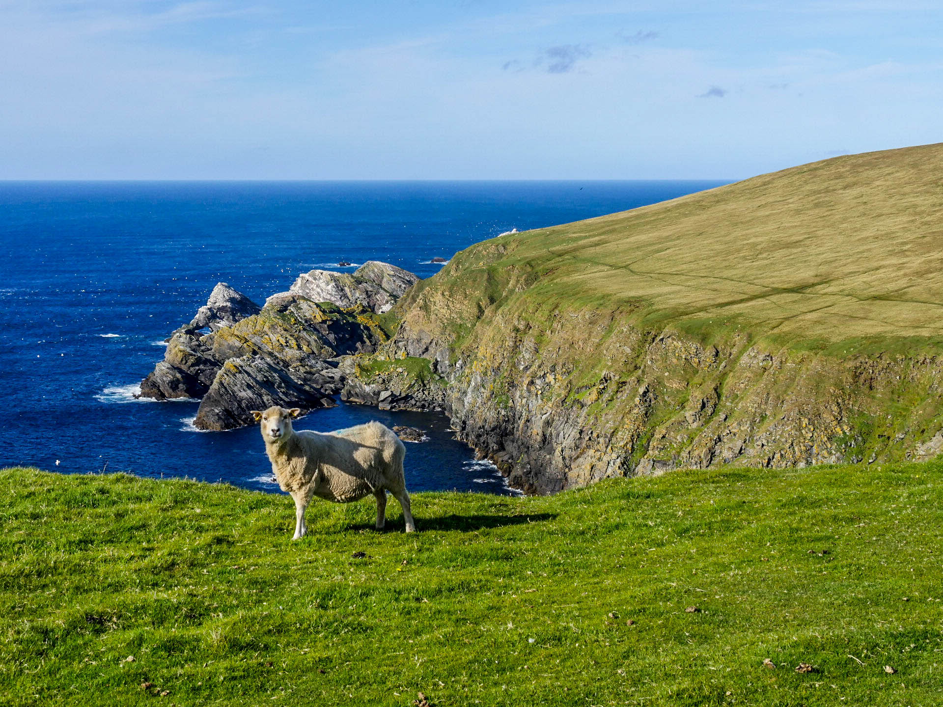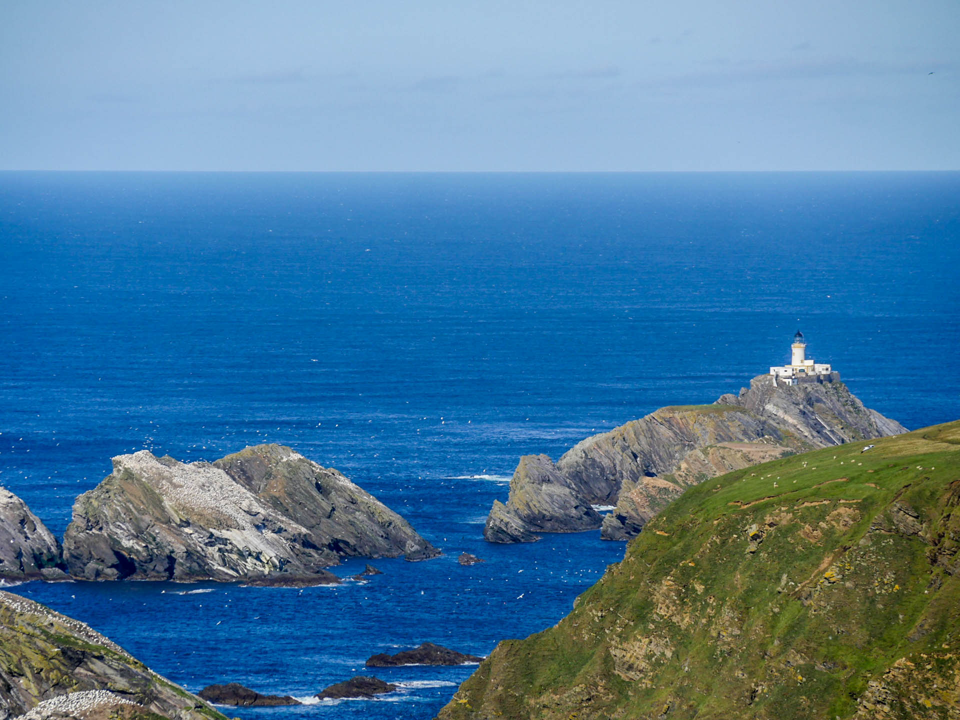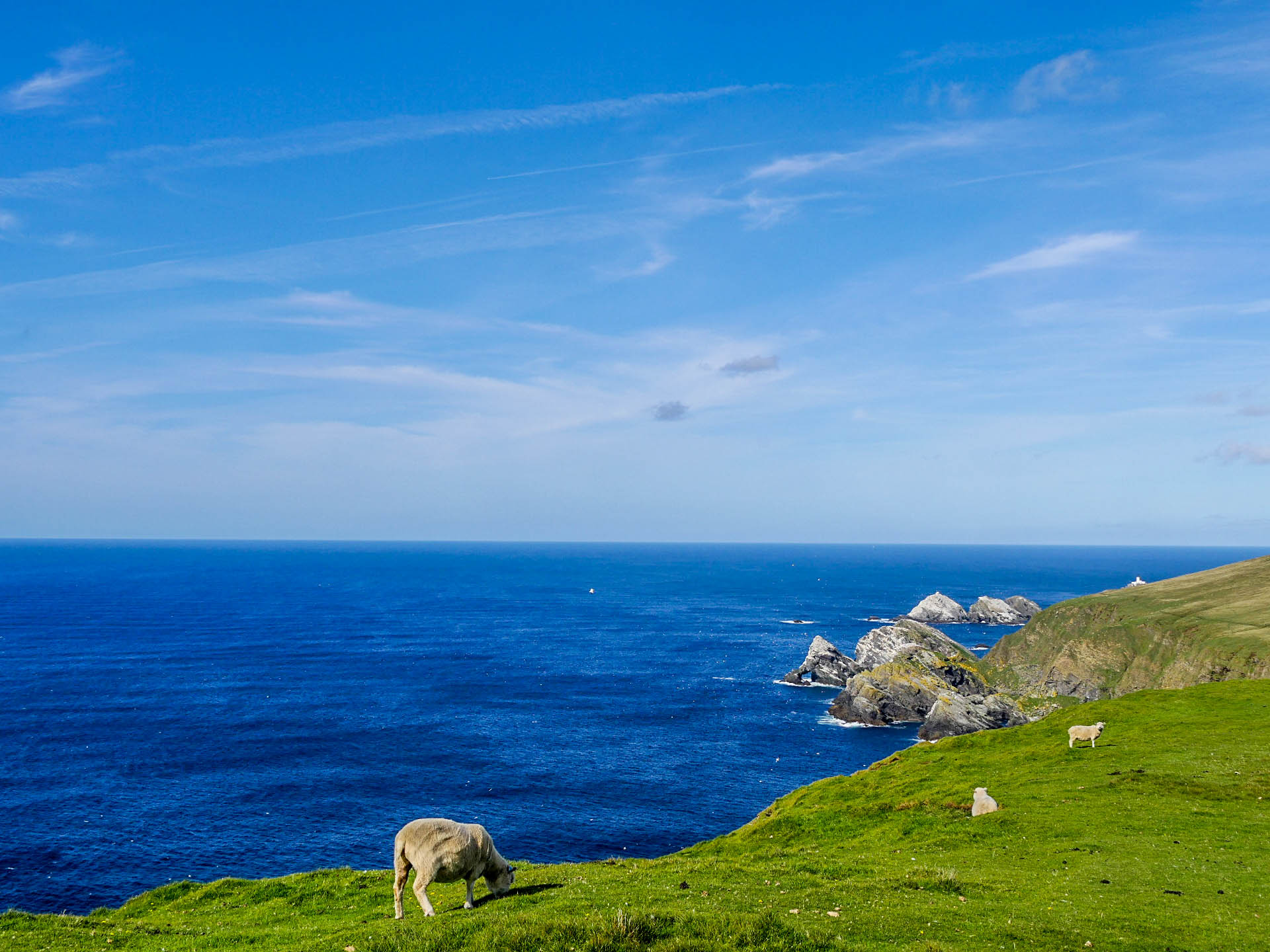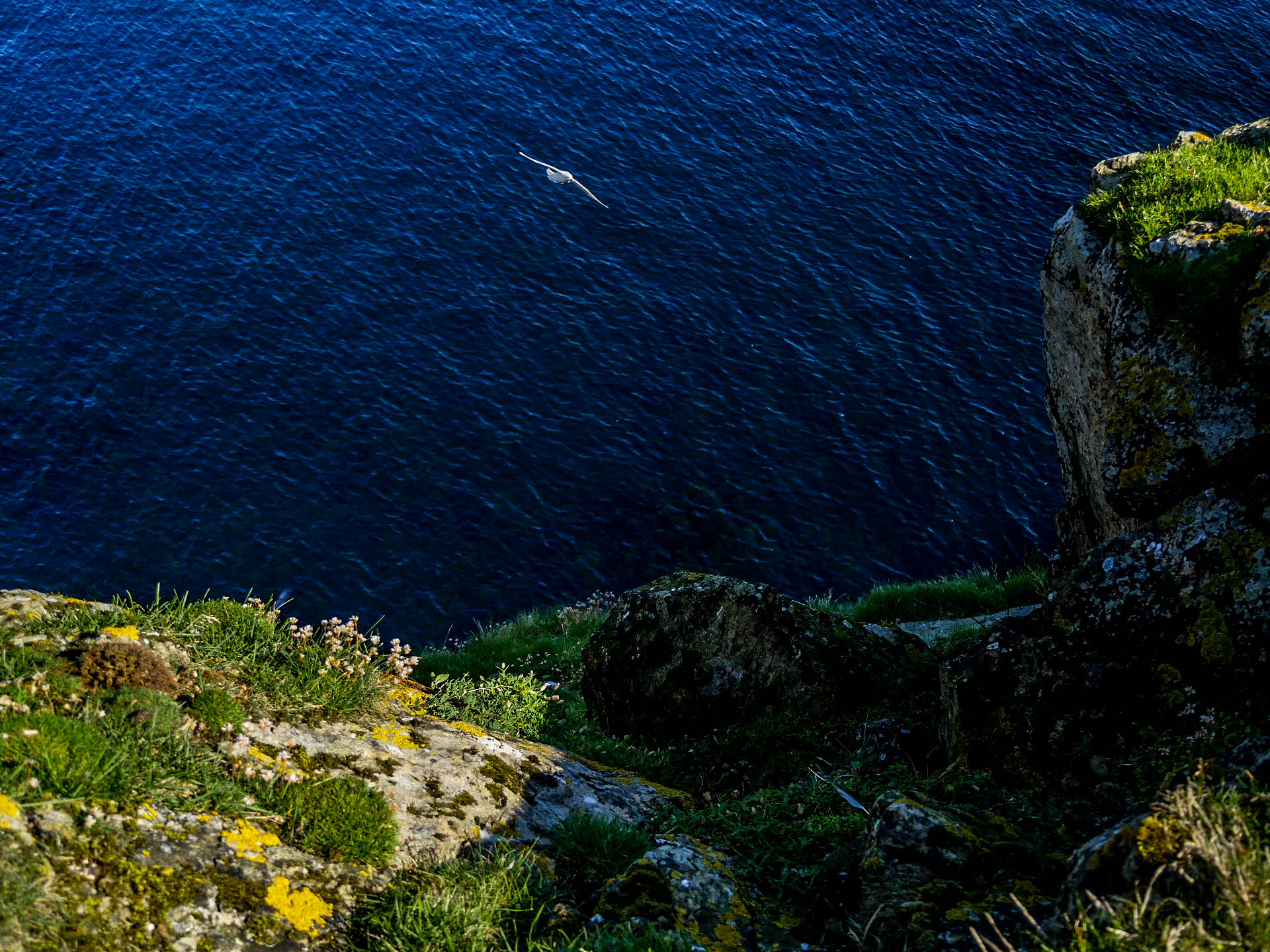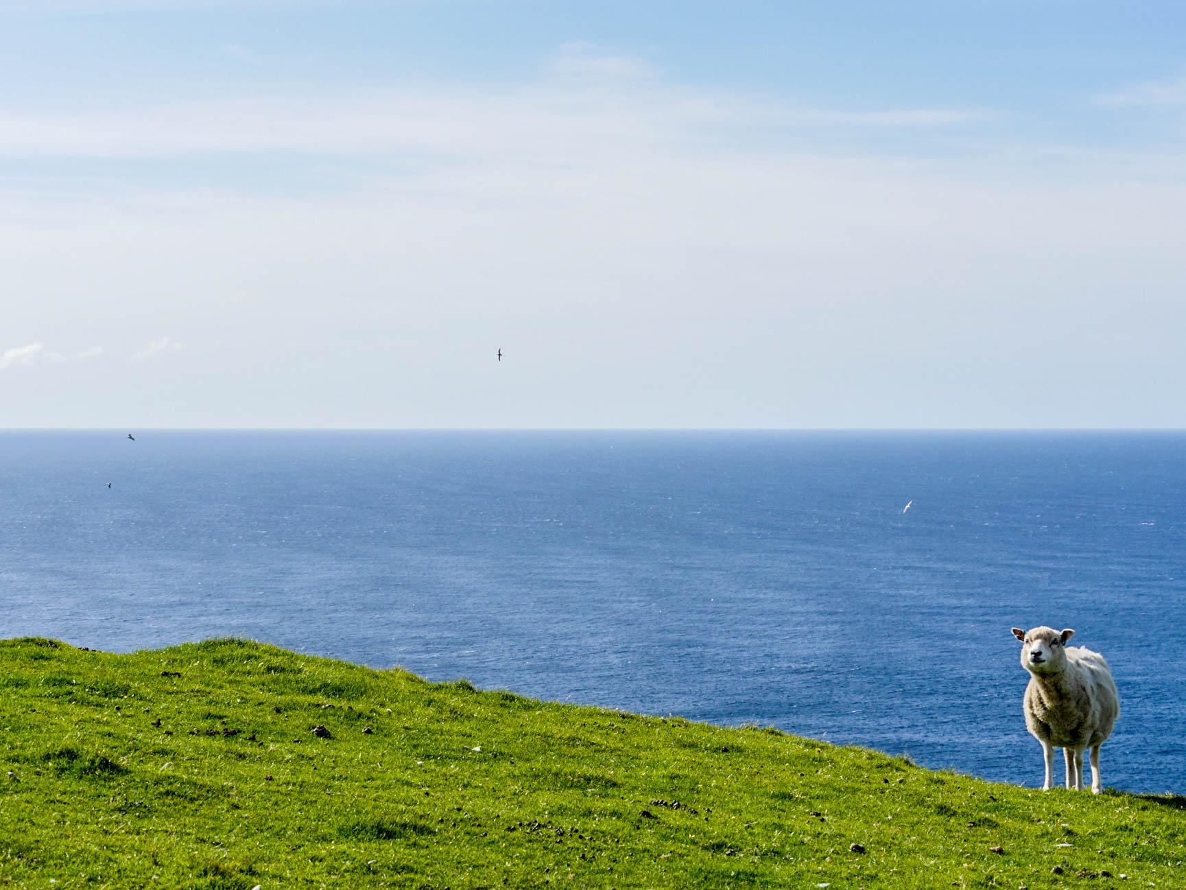 Hermaness National Nature Preserve est située tout au nord de Unst, ce coin isolé des Shetland est le paradis des oiseaux et une des plus belles randonnées (facile) des îles. On peut facilement y passer toute une après-midi. Hermaness étant une zone protégée, un sentier en caillebotis a été installé et il est absolument interdit de s’en éloigner puisque c’est une zone de ponte et de nidification pour les oiseaux. On suit donc le sentier qui monte inexorablement et on découvre le paysage. En tout cas, on a le temps de le découvrir car ce sentier prend une petite heure à parcourir. Attention, vers le sommet, vous croiserez des grands labbes. Ces grands oiseaux bruns sont du genre pas très sympathique et surveillent depuis le ciel les environs. Ils n’hésiteront pas à vous attaquer s’ils sentent que vous représentez une menace éventuelle. Autant être prévenu.e, Lectrice, Lecteur ! Enfin, après avoir bien grimpé, nous voilà sur un grand plateau vert où, surprise, paissent les moutons. Des moutons qui doivent avoir une des plus belles vues des Shetland. Trop #posey pour vos photos, ils se prêteront sans problèmes à toutes les prises de vue, du moment que vous restiez à une distance respectable. Outre les labbes, en été, vous trouverez les fameux macareux moines, des fulmars, des guillemots mais surtout, surtout, une énorme colonie de fous de Bassan. Ces grands oiseaux blancs à tête jaune et aux yeux bleus cerclés de noir ont la particularité d’être très grégaires et de nicher en très grand groupe sur des falaises mais Hermaness, il y a toute une mise en scène. On ne voit pas la colonie tout de suite. On suit le plateau sans trop se rendre compte qu’au détour d’une courbe, des oiseaux apparaissent, planant dans les airs. Puis, les cris titillent vos oreilles et enfin, votre nez est pris d’assaut par l’odeur des déjections et enfin, vos yeux contemplent un mur de roche constellés de milliers (de dizaines de milliers ?) de taches blanches : la colonie des fous. A force de visiteurs, un petit remblai s’est construit naturellement et vous pourrez vous y installer pour photographier à votre aise les oiseaux sans trop les embêter et en étant raisonnablement bien installé.e.