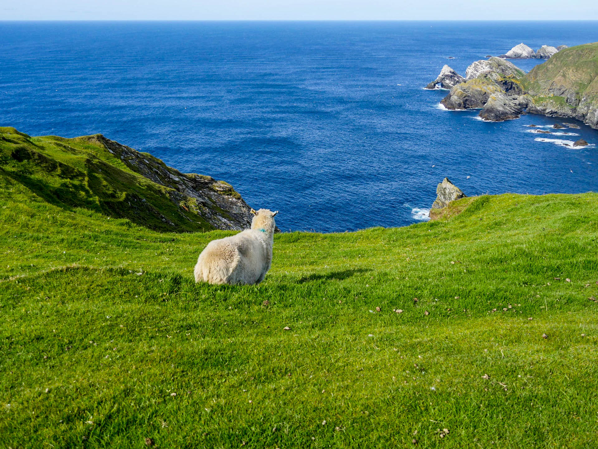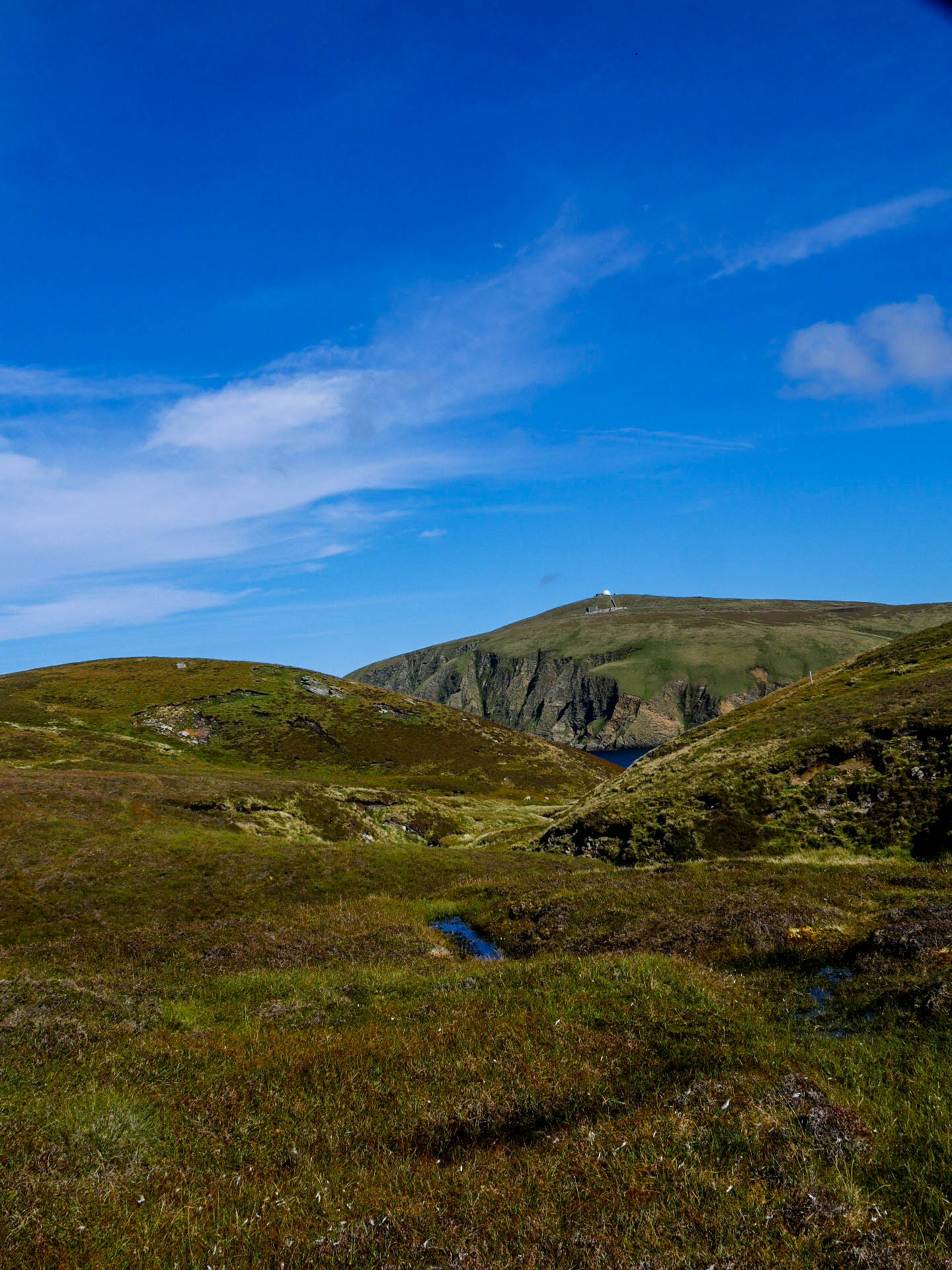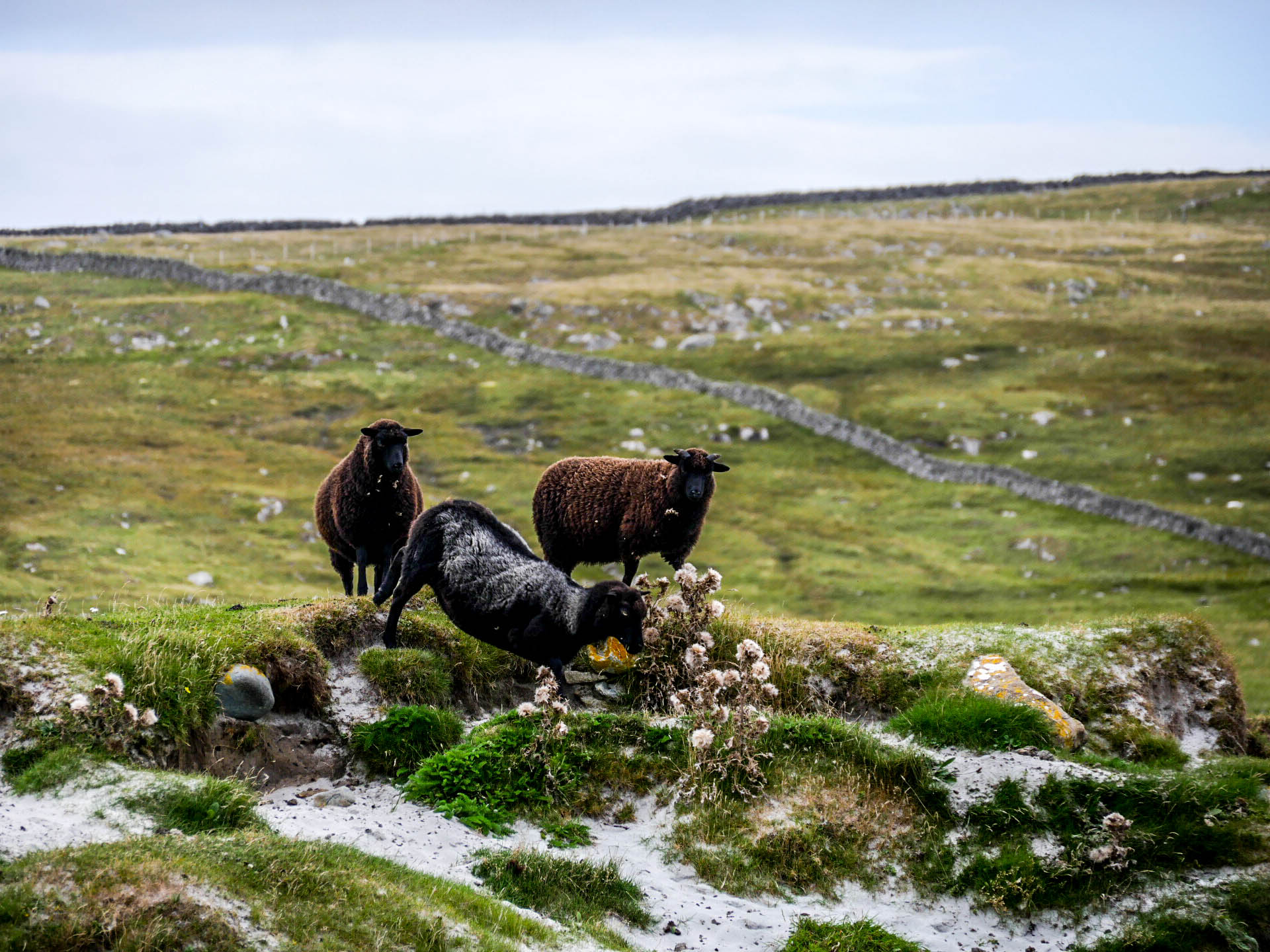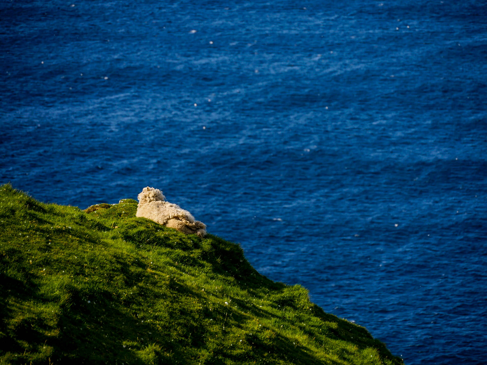 Hermaness National Nature Preserve est située tout au nord de Unst, ce coin isolé des Shetland est le paradis des oiseaux et une des plus belles randonnées (facile) des îles. On peut facilement y passer toute une après-midi. Hermaness étant une zone protégée, un sentier en caillebotis a été installé et il est absolument interdit de s’en éloigner puisque c’est une zone de ponte et de nidification pour les oiseaux. On suit donc le sentier qui monte inexorablement et on découvre le paysage. En tout cas, on a le temps de le découvrir car ce sentier prend une petite heure à parcourir. Attention, vers le sommet, vous croiserez des grands labbes. Ces grands oiseaux bruns sont du genre pas très sympathique et surveillent depuis le ciel les environs. Ils n’hésiteront pas à vous attaquer s’ils sentent que vous représentez une menace éventuelle. Autant être prévenu.e, Lectrice, Lecteur ! Enfin, après avoir bien grimpé, nous voilà sur un grand plateau vert où, surprise, paissent les moutons. Des moutons qui doivent avoir une des plus belles vues des Shetland. Trop #posey pour vos photos, ils se prêteront sans problèmes à toutes les prises de vue, du moment que vous restiez à une distance respectable. Outre les labbes, en été, vous trouverez les fameux macareux moines, des fulmars, des guillemots mais surtout, surtout, une énorme colonie de fous de Bassan. Ces grands oiseaux blancs à tête jaune et aux yeux bleus cerclés de noir ont la particularité d’être très grégaires et de nicher en très grand groupe sur des falaises mais Hermaness, il y a toute une mise en scène. On ne voit pas la colonie tout de suite. On suit le plateau sans trop se rendre compte qu’au détour d’une courbe, des oiseaux apparaissent, planant dans les airs. Puis, les cris titillent vos oreilles et enfin, votre nez est pris d’assaut par l’odeur des déjections et enfin, vos yeux contemplent un mur de roche constellés de milliers (de dizaines de milliers ?) de taches blanches : la colonie des fous. A force de visiteurs, un petit remblai s’est construit naturellement et vous pourrez vous y installer pour photographier à votre aise les oiseaux sans trop les embêter et en étant raisonnablement bien installé.e.