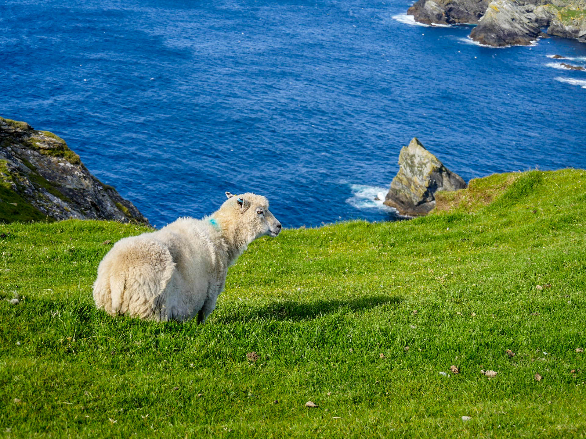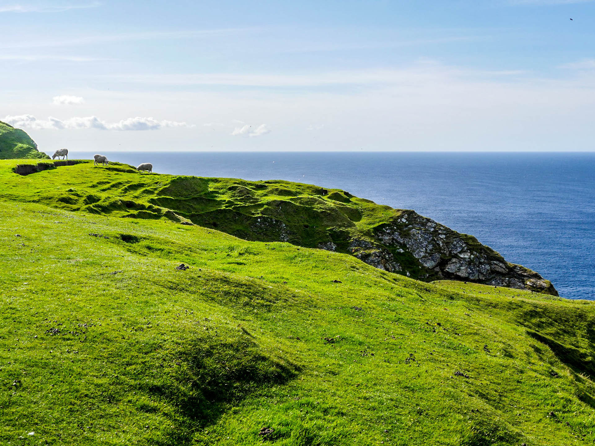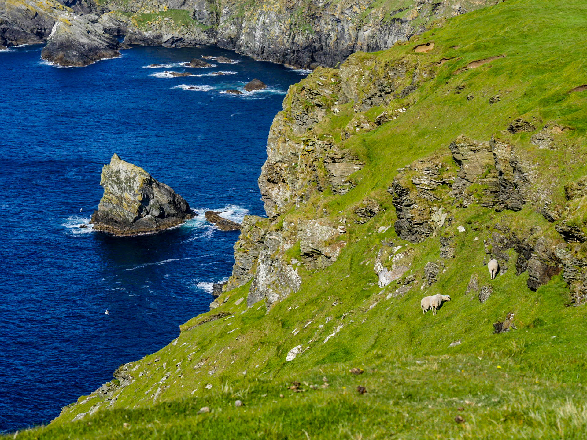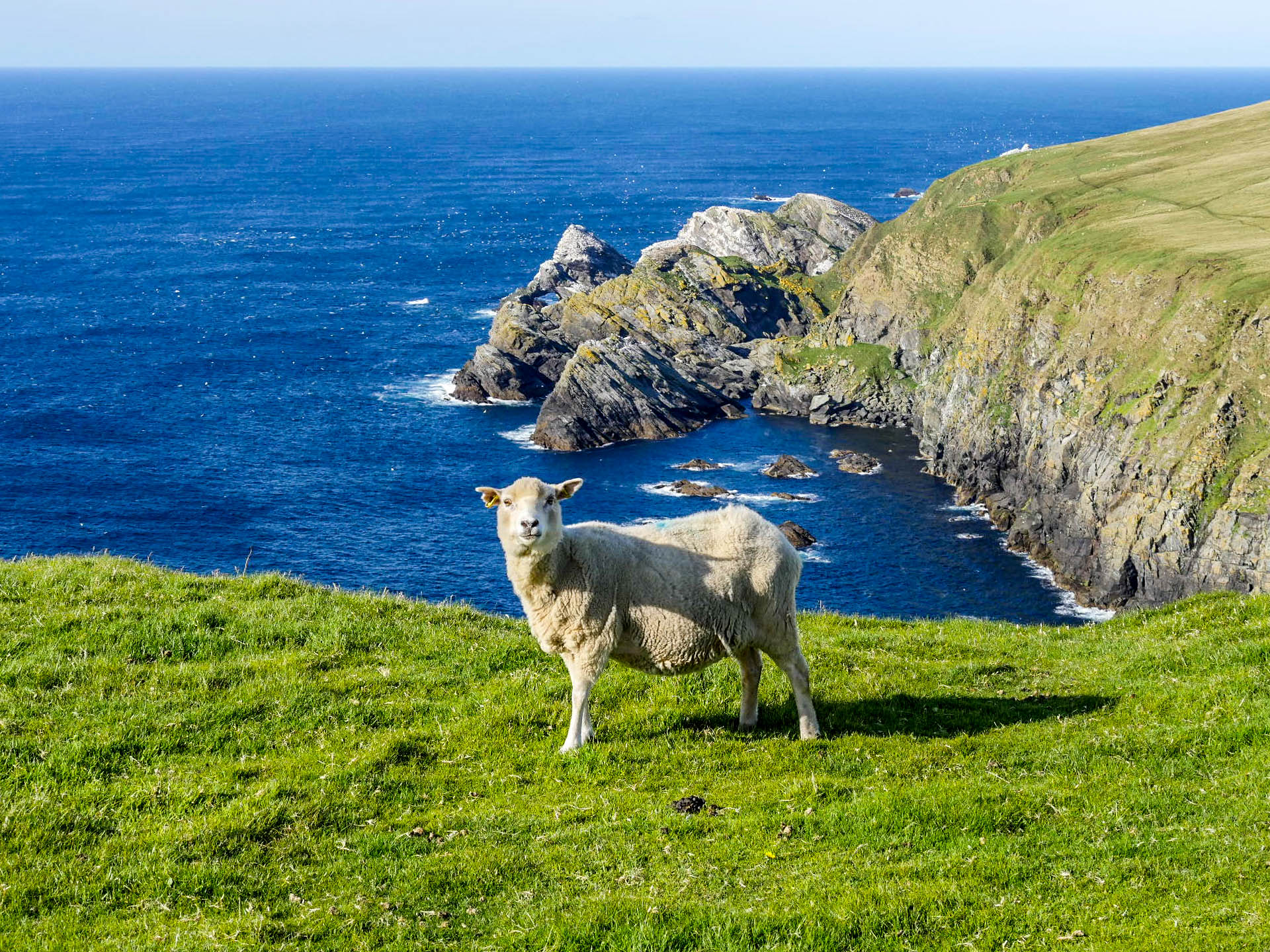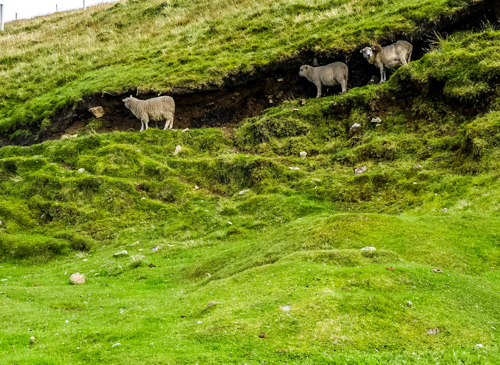 Hermaness National Nature Preserve est située tout au nord de Unst, ce coin isolé des Shetland est le paradis des oiseaux et une des plus belles randonnées (facile) des îles. On peut facilement y passer toute une après-midi. Hermaness étant une zone protégée, un sentier en caillebotis a été installé et il est absolument interdit de s’en éloigner puisque c’est une zone de ponte et de nidification pour les oiseaux. On suit donc le sentier qui monte inexorablement et on découvre le paysage. En tout cas, on a le temps de le découvrir car ce sentier prend une petite heure à parcourir. Attention, vers le sommet, vous croiserez des grands labbes. Ces grands oiseaux bruns sont du genre pas très sympathique et surveillent depuis le ciel les environs. Ils n’hésiteront pas à vous attaquer s’ils sentent que vous représentez une menace éventuelle. Autant être prévenu.e, Lectrice, Lecteur ! Enfin, après avoir bien grimpé, nous voilà sur un grand plateau vert où, surprise, paissent les moutons. Des moutons qui doivent avoir une des plus belles vues des Shetland. Trop #posey pour vos photos, ils se prêteront sans problèmes à toutes les prises de vue, du moment que vous restiez à une distance respectable. Outre les labbes, en été, vous trouverez les fameux macareux moines, des fulmars, des guillemots mais surtout, surtout, une énorme colonie de fous de Bassan. Ces grands oiseaux blancs à tête jaune et aux yeux bleus cerclés de noir ont la particularité d’être très grégaires et de nicher en très grand groupe sur des falaises mais Hermaness, il y a toute une mise en scène. On ne voit pas la colonie tout de suite. On suit le plateau sans trop se rendre compte qu’au détour d’une courbe, des oiseaux apparaissent, planant dans les airs. Puis, les cris titillent vos oreilles et enfin, votre nez est pris d’assaut par l’odeur des déjections et enfin, vos yeux contemplent un mur de roche constellés de milliers (de dizaines de milliers ?) de taches blanches : la colonie des fous. A force de visiteurs, un petit remblai s’est construit naturellement et vous pourrez vous y installer pour photographier à votre aise les oiseaux sans trop les embêter et en étant raisonnablement bien installé.e.
