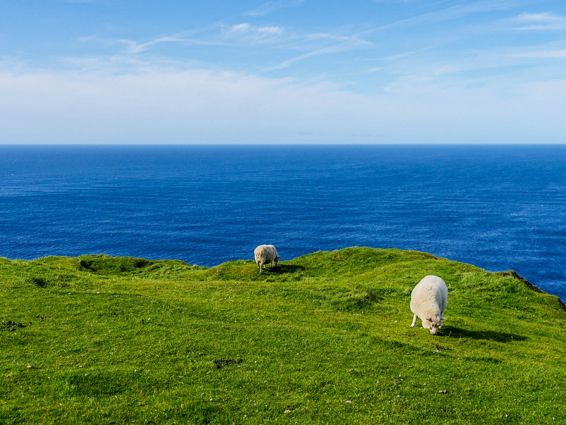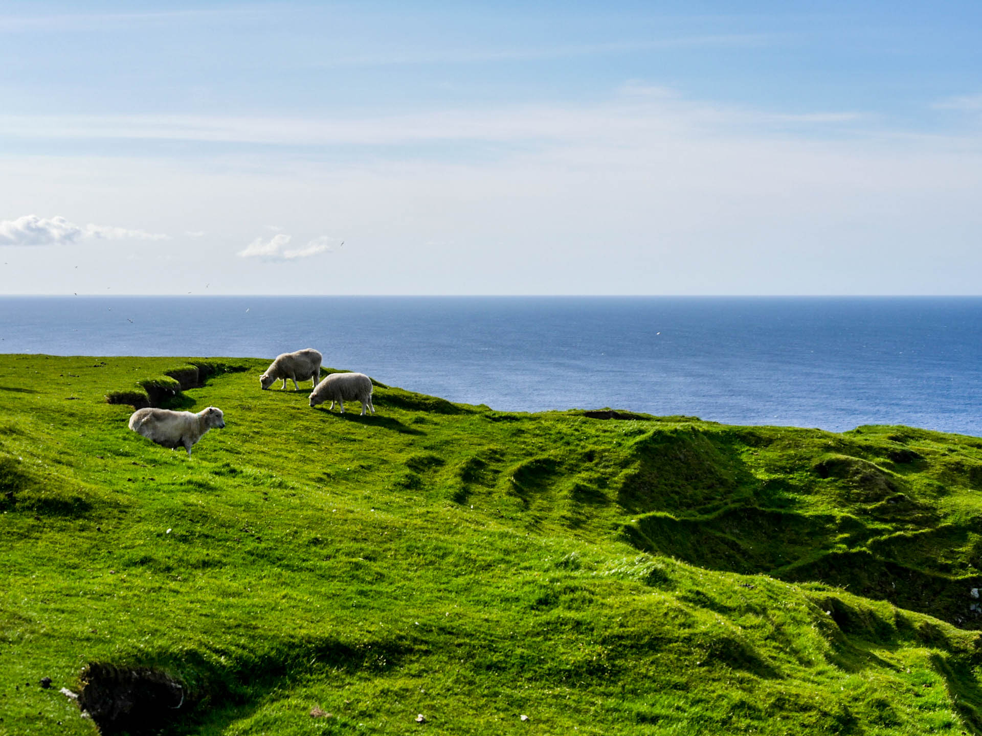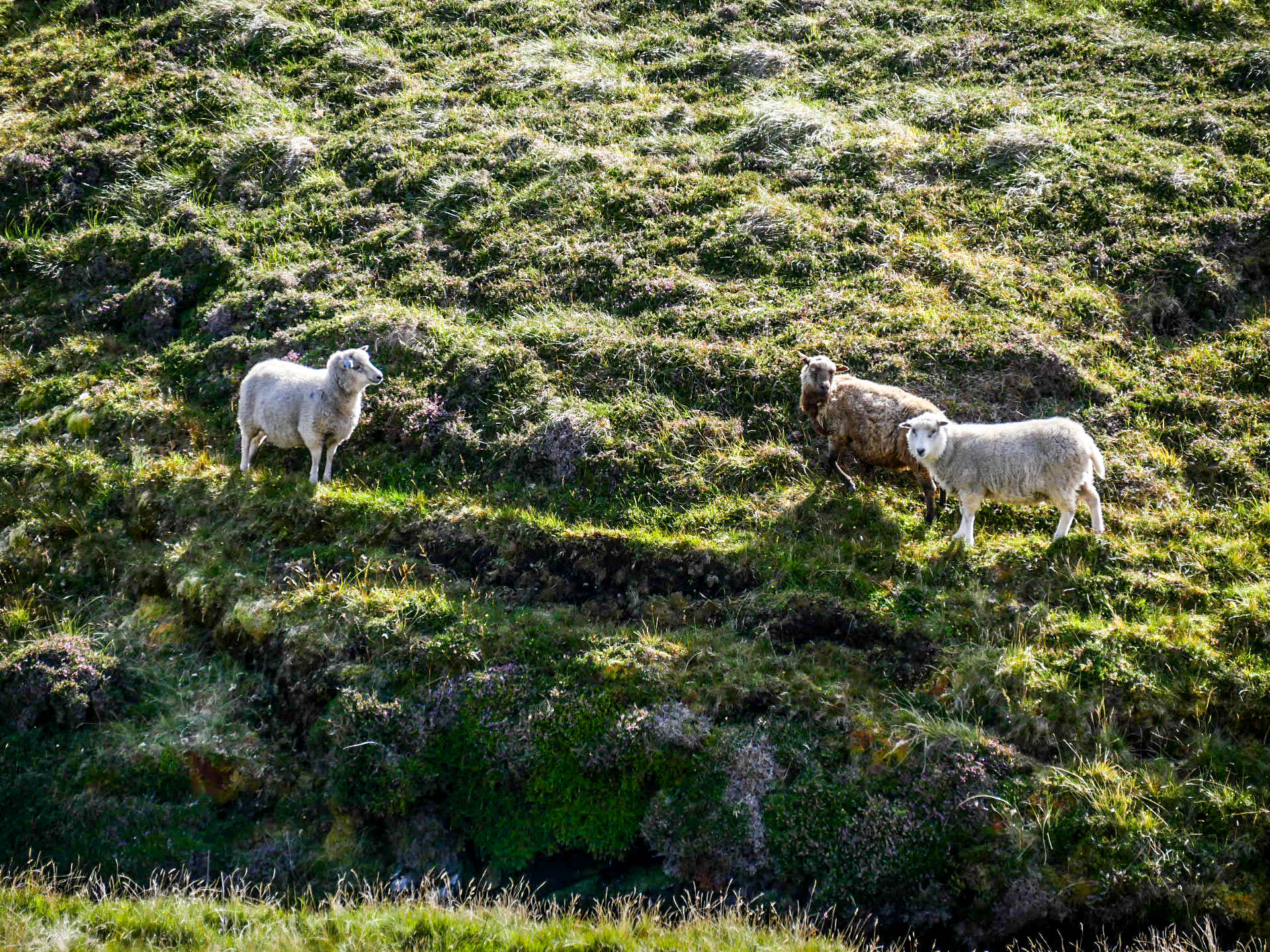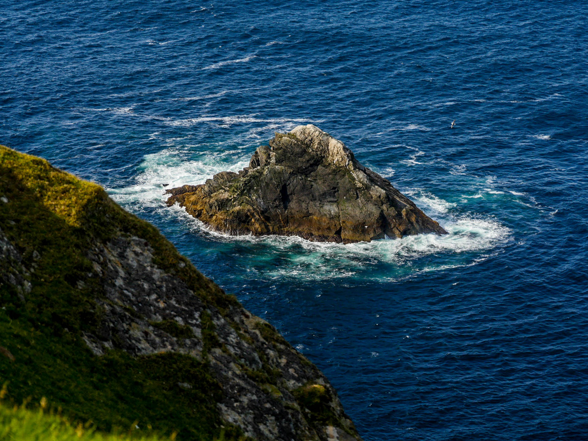 Hermaness National Nature Preserve est située tout au nord de Unst, ce coin isolé des Shetland est le paradis des oiseaux et une des plus belles randonnées (facile) des îles. On peut facilement y passer toute une après-midi. Hermaness étant une zone protégée, un sentier en caillebotis a été installé et il est absolument interdit de s’en éloigner puisque c’est une zone de ponte et de nidification pour les oiseaux. On suit donc le sentier qui monte inexorablement et on découvre le paysage. En tout cas, on a le temps de le découvrir car ce sentier prend une petite heure à parcourir. Attention, vers le sommet, vous croiserez des grands labbes. Ces grands oiseaux bruns sont du genre pas très sympathique et surveillent depuis le ciel les environs. Ils n’hésiteront pas à vous attaquer s’ils sentent que vous représentez une menace éventuelle. Autant être prévenu.e, Lectrice, Lecteur ! Enfin, après avoir bien grimpé, nous voilà sur un grand plateau vert où, surprise, paissent les moutons. Des moutons qui doivent avoir une des plus belles vues des Shetland. Trop #posey pour vos photos, ils se prêteront sans problèmes à toutes les prises de vue, du moment que vous restiez à une distance respectable. Outre les labbes, en été, vous trouverez les fameux macareux moines, des fulmars, des guillemots mais surtout, surtout, une énorme colonie de fous de Bassan. Ces grands oiseaux blancs à tête jaune et aux yeux bleus cerclés de noir ont la particularité d’être très grégaires et de nicher en très grand groupe sur des falaises mais Hermaness, il y a toute une mise en scène. On ne voit pas la colonie tout de suite. On suit le plateau sans trop se rendre compte qu’au détour d’une courbe, des oiseaux apparaissent, planant dans les airs. Puis, les cris titillent vos oreilles et enfin, votre nez est pris d’assaut par l’odeur des déjections et enfin, vos yeux contemplent un mur de roche constellés de milliers (de dizaines de milliers ?) de taches blanches : la colonie des fous. A force de visiteurs, un petit remblai s’est construit naturellement et vous pourrez vous y installer pour photographier à votre aise les oiseaux sans trop les embêter et en étant raisonnablement bien installé.e.