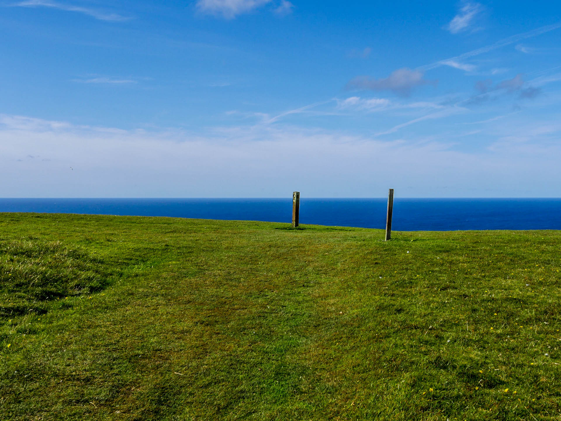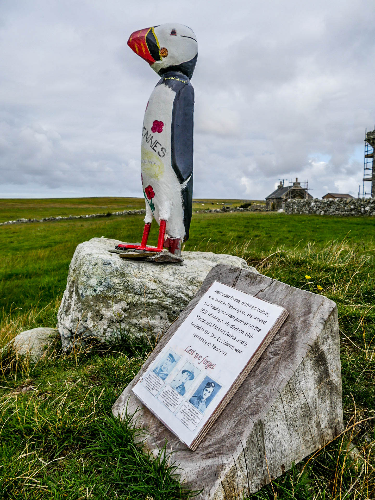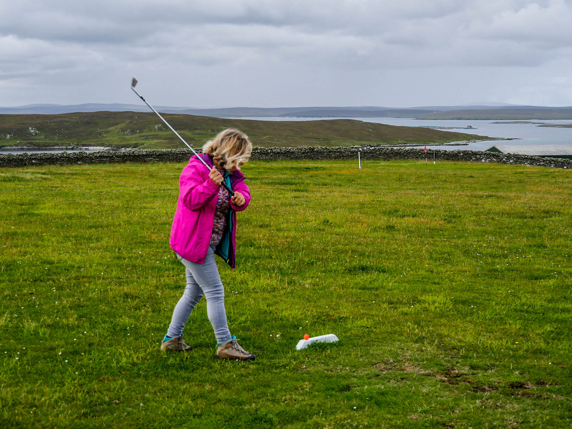 C’est d’ailleurs le château que nous allons voir en premier : Muness Castle est une ruine mais relativement en bon état et d’ailleurs, des rénovations sont en cours puisque le château est couvert d’échafaudages. Une drôle de sculpture en forme de macareux monte la garde devant : il s’agit en fait d’un hommage aux soldats de Unst morts pendant la Première Guerre Mondiale. Avant d’y arriver, nous avons eu l’occasion de voir quelques pierres dressées, mais aussi, de se faire quelques trous dans un golf tout proche. Il suffit de se servir, les clubs, tees et balles sont à disposition. Cool, non ? L’occasion pour moi de démontrer la grâce et la dextérité de mon swing. Ou pas.