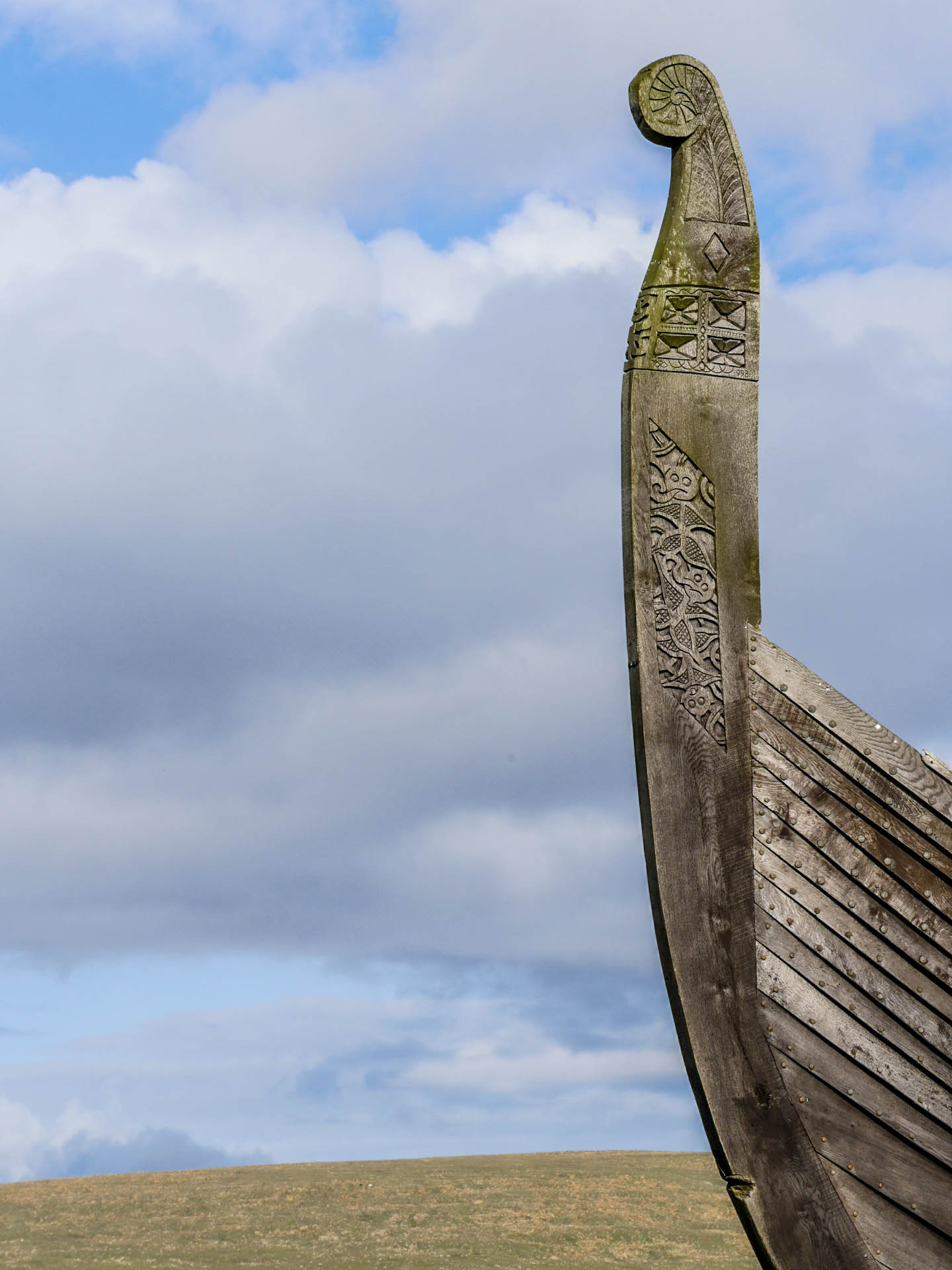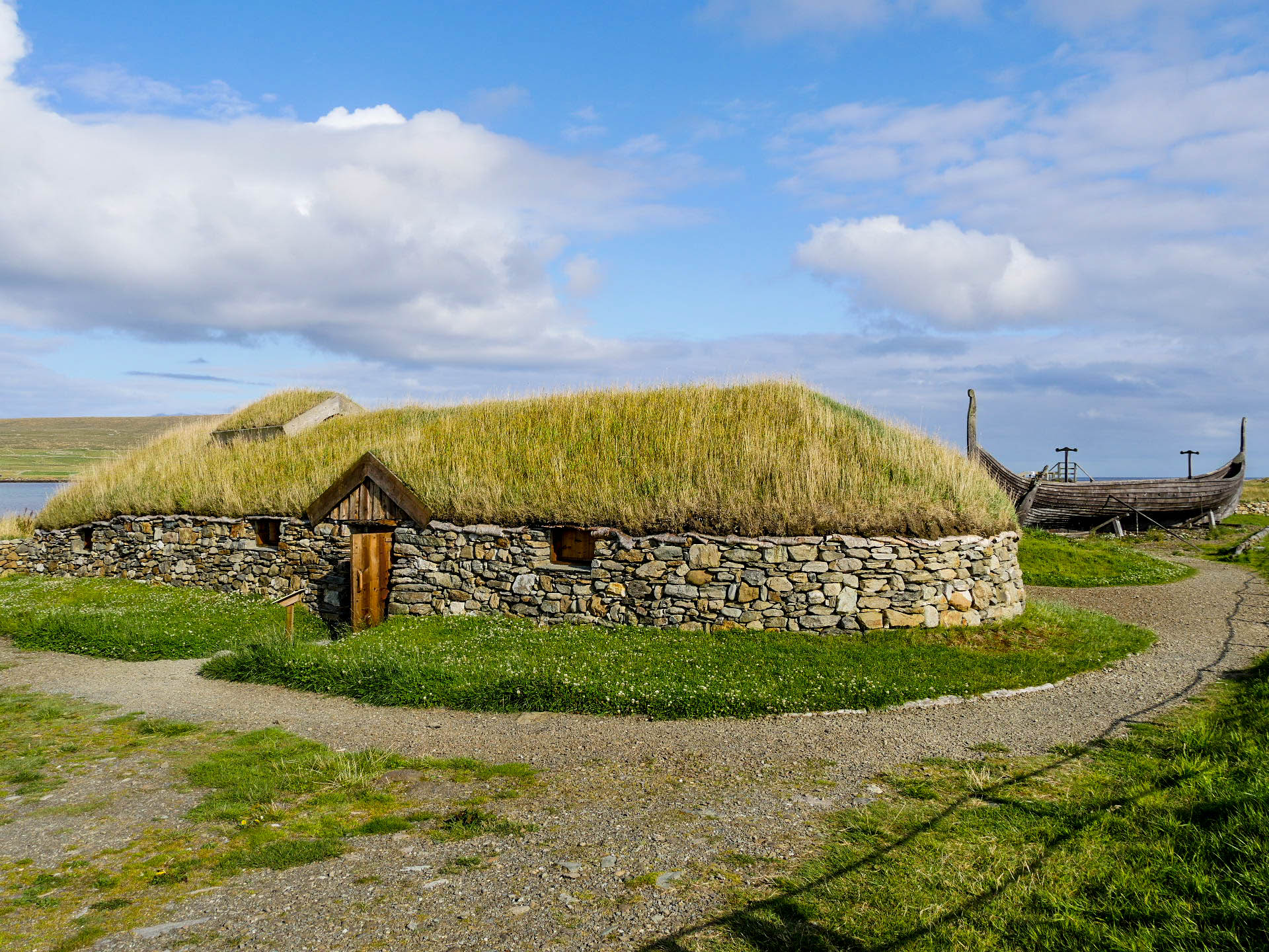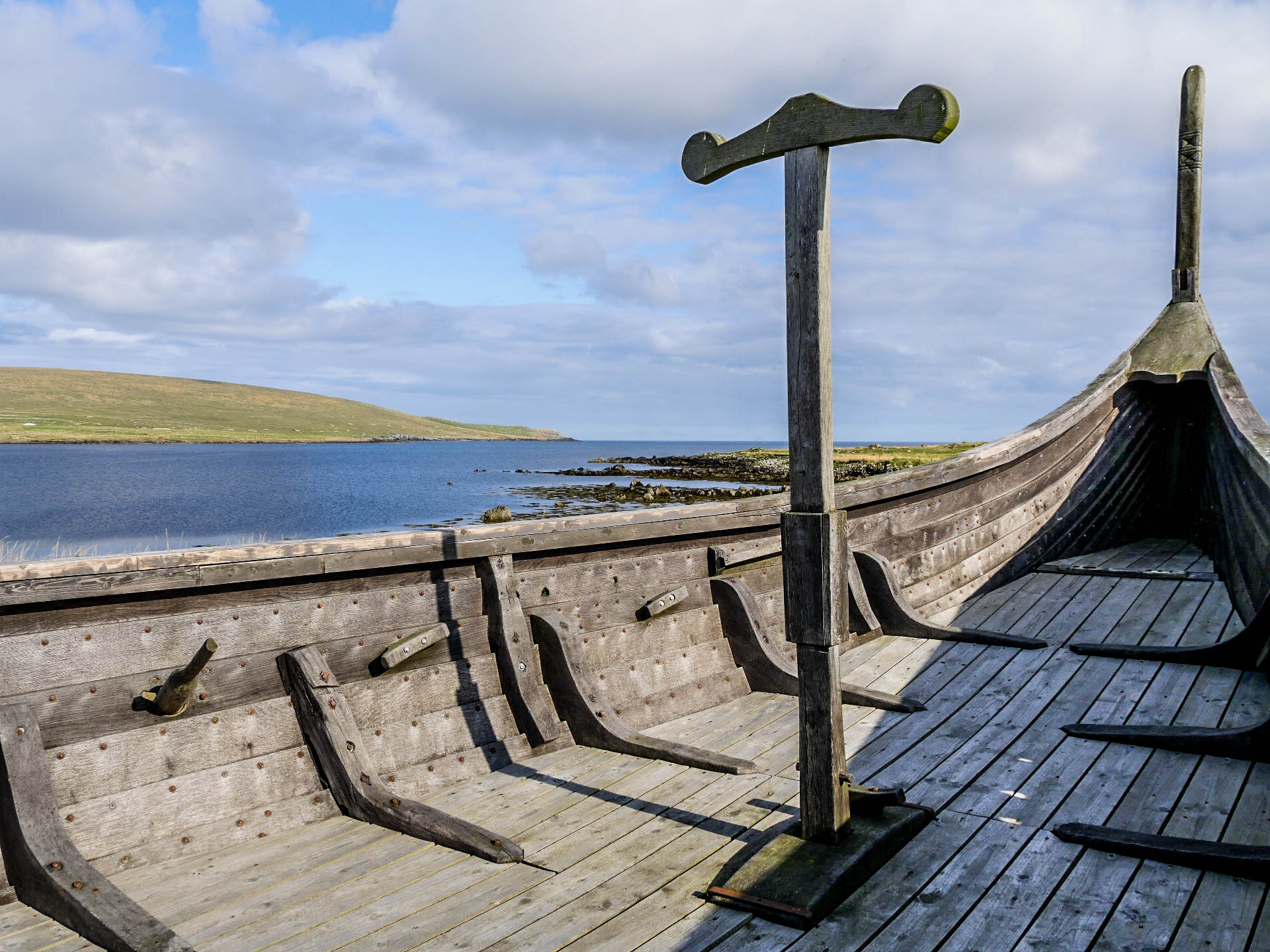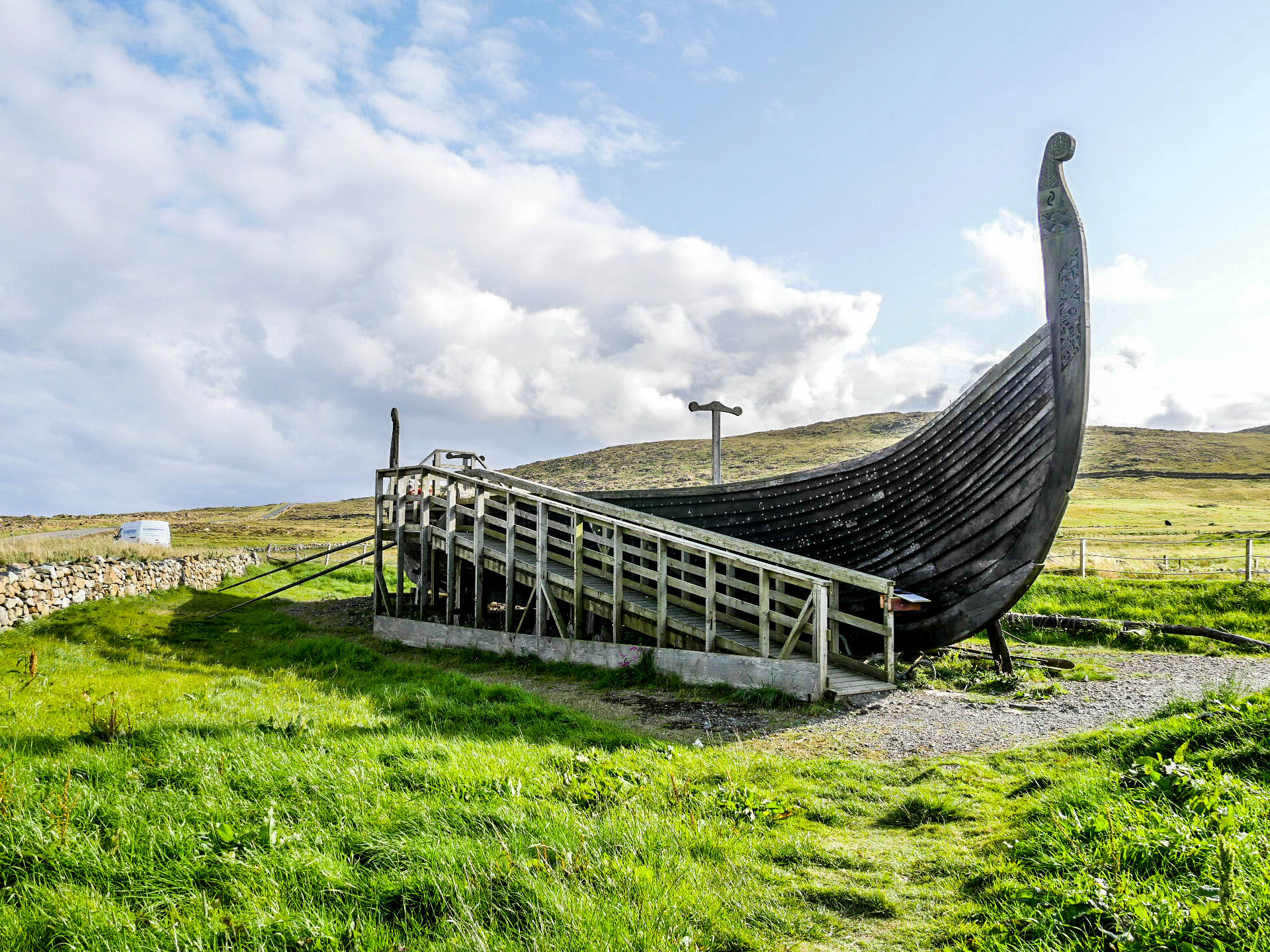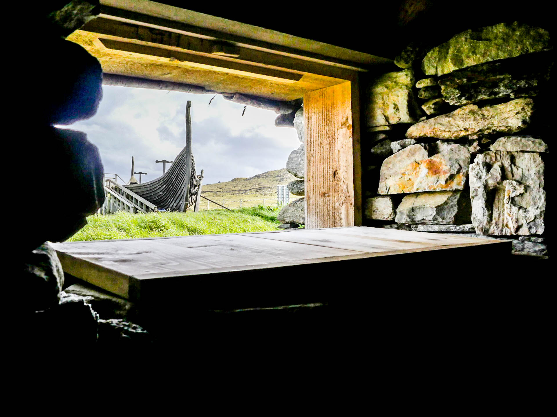 De l’autre côté de la petite baie, un bateau viking se tient à quai : c’est le Unst Viking Project, une reconstitution non seulement d’un navire, un skidbladner, mais aussi, d’une « longhouse », ces grandes maisons typiques de cette culture : mur de pierres, toit végétal, table et chaises découpée dans le bois… C’est assez agréable. Le concept du hygge était-il déjà présent à l’époque ? Je ne m’aventurerai pas jusque-là mais le grand mérite du Viking Project, c’est de donner une meilleure vision de l’environnement et le mode de vie viking que de simples ruines. On pourra même un peu jouer à se prendre pour d’intrépides marins, prêtes à découvrir de nouvelles terres et aller en piller d’autres.