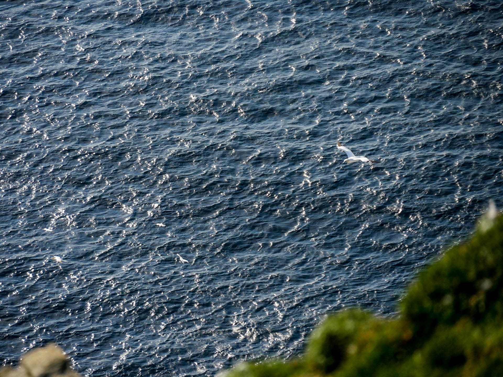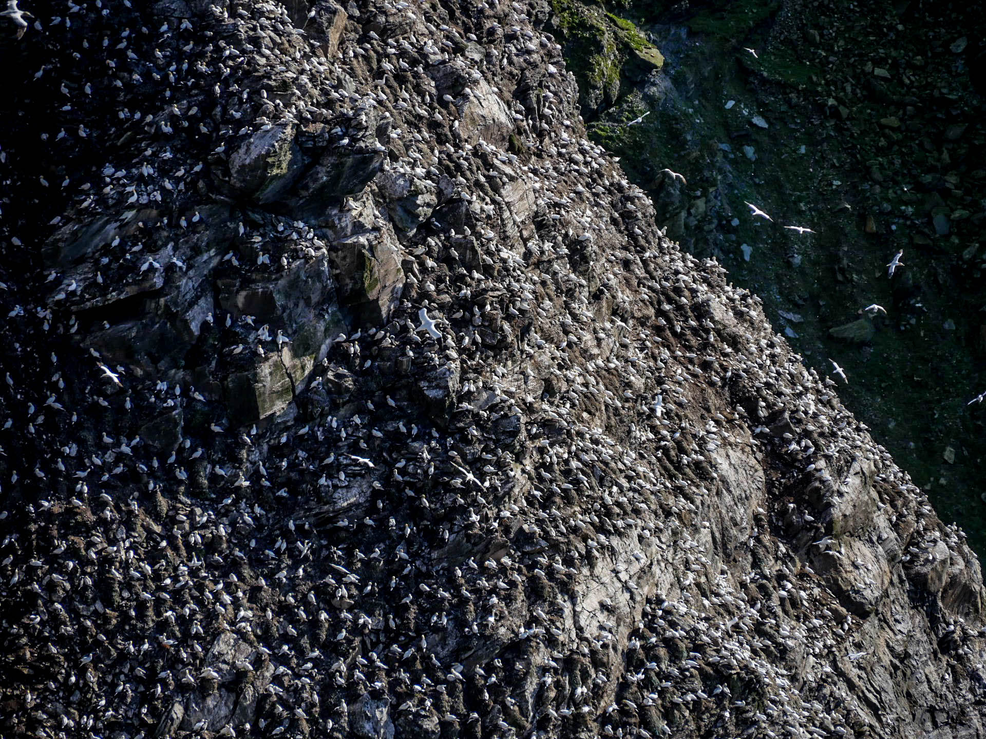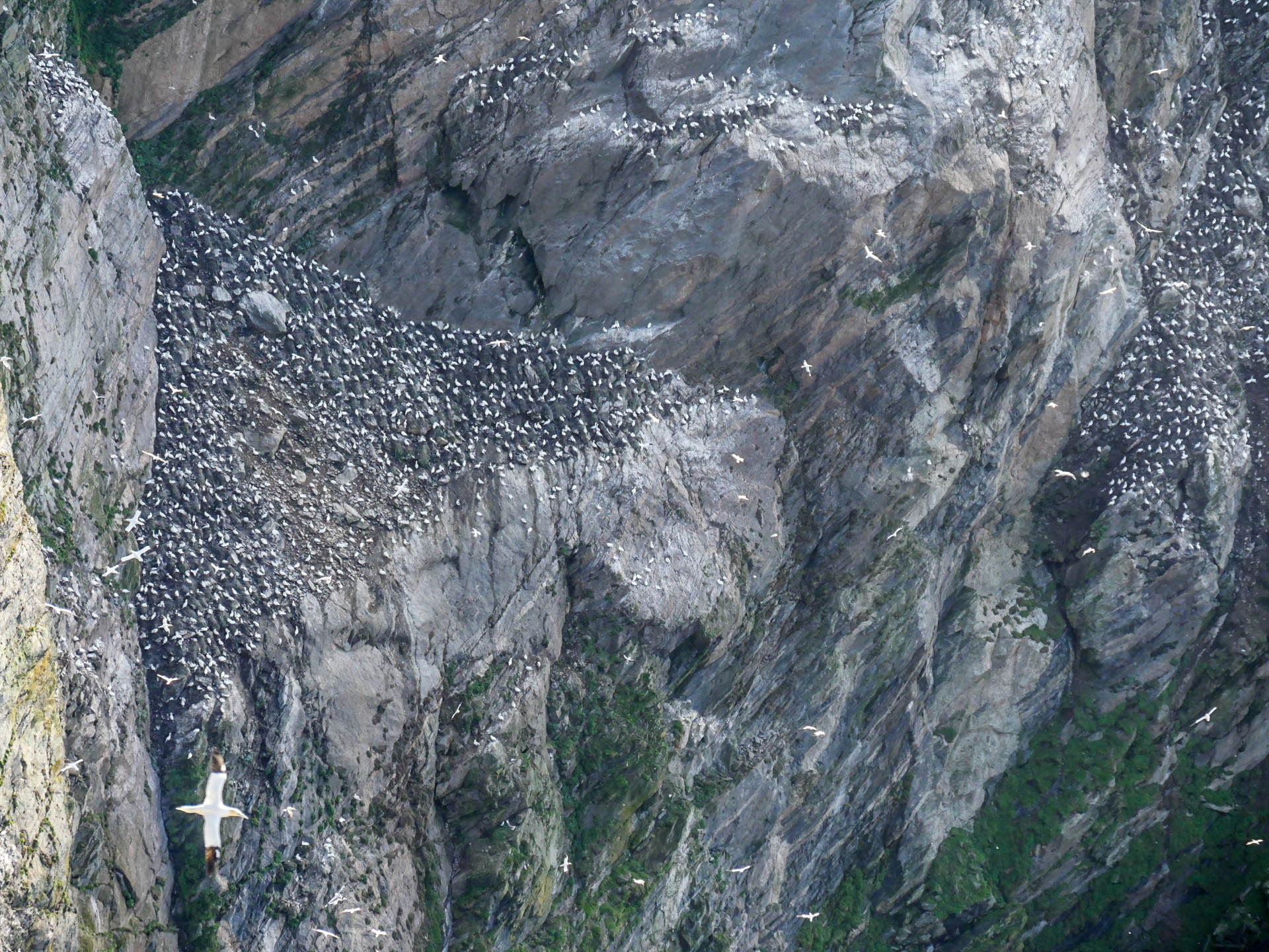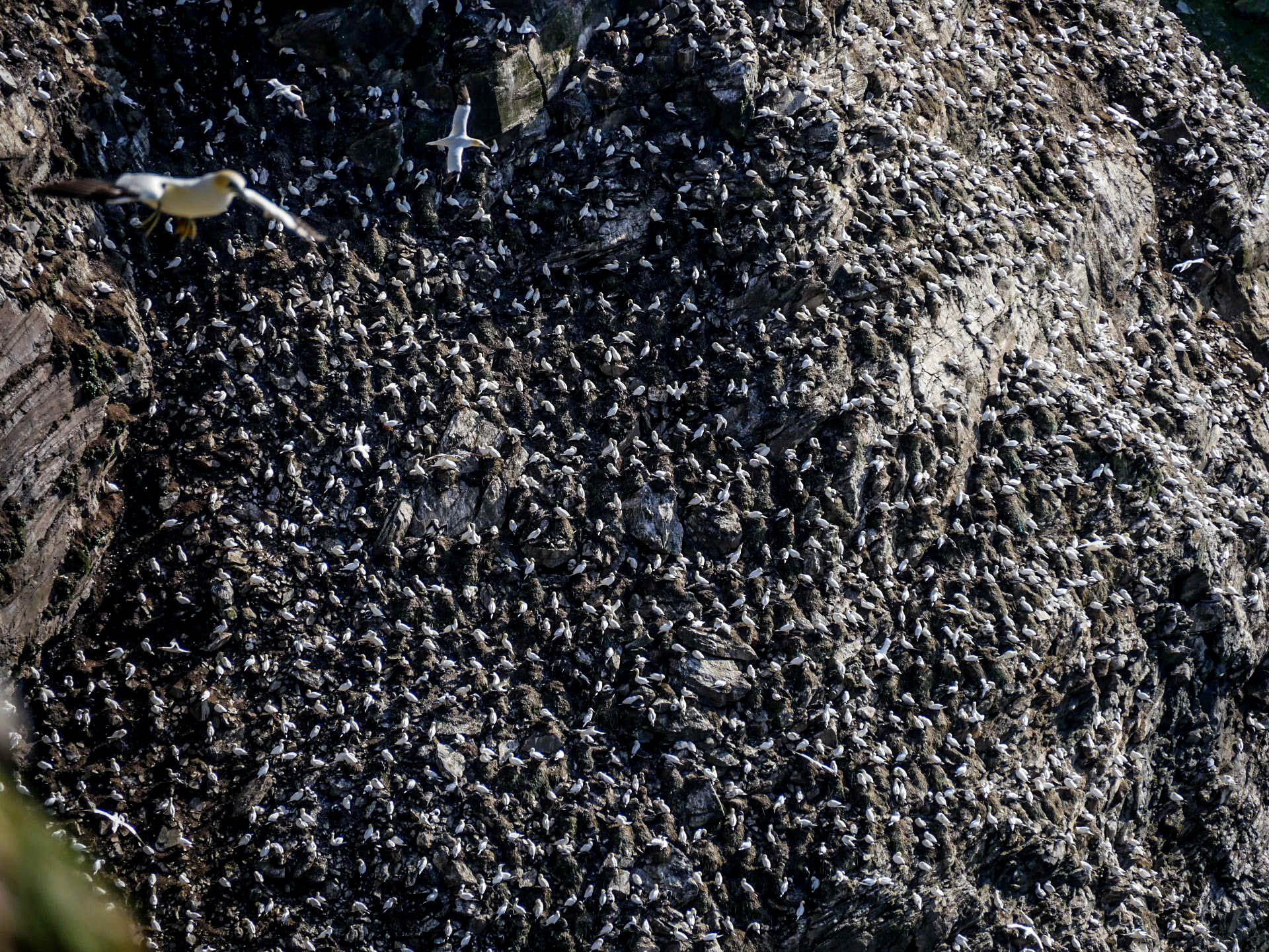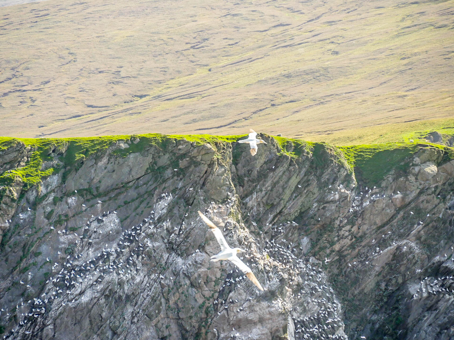 C’est très, très impressionnant. Déjà par le nombre d’oiseaux présents mais aussi pour le spectacle en lui-même. On dirait que la falaise est recouverte de neige, et les oiseaux tournoyant font penser aux flocons. Si on regarde du côté opposé de la falaise, on peut plus détailler la manière dont les fous pêchent. Ils planent très haut dans les airs, en cercle avant de piquer du bec à toute vitesse et de plonger. Une des caractéristiques du fou, c’est qu’il peut déjà avaler le poisson alors qu’il n’est pas encore sorti de l’eau. Oiseaux migrateurs, les fous reviennent à leur aire de nidification jusque septembre-octobre, avant de prendre les chemins du sud pour l’hiver. Si vous souhaitez les observer, c’est à prendre en compte pour planifier votre visite. Pour rappel, les macareux partent mi-août.