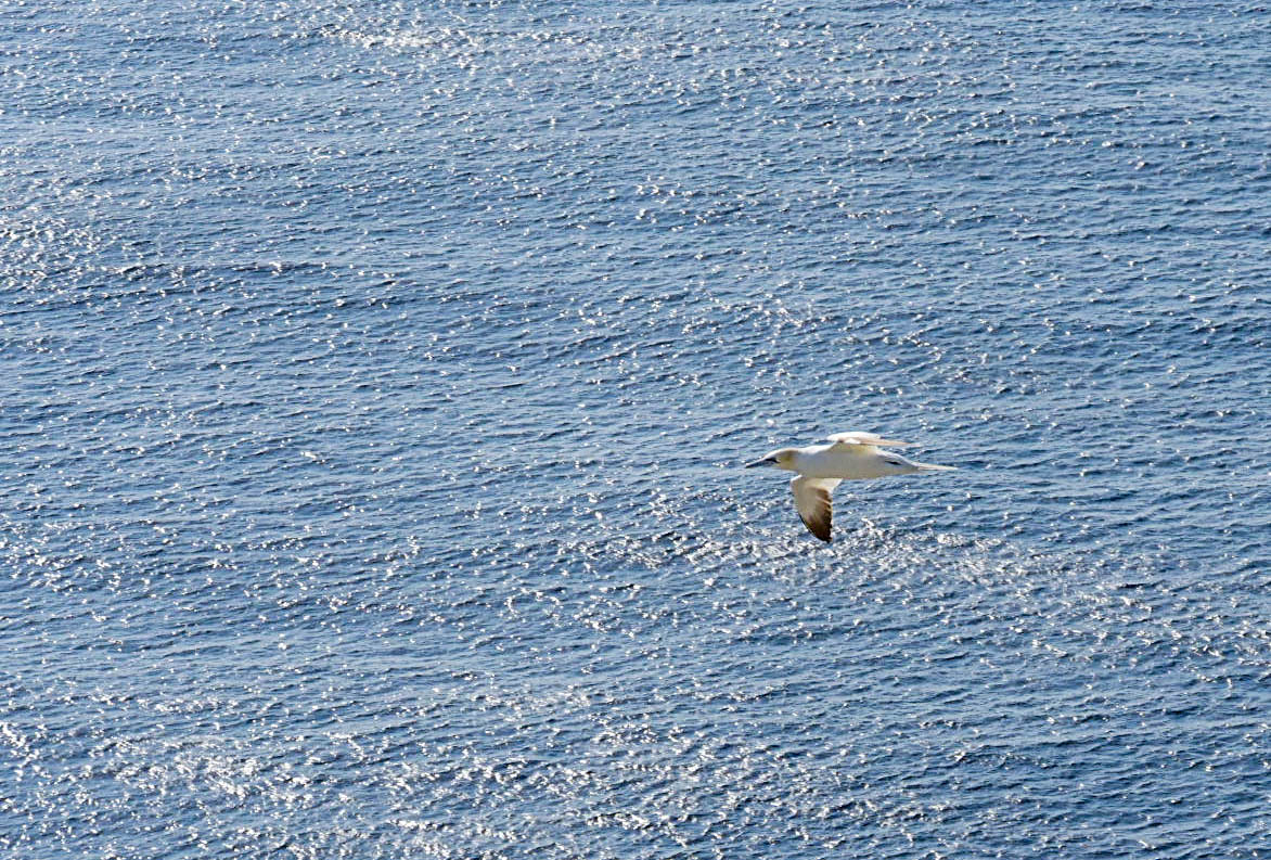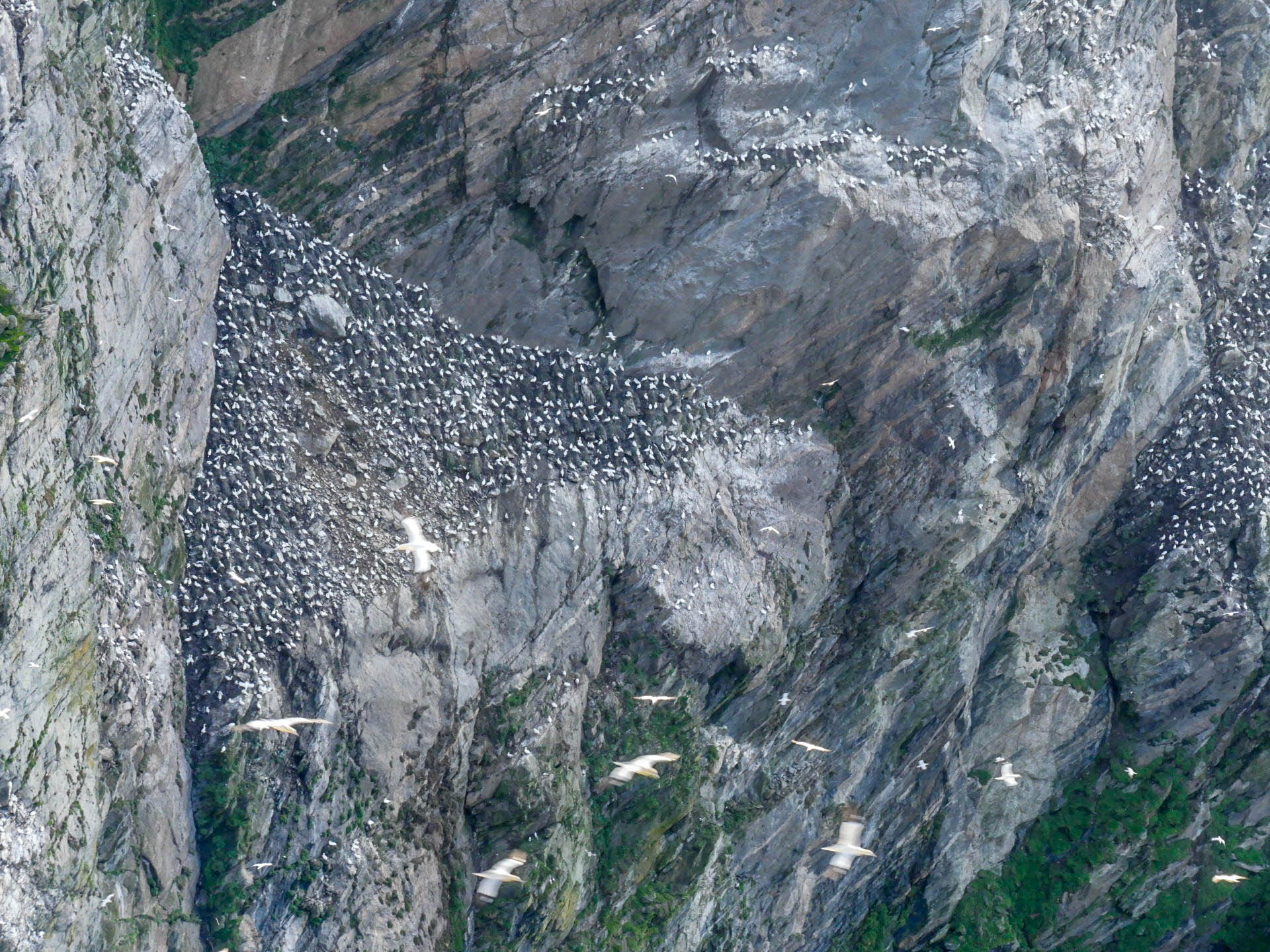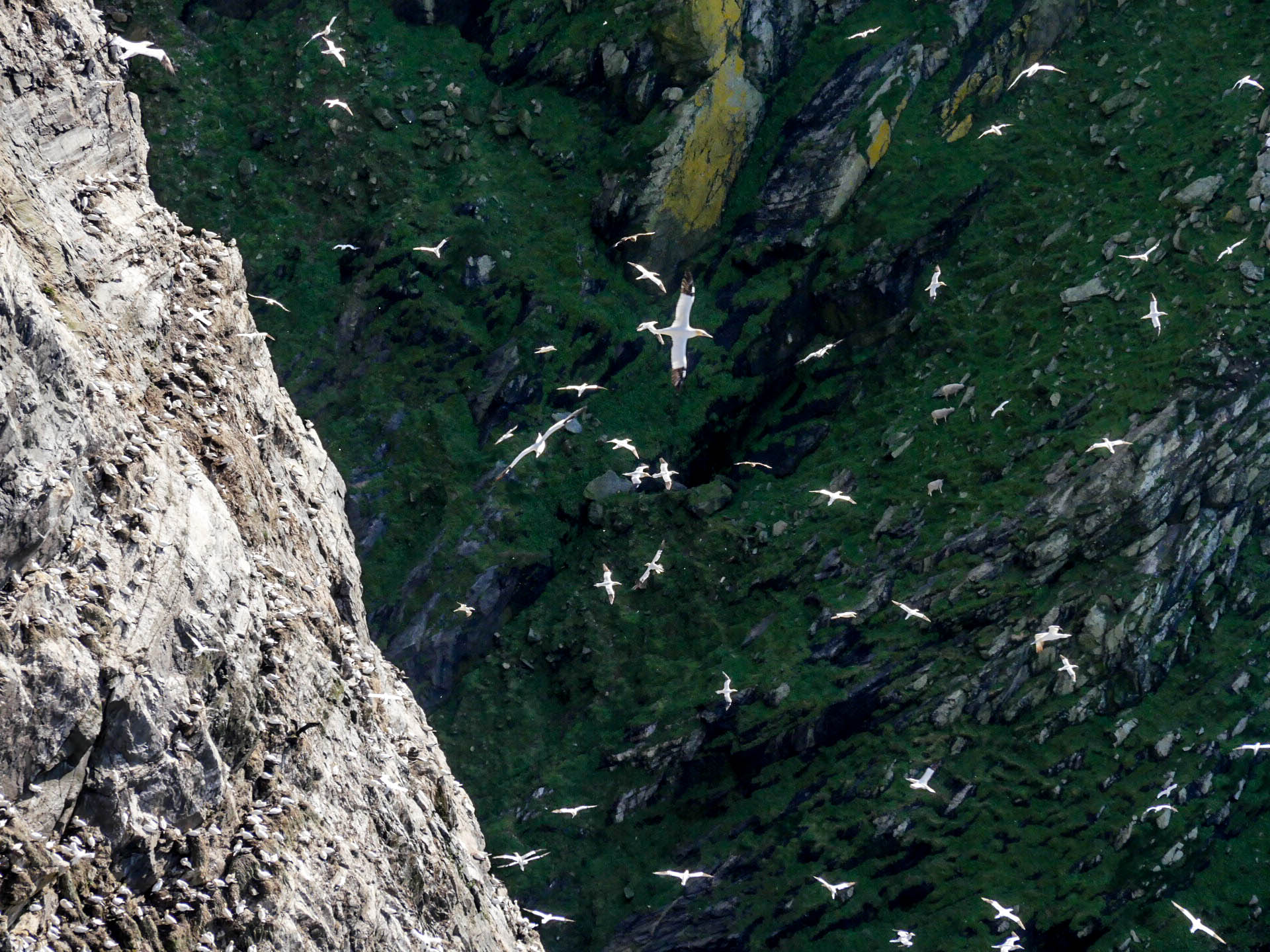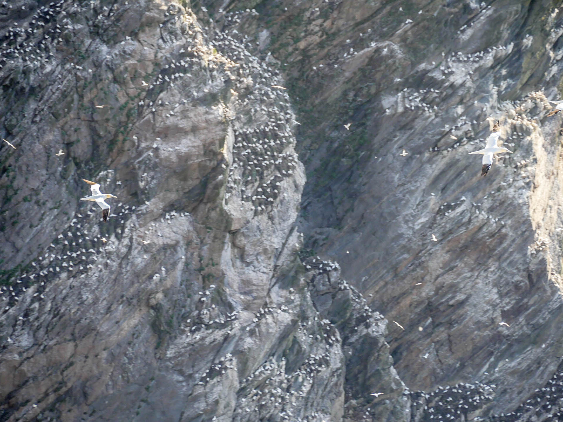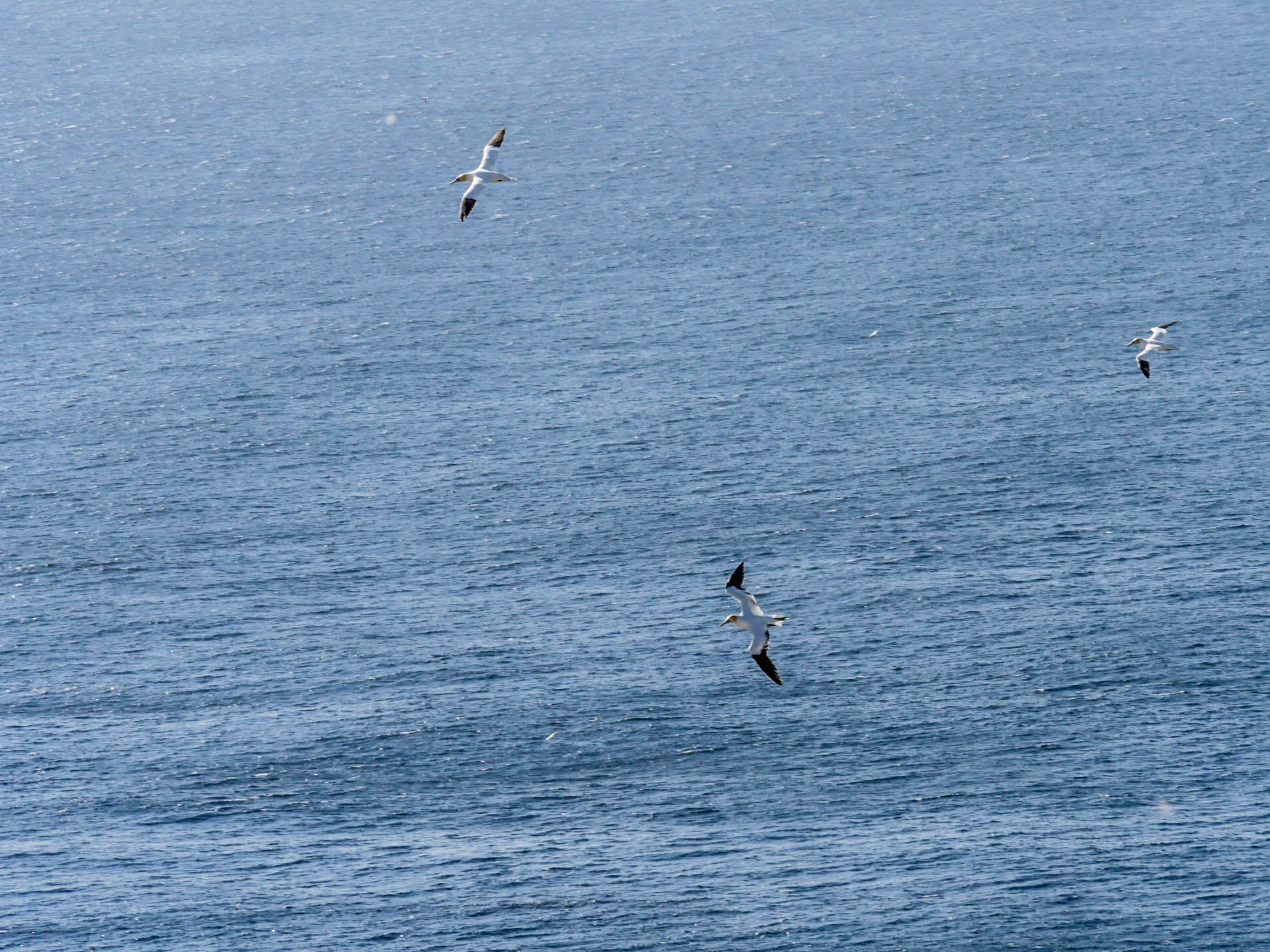 C’est très, très impressionnant. Déjà par le nombre d’oiseaux présents mais aussi pour le spectacle en lui-même. On dirait que la falaise est recouverte de neige, et les oiseaux tournoyant font penser aux flocons. Si on regarde du côté opposé de la falaise, on peut plus détailler la manière dont les fous pêchent. Ils planent très haut dans les airs, en cercle avant de piquer du bec à toute vitesse et de plonger. Une des caractéristiques du fou, c’est qu’il peut déjà avaler le poisson alors qu’il n’est pas encore sorti de l’eau. Oiseaux migrateurs, les fous reviennent à leur aire de nidification jusque septembre-octobre, avant de prendre les chemins du sud pour l’hiver. Si vous souhaitez les observer, c’est à prendre en compte pour planifier votre visite. Pour rappel, les macareux partent mi-août.