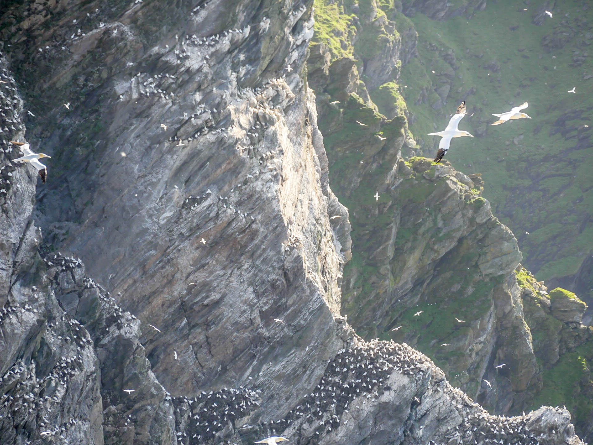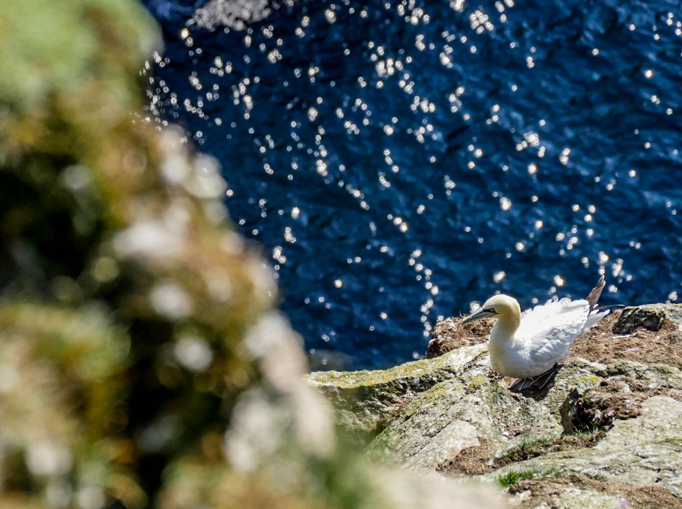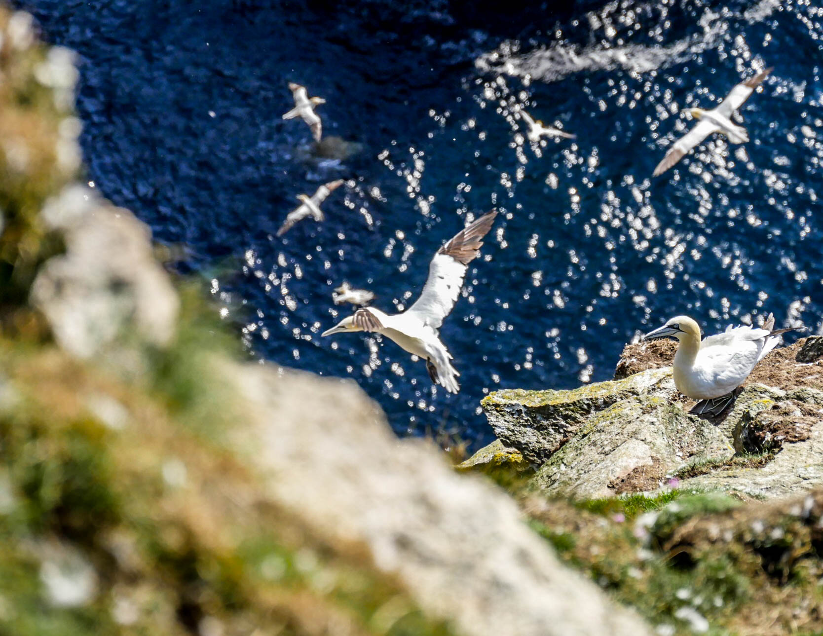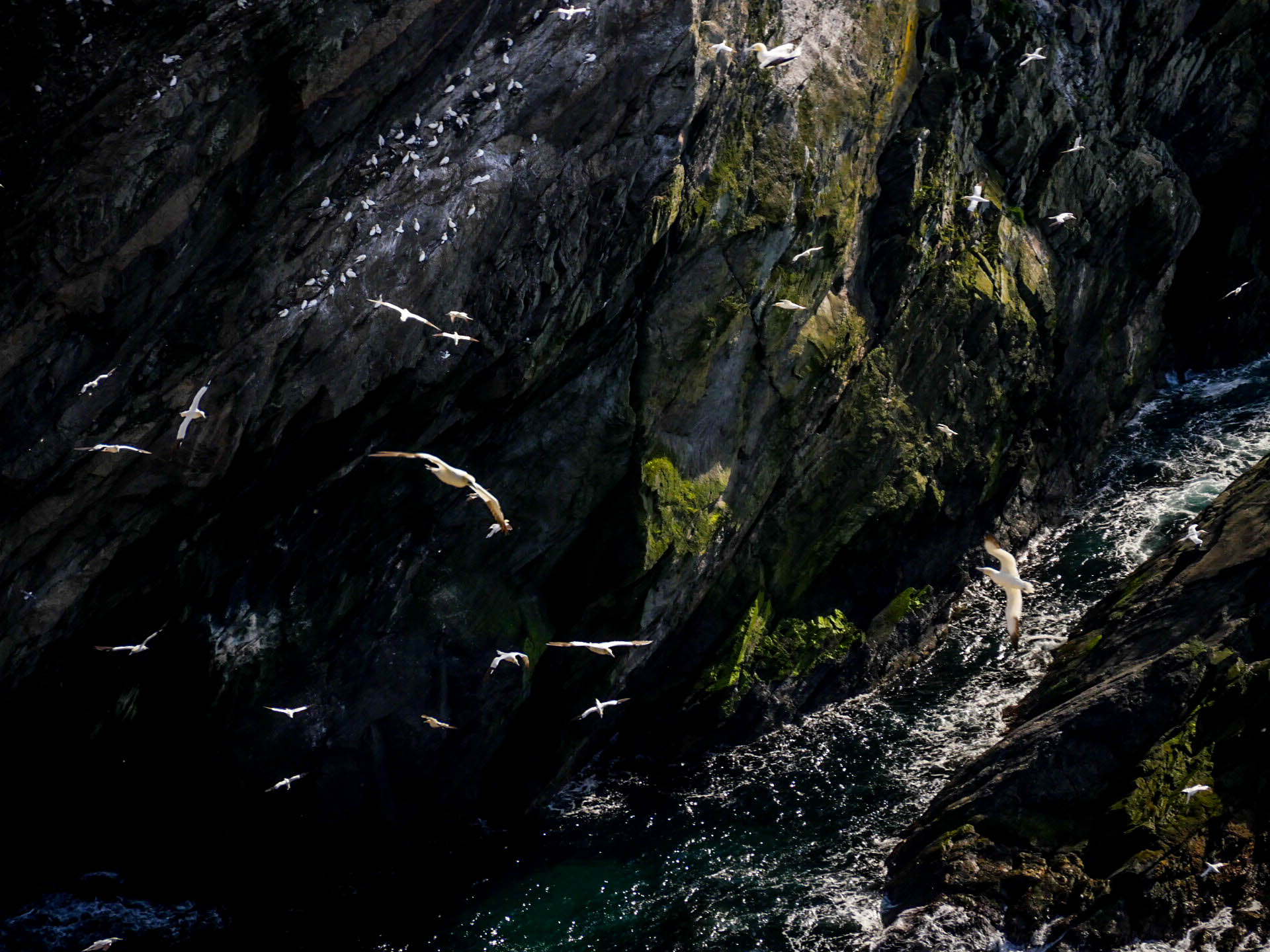 C’est très, très impressionnant. Déjà par le nombre d’oiseaux présents mais aussi pour le spectacle en lui-même. On dirait que la falaise est recouverte de neige, et les oiseaux tournoyant font penser aux flocons. Si on regarde du côté opposé de la falaise, on peut plus détailler la manière dont les fous pêchent. Ils planent très haut dans les airs, en cercle avant de piquer du bec à toute vitesse et de plonger. Une des caractéristiques du fou, c’est qu’il peut déjà avaler le poisson alors qu’il n’est pas encore sorti de l’eau. Oiseaux migrateurs, les fous reviennent à leur aire de nidification jusque septembre-octobre, avant de prendre les chemins du sud pour l’hiver. Si vous souhaitez les observer, c’est à prendre en compte pour planifier votre visite. Pour rappel, les macareux partent mi-août.