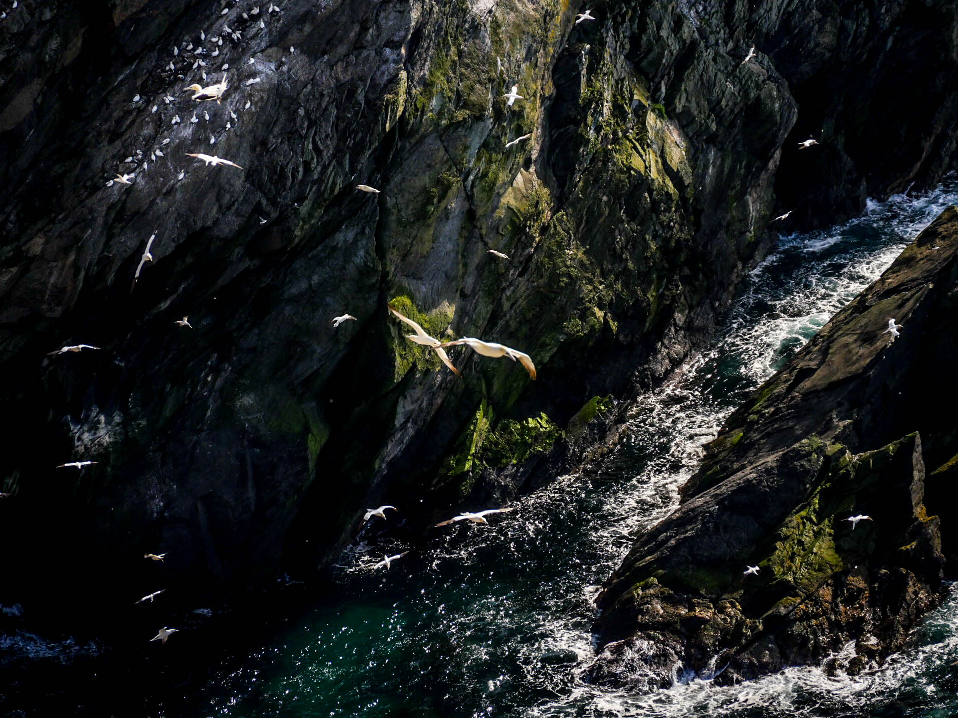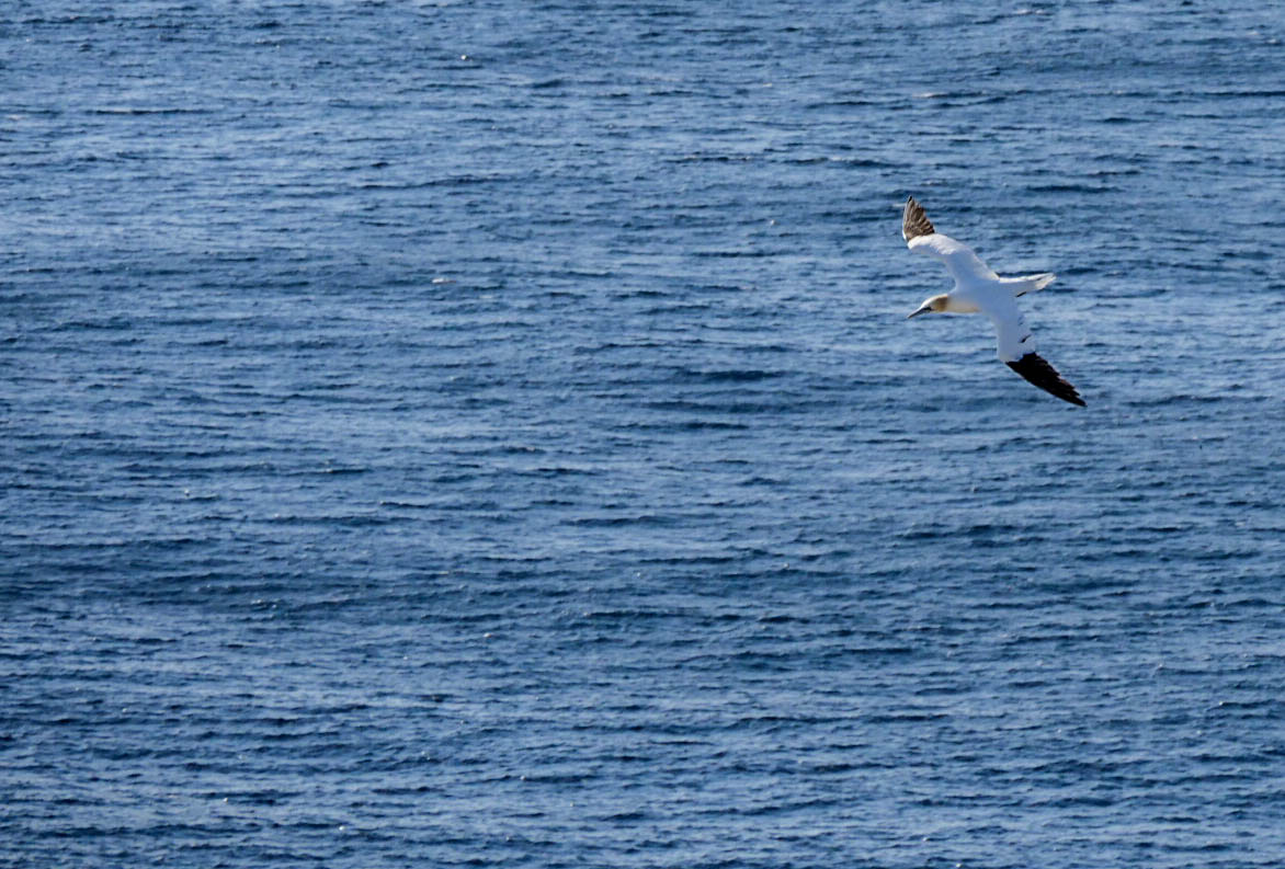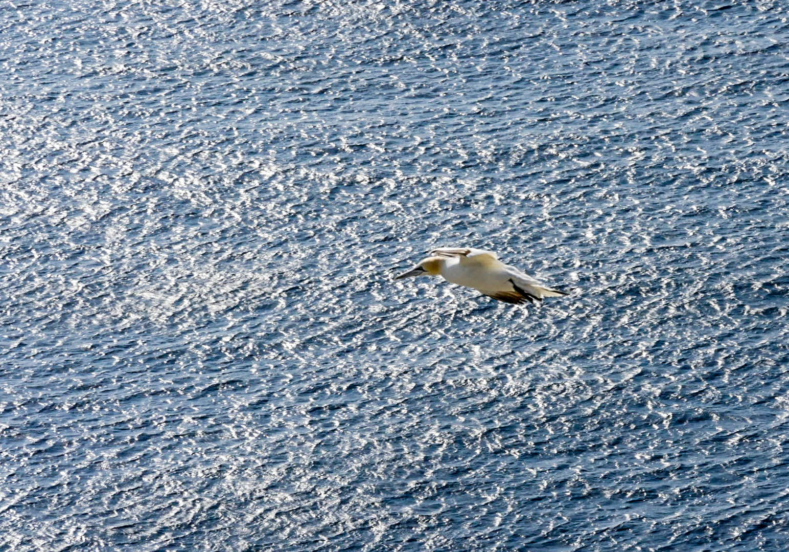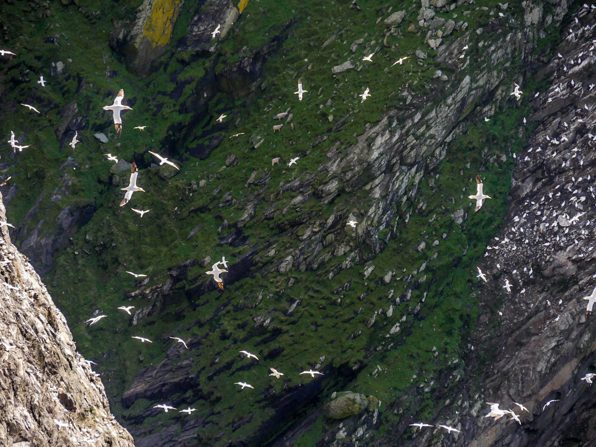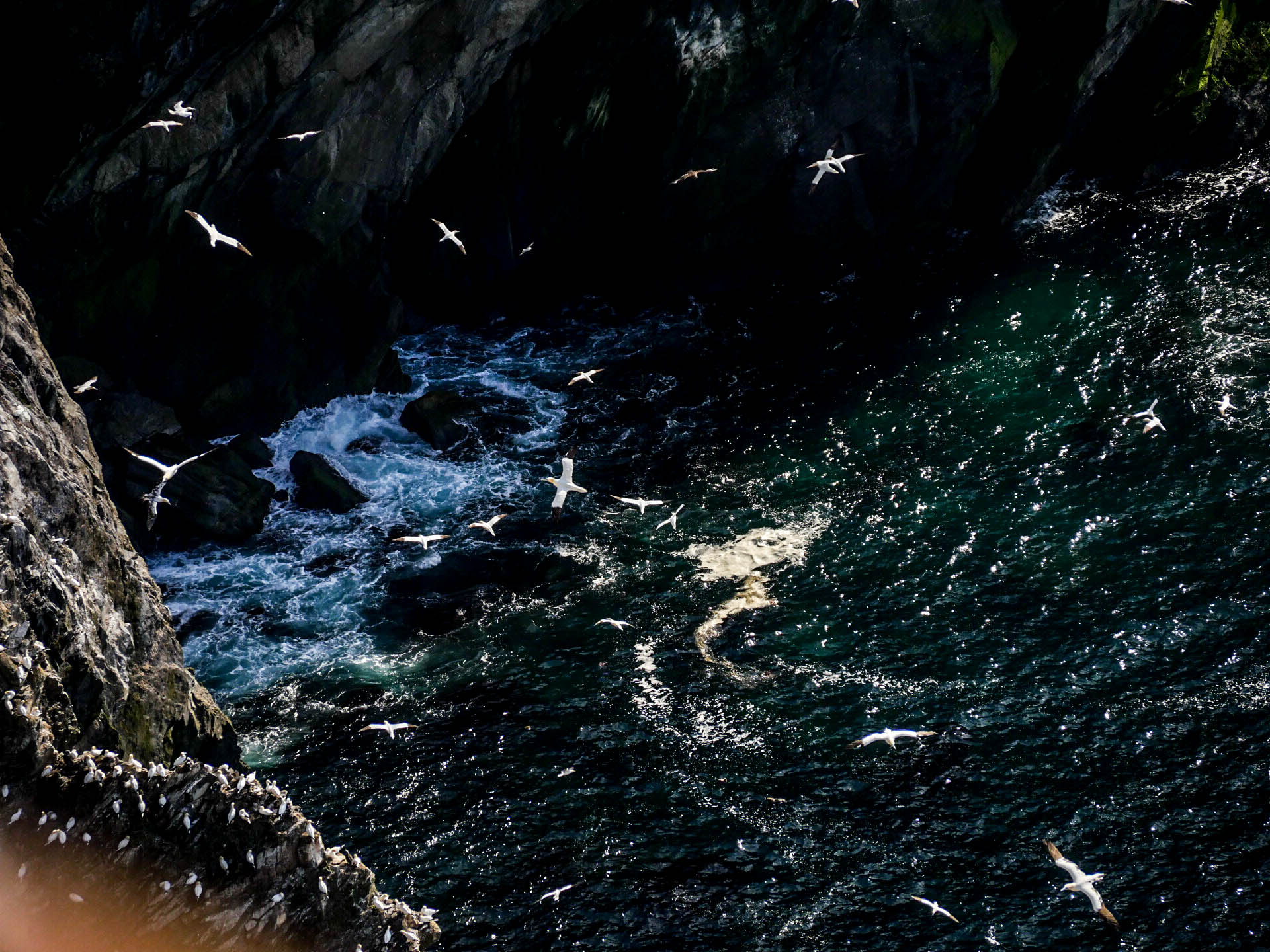 C’est très, très impressionnant. Déjà par le nombre d’oiseaux présents mais aussi pour le spectacle en lui-même. On dirait que la falaise est recouverte de neige, et les oiseaux tournoyant font penser aux flocons. Si on regarde du côté opposé de la falaise, on peut plus détailler la manière dont les fous pêchent. Ils planent très haut dans les airs, en cercle avant de piquer du bec à toute vitesse et de plonger. Une des caractéristiques du fou, c’est qu’il peut déjà avaler le poisson alors qu’il n’est pas encore sorti de l’eau. Oiseaux migrateurs, les fous reviennent à leur aire de nidification jusque septembre-octobre, avant de prendre les chemins du sud pour l’hiver. Si vous souhaitez les observer, c’est à prendre en compte pour planifier votre visite. Pour rappel, les macareux partent mi-août.
