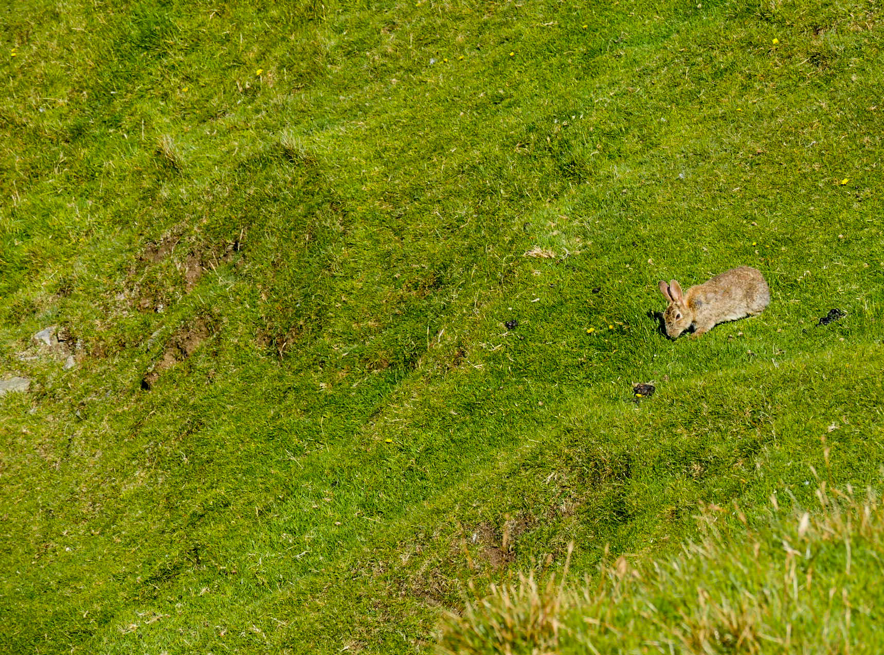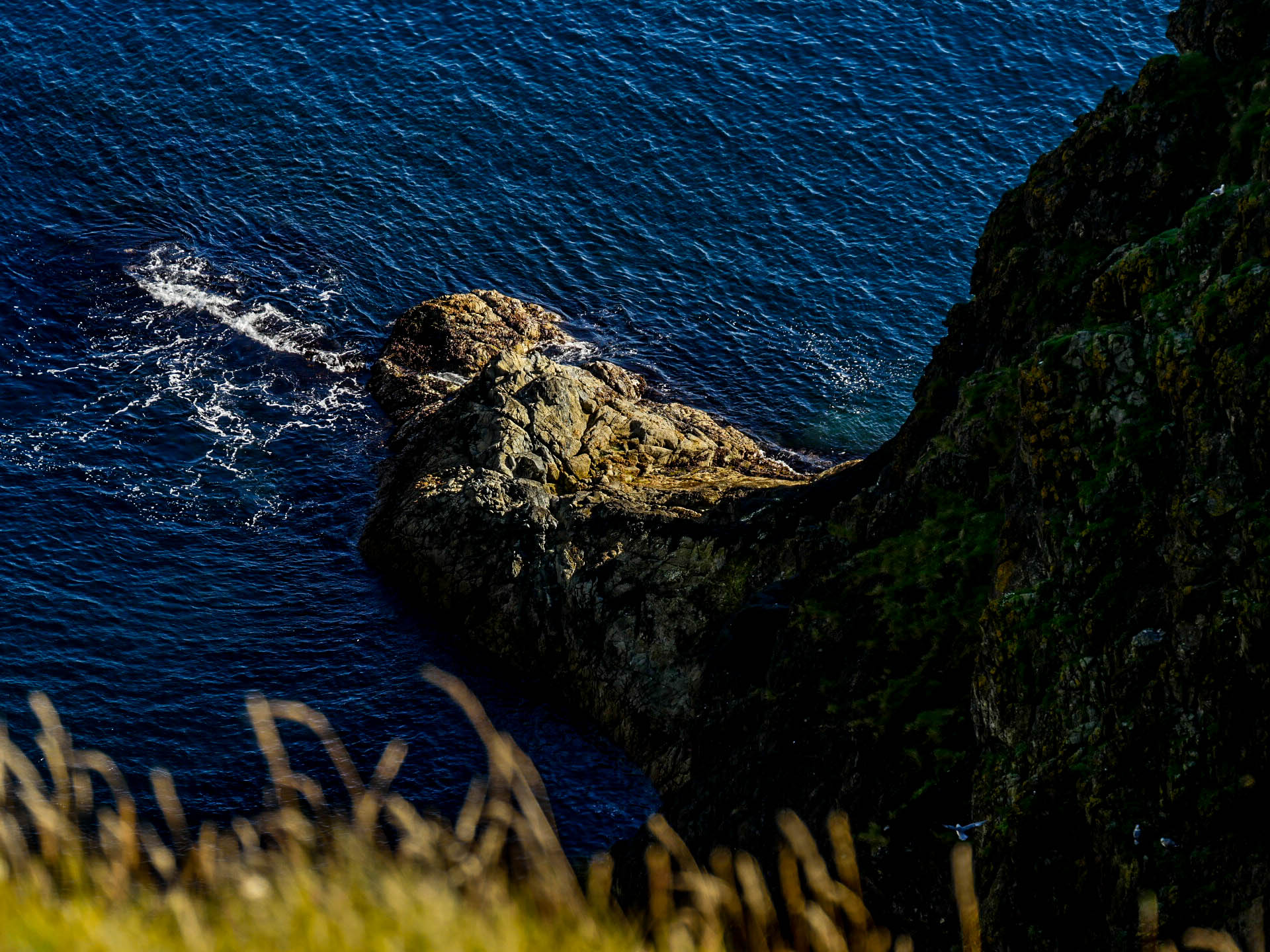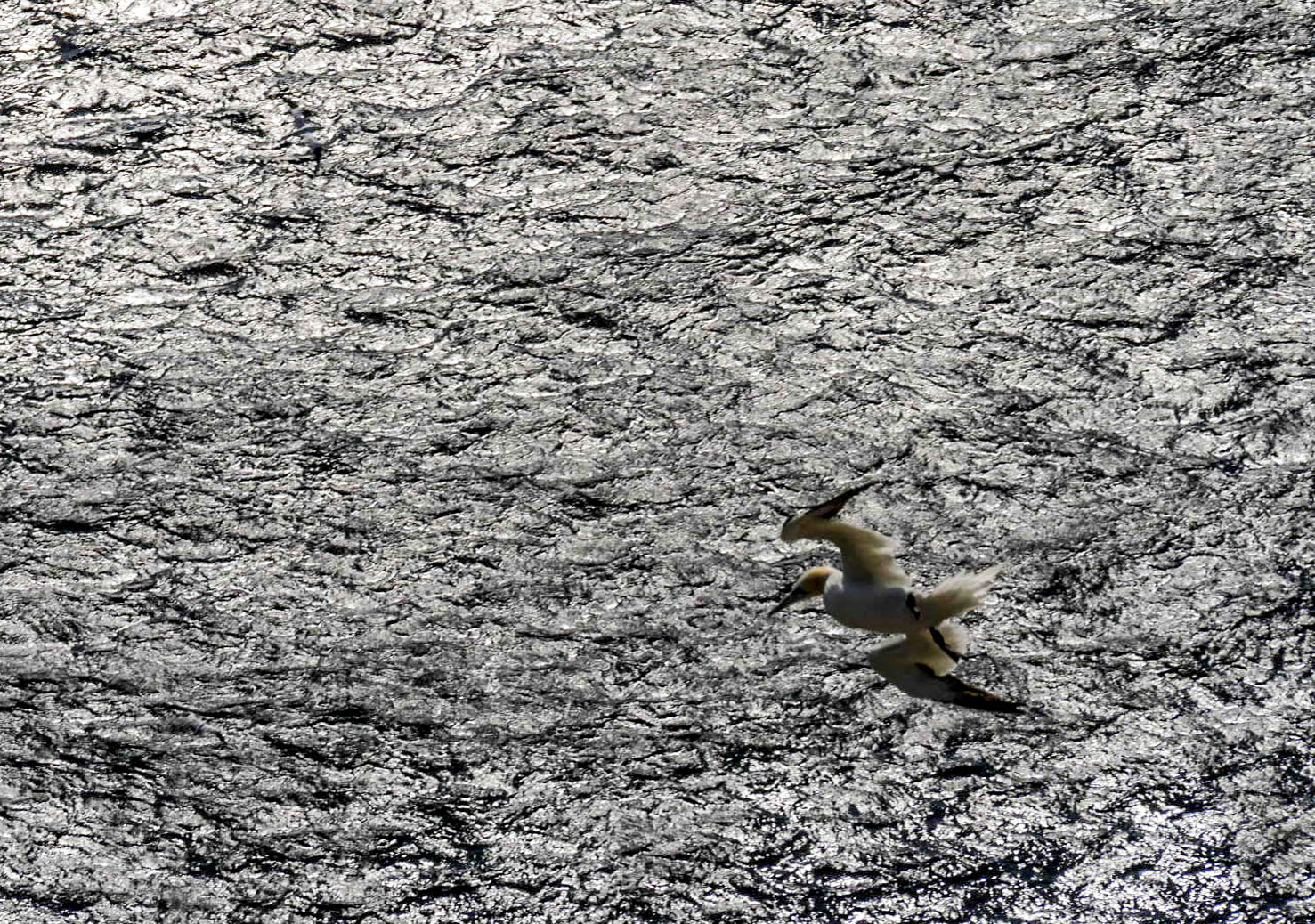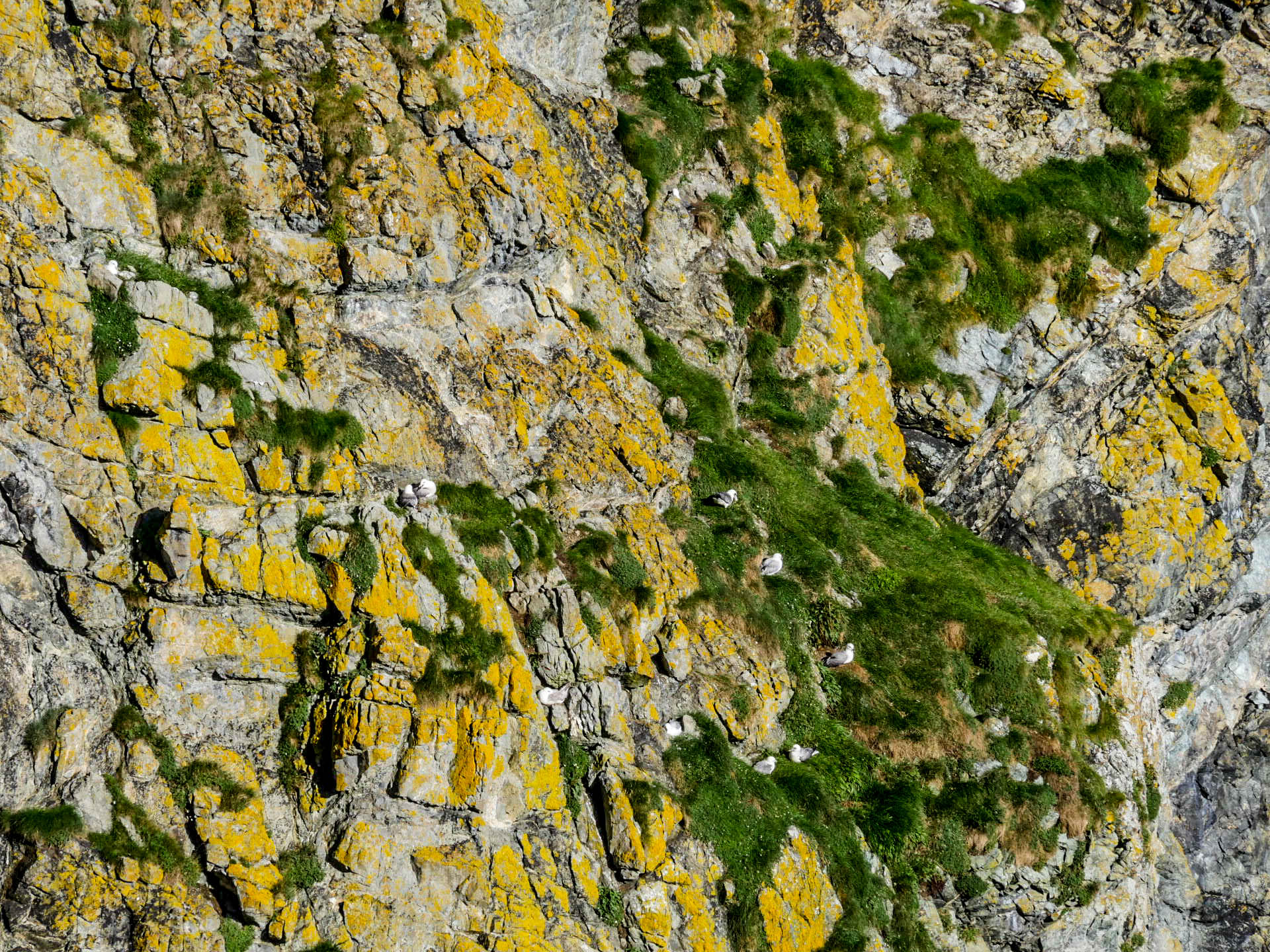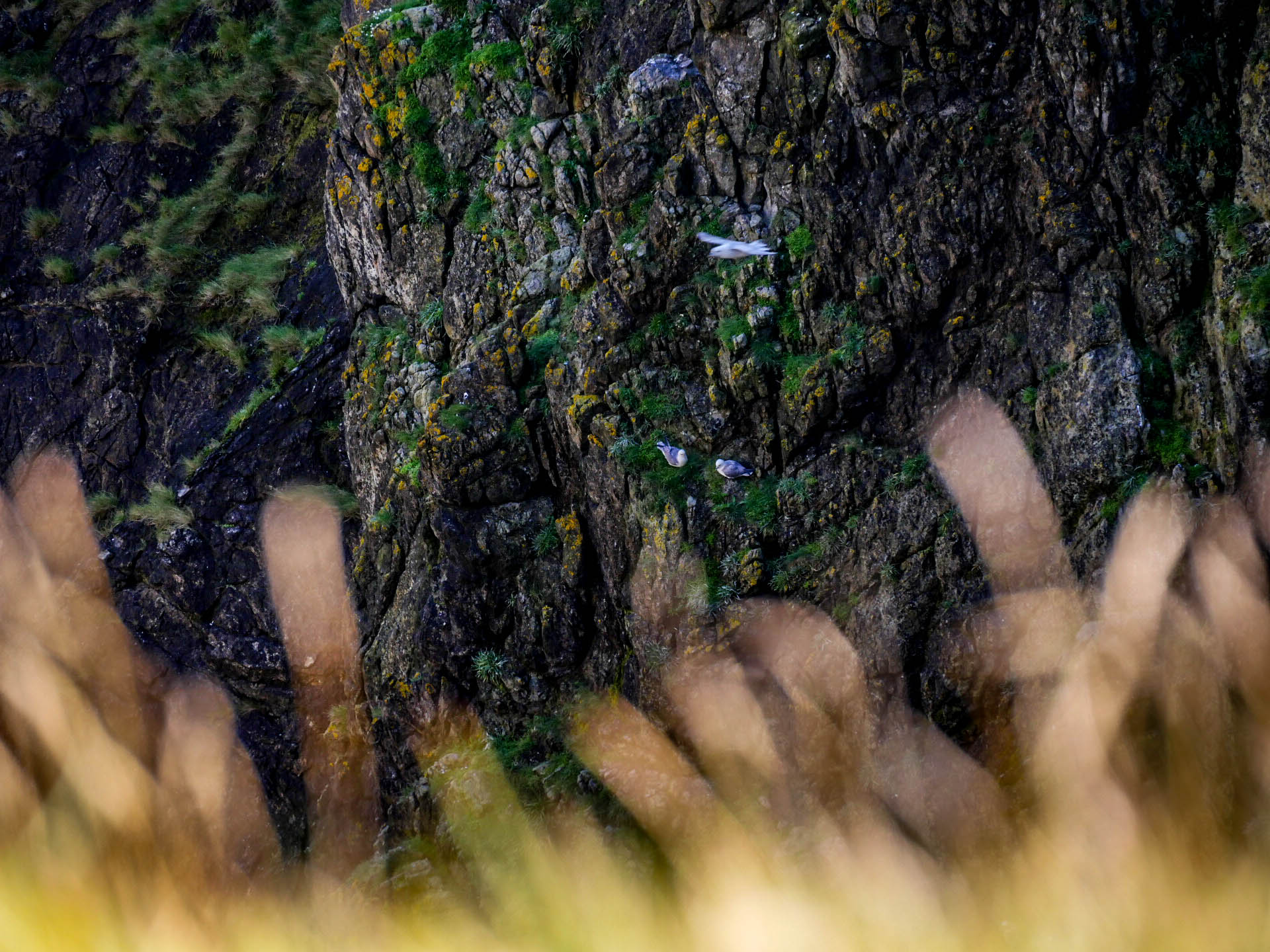 C’est très, très impressionnant. Déjà par le nombre d’oiseaux présents mais aussi pour le spectacle en lui-même. On dirait que la falaise est recouverte de neige, et les oiseaux tournoyant font penser aux flocons. Si on regarde du côté opposé de la falaise, on peut plus détailler la manière dont les fous pêchent. Ils planent très haut dans les airs, en cercle avant de piquer du bec à toute vitesse et de plonger. Une des caractéristiques du fou, c’est qu’il peut déjà avaler le poisson alors qu’il n’est pas encore sorti de l’eau. Oiseaux migrateurs, les fous reviennent à leur aire de nidification jusque septembre-octobre, avant de prendre les chemins du sud pour l’hiver. Si vous souhaitez les observer, c’est à prendre en compte pour planifier votre visite. Pour rappel, les macareux partent mi-août.