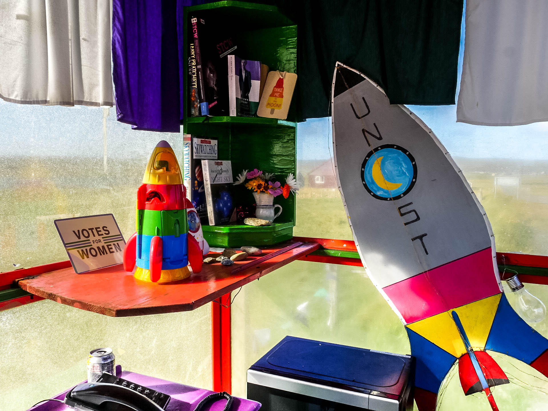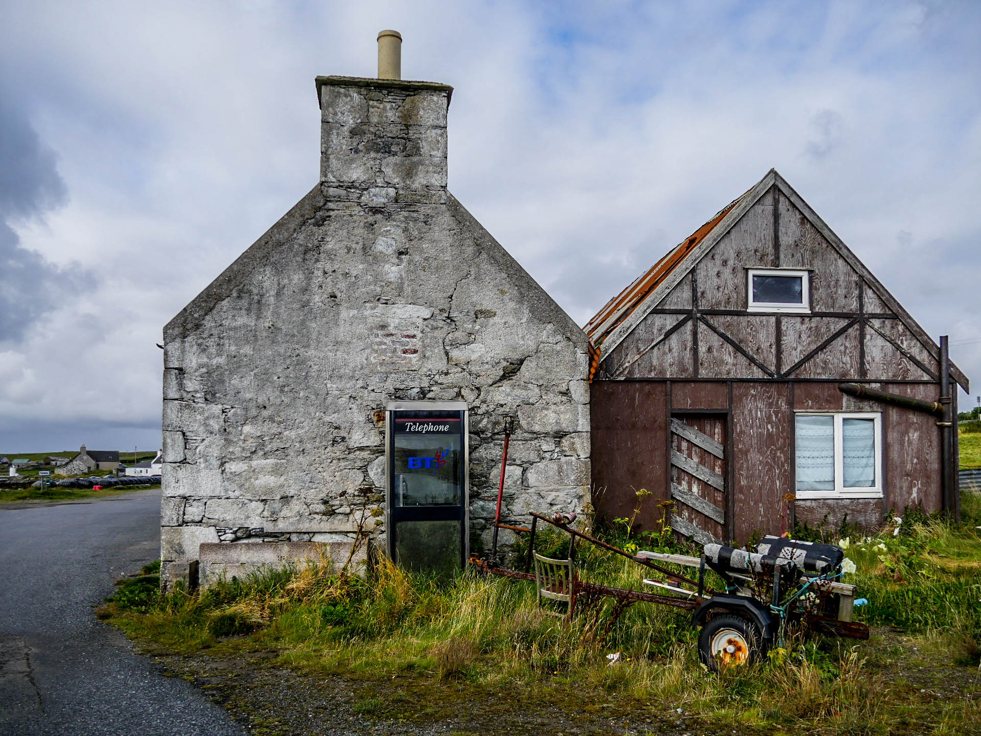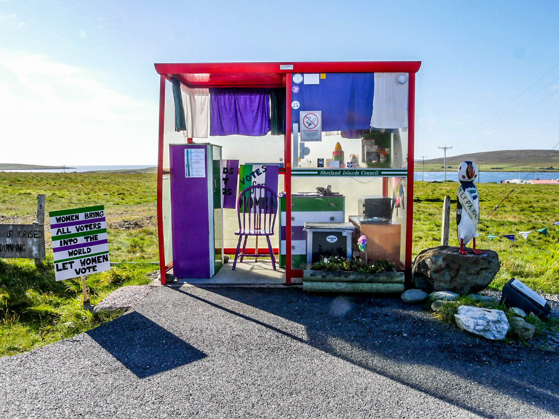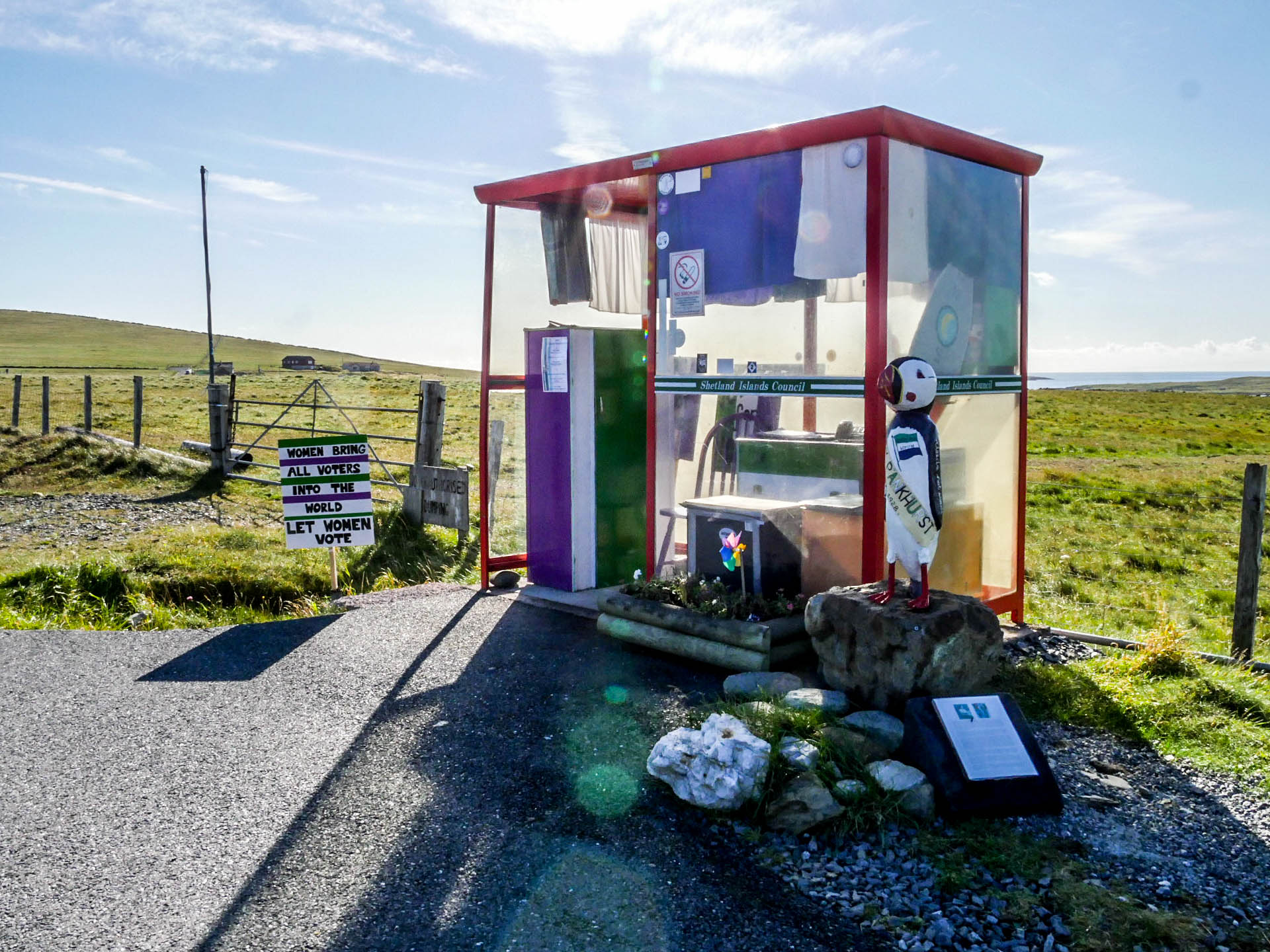 Si la veille avait la part belle à la voiture, cette journée va mettre nos gambettes à forte contribution : on a deux randonnées de prévues. La première commence tout à côté de notre hôtel et c’est un des endroits les plus photographiés des Shetland qui en marque le début : Bobby’s Bus Shelter. Un abribus qui a la particularité d’être décoré de manière complètement extravagante depuis que obby, un petit garçon de 6 ans à l’époque, avait demandé la reconstruction d’un abribus qui avait été démoli. Au début, l’abribus était décoré de manière anonyme mais depuis, tout est devenu plus organisé. Le thème change régulièrement et pour le moment, le Bus Shelter célèbre le droit de vote accordé aux femmes. A l’intérieur, c’est un vrai bric-à-brac, quelquefois sans lien avec le thème. A côté des calicots de suffragettes, on trouve un four à micro-ondes, des fusées-jouets, un téléphone, des vases… Comme si la personne qui décorait n’arrivait pas à choisir. Cette petite boite de verre, c’est tout un concentré d’excentricité britannique, quoi !