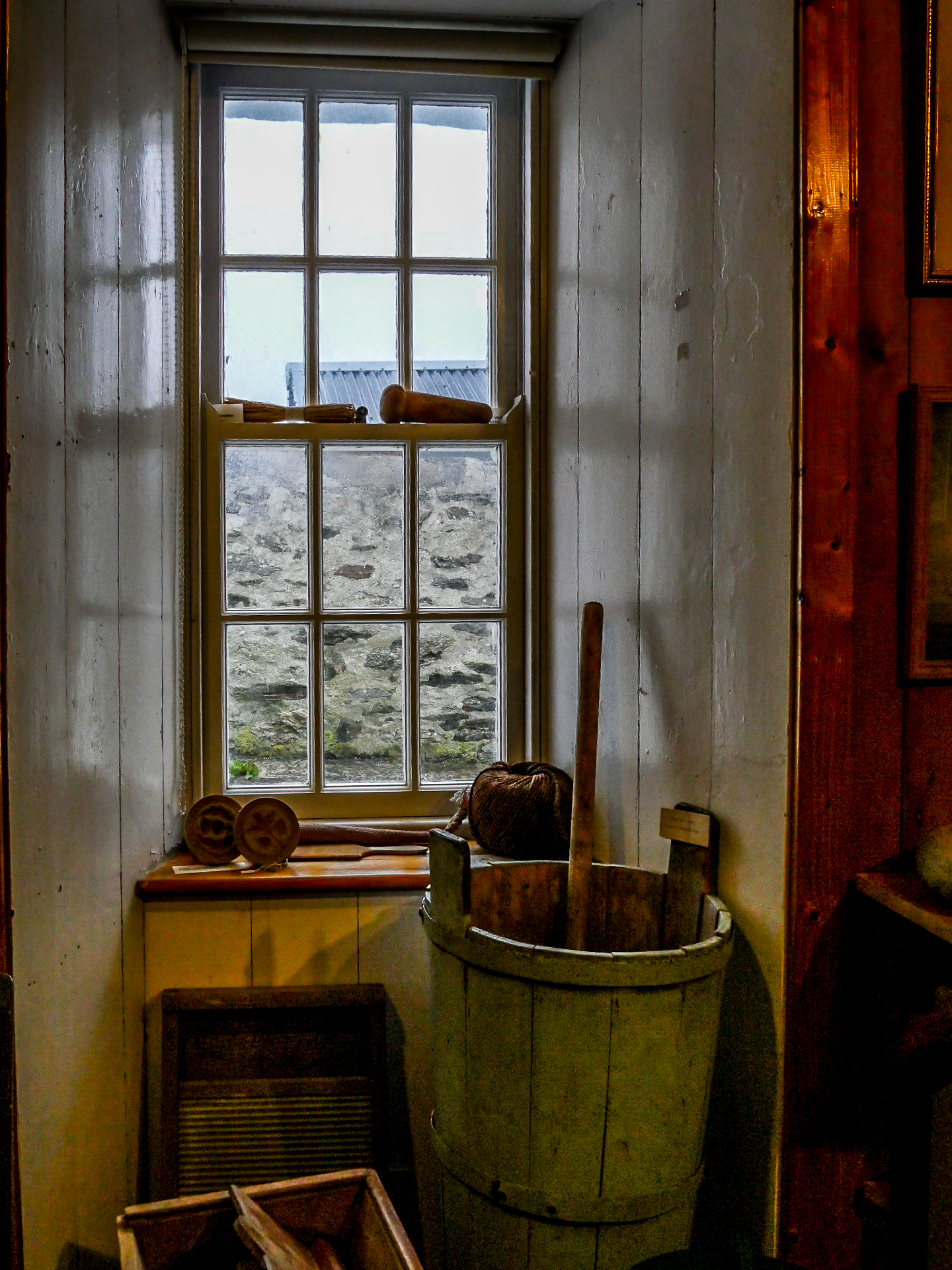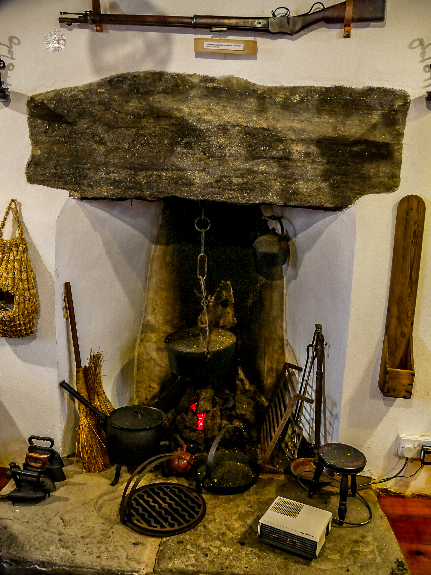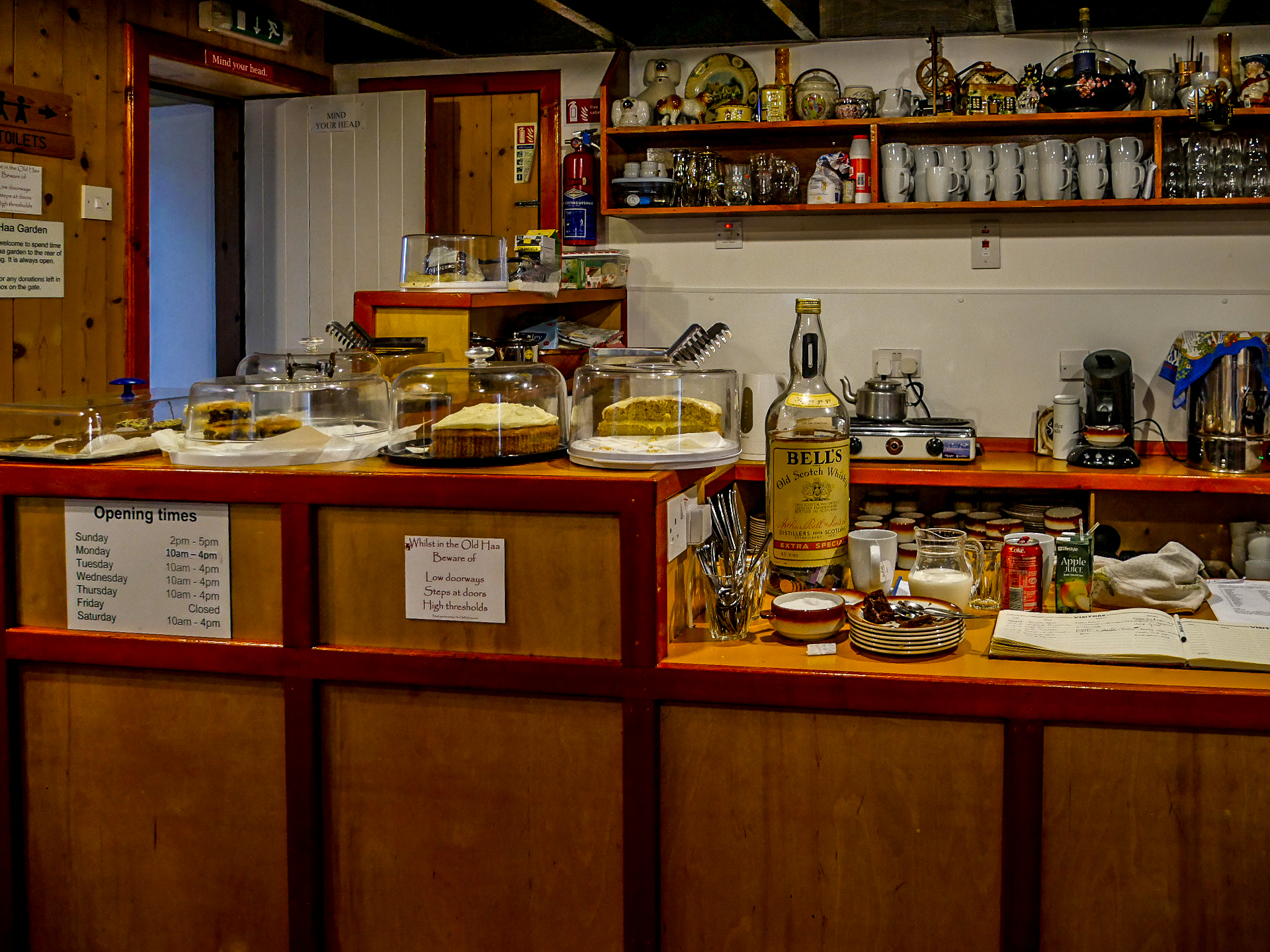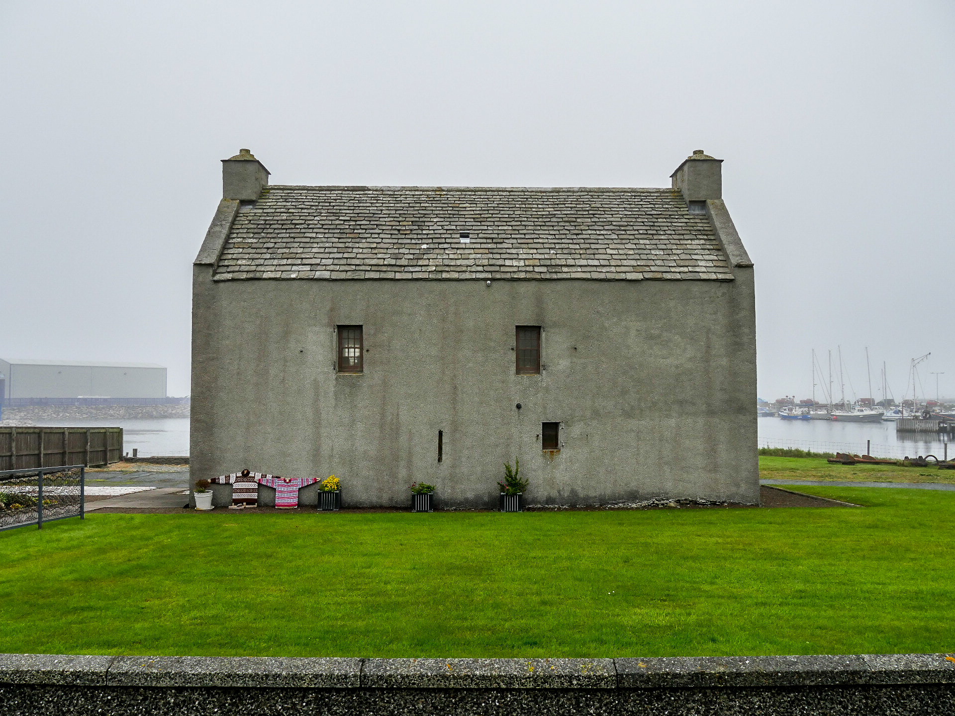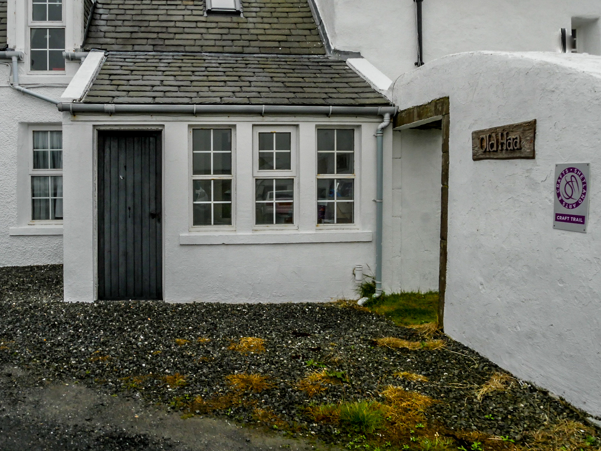 The Old Haa est une magnifique maison du XVIIIème siècle. Construite par Robert Tyrie, un marchand, elle a gardé une vocation commerciale et à même servi à des marchands de la Ligue Hanséatique. En 1984, elle est achetée par le Shetland Amenity Trust à condition qu’elle serve à tous les habitants de Yell. Elle est donc devenue un musée d’histoire de l’île. Elle est divisée plus ou moins 3 parties : une partie histoire au rez-de-chaussée, une deuxième à l’étage, une partie histoire naturelle et une autre consacrée à l’artisanat de Yell. Evidemment, tout ce qui a trait à la mer est présent, mais aussi des horizons plus lointains fréquentés par les marins de l’île, notamment les baleiniers qui menaient campagne en Groenland ou dans l’Océan Austral. Dans la salle d’histoire naturelle, on trouve un morceau de mâchoire d’une baleine tandis que la salle «historique à l’étage nous plonge plutôt dans le monde du quotidien de Yell, les magasins locaux, l’école, les fêtes comme les mariages… Pour couronner le tout, le musée à un joli tea-room, pourvu d’une cheminée. Vraiment chaleureuse et parfaite pour faire une pause par contre, ils n’acceptent que du cash… nous n’avons donc pas pu profiter d’une bonne tassé de thé, vu que nous étions à court de liquide ! Dommage, et c’est en ligne droite, sans nous arrêter, que nous roulons vers le point d’embarcation du ferry et traverser le Yell Sound pour retourner sur Mainland. Ça sent la fin de séjour.