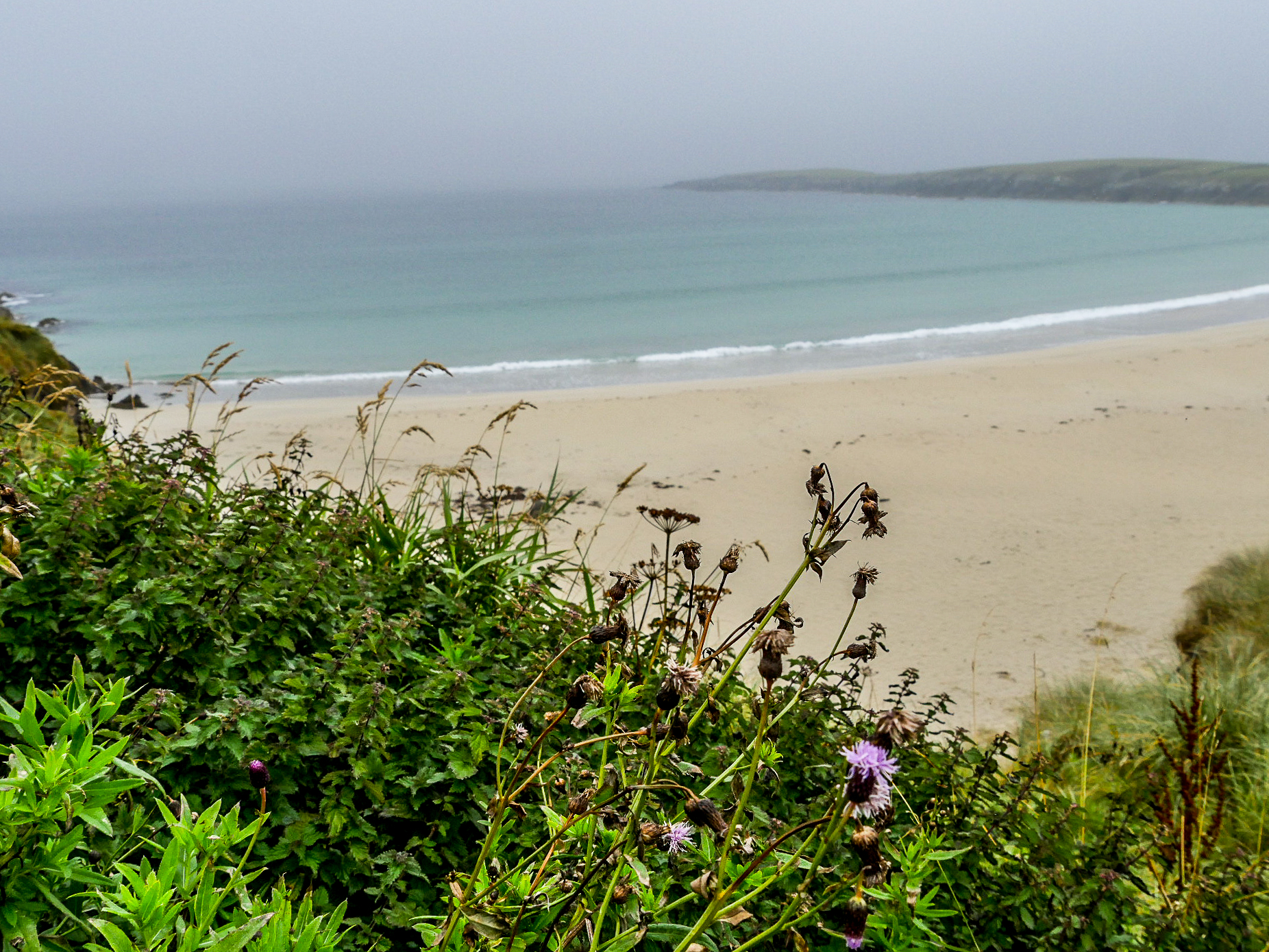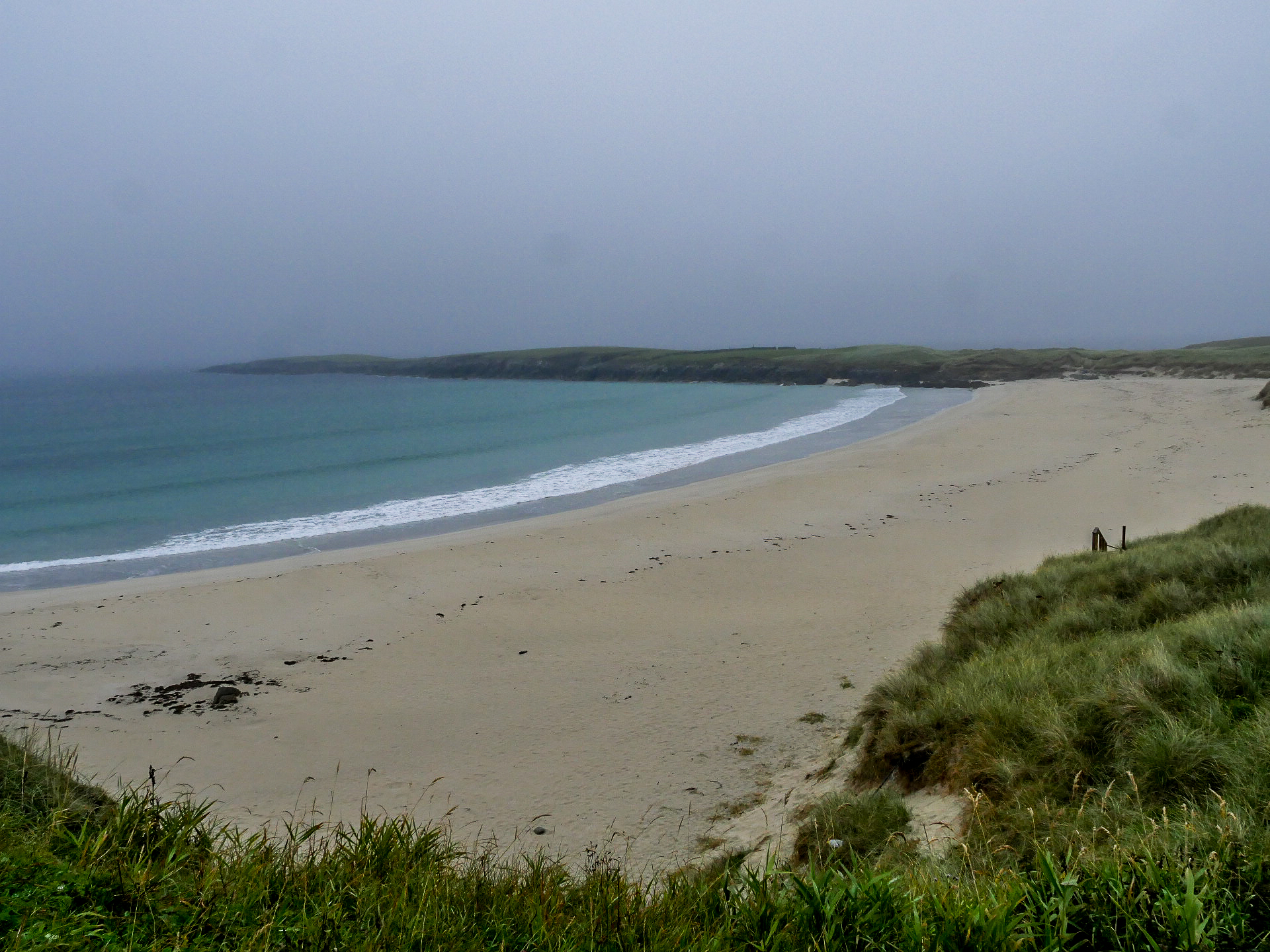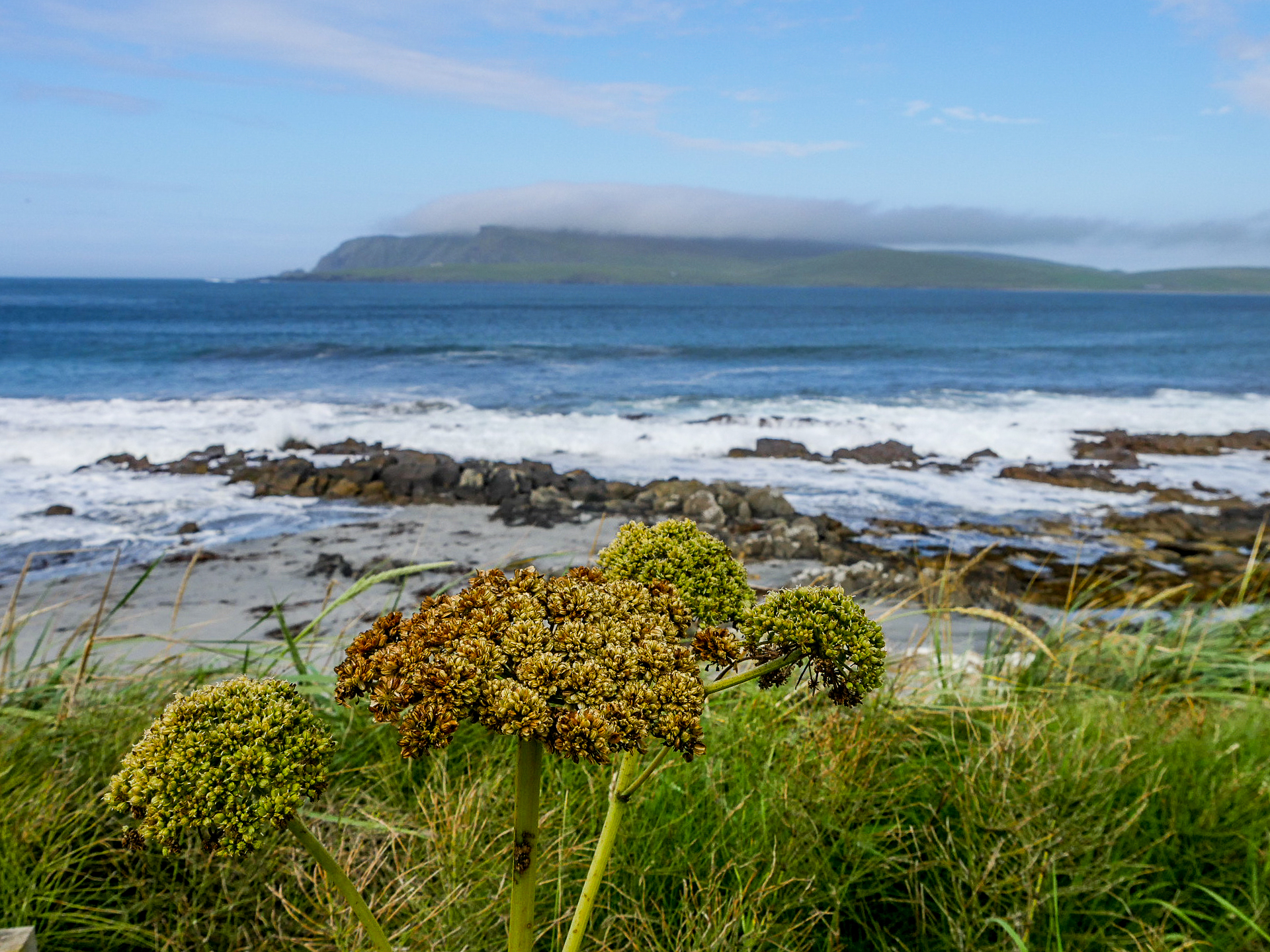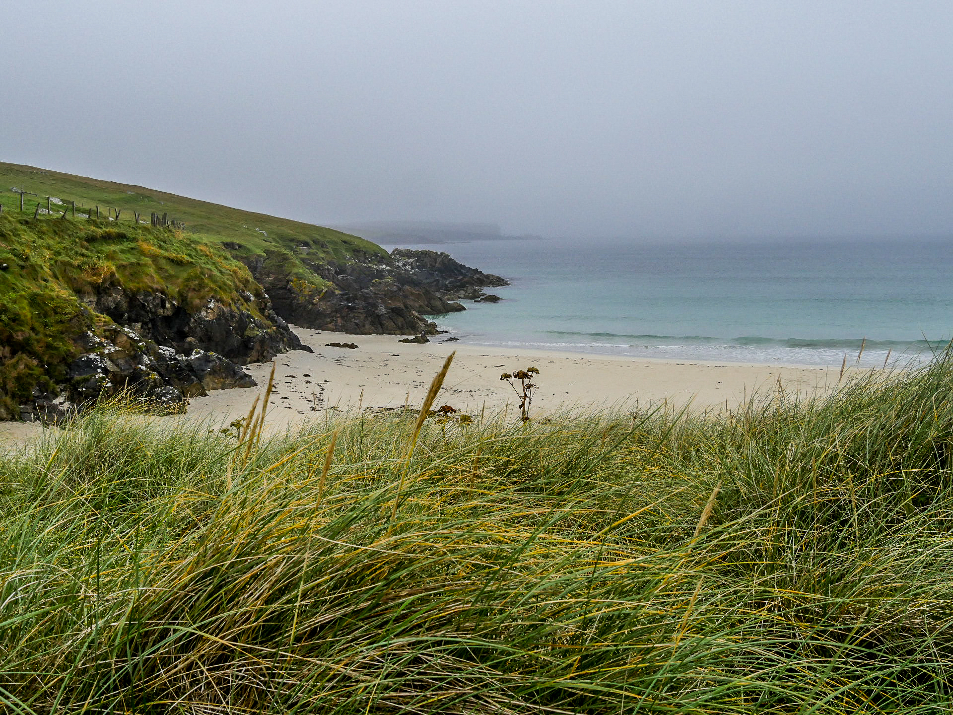 Yell est une île doucement vallonnée, moins spectaculaire que ses sœurs de Mainland et de Unst, elle a quand même le privilège de compter une des plus belles plages des Shetland (et ma préférée) : Sands of Breckon, une large plage de sable doré encadrée par des dunes couvertes de plantes à fleurs. Il en reste quelques-unes mais j’imagine qu’en plein cœur de l’été, ces grandes fleurs blanches qui se détachent du vert foncé des plantes avec une mer turquoise en arrière-plan fait son petit effet. Déjà sous un ciel gris, c’est tout simplement magnifique. Même les couleurs de l’eau arrivent à ressortir sans le soleil pour les illuminer. On peut facilement y faire quelques randonnées. Le lieu est connu pour la richesse de sa flore mais aussi, parce qu’on peut y trouver des restes des différentes civilisations depuis l’âge de fer. On y même trouvé de la monnaie romaine ! Vous risquez aussi de tomber sur l’une ou l’autre faeries. Comme tu peux le voir, Lectrice, Lecteur, j’ai débusqué la porte d’une de leurs maisons. Malheureusement, personne à l’intérieur. Ou peut-être n’ont-elle pas voulu m’ouvrir. 😉