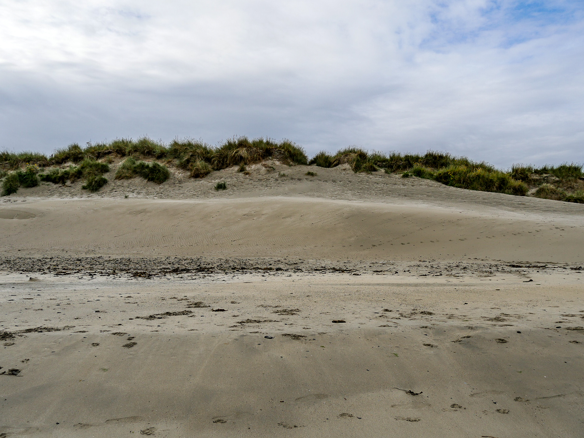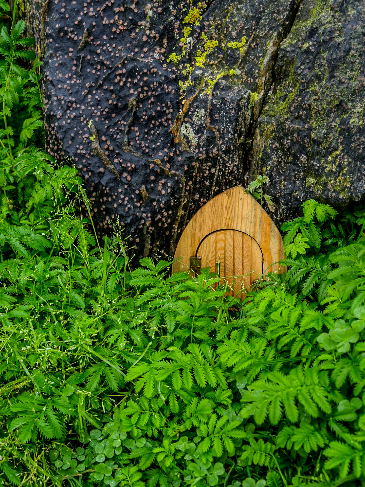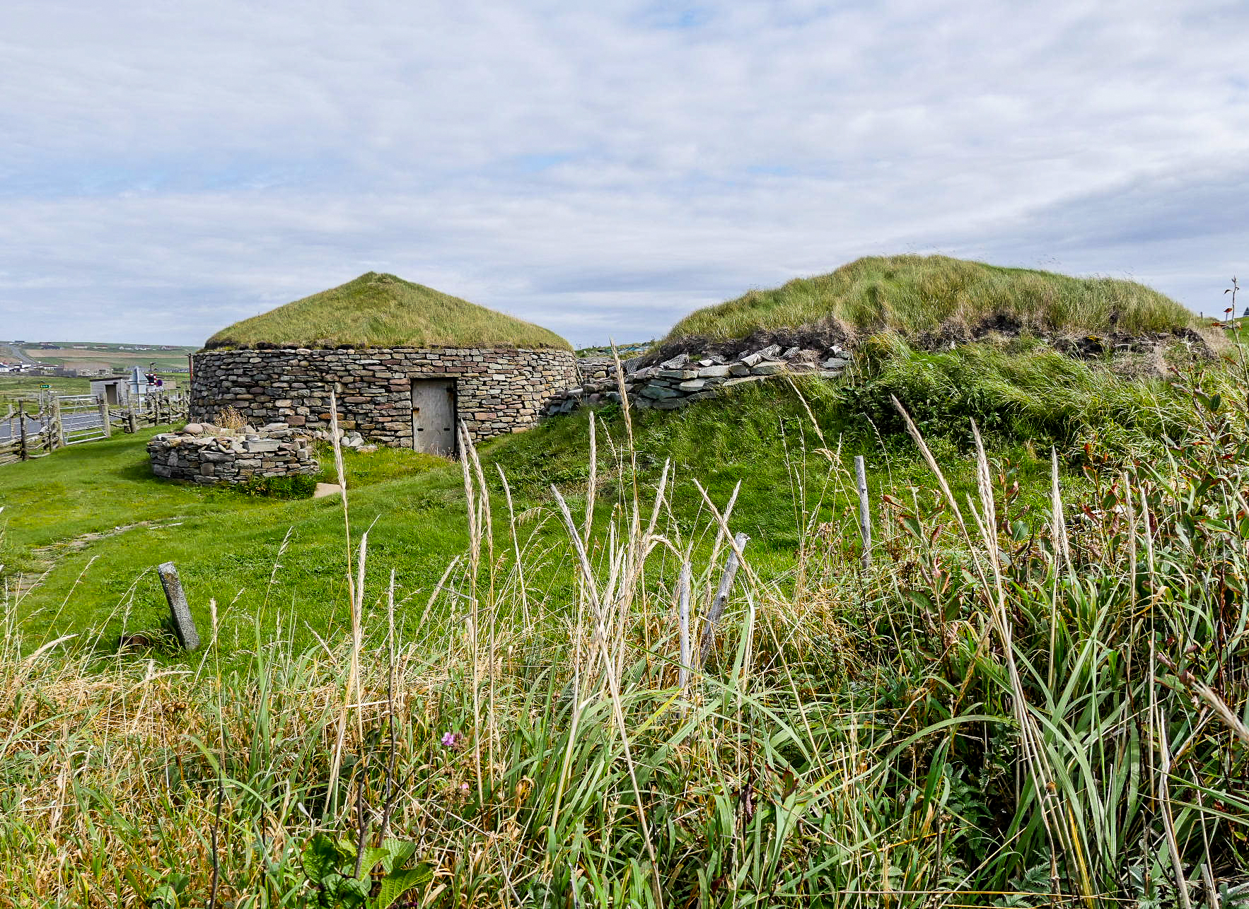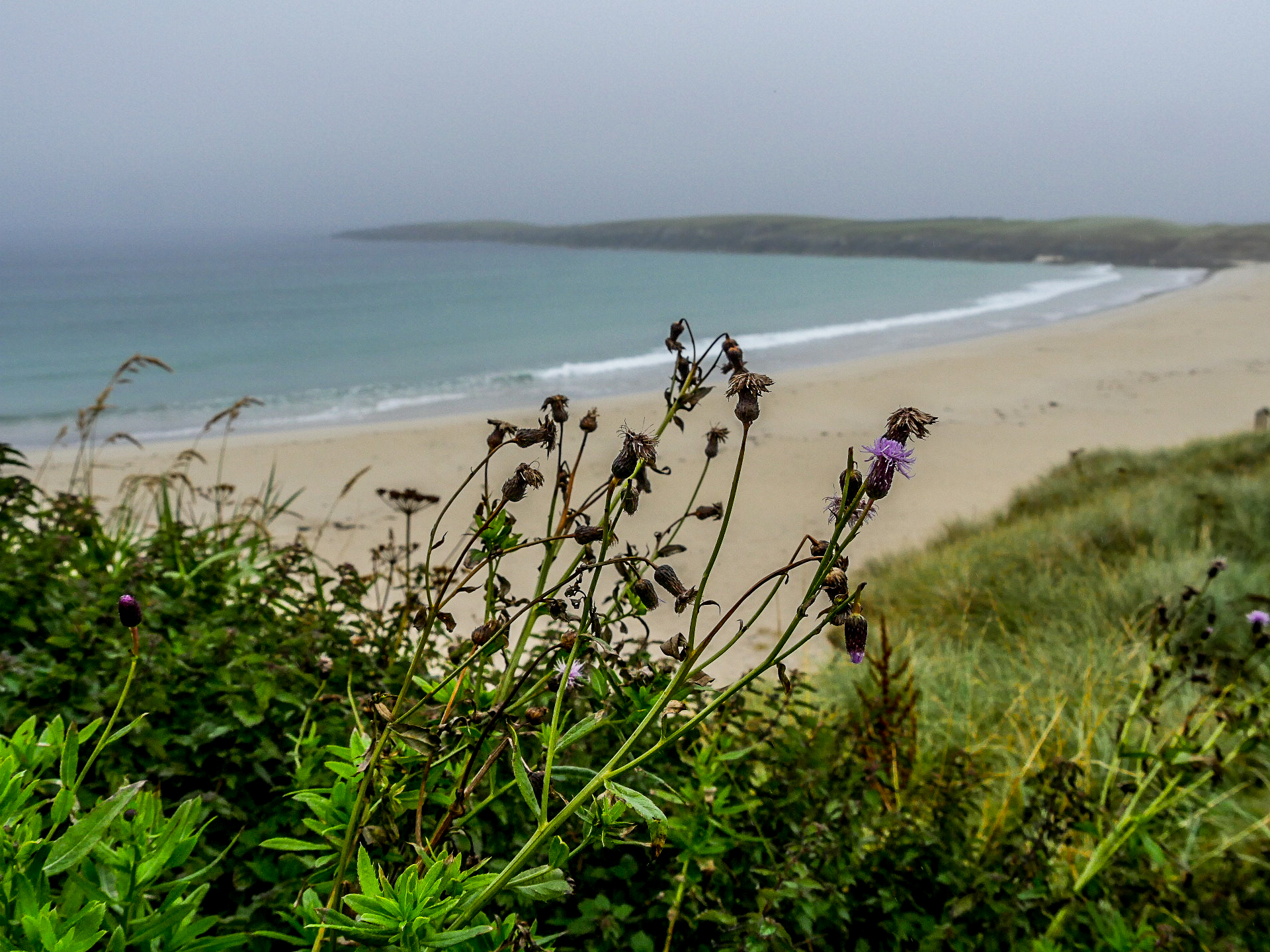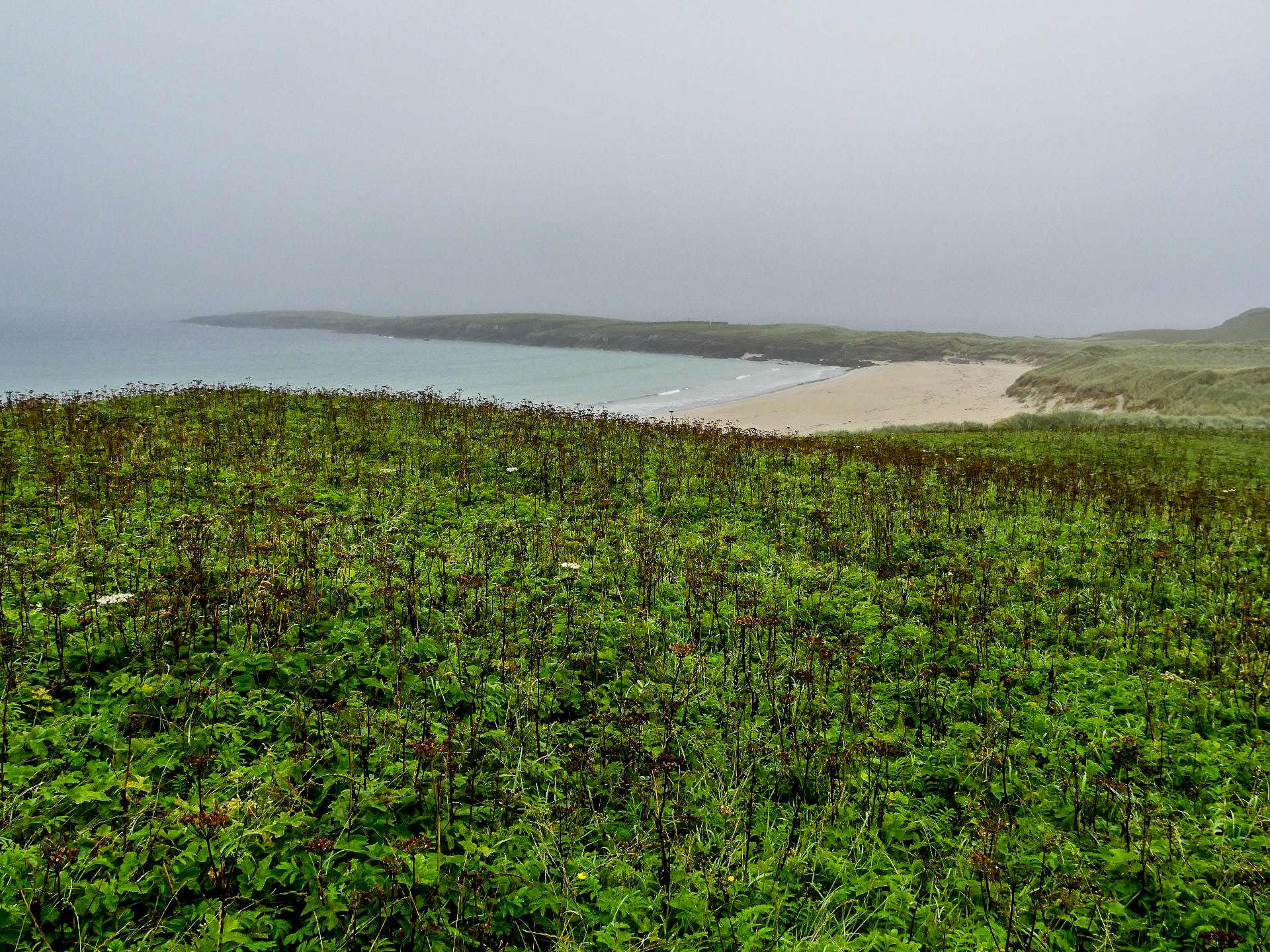 Yell est une île doucement vallonnée, moins spectaculaire que ses sœurs de Mainland et de Unst, elle a quand même le privilège de compter une des plus belles plages des Shetland (et ma préférée) : Sands of Breckon, une large plage de sable doré encadrée par des dunes couvertes de plantes à fleurs. Il en reste quelques-unes mais j’imagine qu’en plein cœur de l’été, ces grandes fleurs blanches qui se détachent du vert foncé des plantes avec une mer turquoise en arrière-plan fait son petit effet. Déjà sous un ciel gris, c’est tout simplement magnifique. Même les couleurs de l’eau arrivent à ressortir sans le soleil pour les illuminer. On peut facilement y faire quelques randonnées. Le lieu est connu pour la richesse de sa flore mais aussi, parce qu’on peut y trouver des restes des différentes civilisations depuis l’âge de fer. On y même trouvé de la monnaie romaine ! Vous risquez aussi de tomber sur l’une ou l’autre faeries. Comme tu peux le voir, Lectrice, Lecteur, j’ai débusqué la porte d’une de leurs maisons. Malheureusement, personne à l’intérieur. Ou peut-être n’ont-elle pas voulu m’ouvrir. 😉