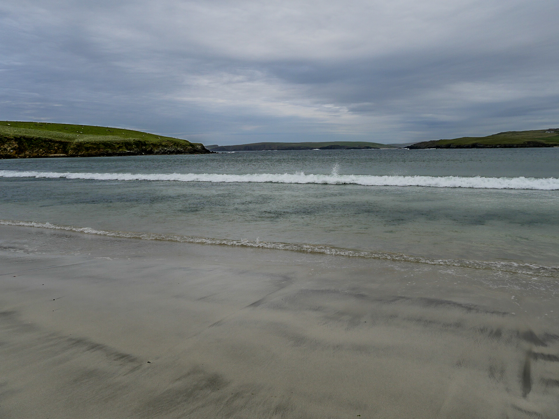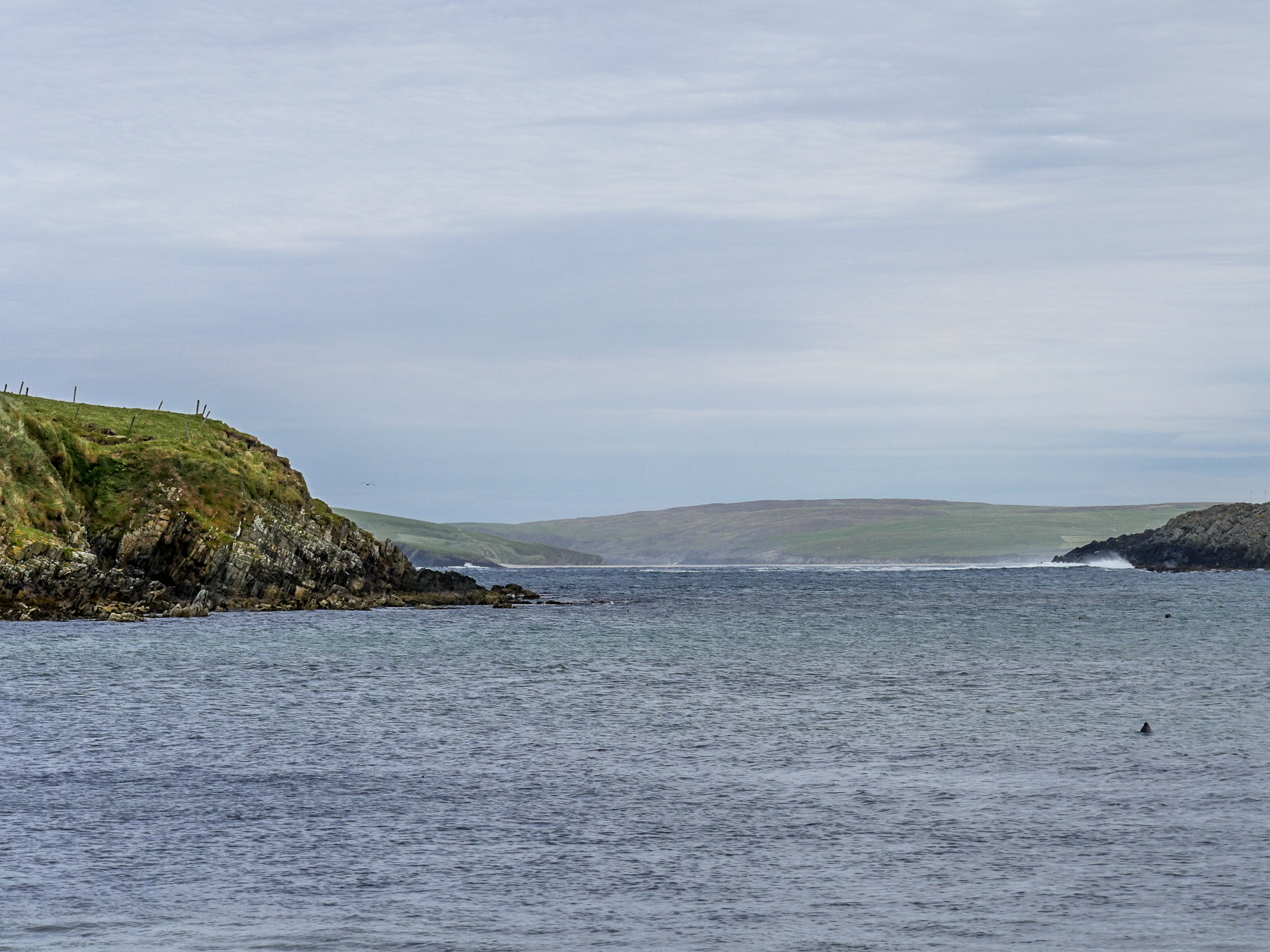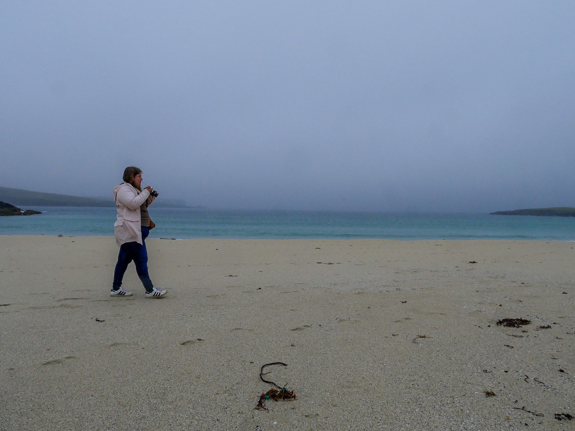 Le lendemain, nous avons une matinée complète pour faire nos au revoir aux Shetland, nous allons donc prendre notre temps pour descendre le long de la côté sud de Mainland. Nous allons prendre le temps de dire au revoir au jeu d’ombres et de lumière sur les collines et la mer. Dire au revoir à ses superbes plages qu’on compte par dizaine en allant voir celle de Scousburgh Sands, que nous avions aperçue de haut le jour de notre arrivée. Dire aussi au revoir à la faune des îles puisqu’à peine arrivées sur cette plage, toute une bande de phoques gris sont venus nous faire la fête et à surfer dans les vagues. Je ne sais qui regardait qui, mais on aurait juré qu’ils redoublaient de présence rien que parce que nous les observions. Un véritable festival de mignonitude marine ! Notre seul regret aura été de ne pas avoir croisé de poneys, un comble pour notre voyage #onnepeutpasonaponey ! Enfin, nous prendrons congé de son patrimoine à l’Old Scatness Broch, un site archéologique, qui malheureusement n’ouvre que les vendredis de la saison touristique.