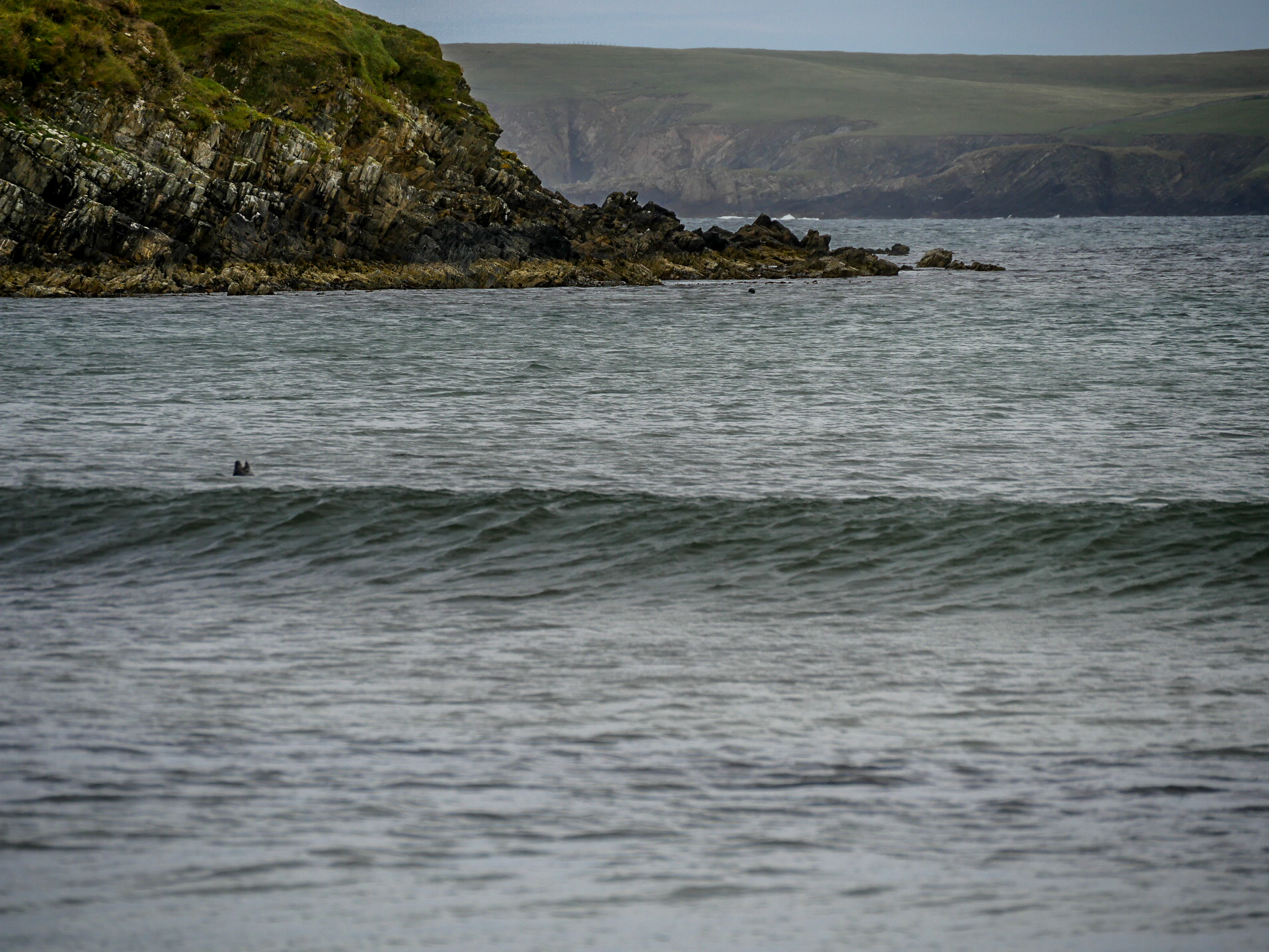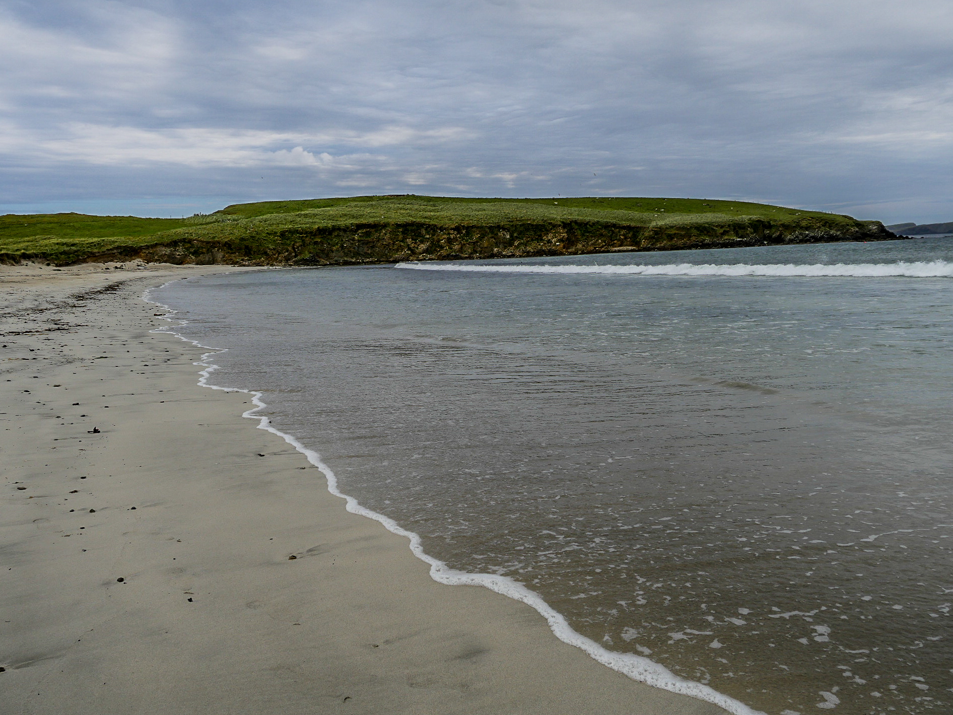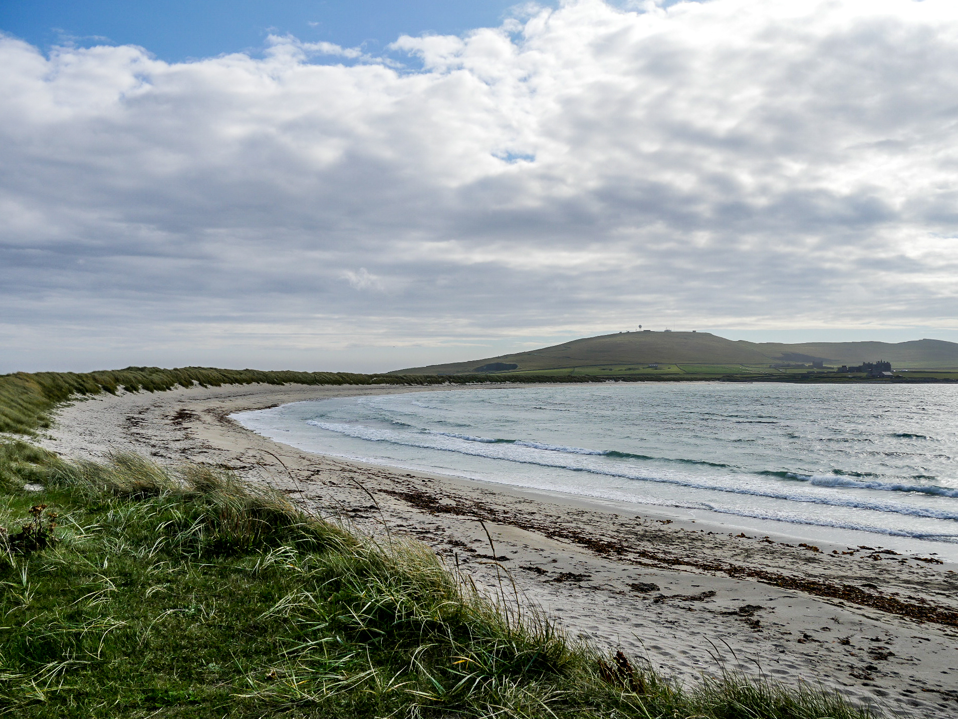 Le lendemain, nous avons une matinée complète pour faire nos au revoir aux Shetland, nous allons donc prendre notre temps pour descendre le long de la côté sud de Mainland. Nous allons prendre le temps de dire au revoir au jeu d’ombres et de lumière sur les collines et la mer. Dire au revoir à ses superbes plages qu’on compte par dizaine en allant voir celle de Scousburgh Sands, que nous avions aperçue de haut le jour de notre arrivée. Dire aussi au revoir à la faune des îles puisqu’à peine arrivées sur cette plage, toute une bande de phoques gris sont venus nous faire la fête et à surfer dans les vagues. Je ne sais qui regardait qui, mais on aurait juré qu’ils redoublaient de présence rien que parce que nous les observions. Un véritable festival de mignonitude marine ! Notre seul regret aura été de ne pas avoir croisé de poneys, un comble pour notre voyage #onnepeutpasonaponey ! Enfin, nous prendrons congé de son patrimoine à l’Old Scatness Broch, un site archéologique, qui malheureusement n’ouvre que les vendredis de la saison touristique.