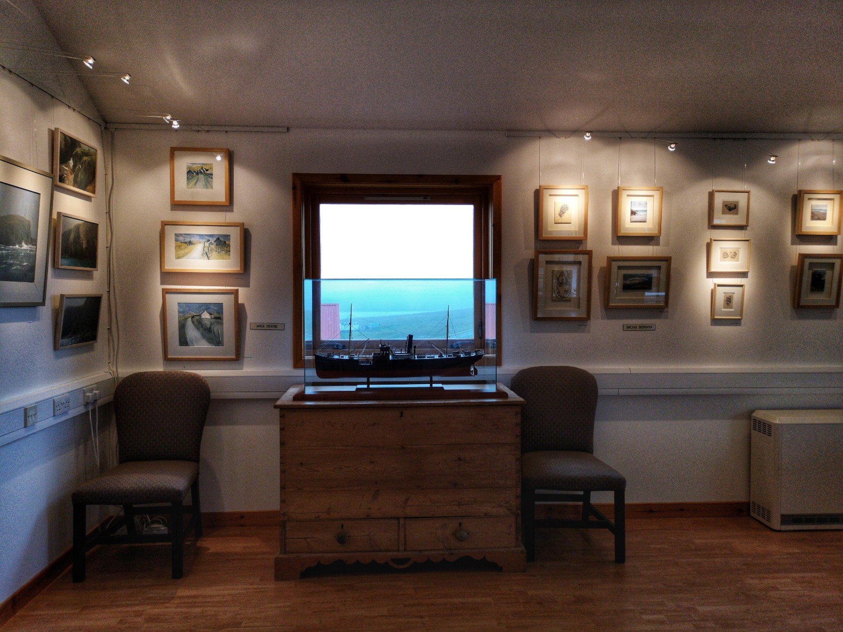 C’est ici que s’est installée Shona Skinner et son mari en 2010. Une partie de la famille de Shona est issue des îles du nord des Shetland et après y être venu plusieurs fois, le couple décide de s’installer et de monter une galerie qui exposerait les artistes et artisans locaux. En 2012, « Shetland Gallery » ouvre ses portes. Et devinez quoi ? C’est la galerie d’art la plus au nord du Royaume-Uni (on commence à avoir l’habitude). Dans l’espace d’exposition, la part belle est faîte aux peintures, qui représentent souvent les paysages d’ici, la mer, les falaises, des cieux tourmentés, les maisons traditionnelles et les ruines, le tout dans les tons sourds qu’on retrouve partout aux Shetland : le vert de la mousse, le bleu marine de la mer, tout le nuancier de gris possible, et quelques fois un peu de jaune. Mais on y trouve aussi des artisans du textile, des bijoutiers, et même un ébéniste. Shona elle-même est une artiste. Ancienne prof, elle peint mais réalise aussi des œuvres en broderie qui ressemble à des peintures texturisées.