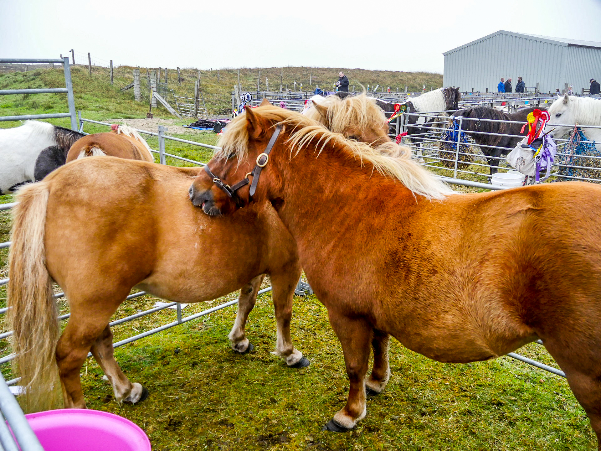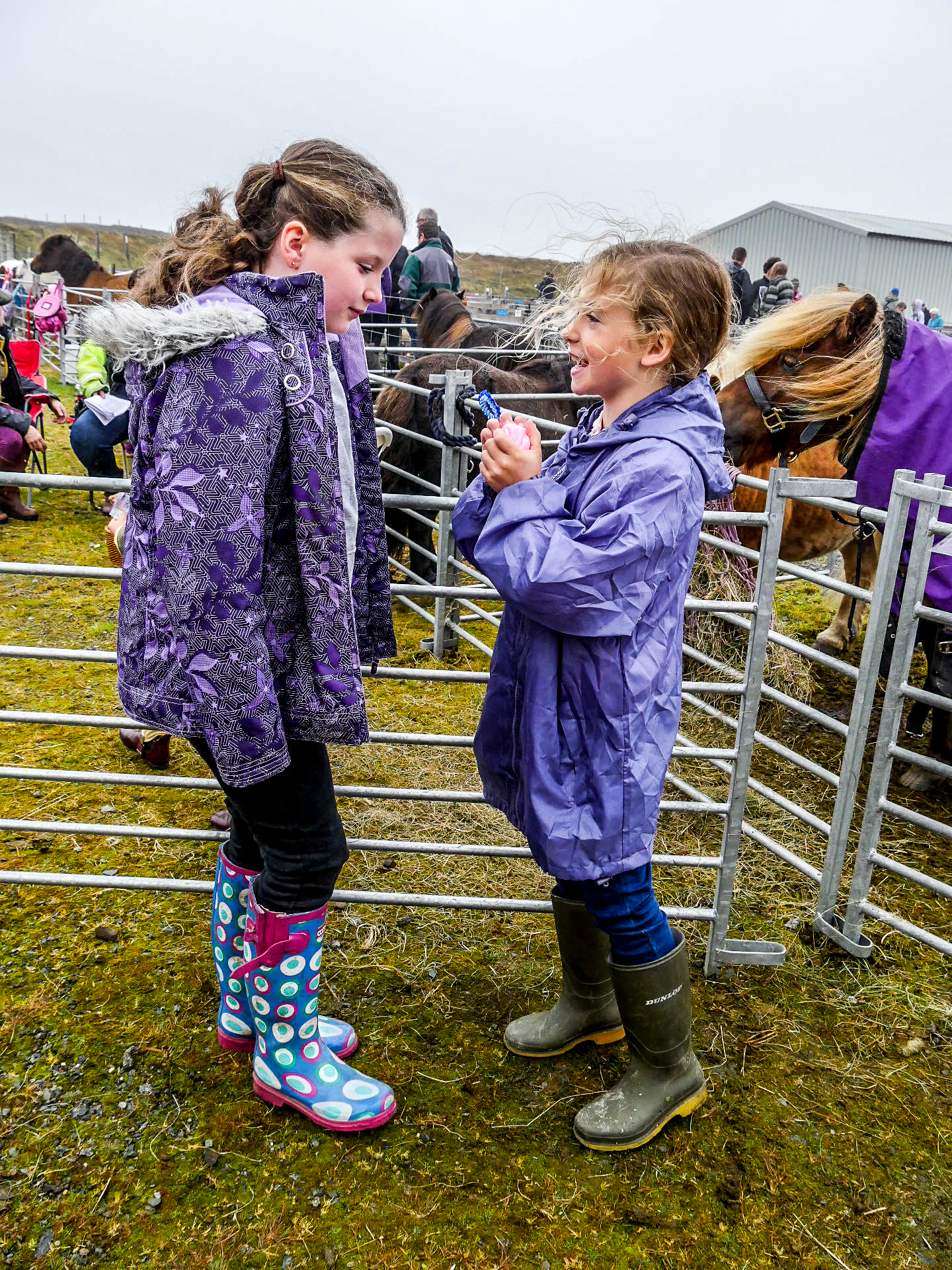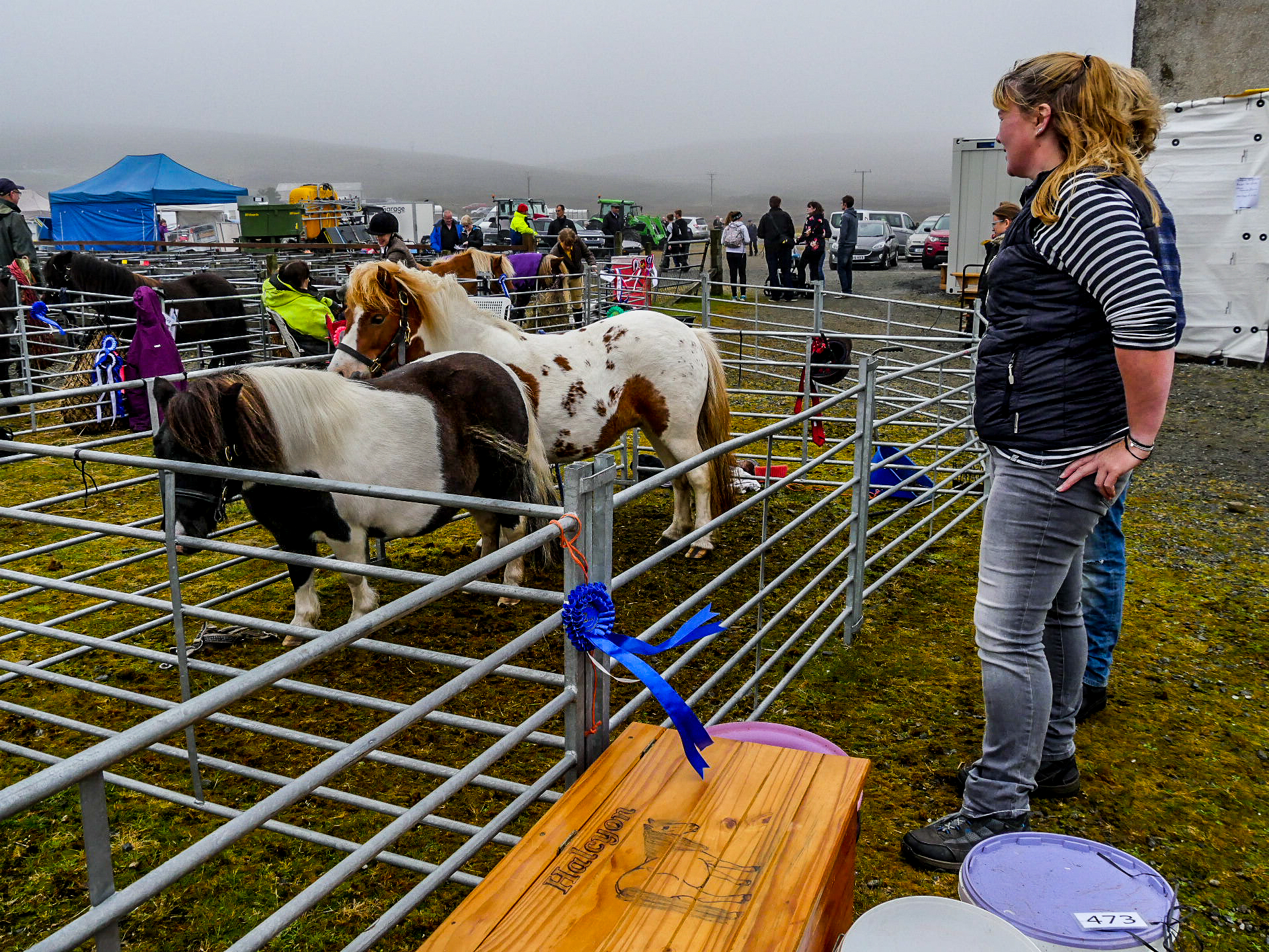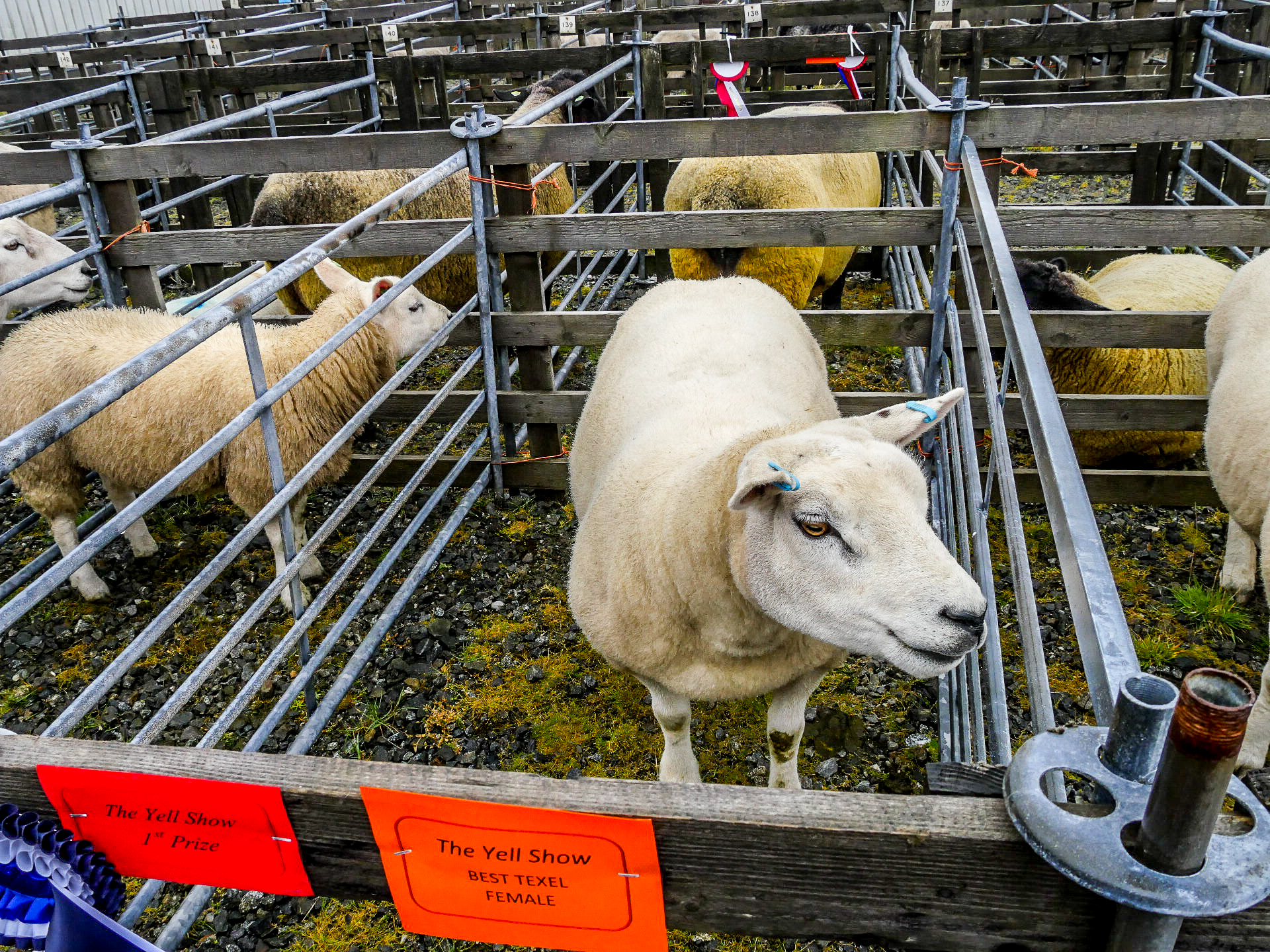 Et en effet, il y a foule ! Je n’ai jamais vu autant de voitures au Shetland, ni autant de gens, de tous âges avec tous comme point commun, d’être venus avec des bottes. La première chose que l’on voit, ce sont les animaux. C’est vraiment un show à l’ancienne où les plus beaux spécimens des animaux des fermes de Yell sont exposés : moutons, poneys, lapins, canards, poules… dont on peut distinguer les vainqueurs à leurs rosettes tricolores. Ce n’est pas la partie que je préfère puisque les animaux sont enfermés dans des enclos parfois petits mais au moins, personne ne les embête.