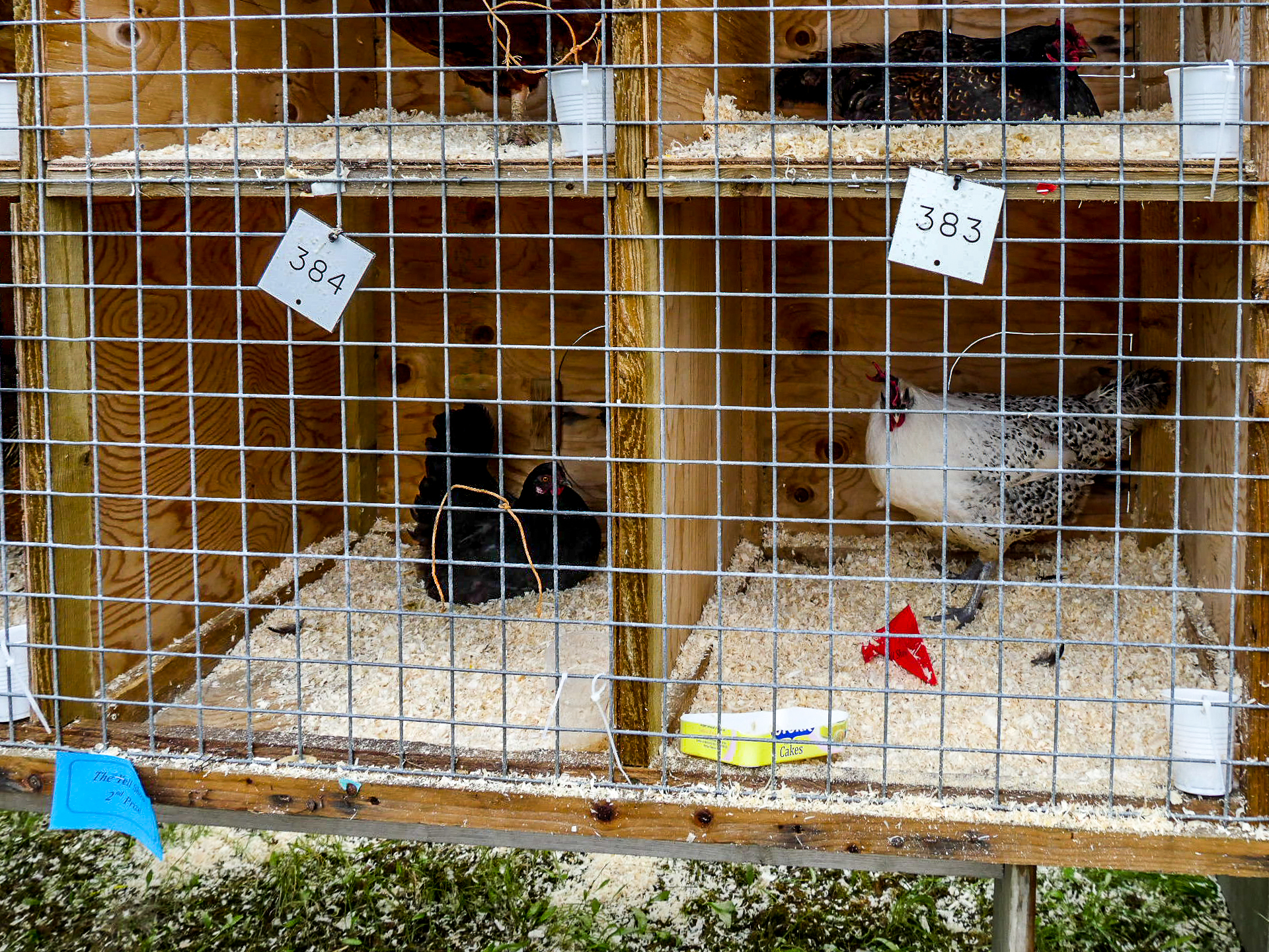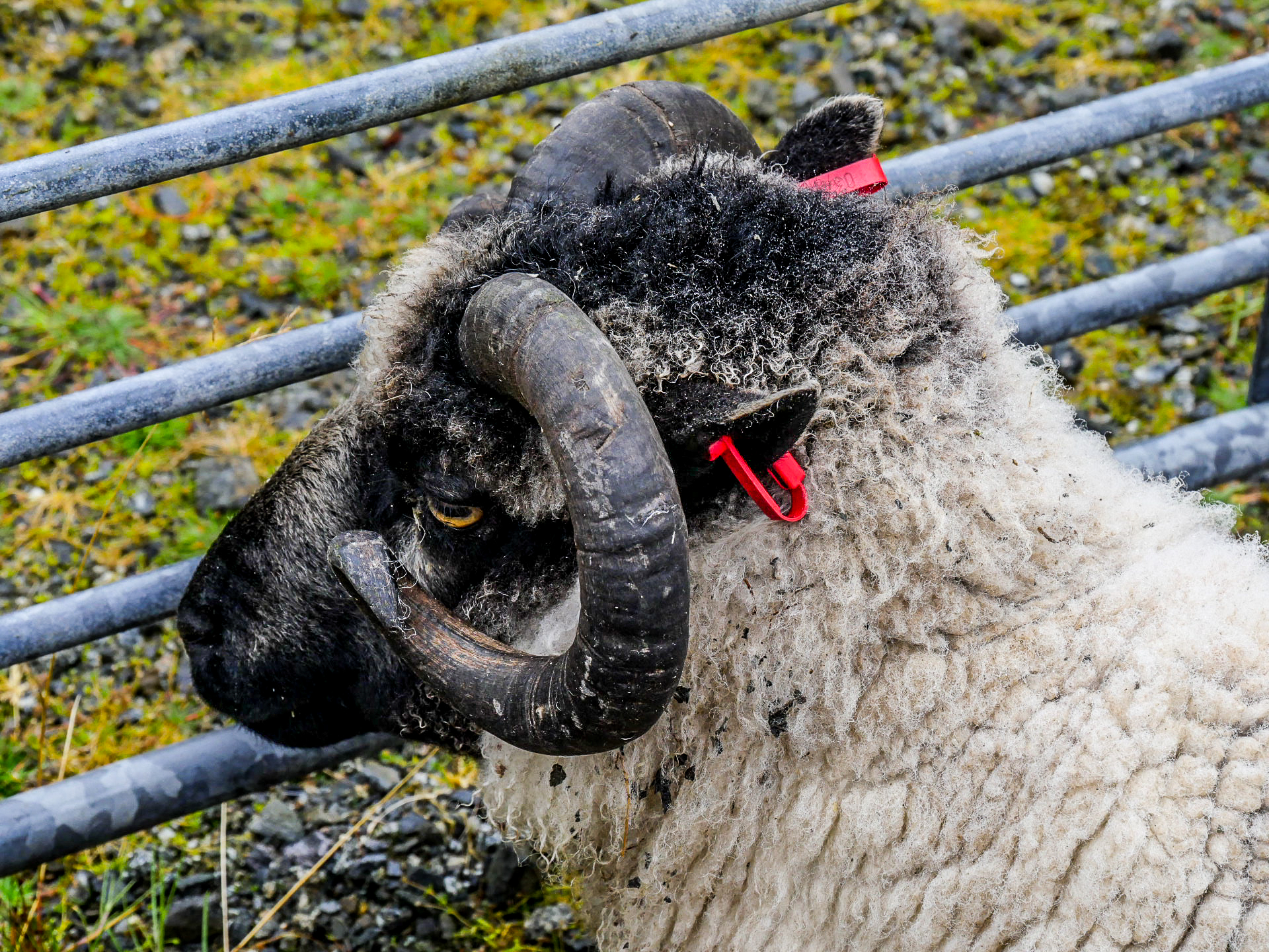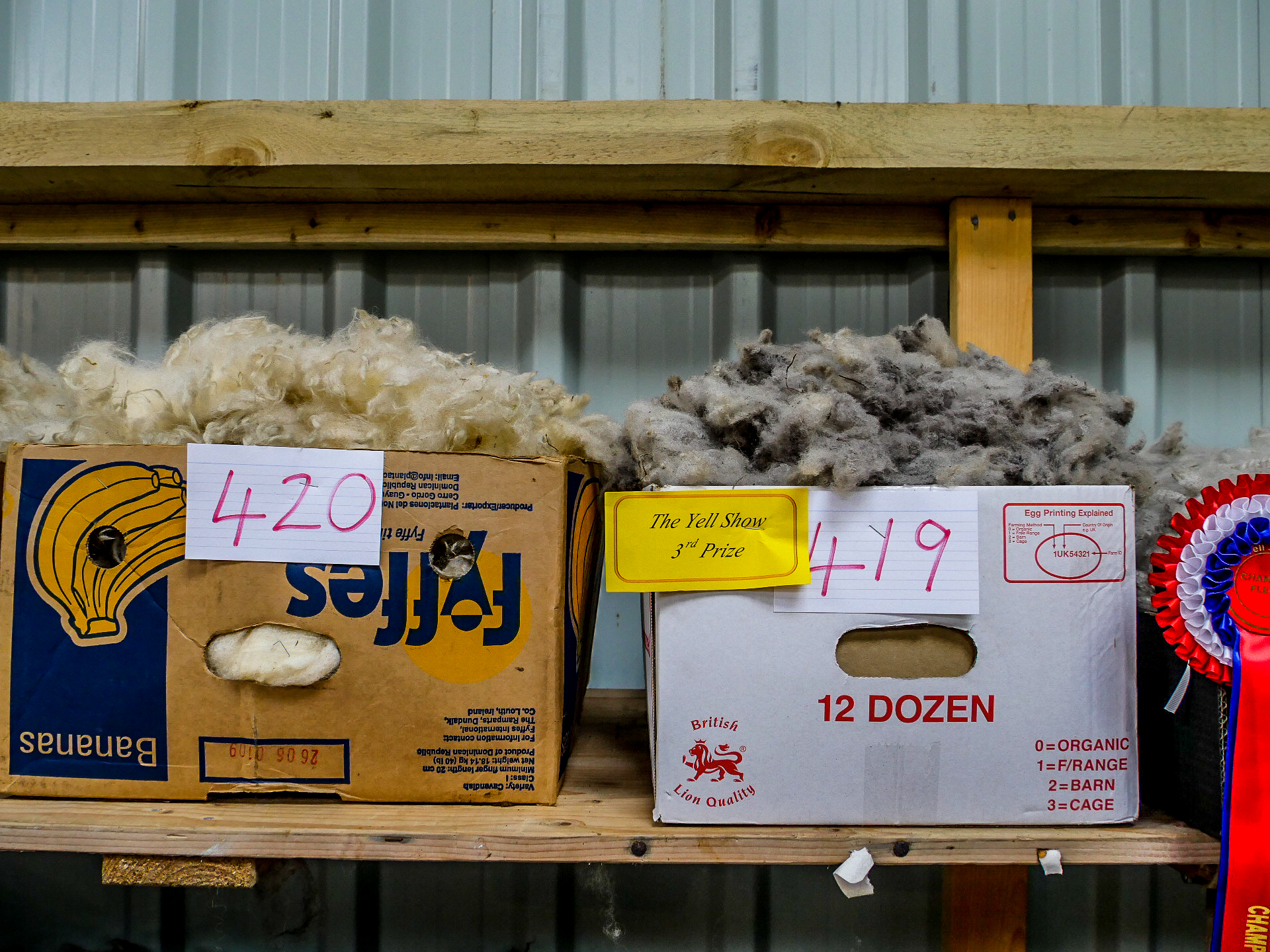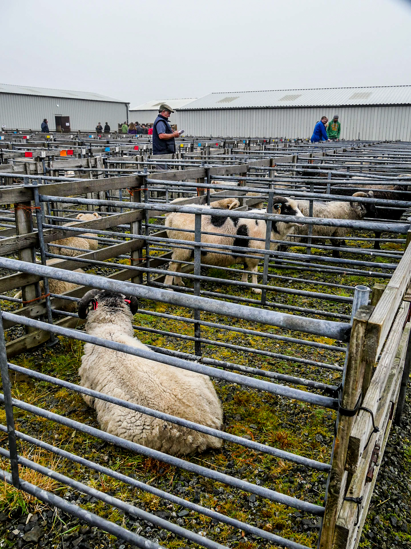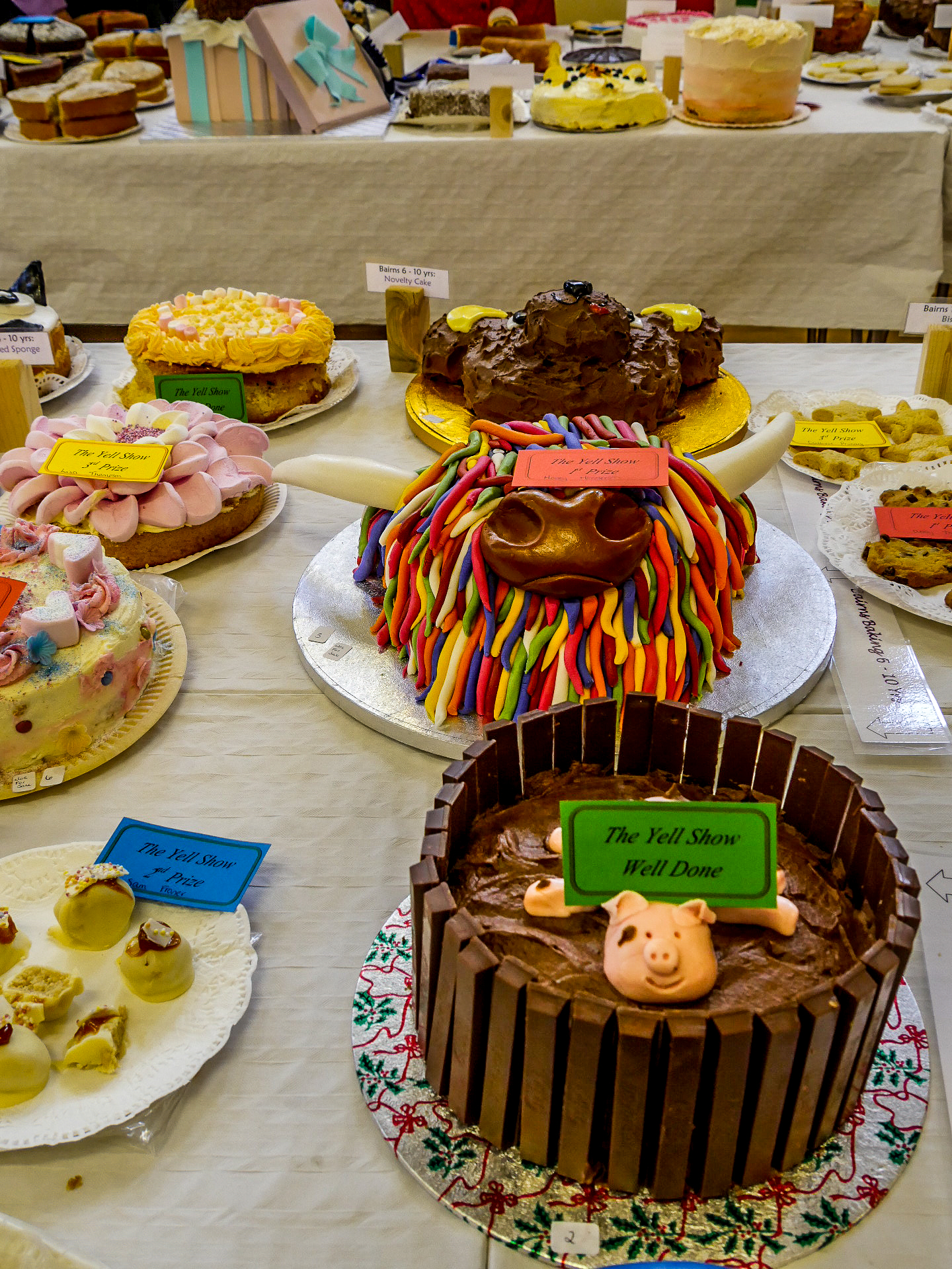 Et en effet, il y a foule ! Je n’ai jamais vu autant de voitures au Shetland, ni autant de gens, de tous âges avec tous comme point commun, d’être venus avec des bottes. La première chose que l’on voit, ce sont les animaux. C’est vraiment un show à l’ancienne où les plus beaux spécimens des animaux des fermes de Yell sont exposés : moutons, poneys, lapins, canards, poules… dont on peut distinguer les vainqueurs à leurs rosettes tricolores. Ce n’est pas la partie que je préfère puisque les animaux sont enfermés dans des enclos parfois petits mais au moins, personne ne les embête.