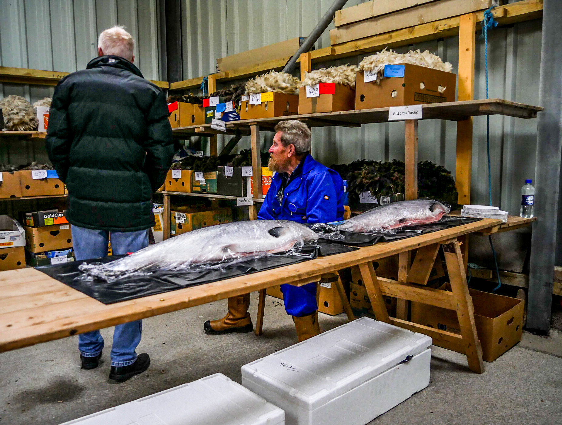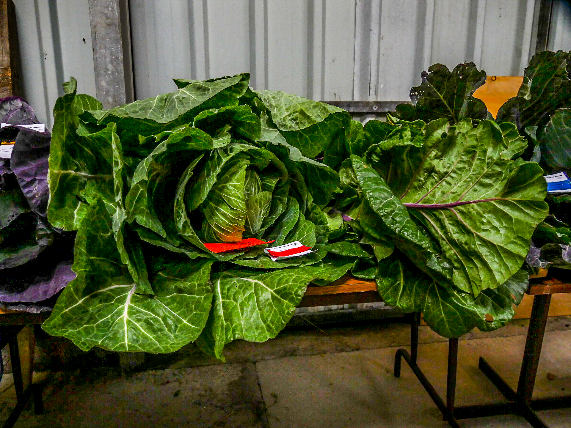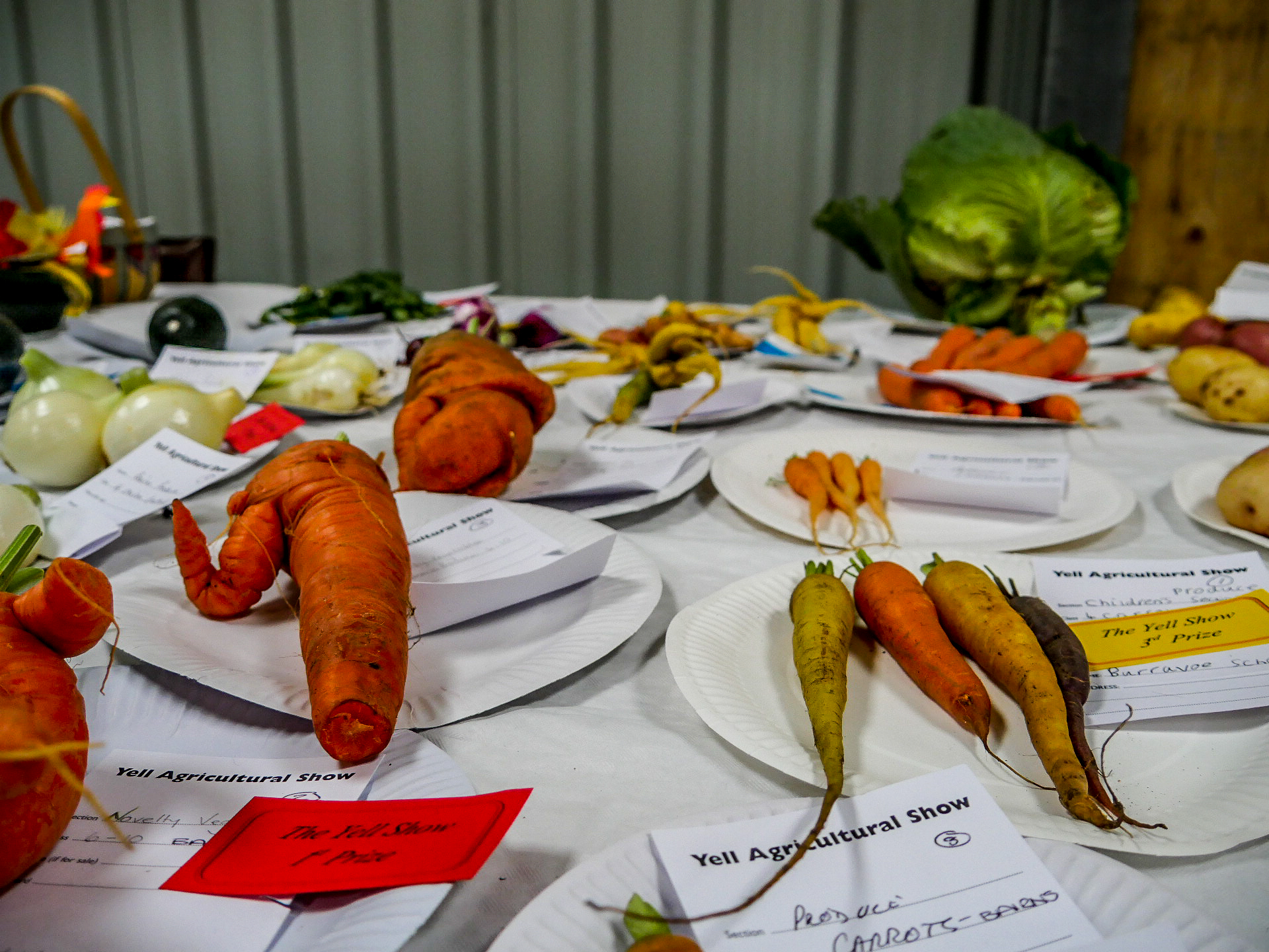 Dans plusieurs bâtiments, on a réparti différentes sections des prix à attribuer. Dans le premier, sont exposés les plus beaux légumes : carottes, pommes de terre et surtout des choux gigantesques ! A côté de tout çà, trônent les fiers maraîchers, ou jardiniers du dimanche pour discuter avec ceux qui viennent prendre conseil pour faire grandir leurs légumes de la même façon. D’autres yeux experts jaugent les d’énormes poissons… mais ce n’est pas la partie qui aura attiré notre attention.