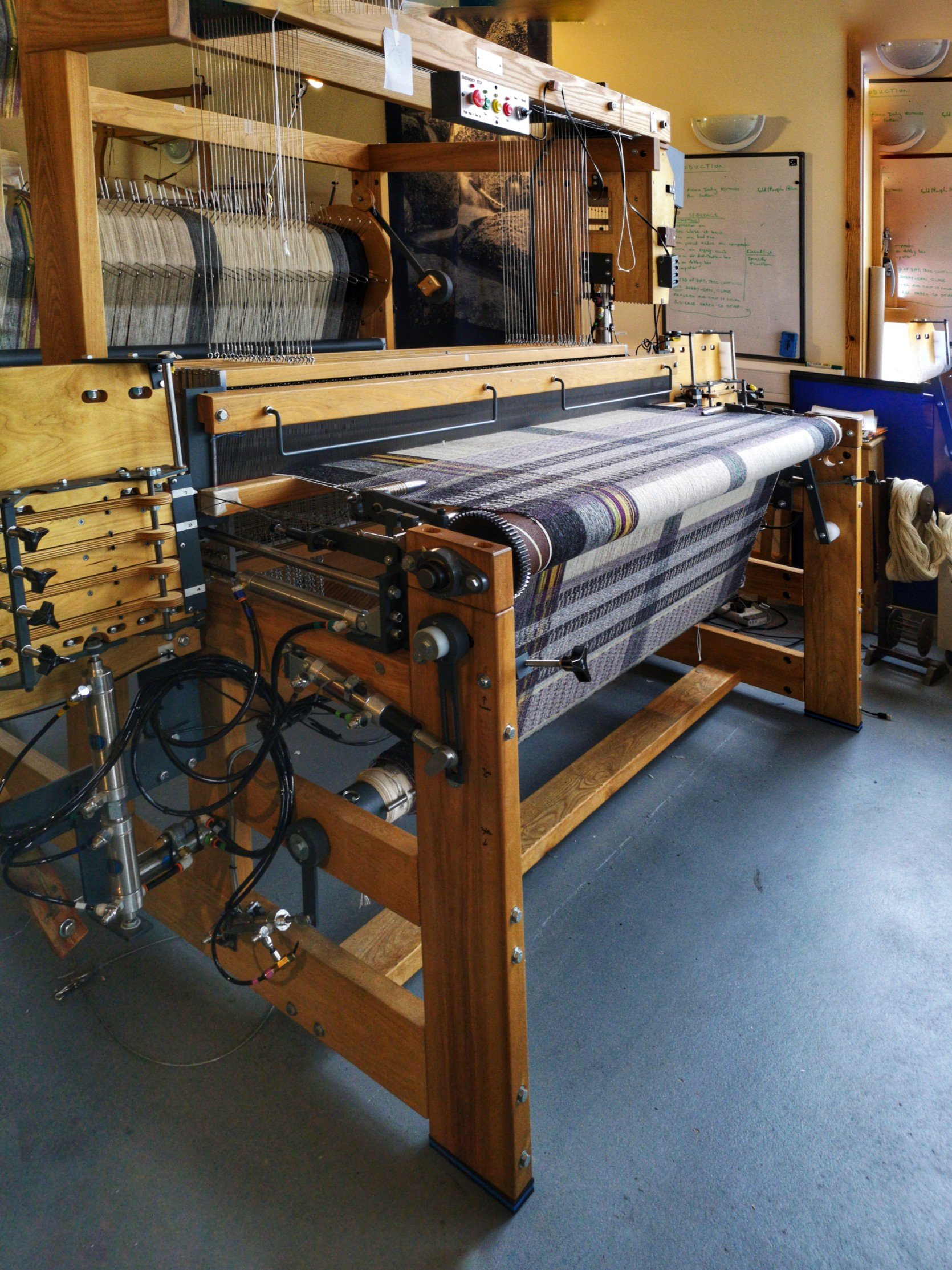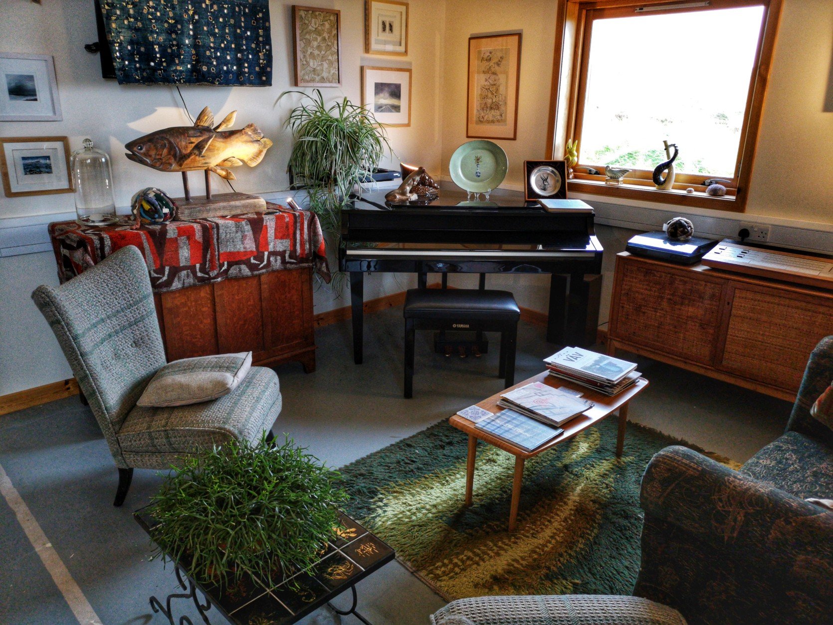 Juste à côté, c’est un homme au parcours tout aussi étonnant qui s’est fait une place dans le monde du textile : Andrew Ross. Andrew a grandi au Zimbabwe. Passionné de musique et de textiles, sa vie l’a amené ici, au Shetland, et plus particulièrement à Yell. Outre le fait qu’il soit prof d’art et de musique, Andy est à la tête d’une association, Global Yell, qui fait la promotion du textile shetlandais, mais aussi de la conservation, de l’échange, des ateliers, et même des visites guidées sur ce thème précis. Son autre bébé, the Shetland Tweed Company, est son entreprise de création de tweed et je peux vous dire que son tissu est de toute beauté. Moi qui ne suit pas trop fan de ce genre de tissu, j’avais envie d’acheter la moitié du magasin (mais du beau tweed, ce n’est pas donné, autant le savoir).