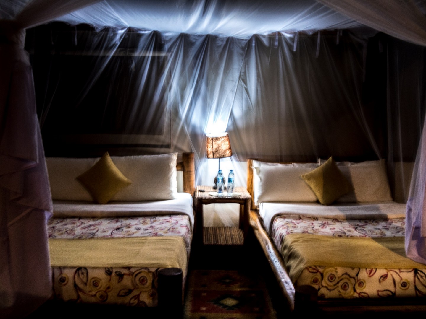 Il fait nuit noire quand nous arrivons enfin à notre logement : l’Ishasha Jungle Lodge et c’est à la lueur des torches que l’on vient nous chercher. On a vraiment l’impression d’être un peu au bout du monde et pourtant… C’est Costantino, un jeune Italien qui est à la tête d’une petite chaîne d’hôtels en Ouganda, et son équipe qui nous accueille dans ce lodge un peu particulier, situé dans sa propre petite forêt (mais je reviendrai sur le logement plus tard).