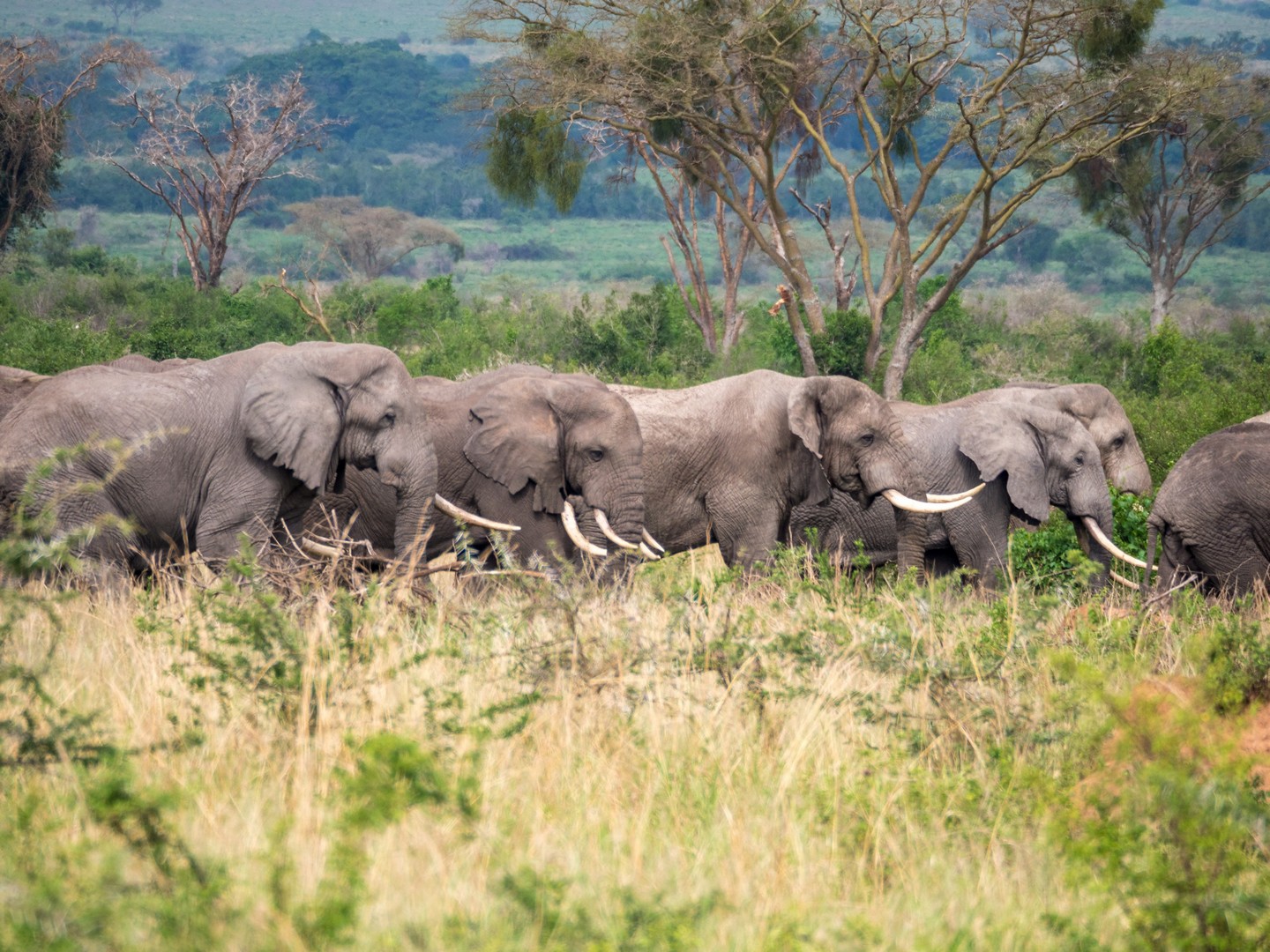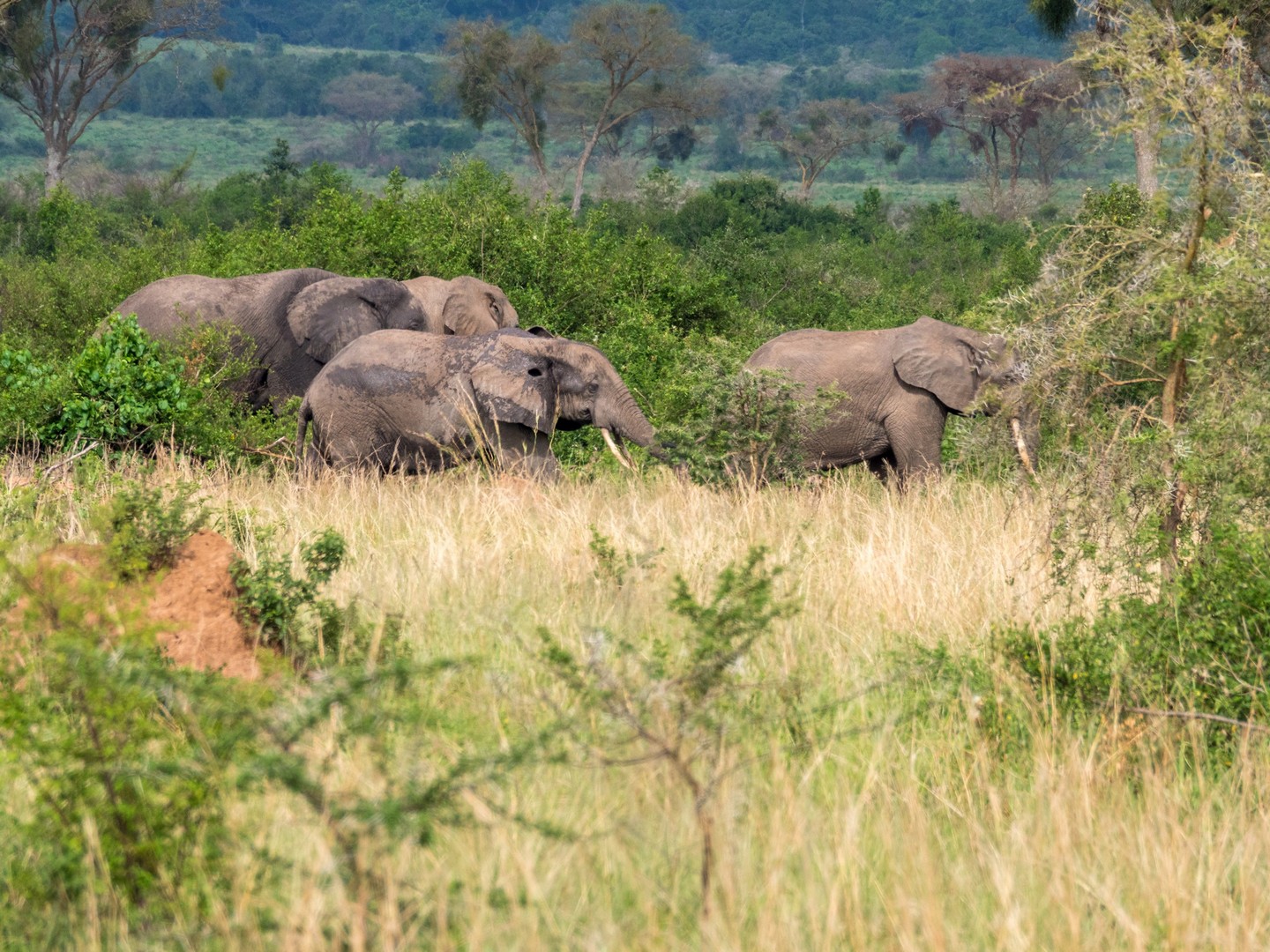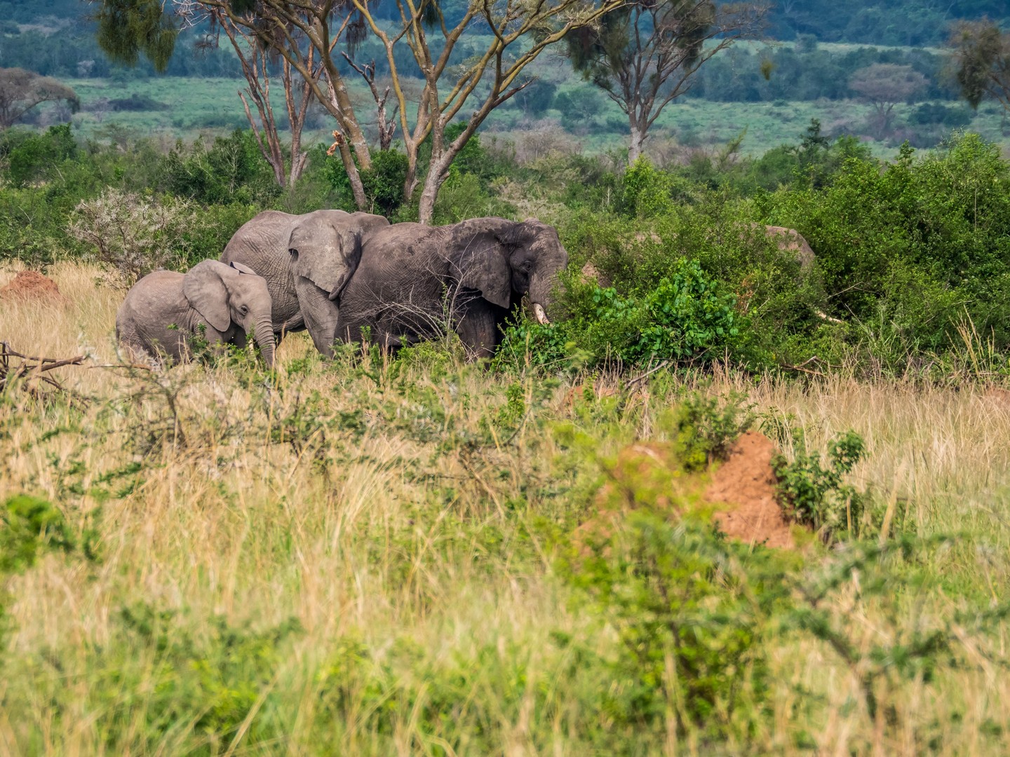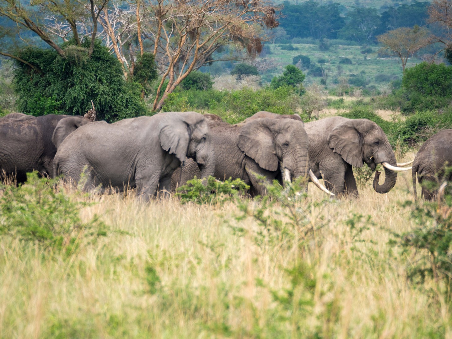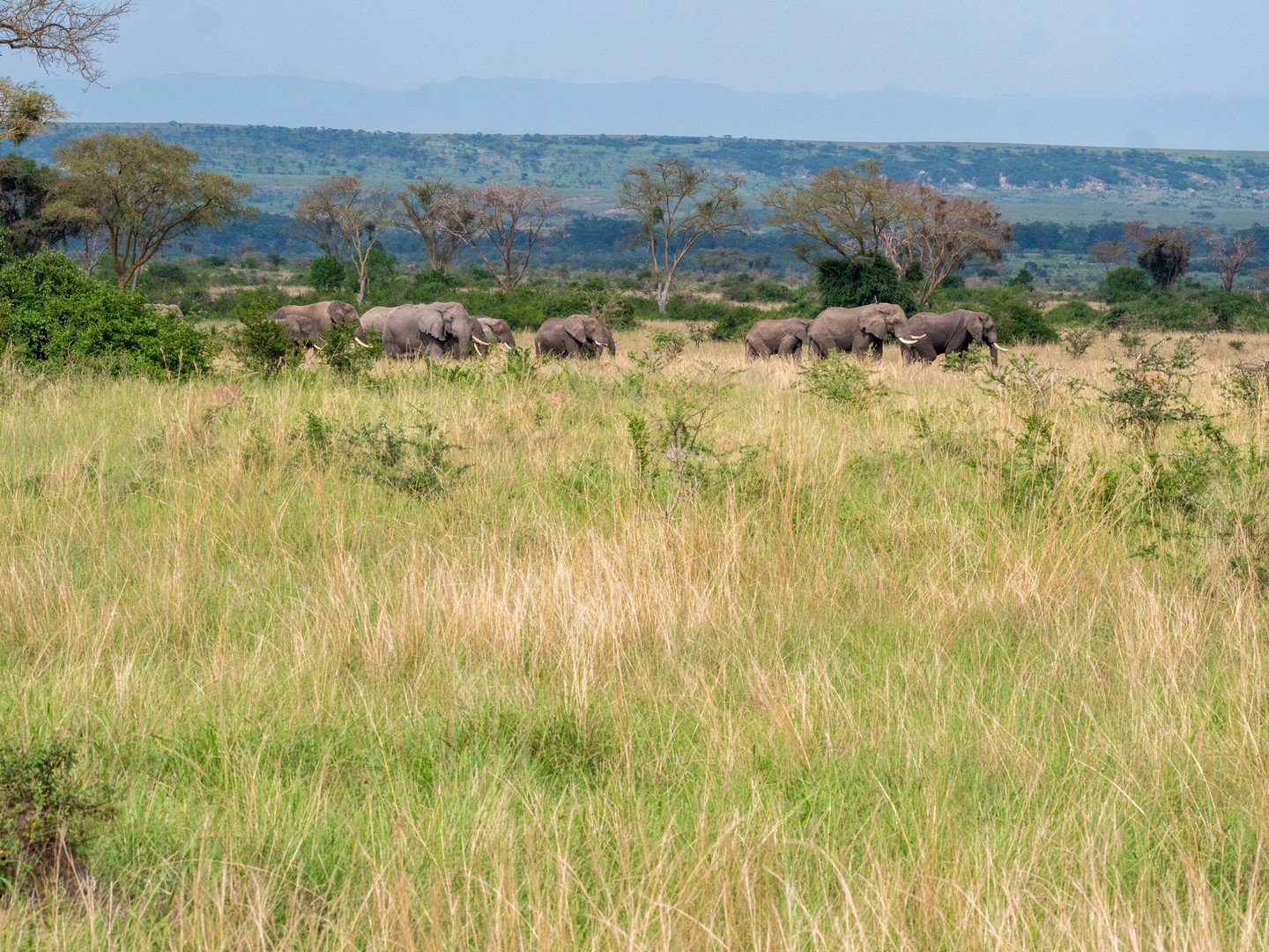 Nous voilà donc lancés en milieu de matinée mais nous allons très vite réaliser que la tâche ne sera pas facile. Comme la matinée est déjà bien avancée, la plupart des animaux ne se montrent pas vraiment. Nous croisons quelques troupeaux de buffles, ce qui est toujours impressionnant, mais pas grand chose d’autre. Chaque arbre aux branches étendues et tortueuses est scruté avec attention mais pas la moindre crinière à l’horizon ! Nous aurons quand même droit à un spectacle qu’on ne voit pas tous les jours… cela commence par un petit groupe d’éléphants qui déboule de derrière de gros buissons. Sauf que d’autres suivent, et suivent encore. Il doit y avoir pas moins de 40 pachydermes, ce qui est exceptionnel ! Le souffle coupé, nous les contemplons. En petits noyaux, mais toujours ensemble, ils se suivent les uns, les autres, marchant comme au ralenti. Protégeant les quelques jeunes entre deux adultes. Où vont-ils ? Seuls la tête du groupe le sait mais cette vision restera l’une des plus impressionnantes de ce voyage en Ouganda.