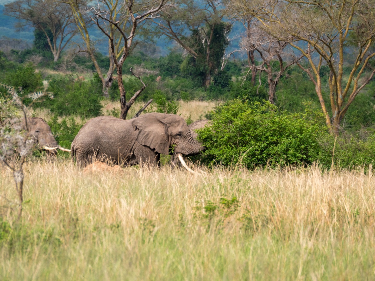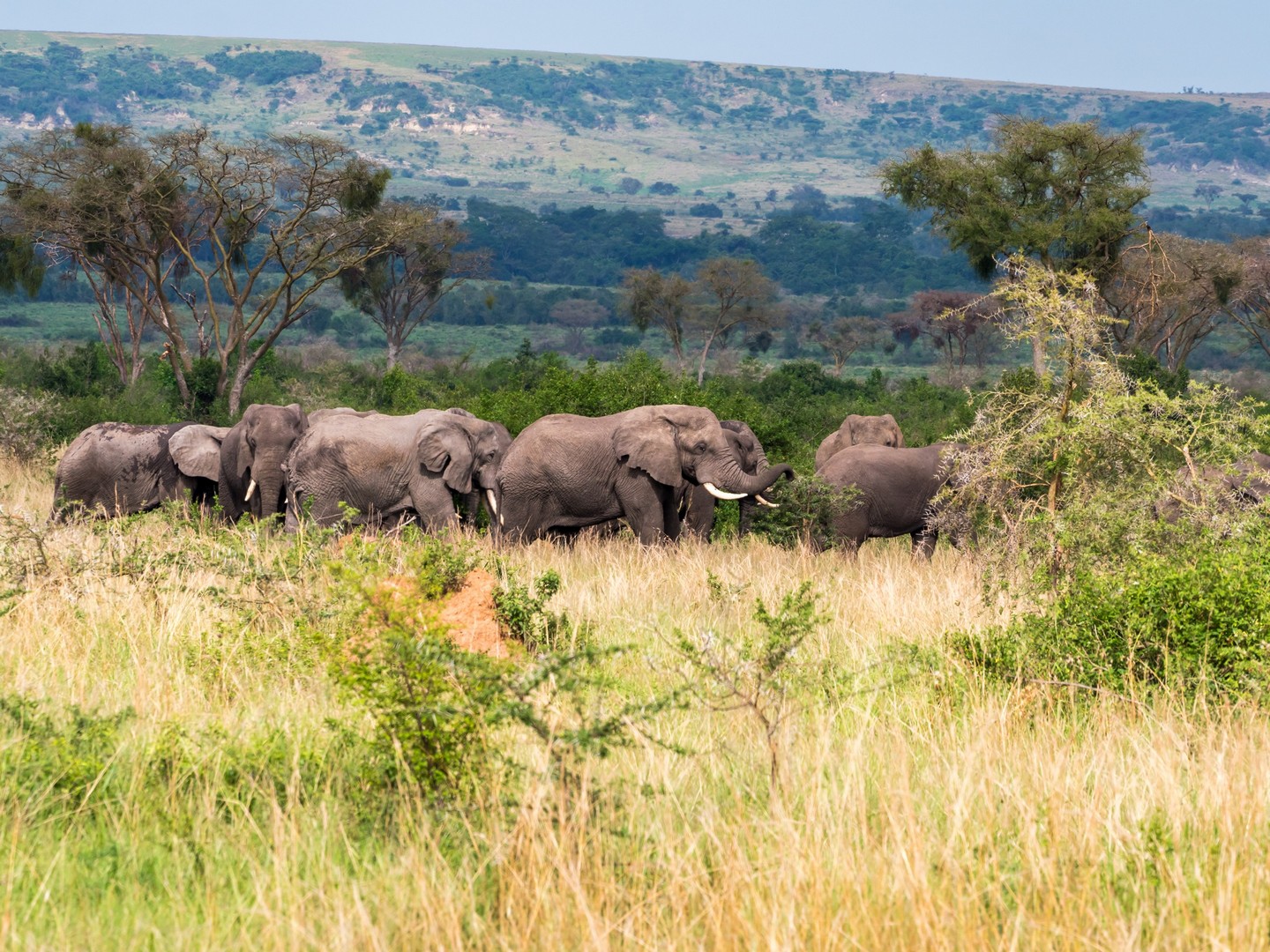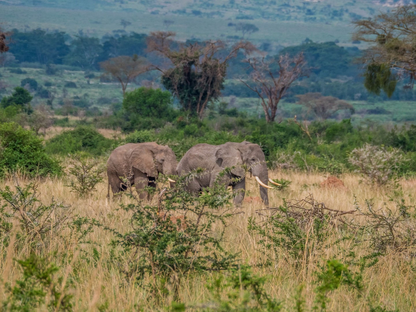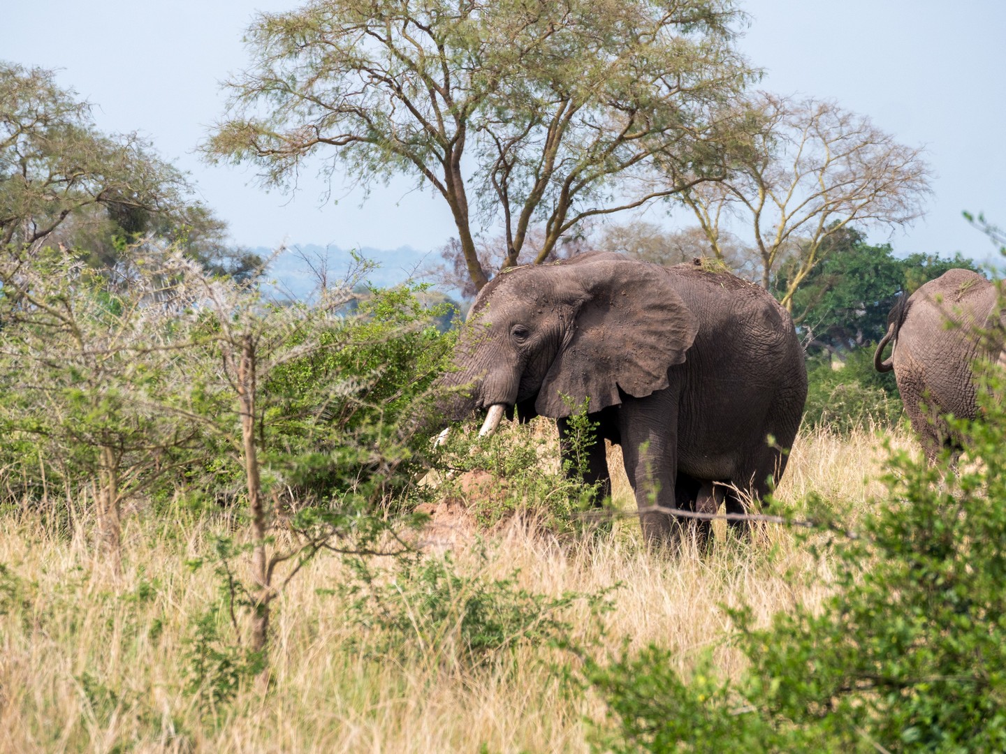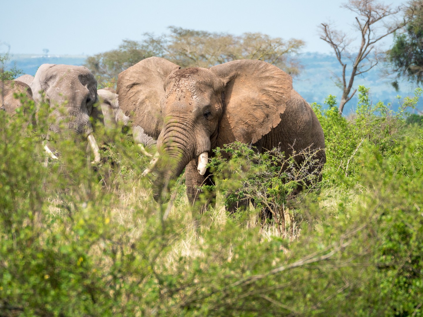 Nous voilà donc lancés en milieu de matinée mais nous allons très vite réaliser que la tâche ne sera pas facile. Comme la matinée est déjà bien avancée, la plupart des animaux ne se montrent pas vraiment. Nous croisons quelques troupeaux de buffles, ce qui est toujours impressionnant, mais pas grand chose d’autre. Chaque arbre aux branches étendues et tortueuses est scruté avec attention mais pas la moindre crinière à l’horizon ! Nous aurons quand même droit à un spectacle qu’on ne voit pas tous les jours… cela commence par un petit groupe d’éléphants qui déboule de derrière de gros buissons. Sauf que d’autres suivent, et suivent encore. Il doit y avoir pas moins de 40 pachydermes, ce qui est exceptionnel ! Le souffle coupé, nous les contemplons. En petits noyaux, mais toujours ensemble, ils se suivent les uns, les autres, marchant comme au ralenti. Protégeant les quelques jeunes entre deux adultes. Où vont-ils ? Seuls la tête du groupe le sait mais cette vision restera l’une des plus impressionnantes de ce voyage en Ouganda.