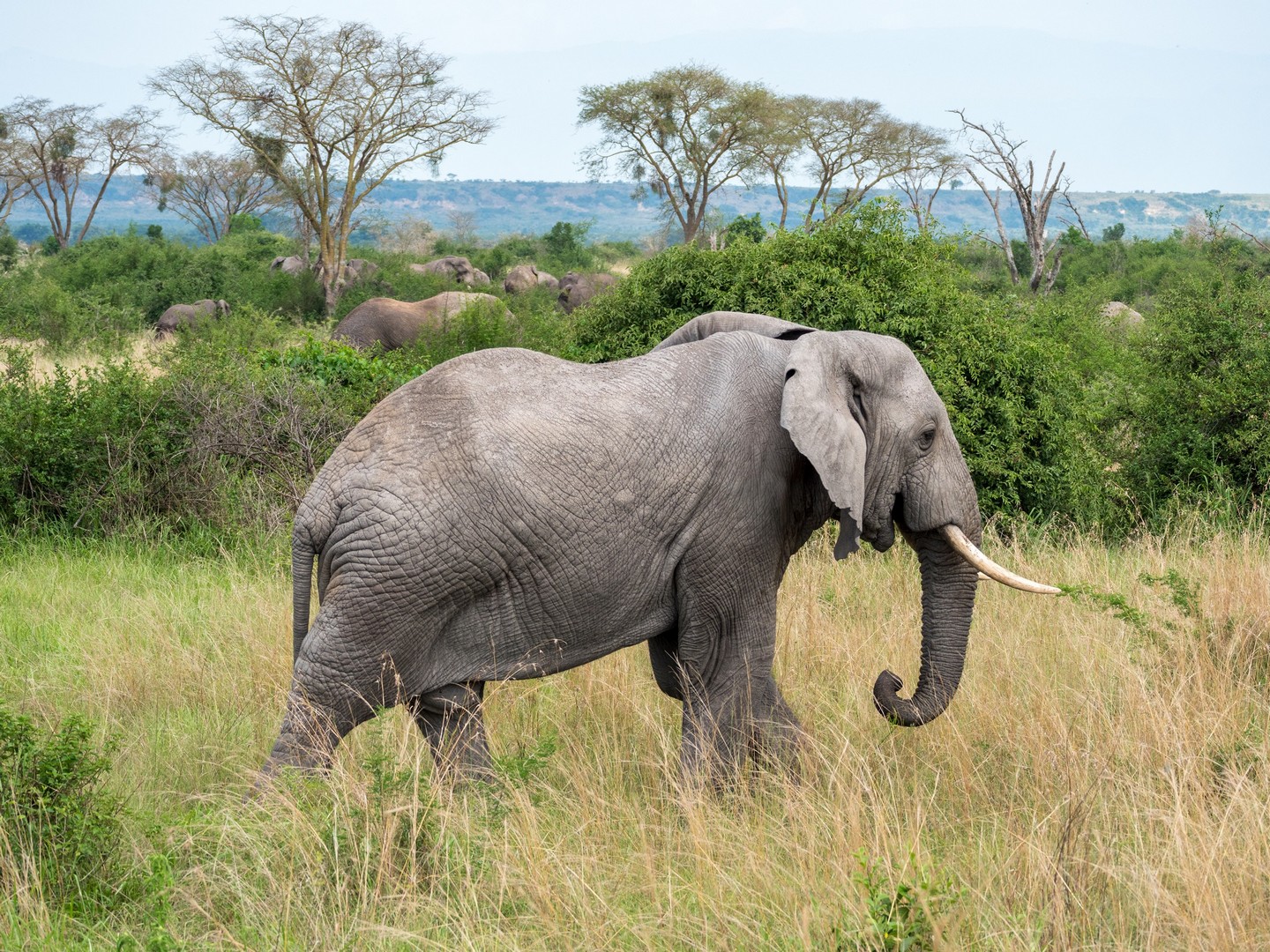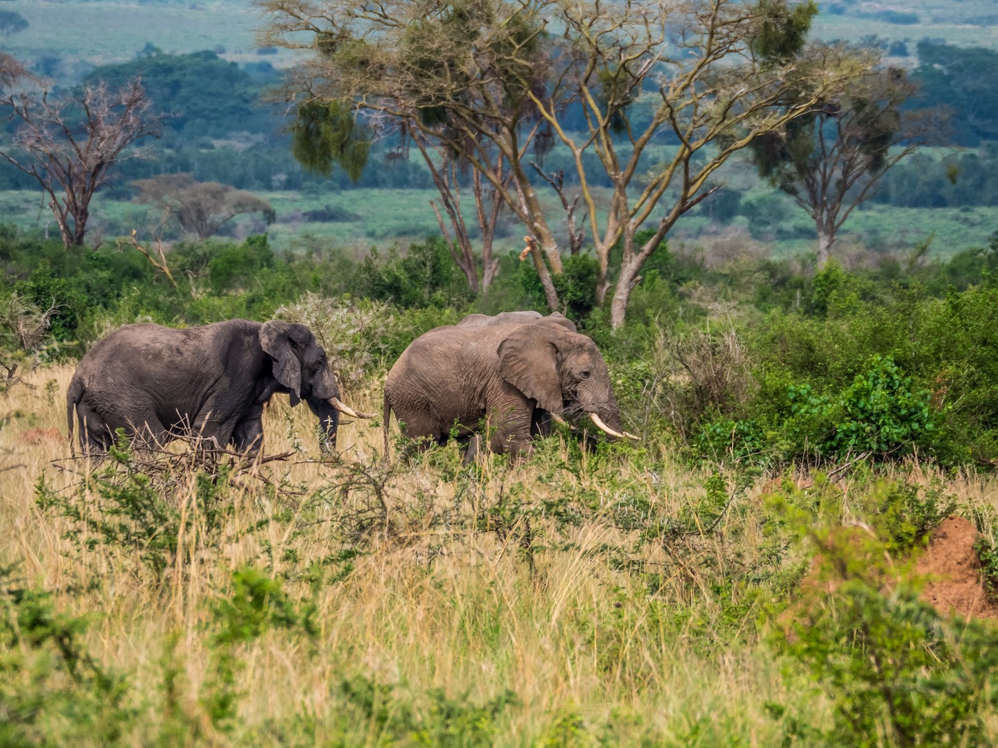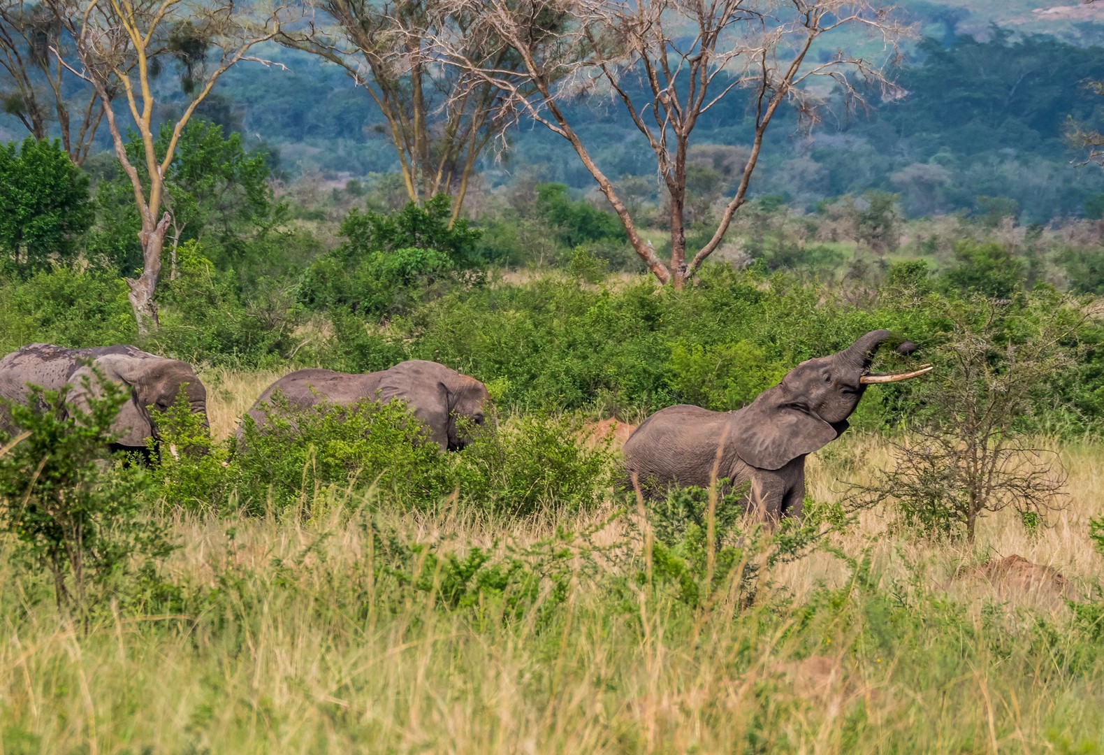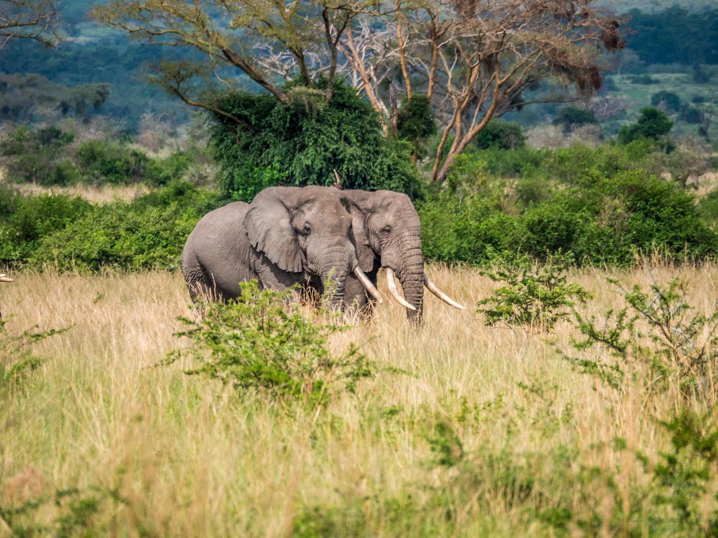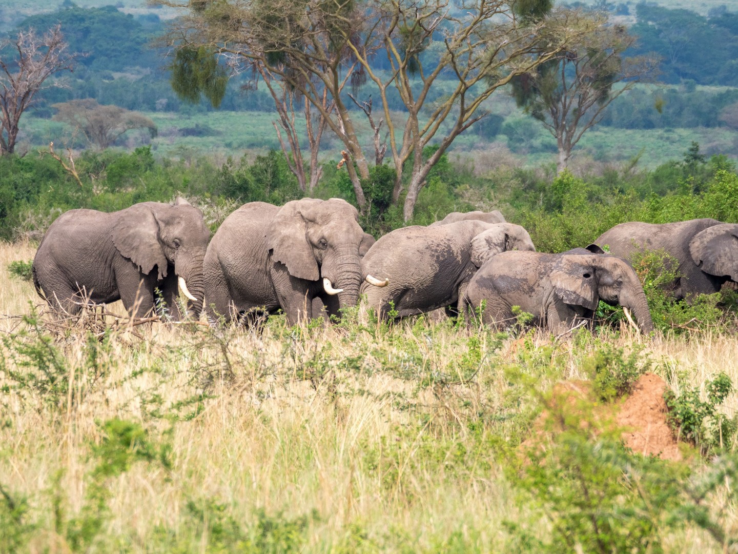 Nous voilà donc lancés en milieu de matinée mais nous allons très vite réaliser que la tâche ne sera pas facile. Comme la matinée est déjà bien avancée, la plupart des animaux ne se montrent pas vraiment. Nous croisons quelques troupeaux de buffles, ce qui est toujours impressionnant, mais pas grand chose d’autre. Chaque arbre aux branches étendues et tortueuses est scruté avec attention mais pas la moindre crinière à l’horizon ! Nous aurons quand même droit à un spectacle qu’on ne voit pas tous les jours… cela commence par un petit groupe d’éléphants qui déboule de derrière de gros buissons. Sauf que d’autres suivent, et suivent encore. Il doit y avoir pas moins de 40 pachydermes, ce qui est exceptionnel ! Le souffle coupé, nous les contemplons. En petits noyaux, mais toujours ensemble, ils se suivent les uns, les autres, marchant comme au ralenti. Protégeant les quelques jeunes entre deux adultes. Où vont-ils ? Seuls la tête du groupe le sait mais cette vision restera l’une des plus impressionnantes de ce voyage en Ouganda.