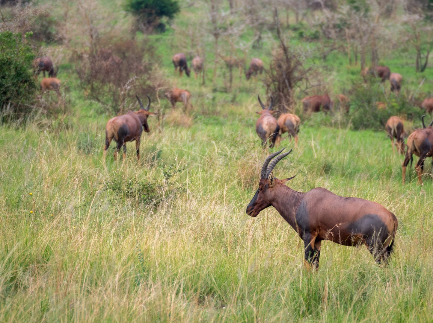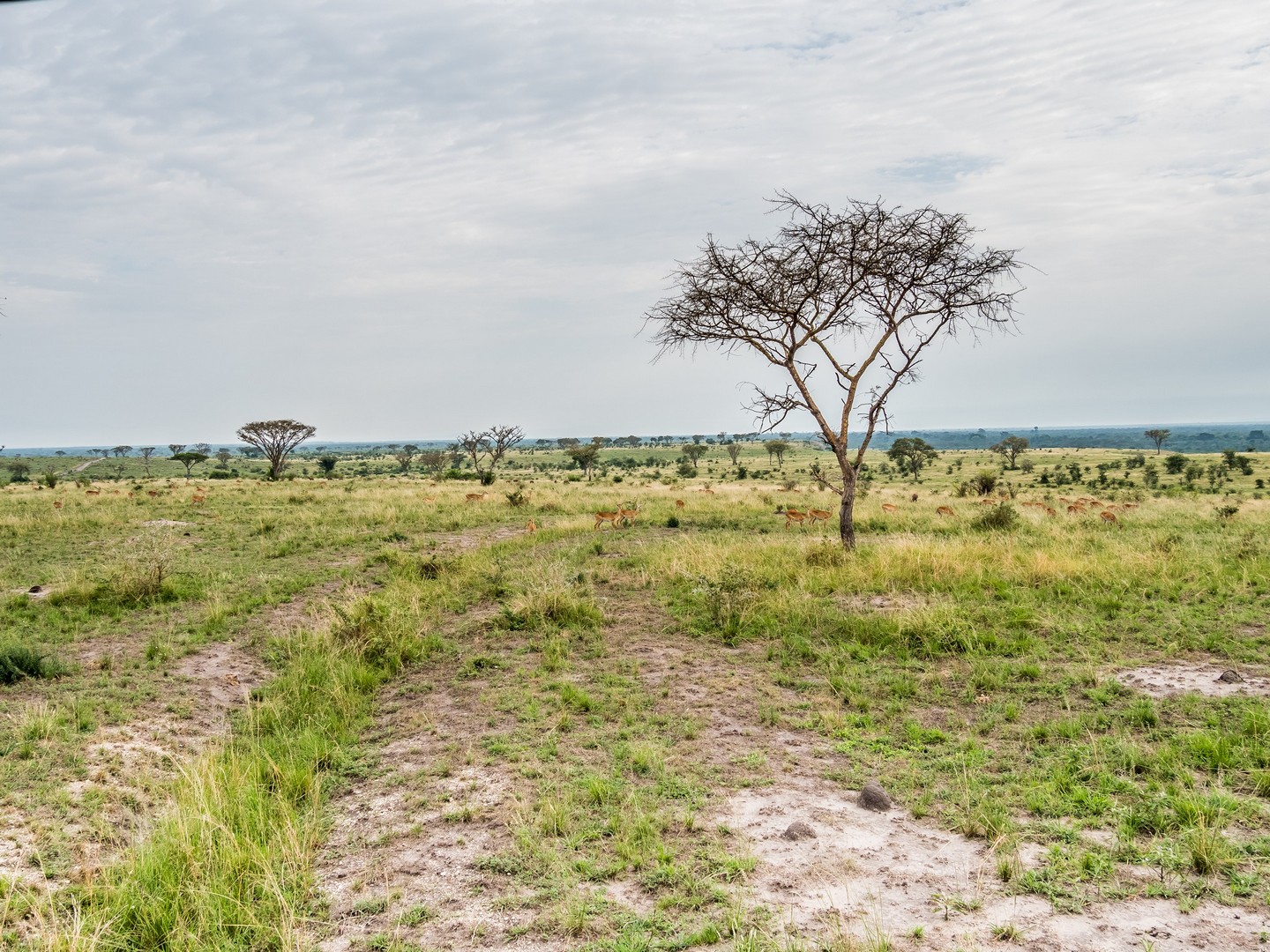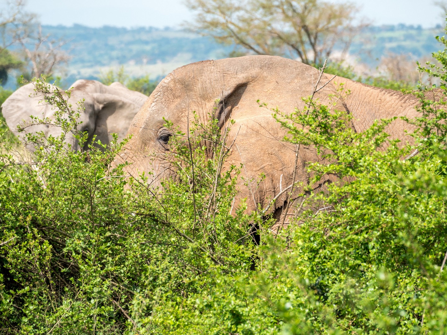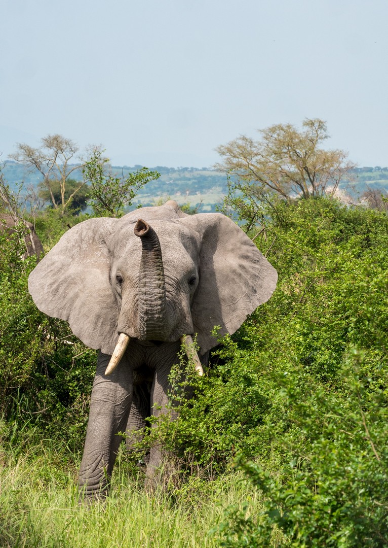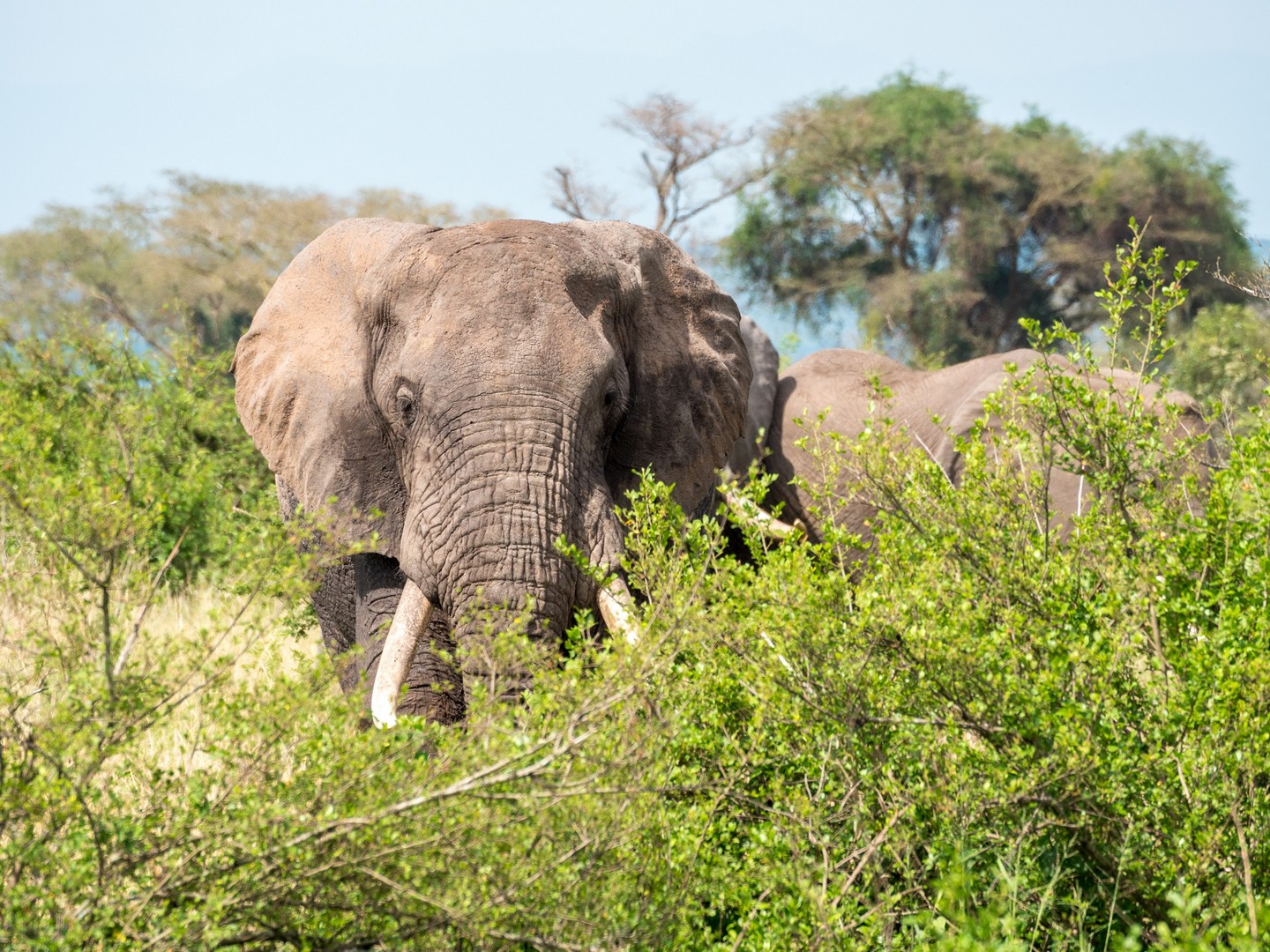 Nous voilà donc lancés en milieu de matinée mais nous allons très vite réaliser que la tâche ne sera pas facile. Comme la matinée est déjà bien avancée, la plupart des animaux ne se montrent pas vraiment. Nous croisons quelques troupeaux de buffles, ce qui est toujours impressionnant, mais pas grand chose d’autre. Chaque arbre aux branches étendues et tortueuses est scruté avec attention mais pas la moindre crinière à l’horizon ! Nous aurons quand même droit à un spectacle qu’on ne voit pas tous les jours… cela commence par un petit groupe d’éléphants qui déboule de derrière de gros buissons. Sauf que d’autres suivent, et suivent encore. Il doit y avoir pas moins de 40 pachydermes, ce qui est exceptionnel ! Le souffle coupé, nous les contemplons. En petits noyaux, mais toujours ensemble, ils se suivent les uns, les autres, marchant comme au ralenti. Protégeant les quelques jeunes entre deux adultes. Où vont-ils ? Seuls la tête du groupe le sait mais cette vision restera l’une des plus impressionnantes de ce voyage en Ouganda.