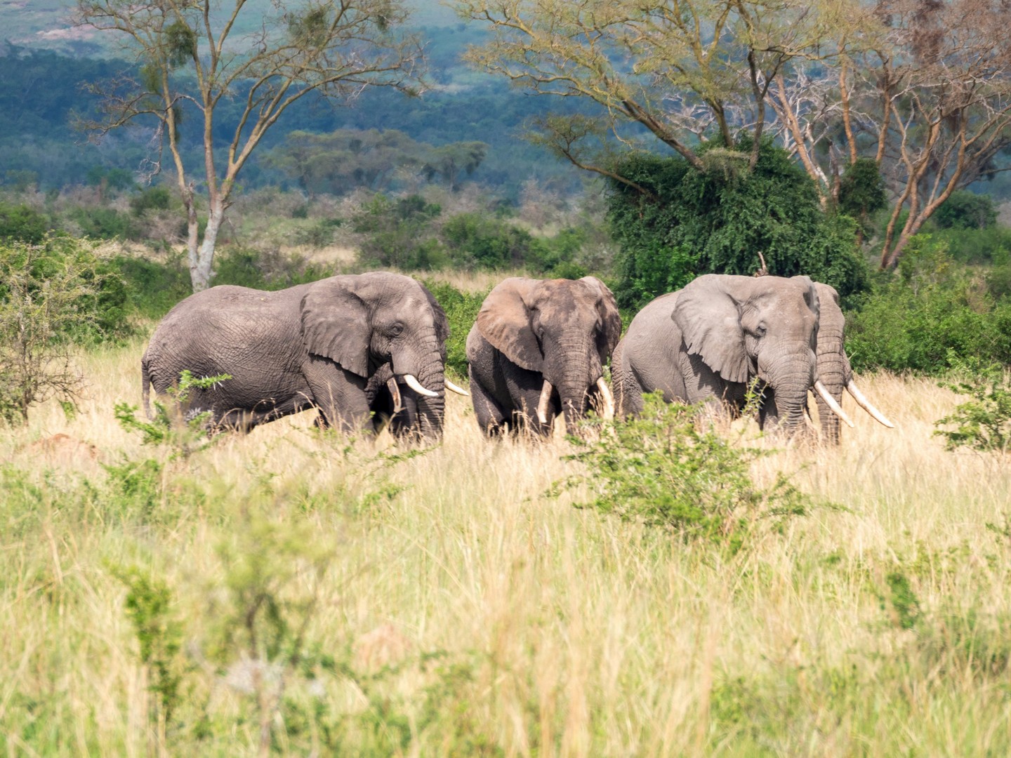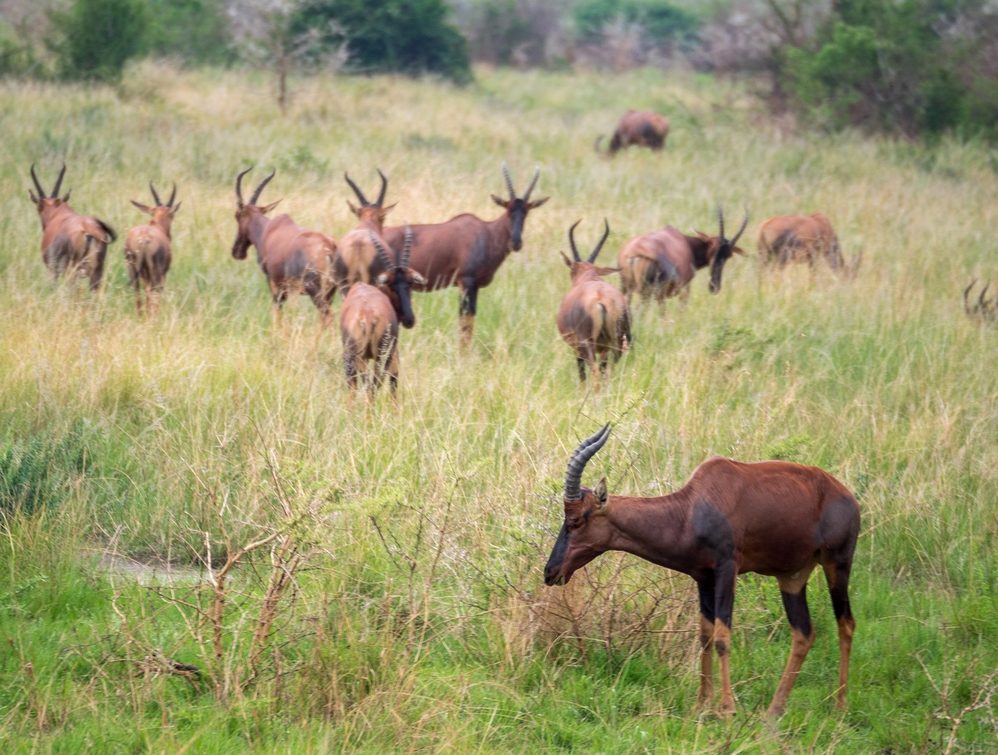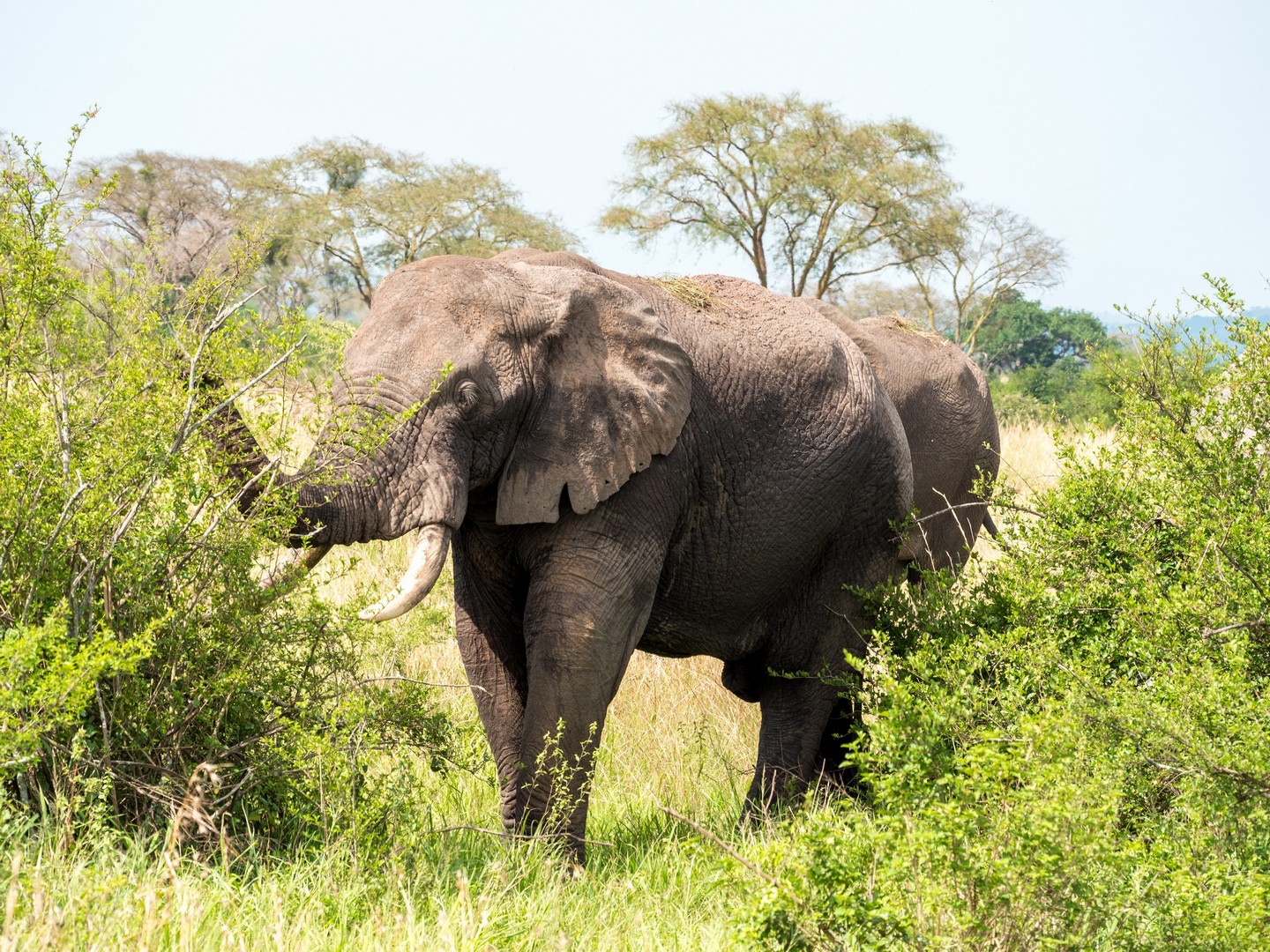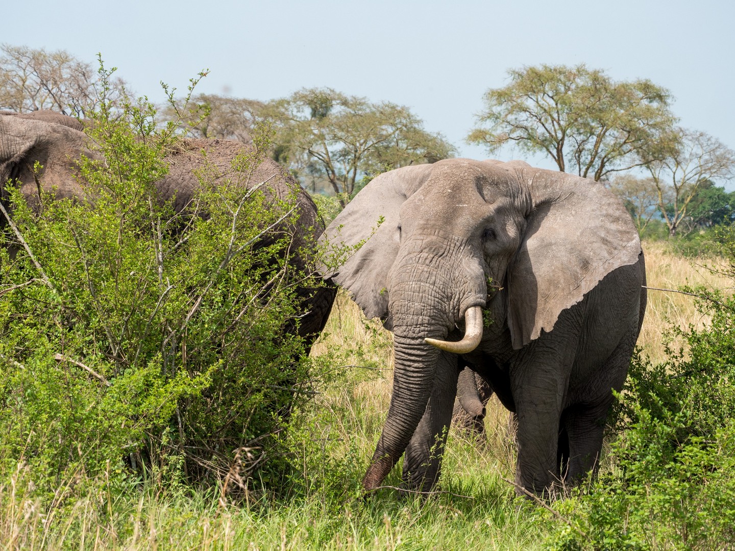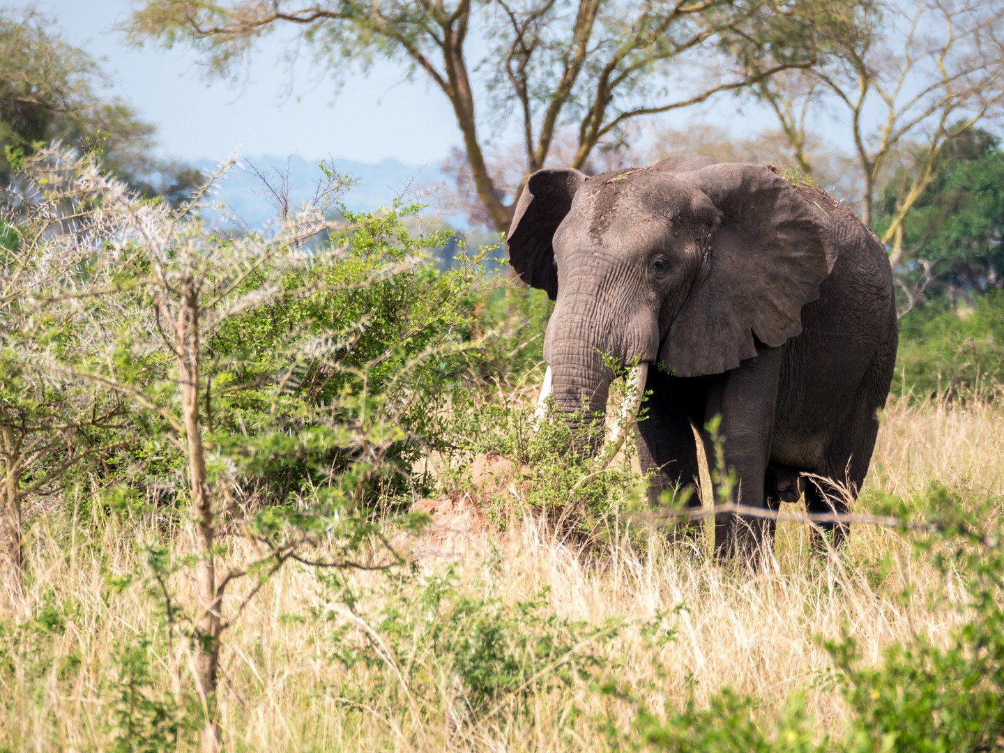 Nous voilà donc lancés en milieu de matinée mais nous allons très vite réaliser que la tâche ne sera pas facile. Comme la matinée est déjà bien avancée, la plupart des animaux ne se montrent pas vraiment. Nous croisons quelques troupeaux de buffles, ce qui est toujours impressionnant, mais pas grand chose d’autre. Chaque arbre aux branches étendues et tortueuses est scruté avec attention mais pas la moindre crinière à l’horizon ! Nous aurons quand même droit à un spectacle qu’on ne voit pas tous les jours… cela commence par un petit groupe d’éléphants qui déboule de derrière de gros buissons. Sauf que d’autres suivent, et suivent encore. Il doit y avoir pas moins de 40 pachydermes, ce qui est exceptionnel ! Le souffle coupé, nous les contemplons. En petits noyaux, mais toujours ensemble, ils se suivent les uns, les autres, marchant comme au ralenti. Protégeant les quelques jeunes entre deux adultes. Où vont-ils ? Seuls la tête du groupe le sait mais cette vision restera l’une des plus impressionnantes de ce voyage en Ouganda.