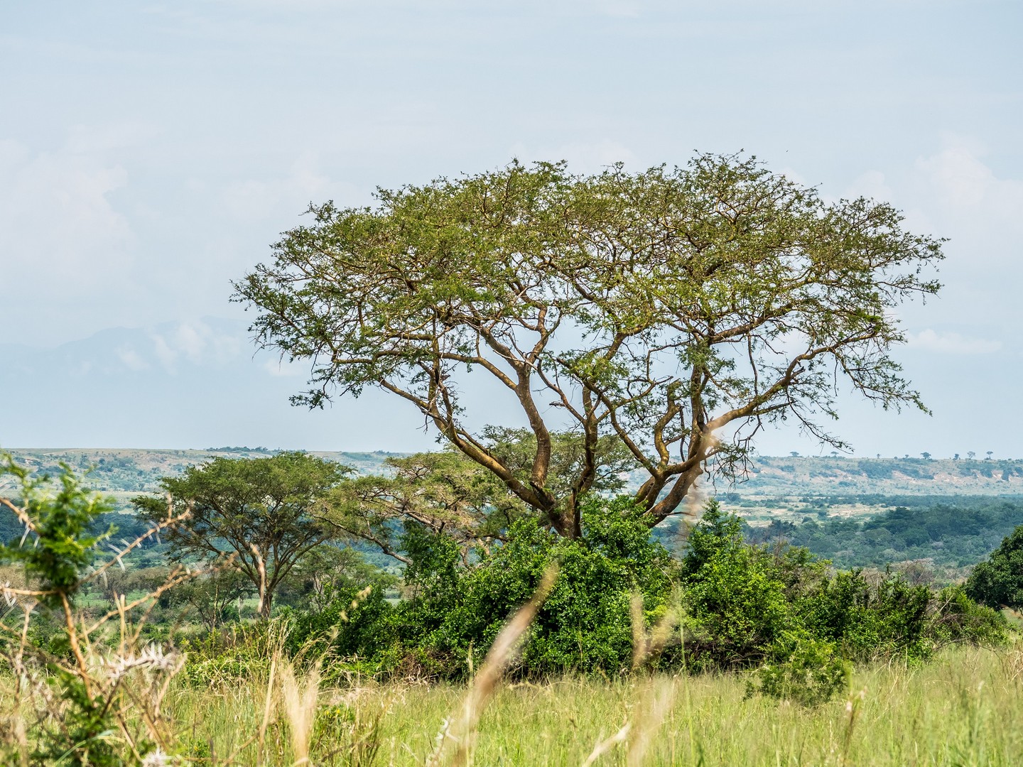 Le secteur d’Ishasha se mérite ! Pour atteindre ce coin isolé de Queen Elizabeth National Park en Ouganda, il faut prendre une mauvaise piste pendant plusieurs heures mais le spectacle en vaut la peine. Nous roulerons toute la fin de l’après-midi jusqu’à ce que le soleil soit couché et le spectacle de la savane pendant que le soleil baisse est inoubliable. Les rayons dorés du soleil illuminent les hautes herbes en dégradé de vert, de jaune et de rose saumon. Un petit vent les fait onduler doucement et le mouvement donne l’impression d’une grande vague multicolore. Et sur cette route, pas un chat… (en tout cas, pas de GROS chats)… enfin, il semble que nous allons avoir droit au coucher de soleil que nous attendions depuis le début du voyage, celui que rêve de voir tout .e voyageur.se en Afrique ! On prend le temps de s’arrêter devant un arbre et qui semble dévoré par un brasier rose et orange.