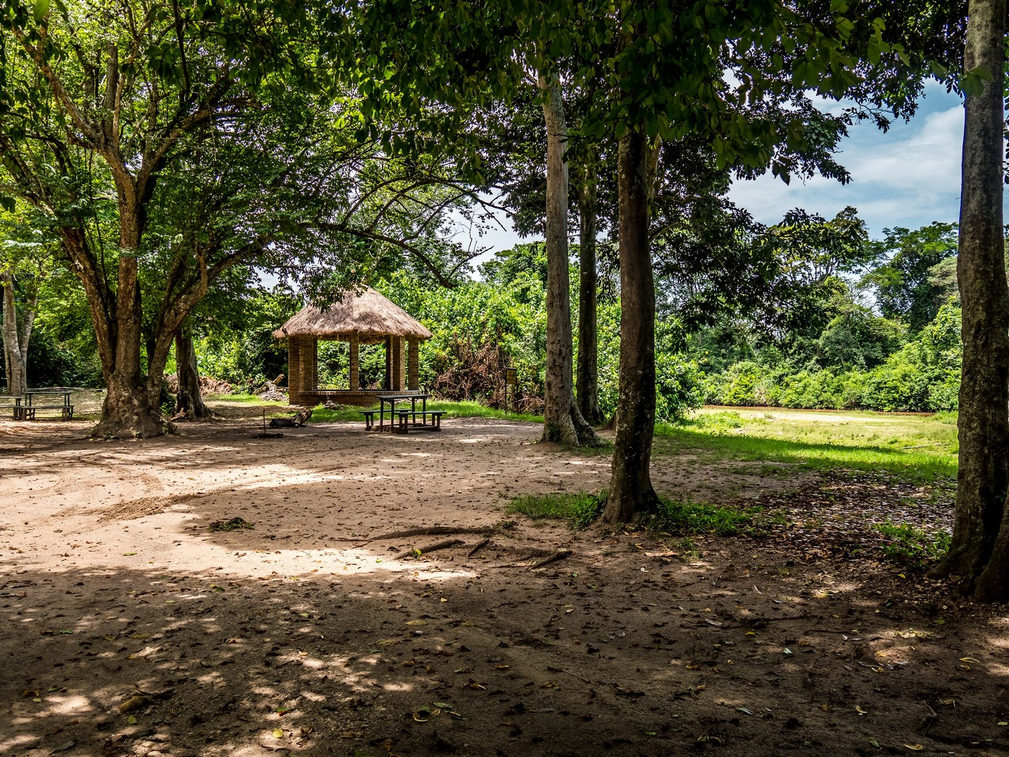 Michael tient à nous emmener faire un tour dans les installations du camping… qui sont plutôt rudimentaires : des latrines, une douche, un coin pour le feu de camp (indispensable pour tenir les animaux à distance). Ce qui prouve que tous les budgets et les aventuriers sont bienvenus en Ouganda !