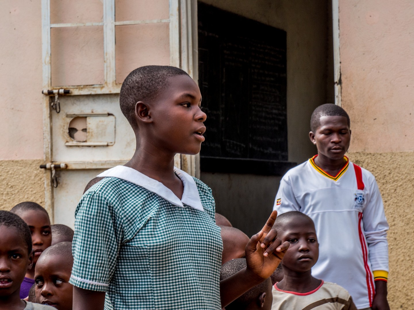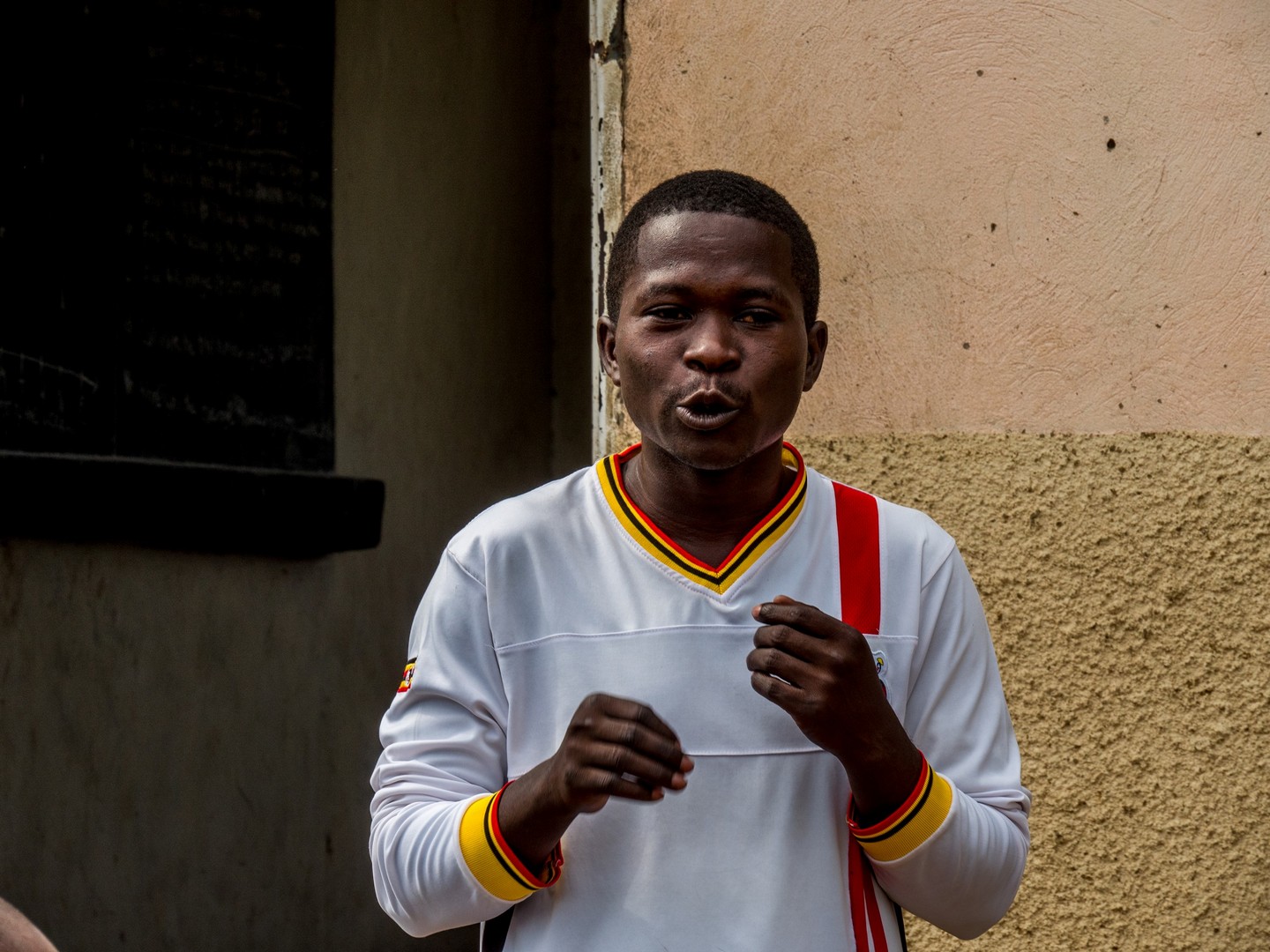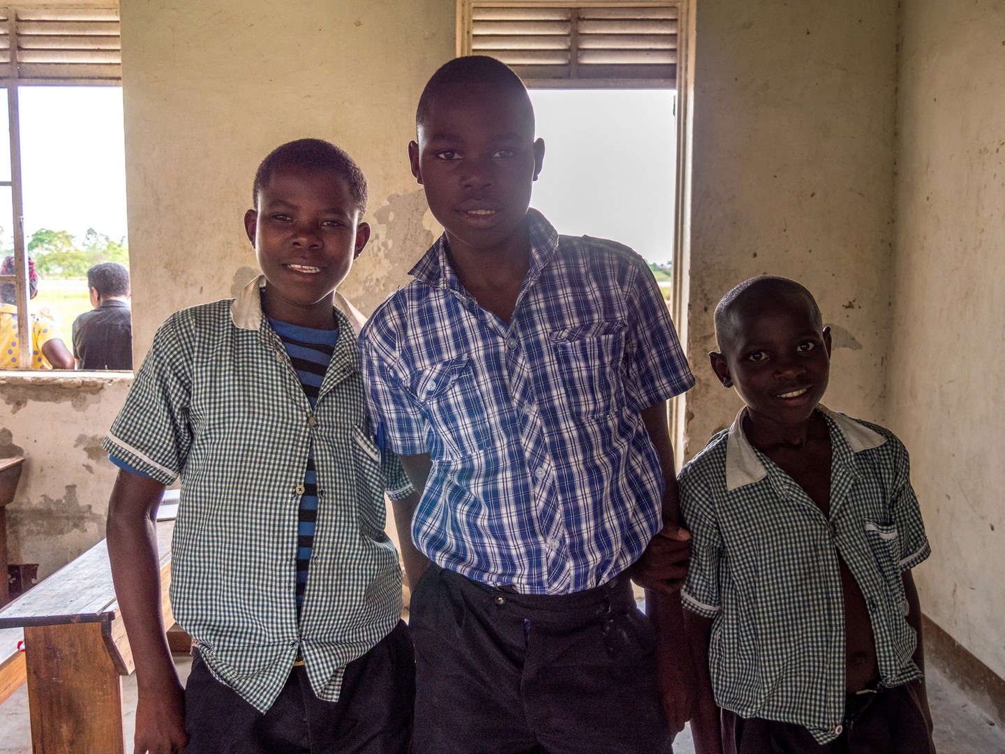 Après le repas, Costantino nous a invités à visiter une école toute proche, la Kameme Primary Parent’s School, que son lodge soutient. C’est en uniforme et au garde à vous qu’une partie des élèves (on est samedi, on a fait venir les volontaires) nous accueille avec le directeur de l’école. Cette école privée (comme pas mal en Ouganda) a été créée par les parents du village et après quelques mots de bienvenue, les enfants au garde-à-vous nous accueillent en chanson.
