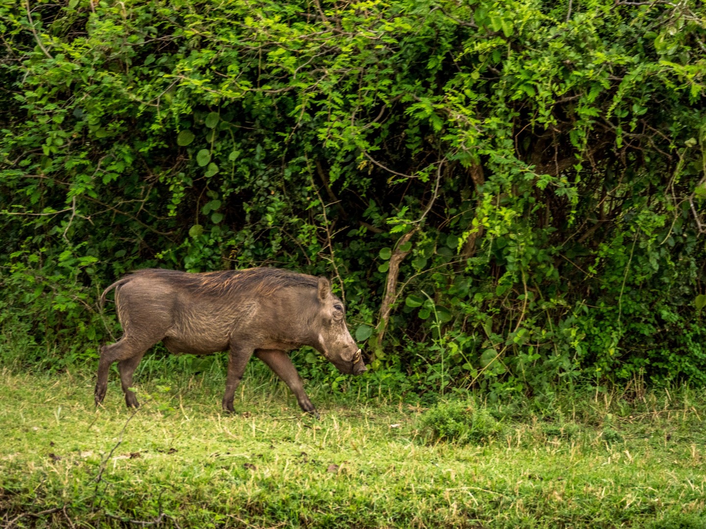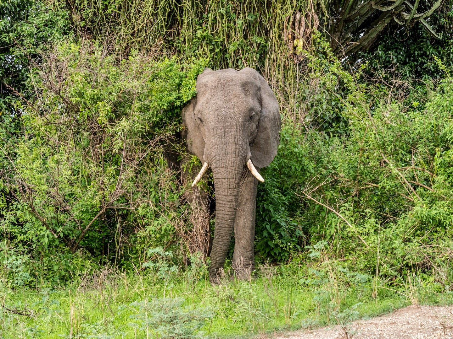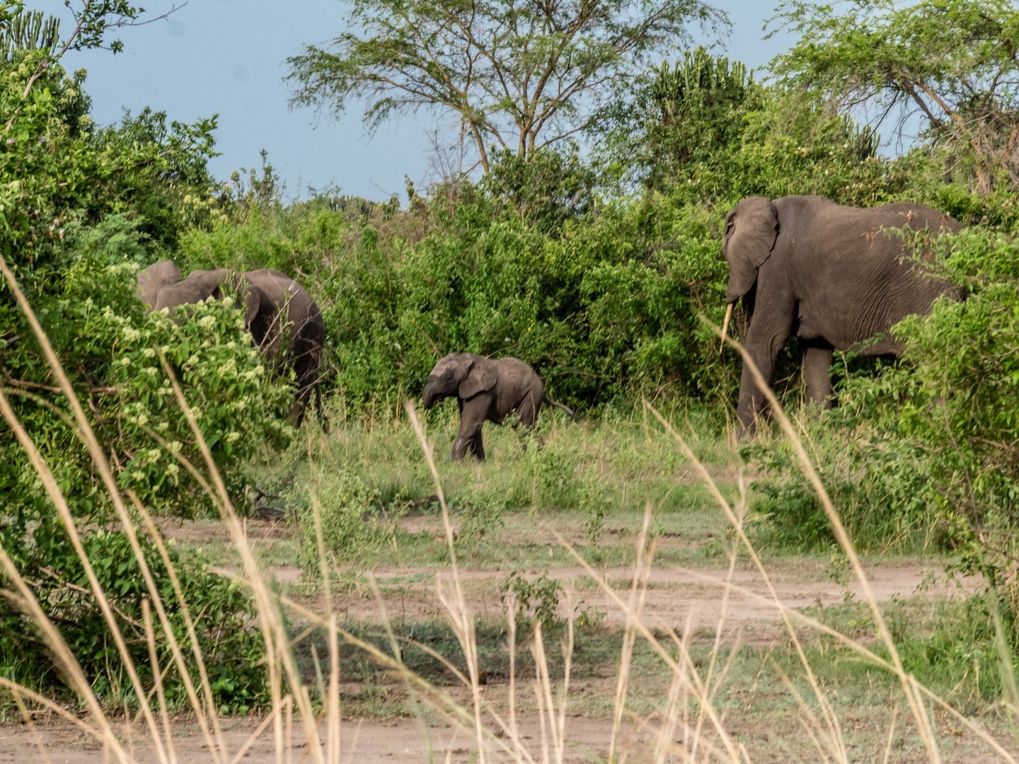 Une fois revenue à l’embarcadère, j’ai envie de prolonger ce moment de rêvasserie sur la berge, en attendant de rentrer dans la jeep mais la voix de Michael me tire de mes pensées : « Tu as regardé si il n’y avait pas de crocodiles ou de hippos ? ». Je pensais le voir le sourire, mais non ! Michael est vachement sérieux et me fit signe de venir vers lui. Je me dis que finalement, la vie dans la nature est pleine de dangers ! Et ce n’est pas le chemin vers Ishasha, notre prochaine étape, qui va le contredire. Nos demandes de « On peut s’arrêter là ? » se verront répondre souvent « Non ». Trop dangereux avec les animaux et cela les dérange. Quand je vois les éléphants que nous avons croisés sur le chemin, et de très près, je me dis que en effet, c’est mieux.