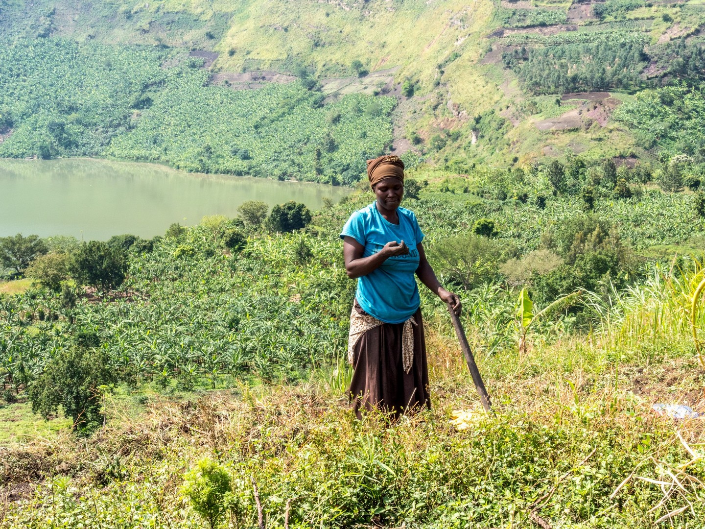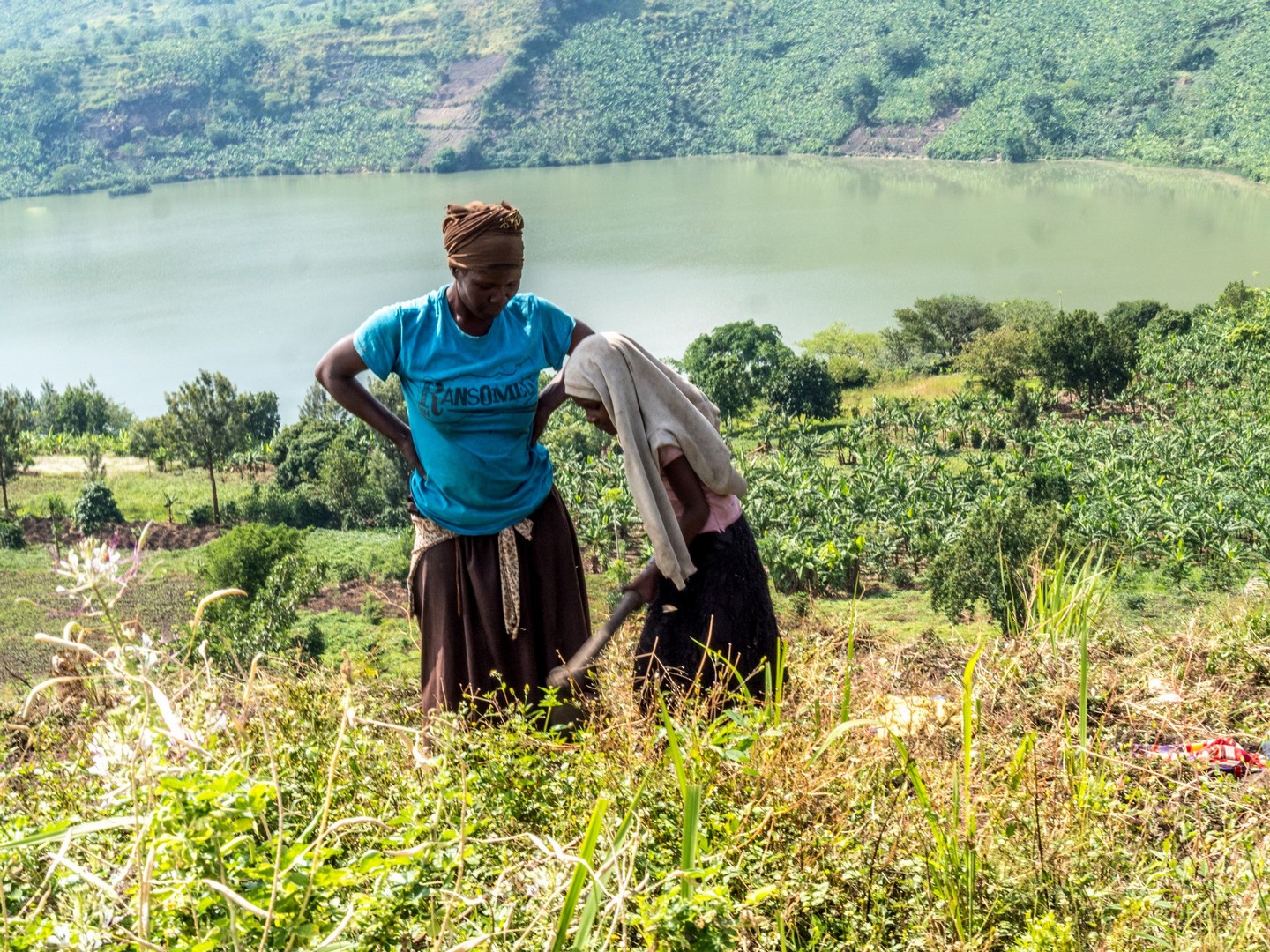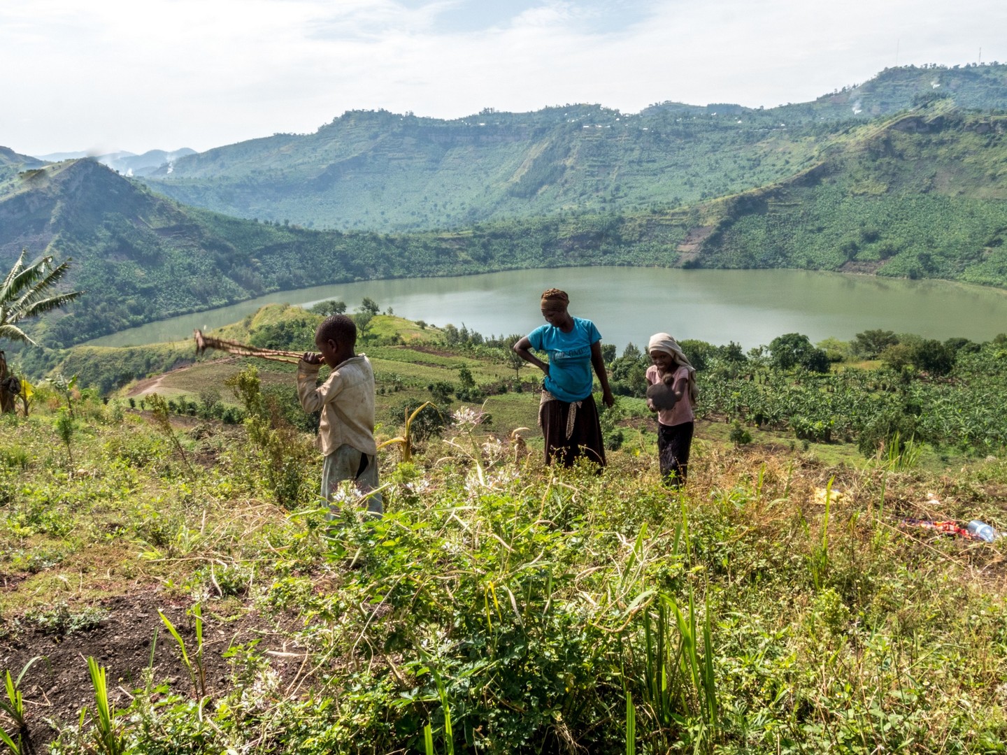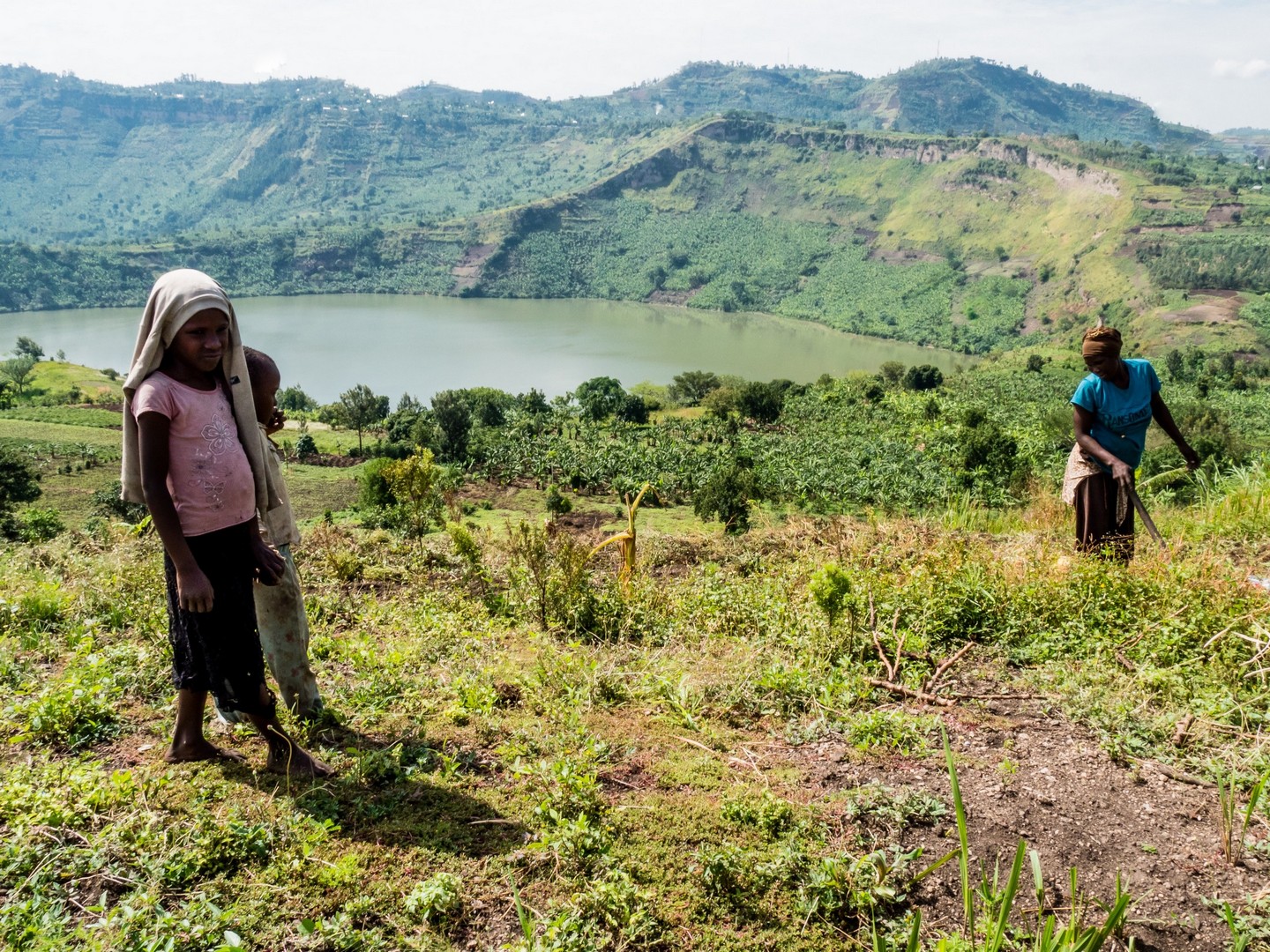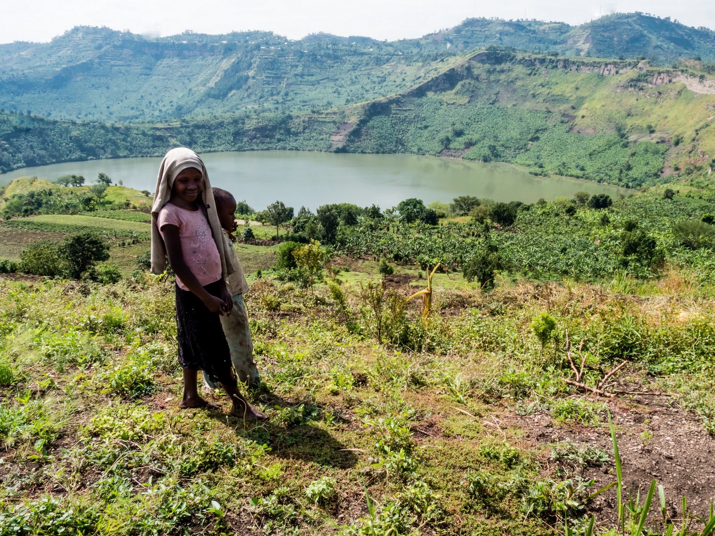 En matinée, nous allons nous attarder un peu du côté des Crater Lakes, pour visiter quelques lodges, mais aussi pour jeter un œil sur un panorama bien connu de la région : les Twin Lakes, deux lacs séparés par une très mince bande de terre. L’un a une eau très claire, et l’autre une eau verte et trouble. Ça vaut vraiment le détour et sur la route qui mène au point de vue, nous allons rencontrer une petite famille : deux enfants, un garçon et une fille et leur maman. La mère travaille son lopin de terre et donne quelques instructions à sa fille, qui doit avoir peut-être neuf-dix ans, son petit frère semble plus regarder qu’autre chose. Cela nous rappelle que même si l’Ouganda fait de gros efforts (les écoles sont légions, une bonne partie laissée aux mains des institutions religieuses), certains enfants ne vont pas à l’école, en tout cas pas toute la journée. J’essaie d’amadouer la petite fille, les deux petits sont timides, et lui demande son nom. Dans un filet de voix, la petite me répond. Sa voix est si base que je ne le comprends pas. Je la vois partagée entre sa timidité et la curiosité vis-à-vis de ces « muzungus » qui s’intéressent à son petit frère et elle. Leurs sourires et la bonne humeur de leur maman restera un de mes plus beaux souvenirs d’Ouganda.