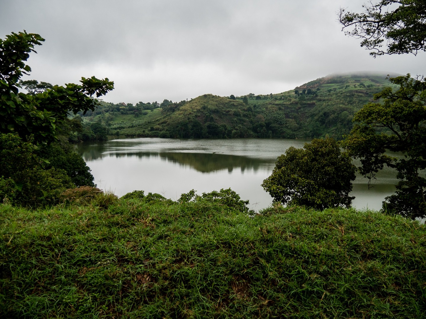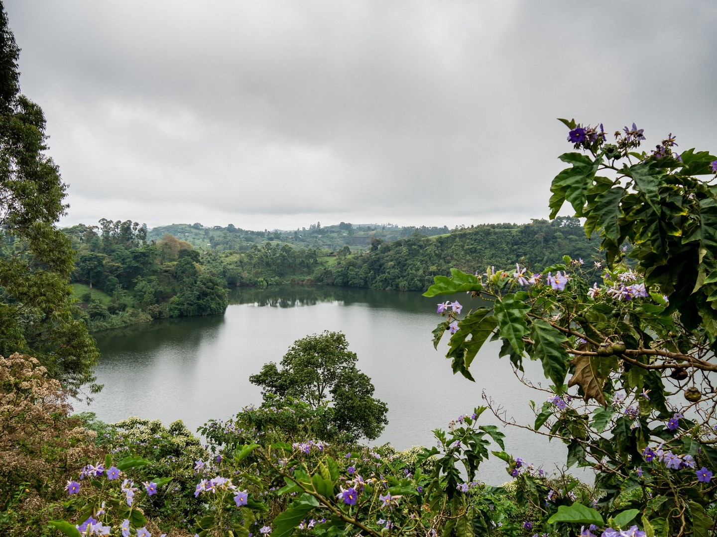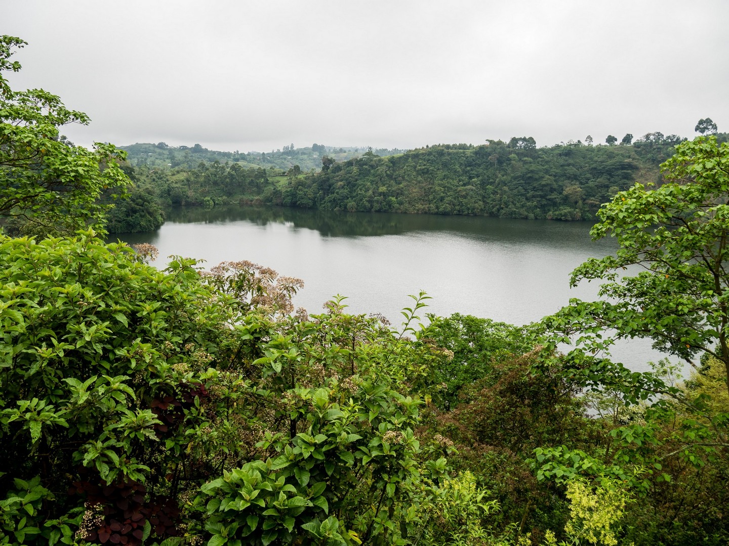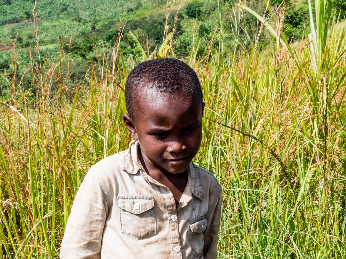 En matinée, nous allons nous attarder un peu du côté des Crater Lakes, pour visiter quelques lodges, mais aussi pour jeter un œil sur un panorama bien connu de la région : les Twin Lakes, deux lacs séparés par une très mince bande de terre. L’un a une eau très claire, et l’autre une eau verte et trouble. Ça vaut vraiment le détour et sur la route qui mène au point de vue, nous allons rencontrer une petite famille : deux enfants, un garçon et une fille et leur maman. La mère travaille son lopin de terre et donne quelques instructions à sa fille, qui doit avoir peut-être neuf-dix ans, son petit frère semble plus regarder qu’autre chose. Cela nous rappelle que même si l’Ouganda fait de gros efforts (les écoles sont légions, une bonne partie laissée aux mains des institutions religieuses), certains enfants ne vont pas à l’école, en tout cas pas toute la journée. J’essaie d’amadouer la petite fille, les deux petits sont timides, et lui demande son nom. Dans un filet de voix, la petite me répond. Sa voix est si base que je ne le comprends pas. Je la vois partagée entre sa timidité et la curiosité vis-à-vis de ces « muzungus » qui s’intéressent à son petit frère et elle. Leurs sourires et la bonne humeur de leur maman restera un de mes plus beaux souvenirs d’Ouganda.