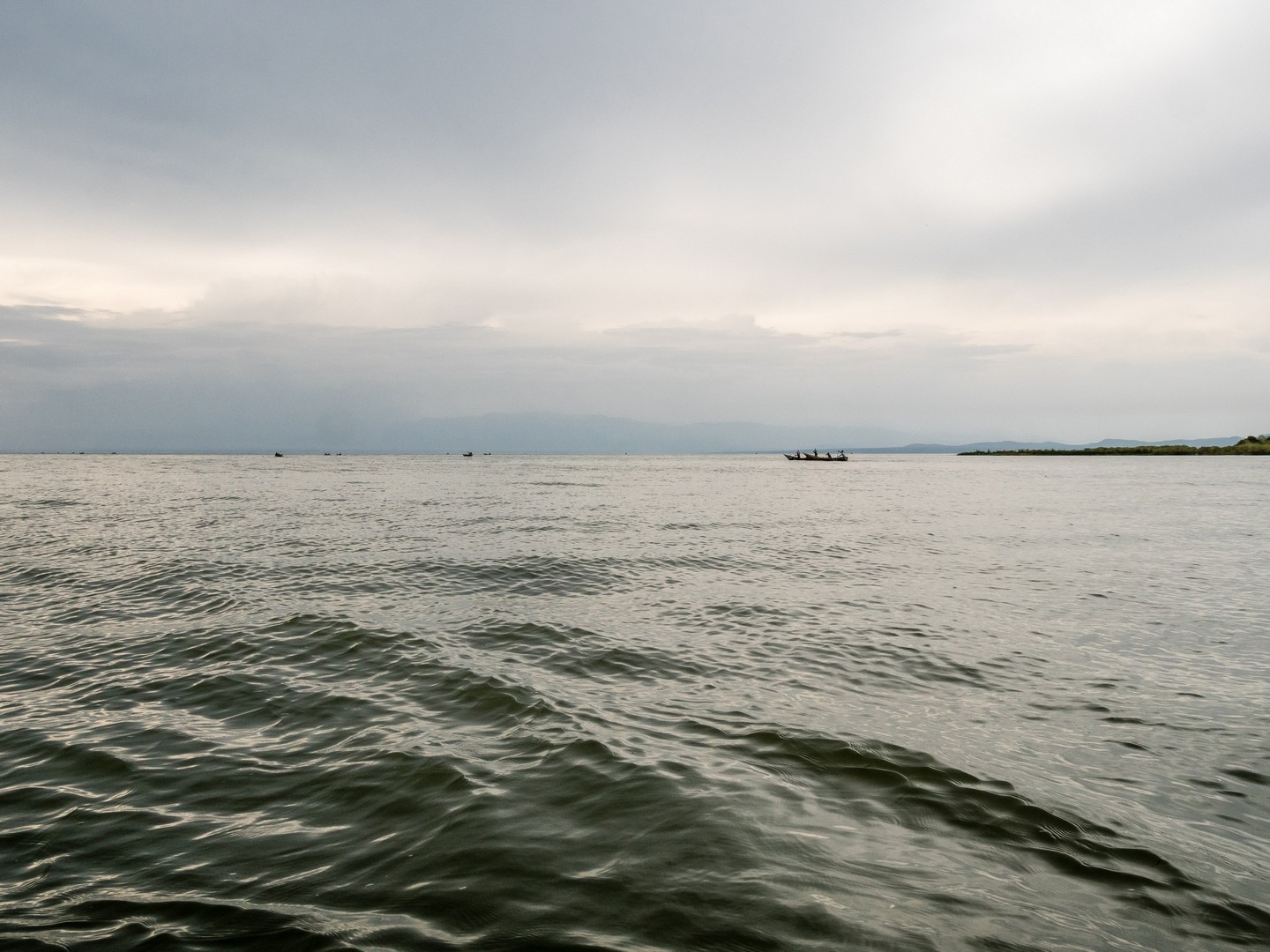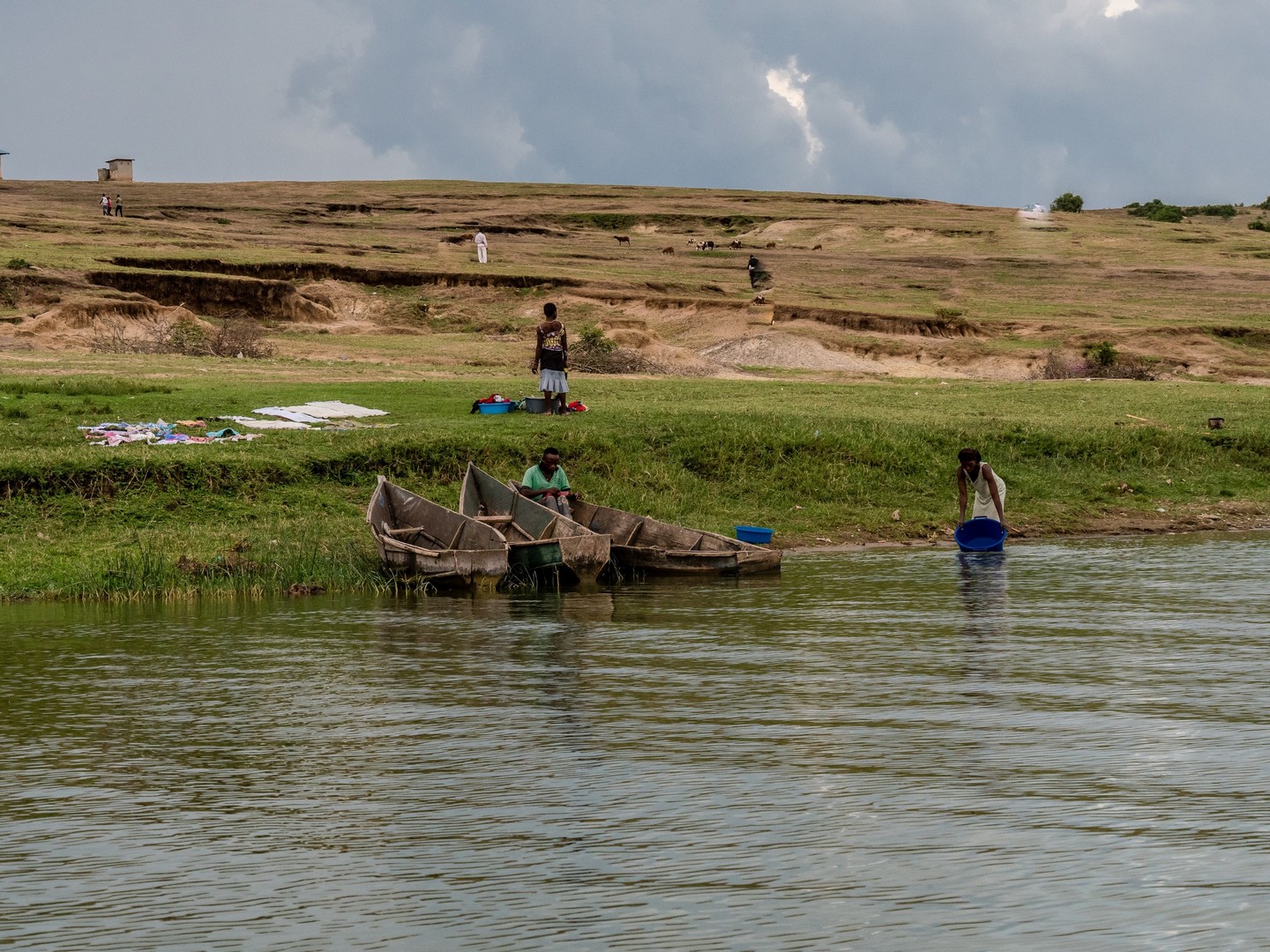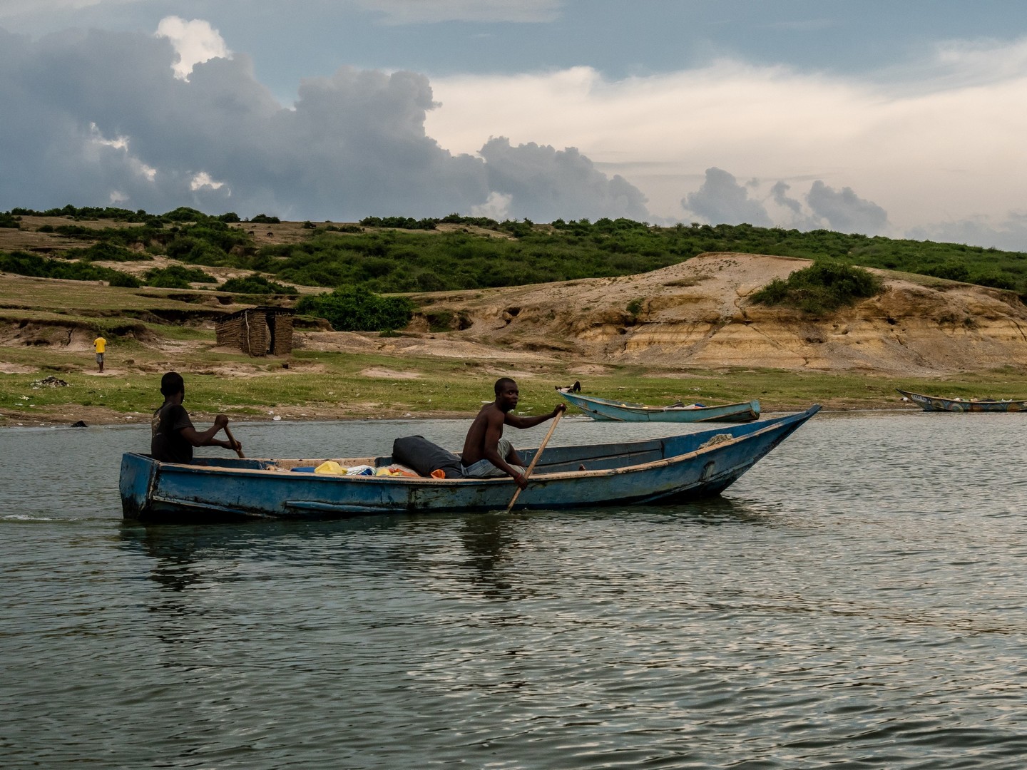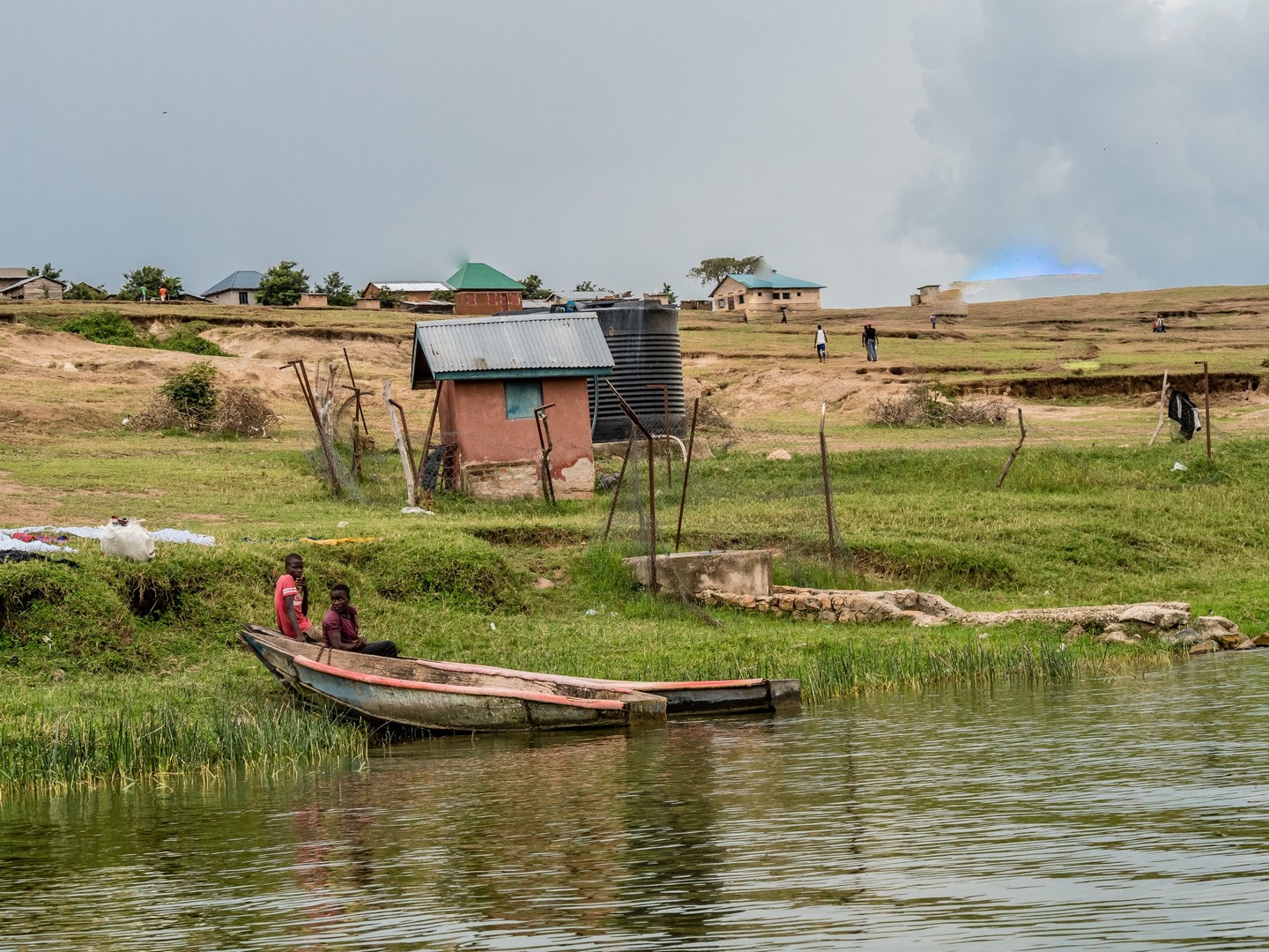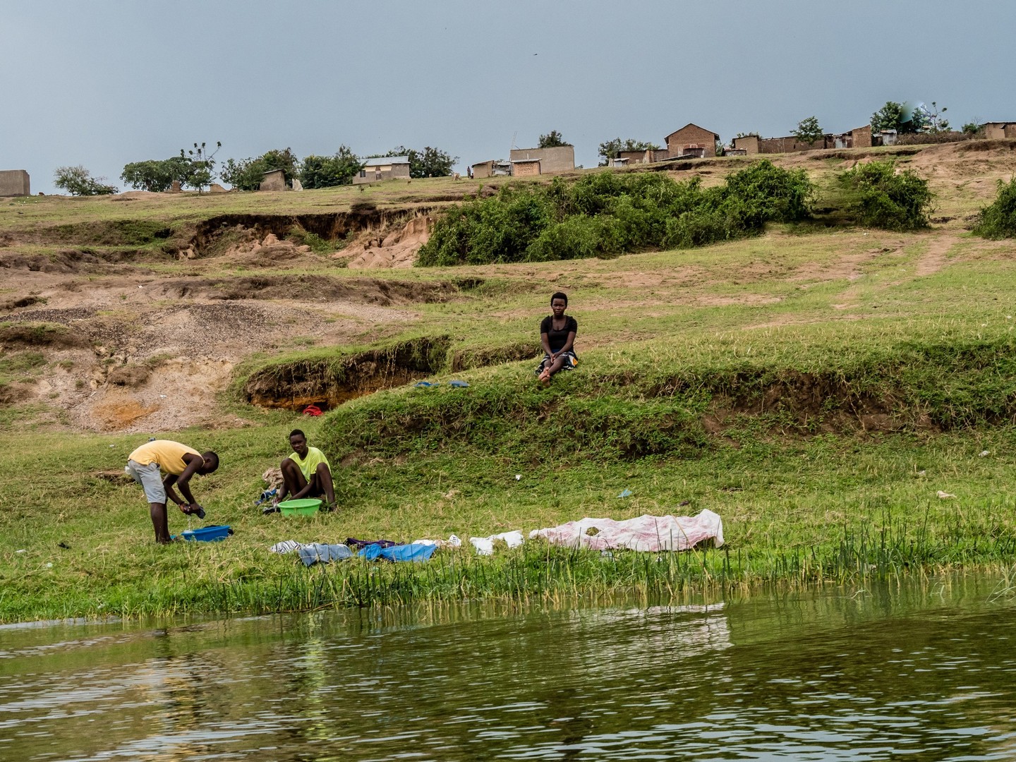 En matinée, nous allons nous attarder un peu du côté des Crater Lakes, pour visiter quelques lodges, mais aussi pour jeter un œil sur un panorama bien connu de la région : les Twin Lakes, deux lacs séparés par une très mince bande de terre. L’un a une eau très claire, et l’autre une eau verte et trouble. Ça vaut vraiment le détour et sur la route qui mène au point de vue, nous allons rencontrer une petite famille : deux enfants, un garçon et une fille et leur maman. La mère travaille son lopin de terre et donne quelques instructions à sa fille, qui doit avoir peut-être neuf-dix ans, son petit frère semble plus regarder qu’autre chose. Cela nous rappelle que même si l’Ouganda fait de gros efforts (les écoles sont légions, une bonne partie laissée aux mains des institutions religieuses), certains enfants ne vont pas à l’école, en tout cas pas toute la journée. J’essaie d’amadouer la petite fille, les deux petits sont timides, et lui demande son nom. Dans un filet de voix, la petite me répond. Sa voix est si base que je ne le comprends pas. Je la vois partagée entre sa timidité et la curiosité vis-à-vis de ces « muzungus » qui s’intéressent à son petit frère et elle. Leurs sourires et la bonne humeur de leur maman restera un de mes plus beaux souvenirs d’Ouganda.