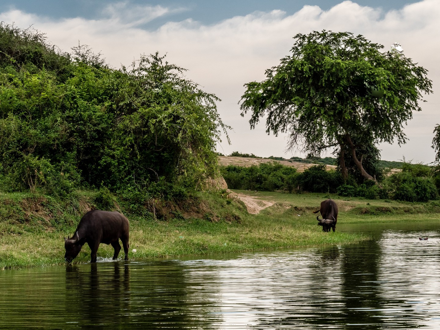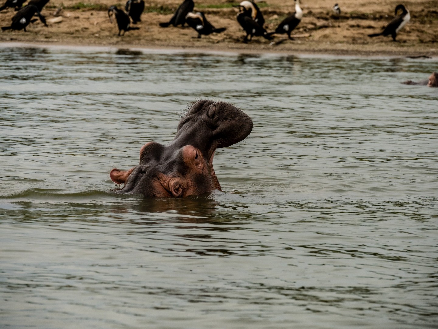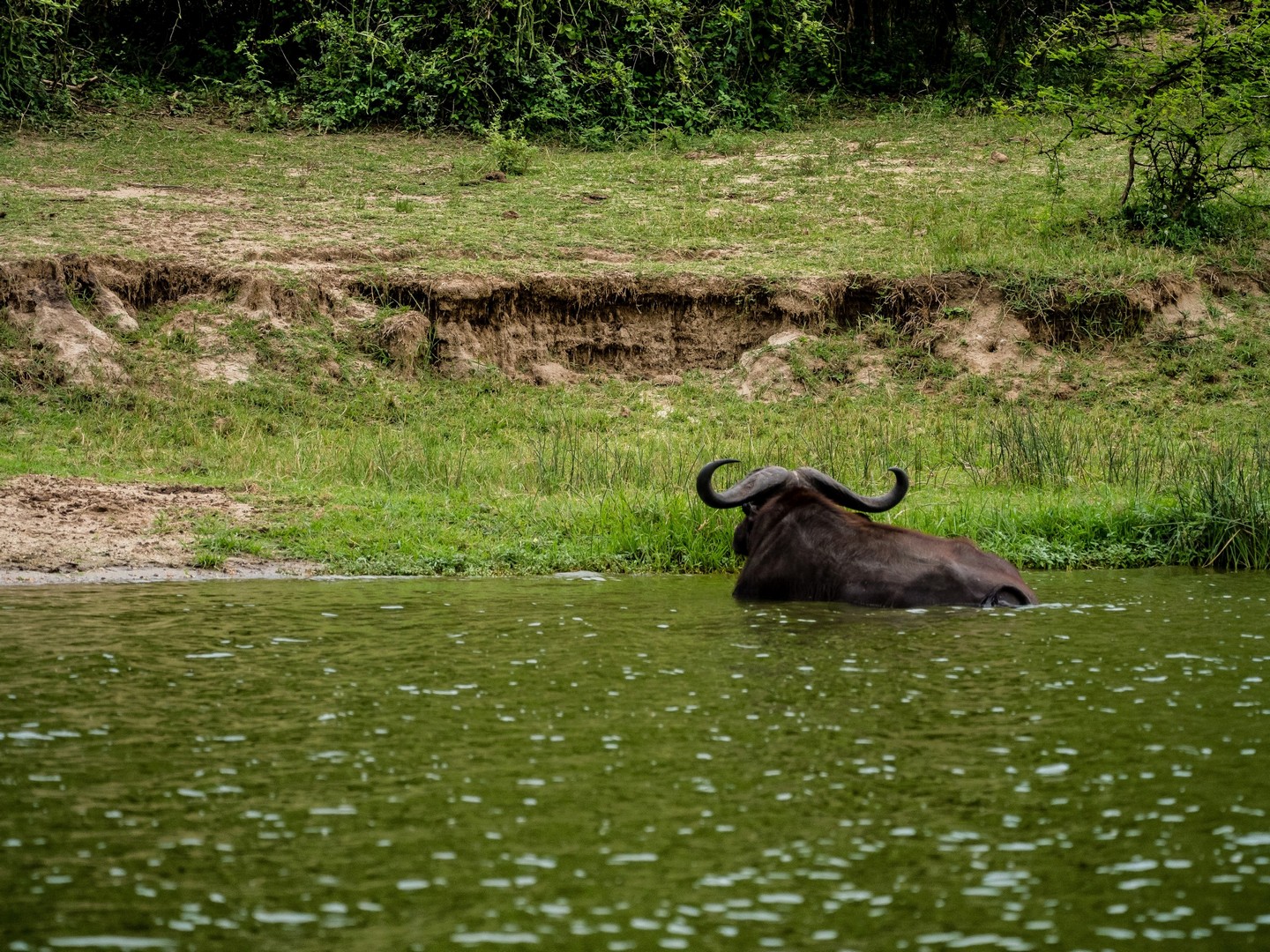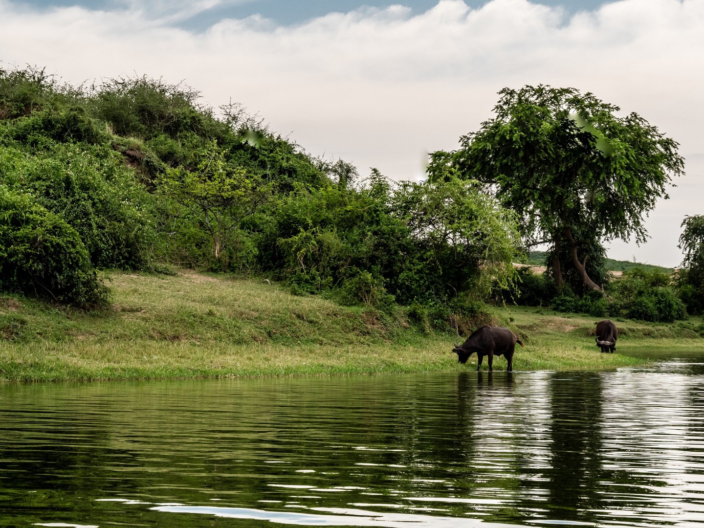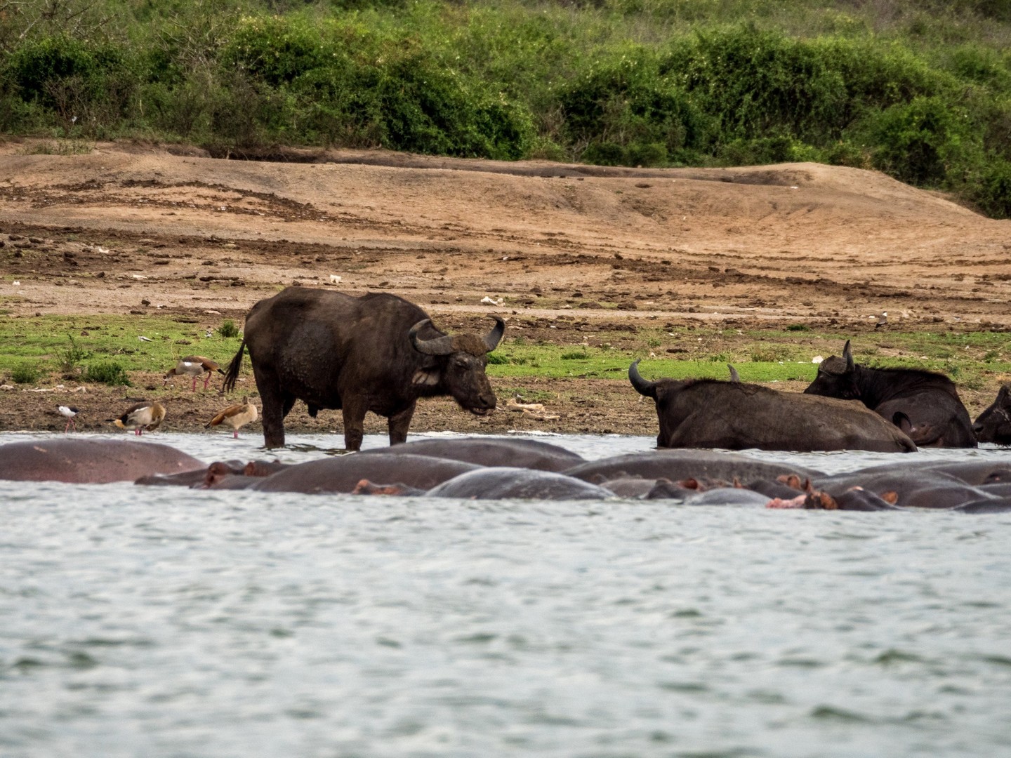 Kazinga est connu pour avoir une énorme concentration d’hippopotames. Ils sont partout le long des berges, là où ils peuvent marcher sous l’eau sans être trop éloignés de la surface. La plupart du temps, ils restent semi-submergés dans l’eau, avec juste leurs drôles de petites oreilles, leurs yeux et leurs dos qui dépassent. Étonnamment, souvent pas très loin d’eux, on trouve les buffles. Les deux animaux les plus dangereux d’Afrique se côtoient paisiblement !