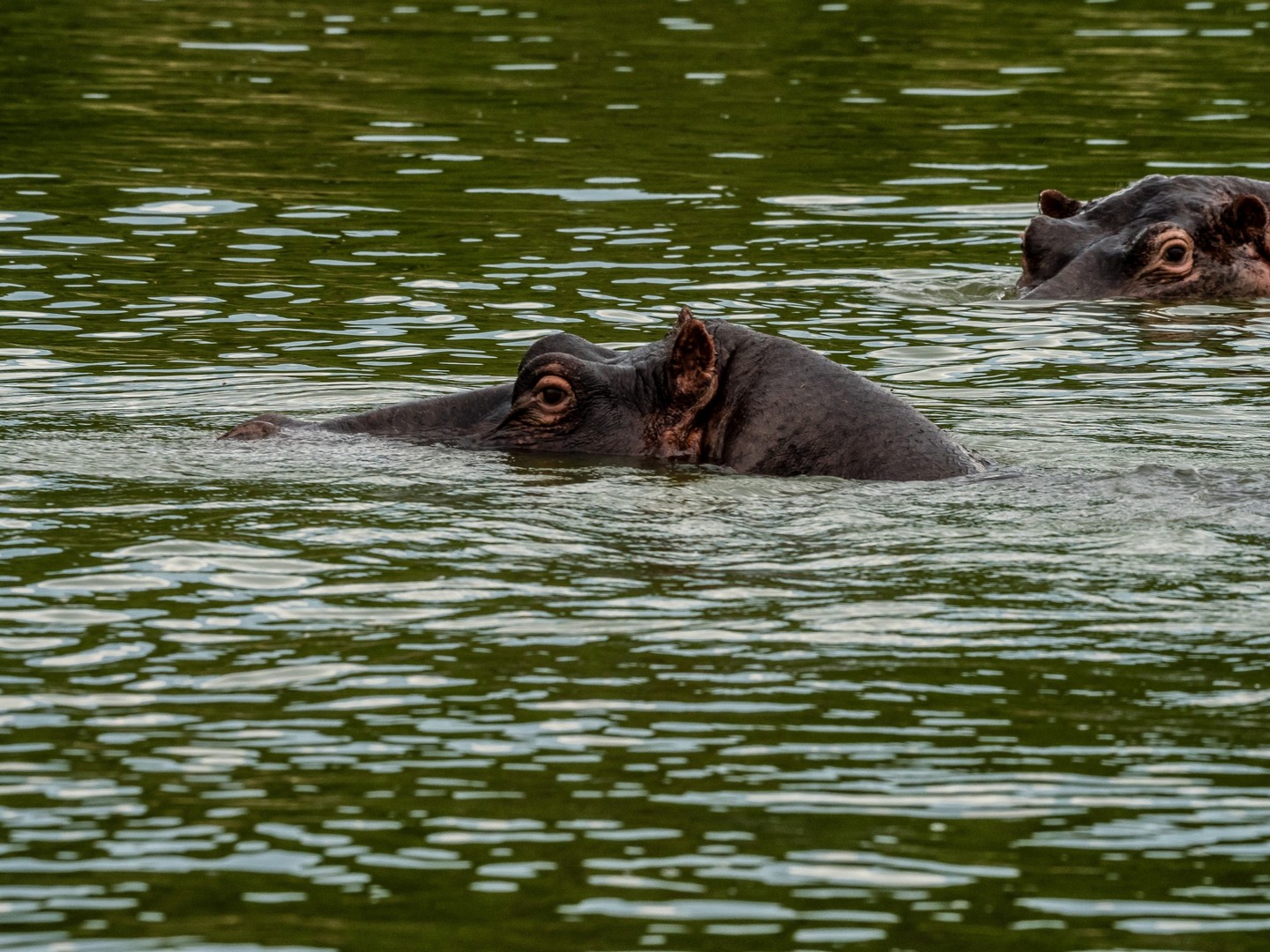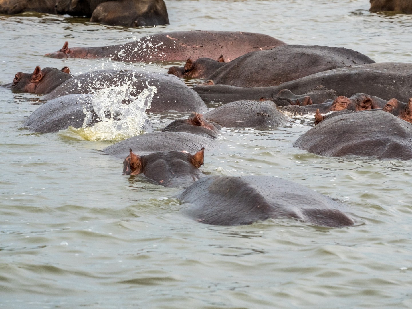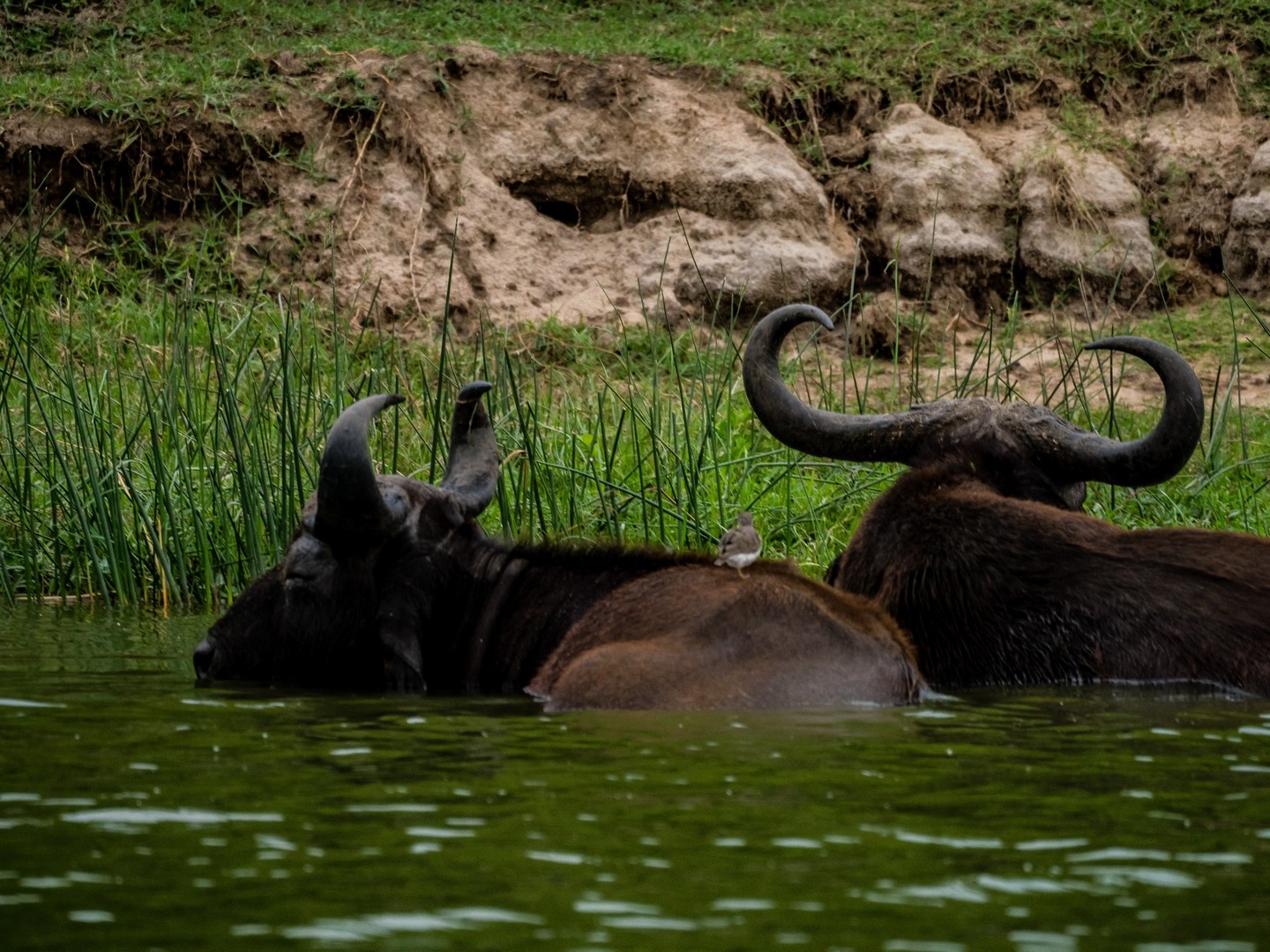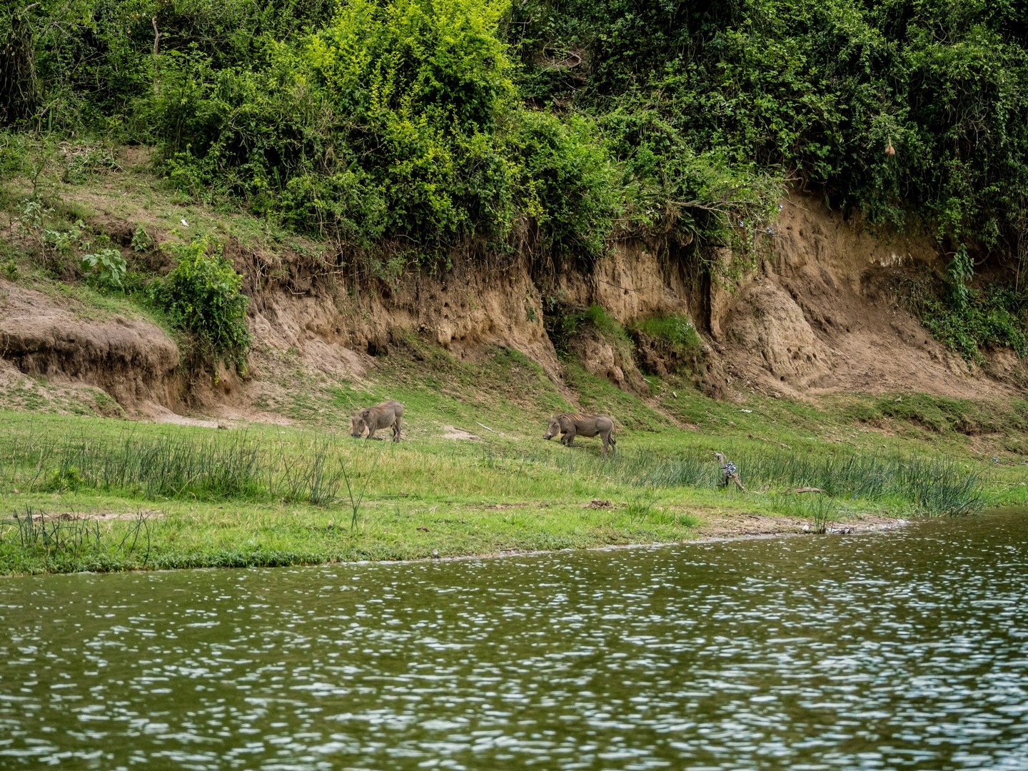 Kazinga est connu pour avoir une énorme concentration d’hippopotames. Ils sont partout le long des berges, là où ils peuvent marcher sous l’eau sans être trop éloignés de la surface. La plupart du temps, ils restent semi-submergés dans l’eau, avec juste leurs drôles de petites oreilles, leurs yeux et leurs dos qui dépassent. Étonnamment, souvent pas très loin d’eux, on trouve les buffles. Les deux animaux les plus dangereux d’Afrique se côtoient paisiblement !