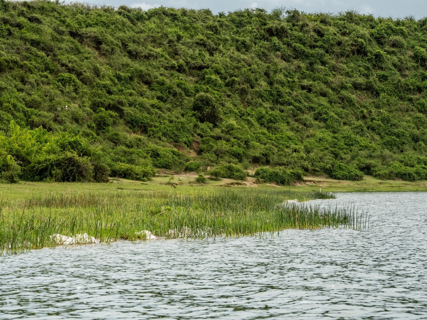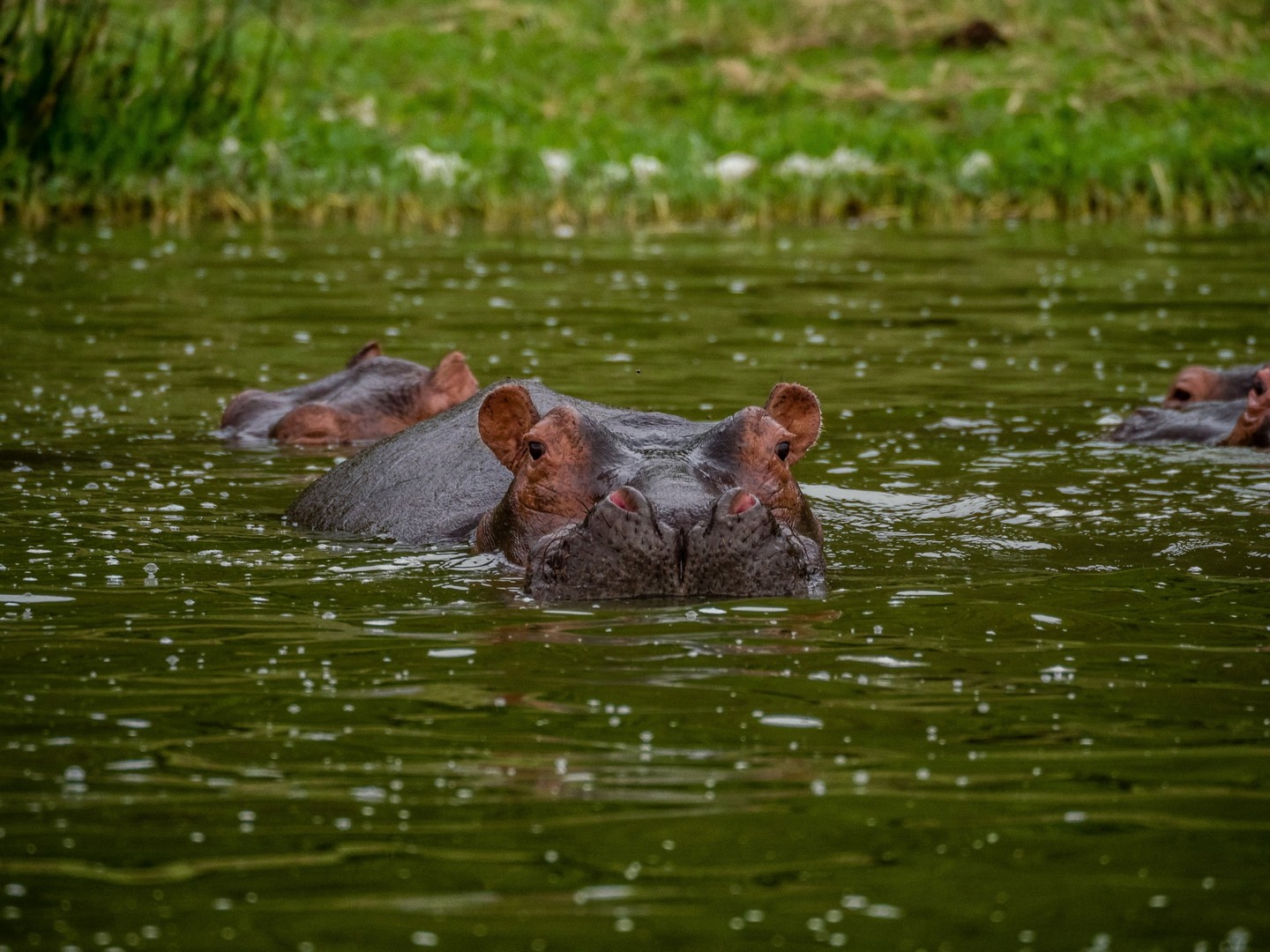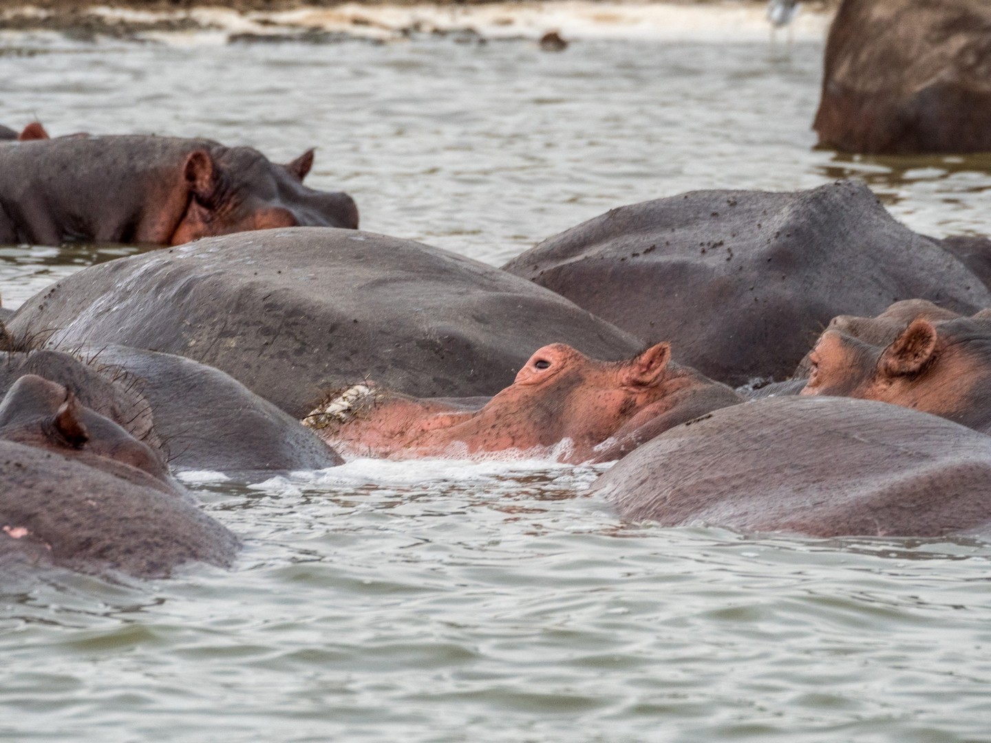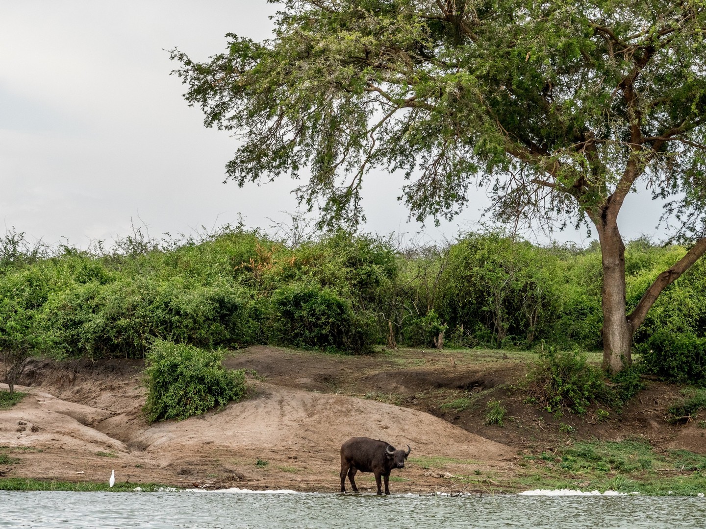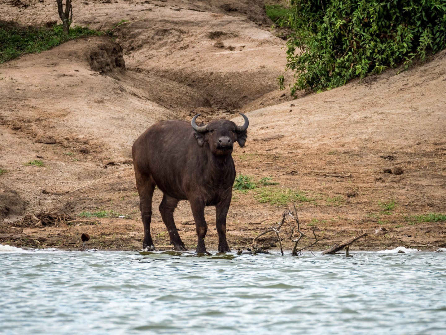 Kazinga est connu pour avoir une énorme concentration d’hippopotames. Ils sont partout le long des berges, là où ils peuvent marcher sous l’eau sans être trop éloignés de la surface. La plupart du temps, ils restent semi-submergés dans l’eau, avec juste leurs drôles de petites oreilles, leurs yeux et leurs dos qui dépassent. Étonnamment, souvent pas très loin d’eux, on trouve les buffles. Les deux animaux les plus dangereux d’Afrique se côtoient paisiblement !