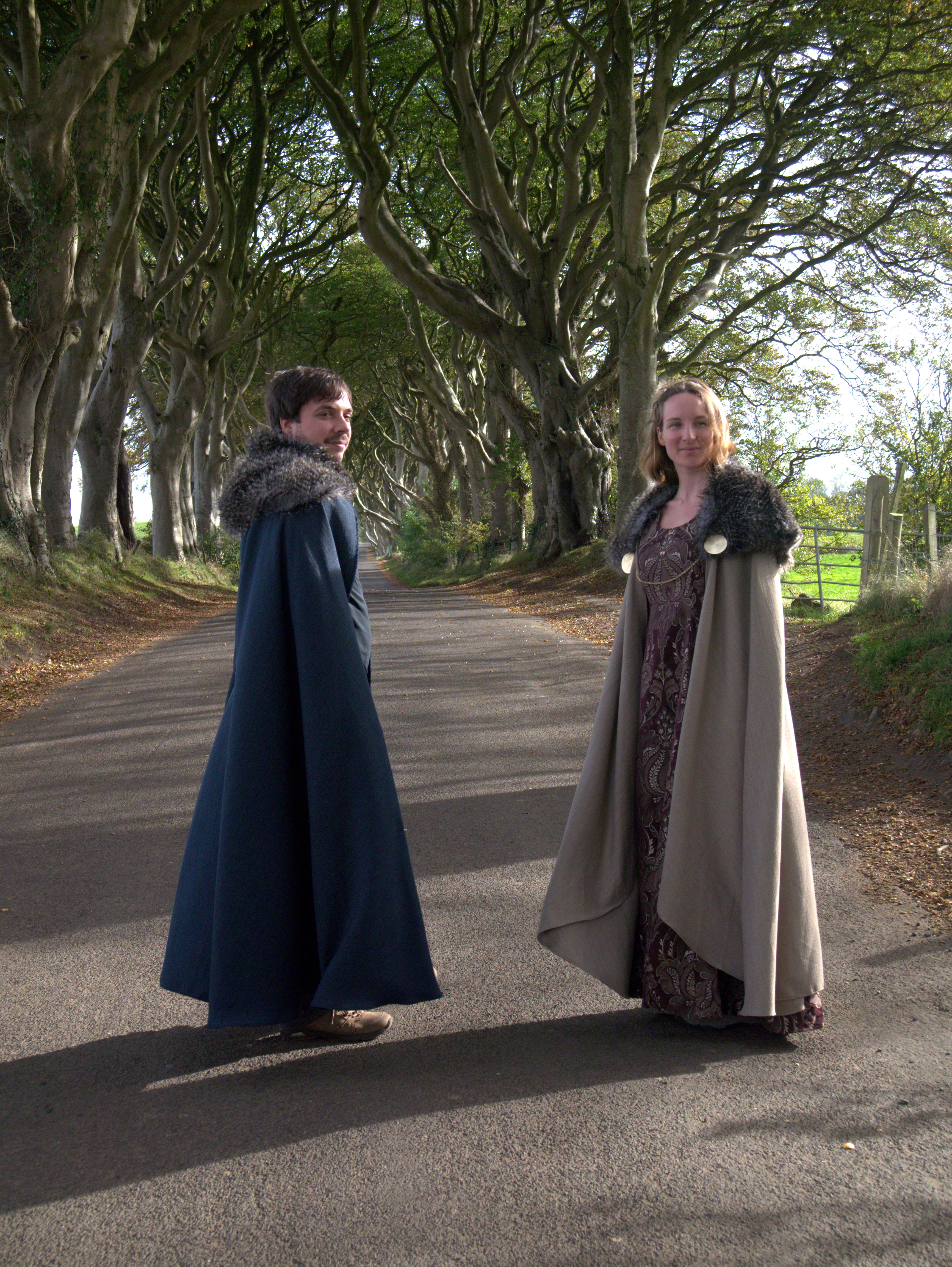 Retour sur la route… The Kingsroad pour être plus précise. En pleine campagne, près de Ballymoney, on trouve un site bien étrange : The Dark Hedges, « l’allée sombre ». Une route bordée de hêtres tortueux qui finissent par se rejoindre à leurs sommets. A la fois féérique et menaçant, c’est un lieu qui enchante pas mal de photographes… et Amandine et François n’ont pas pu résister de remettre leurs costumes pour une nouvelle séance. The Dark Hedges a été utilisée pour illustrer la fuite d’Arya en compagnie de Yorren après l’exécution de Ned Stark.